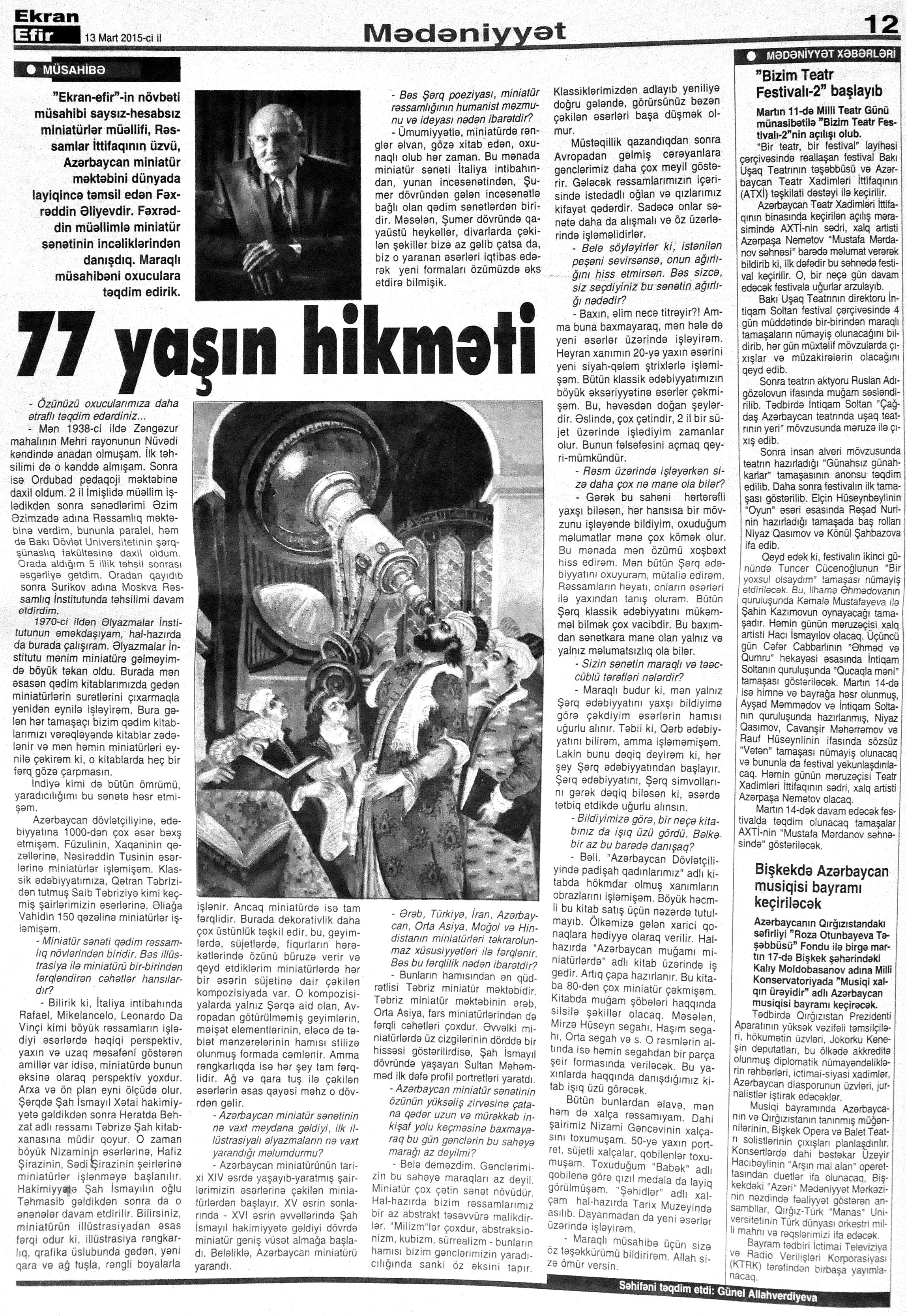 180. Əliyev, F. 77 yaşın hikməti: [Azərbaycan miniatür məktəbini dünyada layiqincə təmsil edən Fəxrəddin Əliyevlə müsahibə] /müsahibəni apardı Günel Allahverdiyeva //Ekran-efir.- 2015.- 13 mart.- S.12. 181. Əliyev, Z. Cizgilərə hopan ömür...: [Azərbaycanın Xalq rəssamı, görkəmli qrafika ustası, professor Cəmil Müfidzadə haqqında] //Kaspi.- 2015.- 7-10 mart.- S.16. 182. Qızıl, gümüş, bürünc...: Avropa Oyunlarının medalları ictimaiyyətə təqdim olunub //Mədəniyyət.- 2015.- 6 mart.- S.8.