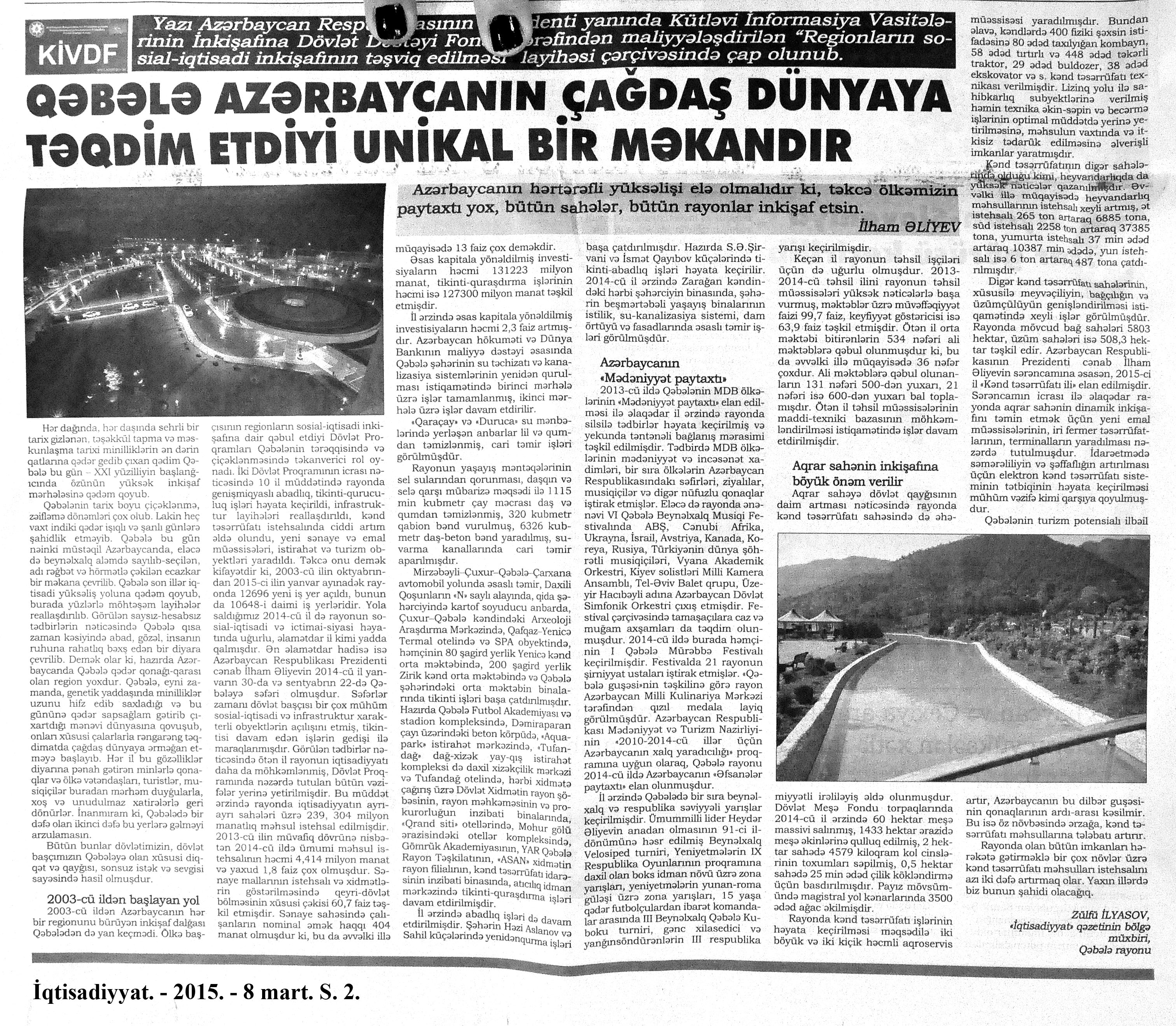 5. Abdullayeva, S. “Azərbaycanda Qafqaz almanları muzeyi” müzakirə edilib: [Mədəniyyət və Turizm Nazirliyində] //525-ci qəzet.- 2015.- 5 mart.- S.7. 6. Abdullayeva, S. Azərbaycanın dövlətçilik və mədəniyyət tarixində Şəkinin yeri və rolu //525-ci qəzet.- 2015.- 14 mart.- S.6; 18 mart.- S.6; 30 mart. S.6; 31 mart.- S.6. 7. Abdullayeva, S. “Bizim olimpiada” adlı festival keçirilib: [Mədəniyyət və Turizm Nazirliyinin təşkilatçılığı ilə “Bakı -2015” Avropa Oyunlarına həsr olunmuş eyniadlı tədbir haqqında] //525-ci qəzet.- 2015.- 5 mart.- S.7. 8. Abdullayeva, S. “Bölgələrdən paytaxta” adlı layihə bu dəfə Qubaya həsr edilib: [Mədəniyyət və Turizm Nazirliyinin eyniadlı layihəsi çərçivəsində regionların mədəniyyətinin, incəsənətinin geniş təbliğ olunması haqqında] //525-ci qəzet.- 2015.- 31 mart.- S.7. 9. “Bizim Olimpiada”: “Bakı 2015” Avropa Oyunlarına həsr olunmuş festivala yekun vurulub: [paytaxtın Suraxanı rayonundakı Q.Abbasov adına Mədəniyyət Sarayında eyniadlı festival qaliblərinin mükafatlandırılma mərasimi haqqında] //Mədəniyyət.- 2015.- 11 mart.- S.8. 10. Gəncədə “Ordu ilə xalq birdir” şüarı altında bədii-təşviqat marafonunun açılışı olub: [faşizm üzərində qələbənin 70 illiyinə həsr edilmiş tədbirdə mahnı və rəqs ansamblı üzvlərinin çıxışları olub] //Azərbaycan.- 2015.- 15 mart.- S.2. 11. Mədəniyyət və turizm naziri Tovuz şəhərində vətəndaşların müraciətini dinləyib: [Prezident İlham Əliyevin tapşırıq və tövsiyələrinə əsasən, Əbülfəs Qarayevin Tovuz, Ağstafa, Gədəbəy, Qazax və Şəmkir rayonlarından olan vətəndaşları qəbul etməsi haqqında] //Azərbaycan.- 2015.- 31 mart.- S.5. 12. Sarıyeva, İ. Xaricdə fəaliyyət göstərən mədəniyyət mərkəzləri - mədəniyyətimizi yaşadan ocaqlar... //Bakı xəbər.- 2015.- 13-15 mart.- S.11. 13. Sarıyeva, İ. Mədəniyyət evləri və mədəniyyət mərkəzləri dövlətin mədəniyyət siyasətinə xidmət edir //Bakı xəbər.- 2015.- 10 mart.- S.11. 14. Şirvan şəhərində “Yaradıcılıq düşərgəsi”: [rayon mədəniyyət müəssisələrində çalışan gənc əməkdaşların fəaliyyətinin stimullaşdırılması məqsədilə təşkil olunan düşərgə haqqında] //Mədəniyyət.- 2015.- 4 mart.- S.4. Bax: 327, 330