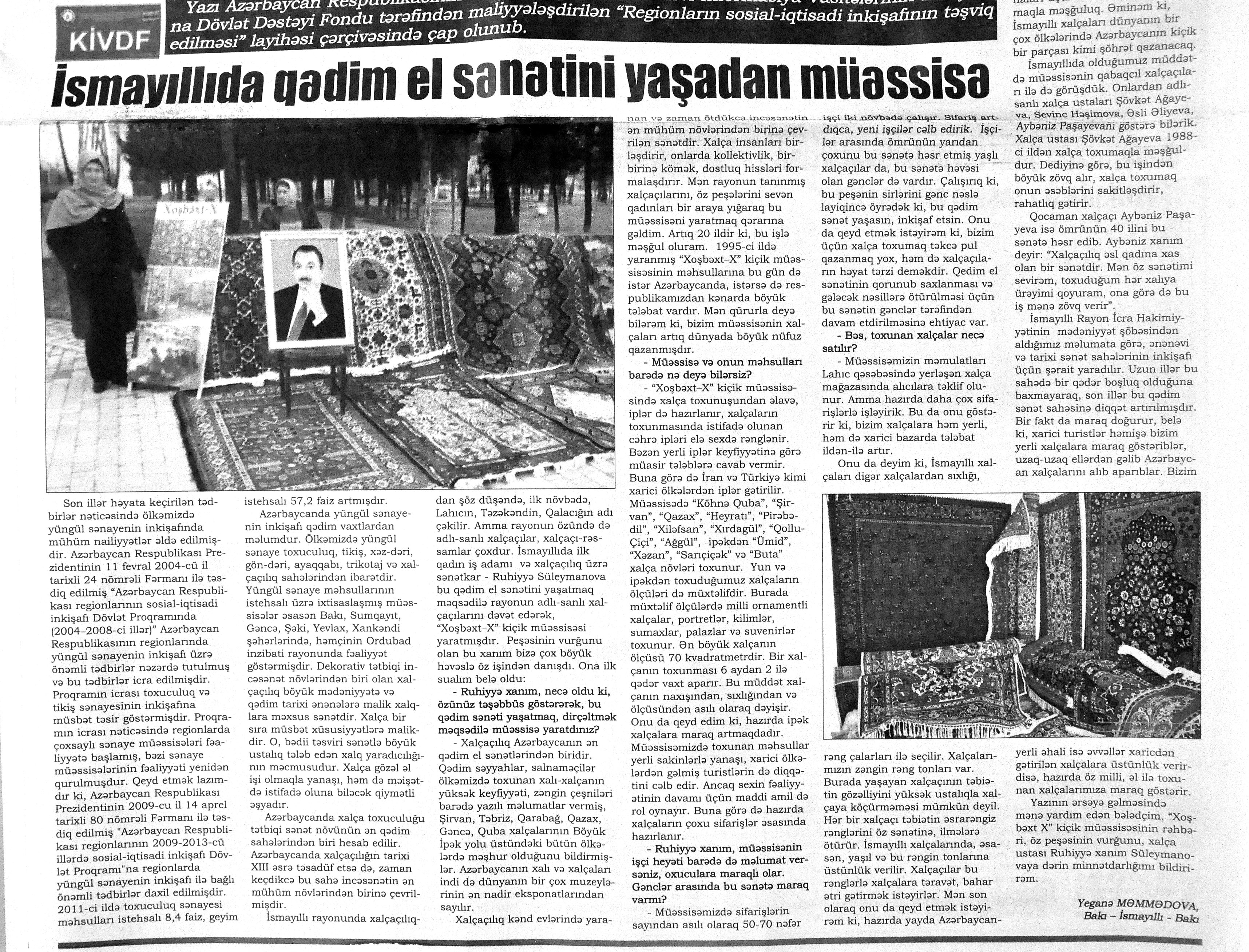 146. Abdulova, G. Azərbaycan tikmələri //Azərbaycan xalçaları.- 2014.- № 11.- S.96-103. 147. Abdullayeva, S. “İncəsənət və zərgərlik sərgisi açılıb: [Heydər Əliyev Mərkəzində “Stephen Webster” brendi tərəfindən Leyla Əliyevanın rəsmlərinin motivləri əsasında yaradılmış əsərlərin nümayişi haqqında] //525-ci qəzet.- 2015.- 4 mart.- S.7; Mədəniyyət.- 2015.- 4 mart.- S.8. 148. “Azər-İlmə” Şirkətinin 20 illik yubileyi təntənəli şəkildə qeyd edilmişdir //Azərbaycan xalçaları.- 2014.- Cild 4.-№ 11.- S.6-11. 149. Babayeva, T. Xalçaçılıq əsl qadın sənətidir: [xalça ustası Xəyalə Əliyeva haqqında] //Azərbaycan xalçaları.- 2014.- №11.- S.24-25. 150. Babayeva, T. Kəpənəkləri parça üzərinə köçürmək istəyən qız: [tikməçi Pərvanə Qasımova haqqında] //Azərbaycan xalçaları.- 2014.- № 11.- S.126-129. 151. Babayeva, T. Kətandan xalçayadək: [Xalq rəssamı Tahir Salahovun yaradıcılığı haqqında] //Azərbaycan xalçaları.- 2014.- № 12.- S.14-21. 152. “I Dünya müharibəsi və Azərbaycan” beynəlxalq konfransının iştirakçıları “Azər-İlmə”də //Azərbaycan xalçaları.- 2014.- № 11.- S.104-107. 153. Boyaq işi: qayda və prinsipləri: Təbii boyaqlardan istifadəni öyrənmək həm asan, həm də maraqlıdır //Azərbaycan xalçaları.- 2014.- № 11.- S.42-43. 154. Evans, B. “Yaxşı xalça toxumaq üçün ənənəni düzgün qavramaq vacibdir”: Müsahibimiz “Halı” jurnalının baş redaktoru cənab Ben Evansdır /müsahibəni apardı Orxan Rzayev //Azərbaycan xalçaları.- 2014.- № 12.- S.54-59. 155. Əliyev, B. Azərbaycanda qoyun cinsləri //Azərbaycan xalçaları.- 2014.- № 12.- S.122-131. 156. Əliyeva, K. Xınalıq sənət beşiyidir: [Quba rayonundakı eyniadlı kəndin sənət nümunələri haqqında] //Azərbaycan xalçaları. – 2014.- № 11.- S.26-41. 157. Əmbala, A. Azərbaycan xalçaları: Xalçalarımız poeziya işığında //Azərbaycan xalçaları.- 2014.- № 11.- S.136-139. 158. Əziz, A. Evdar xanımların yaradıcılıq günü: Mərdəkanda xanımların əl işləri sərgiləndi //Kaspi.- 2014.- 6 mart.- S.18. 159. “Halı” jurnalı “Azər-İlmə” ilə əlaqələrini genişləndirir //Azərbaycan xalçaları.- 2014.- № 12.- S.132-133. 160. İbadova, G. Azərbaycanda milli geyimlərin təşəkkülü və inkişaf mərhələləri //Azərbaycan xalçaları.- 2014. -№ 11.- S.116-125. 161. “İncə əbədiyyət: [“Natəvan” qalereyasında eyniadlı sərginin açılışı haqqında] //Mədəniyyət.- 2015.- 11 mart.- S.5. 162. Leyla Əliyevanın və Stiven Vebsterin əsərləri Heydər Əliyev Mərkəzində təşkil edilən sərgidə nümayiş olunur //Azərbaycan.- 2015.- 3 mart.- S.5. 163. Marino D. Ağ yerlikli “Əjdahalı” xalça: naxışların və uyğun müqayisələrin araşdırılması //Azərbaycan xalçaları.- 2014.- № 12.- S.106-111. 164. Məmmədova, Ü. Xalçadan başlayan haqq yolu //Azərbaycan xalçaları.- 2014.- № 12.- S.42-53. 165. Məmmədova, Ü. Xalça deyib gəlmişik...: [Ağsu rayonunun xalça nümunələri haqqında] //Azərbaycan xalçaları.- 2014.- № 12.- S.78-93. 166. Məmmədova, Ü. Xalça kreativliyi sevir //Azərbaycan xalçaları.- 2014.- № 11.- S.72-75. 167. Məmmədova, Y. İsmayıllıda qədim el sənətini yaşadan müəssisə: [“Xoşbəxt-X” xalça müəssisəsi haqqında] //İqtisadiyyat.- 2015.- 19-30 mart.- S.3. 168. Moskvada “Azərbaycan xalçaları. İlmələrin əfsanəsi” qalereyasının açılışı olmuşdur //Azərbaycan xalçaları.- 2014.- № 11.- S.58-63. 169. Muradov, V. Bəhmənli xalçalarının izi ilə...: [Füzuli rayonunda Bala Bəhmənli kəndinin xalçaları haqqında] //Azərbaycan xalçaları.- 2014.- № 11.- S.12-23. 170. Muradov, V. Muxax xalçaları – keçmişimizdən bu günə: (tarixi-etnoqrafik təhlil) //Azərbaycan xalçaları.- 2014.- № 11.- S.50-57. 171. Nəsirova, S. Azərbaycan xalçalarında zoomorf elementlər: it təsvirləri: Milli Azərbaycan Tarixi Muzeyinin materialları əsasında //Azərbaycan xalçaları.- 2014.- № 11.- S.66-71. 172. Nəzərli, Ş. Xalçanın sirri //Azərbaycan xalçaları.- 2014.- № 12.- S.134-140. 173. Nikolas, A. Qafqaz xalçaları Boston İncəsənət Muzeyində //Azərbaycan xalçaları.- 2014.- № 11.- S.64-65. 174. Rzayev, O. Azərbaycan xalçaları dünya hərraclarında //Azərbaycan xalçaları.- 2014.- № 12.- S.94-97. 175. Rzayev, O. Azərbaycan xalçaları “Metropoliten” muzeyində //Azərbaycan xalçaları.- 2014.- № 12.- S.112-121. 176. Sarıyeva, İ. Xalq sənətinin əsas qollarından biri – bədii tikmə mədəniyyəti... //Bakı xəbər.- 2015.- 5 mart.- S.15. 177. Sarıyeva, İ. Təkəlduzlar – bədii tikiş sənətimizin örnəkləri... //Bakı xəbər.- 2015.- 6-9 mart.- S.11. 178. Uayld, K. Azərbaycan xalçaları bu gün – ənənənin tənəzzülü //Azərbaycan xalçaları.- 2014.- № 11.- S.45-49. 179. Yaqubqızı, M. Əl işlərində simvollaşan gerçəklər //Azərbaycan xalçaları.- 2014.- № 11.- S.76-83. Bax: 86, 182