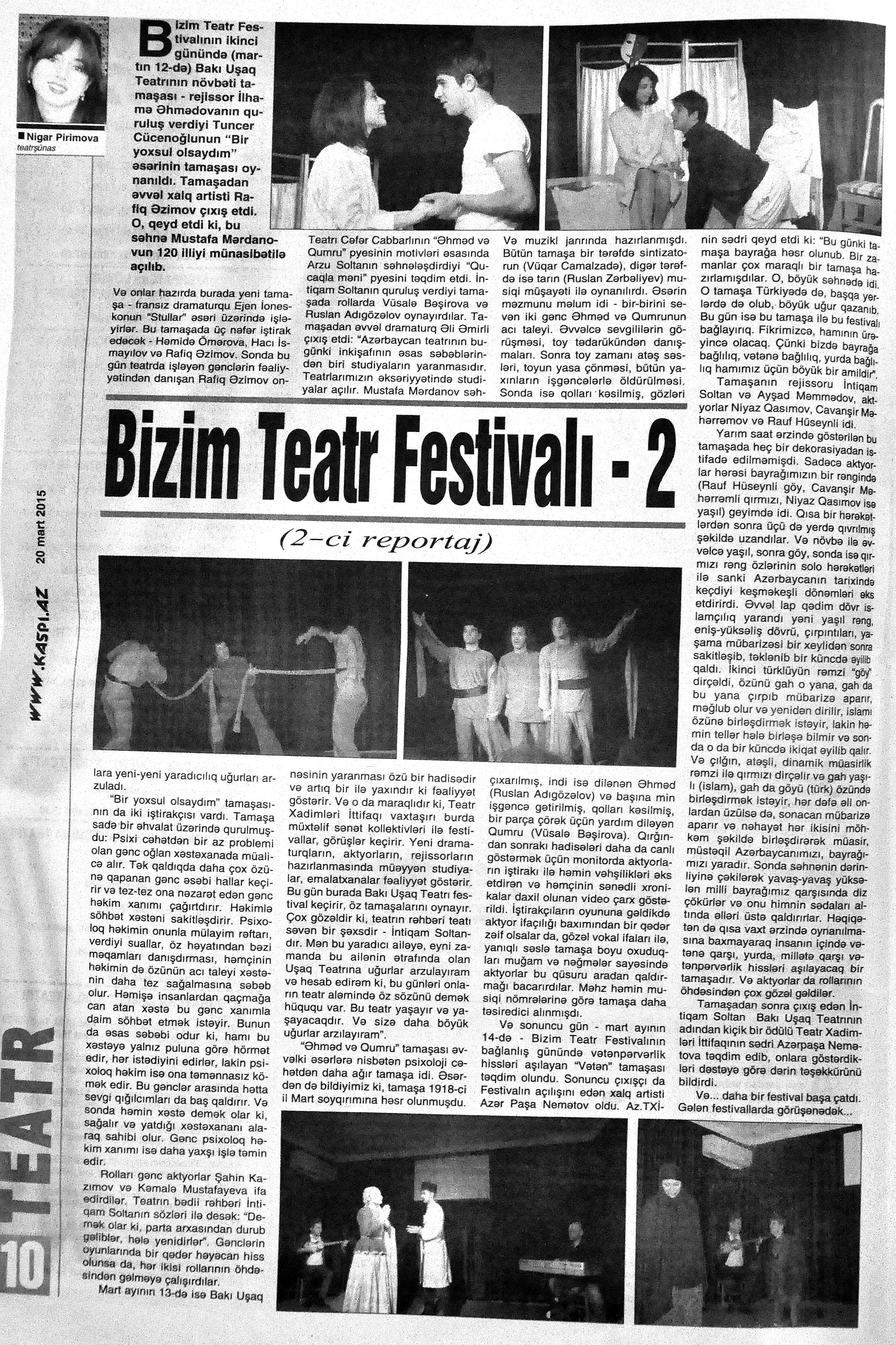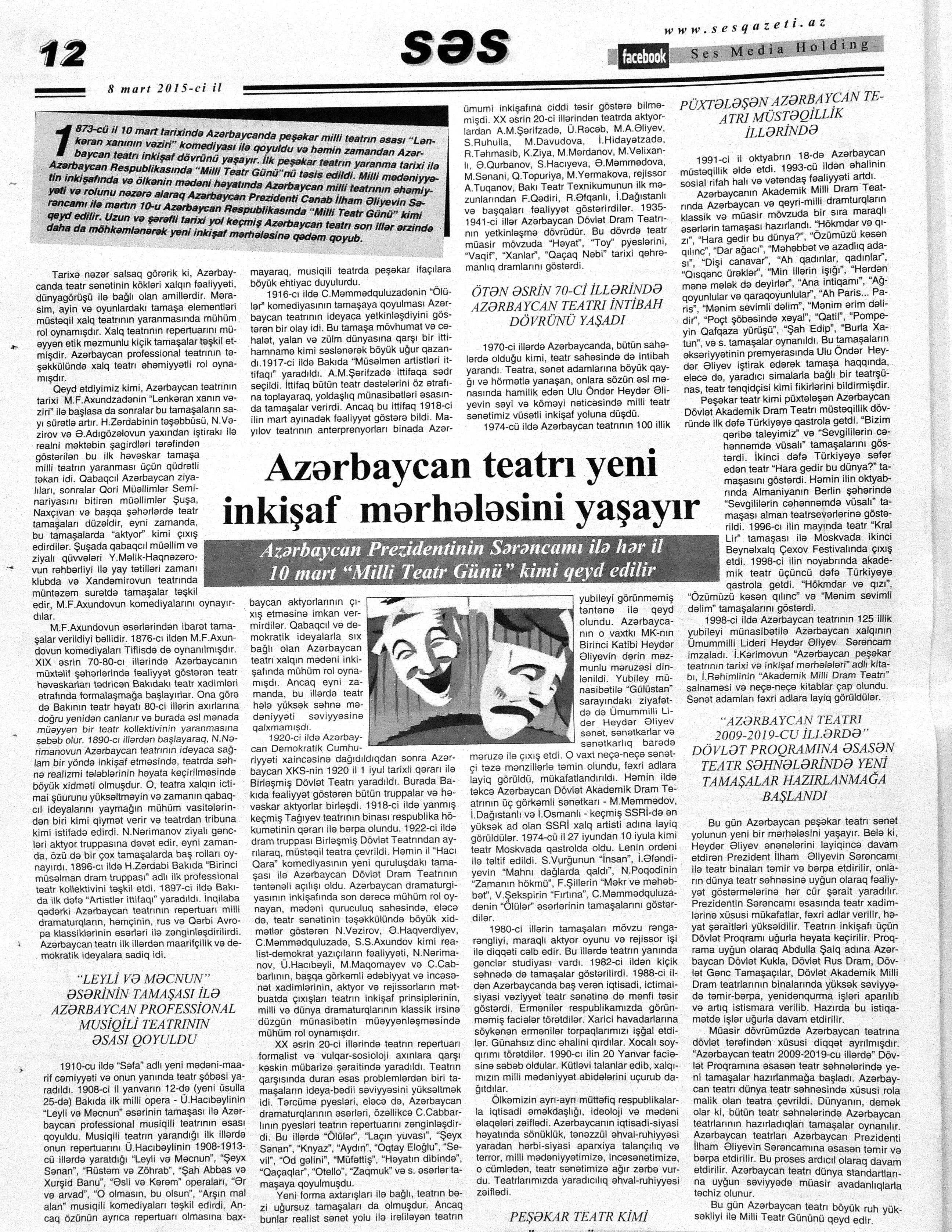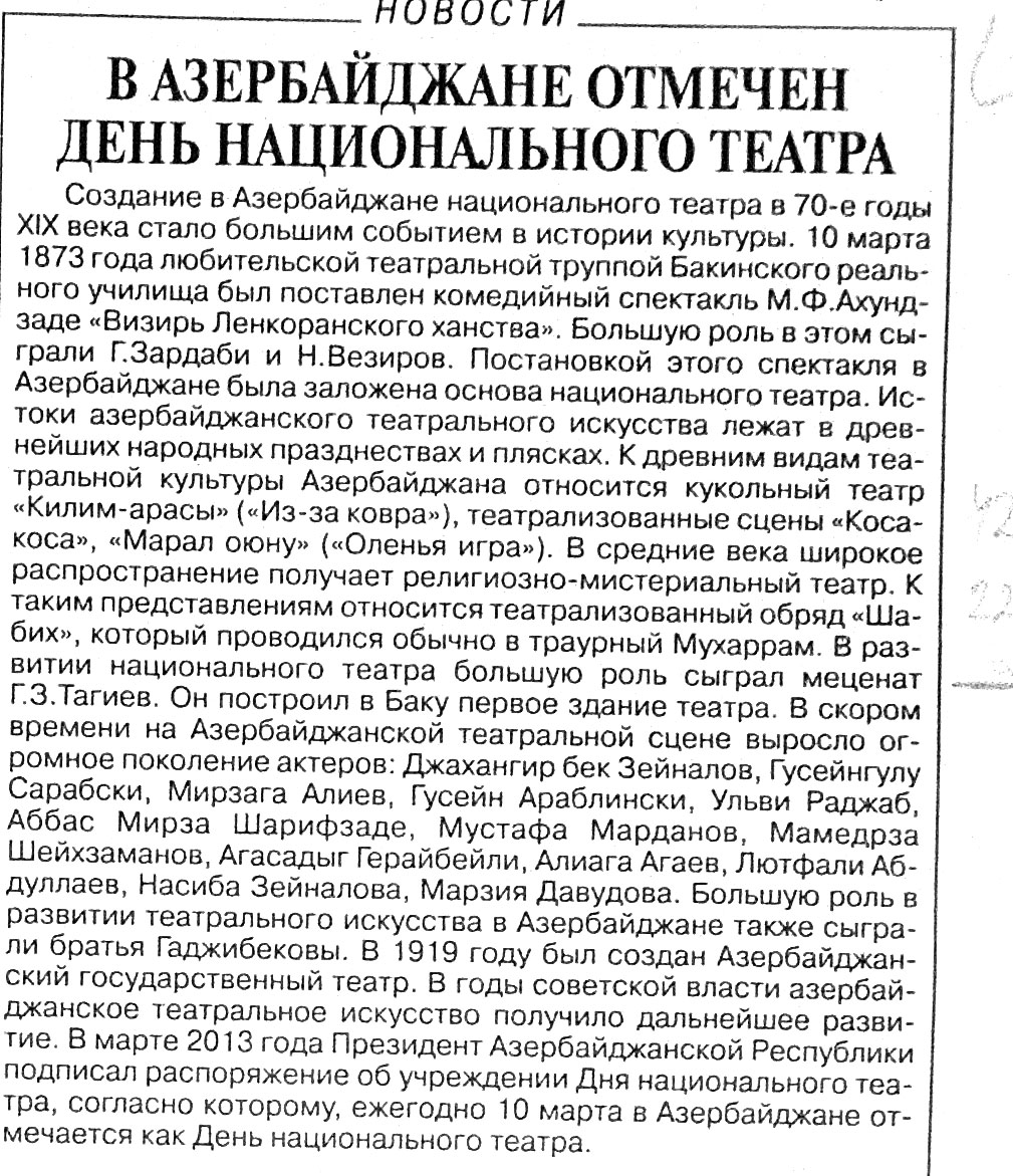 564. Гаджиев, А. Адалят Гаджиев: «И тогда наступит момент, когда билеты на спектакль нашего театра будут спрашивать у выхода из метро Сахил»: Интервью с директором Русского драмтеатра накануне Дня национального театра //Эхо.- 2015.- 7 марта. - С.10. 565. Касумова, Н. В Азербайджане отмечен День национального театра //Вышка.- 2015. - 13 марта. - С. 9. 566. Чингизгызы, М. В Баку отметили День национального театра: Юные артисты театра «Гюнай» были гостями РИКЦ //Комсомольская правда (Азербайджан). - 2015.- 17-23 марта.- С. 7.