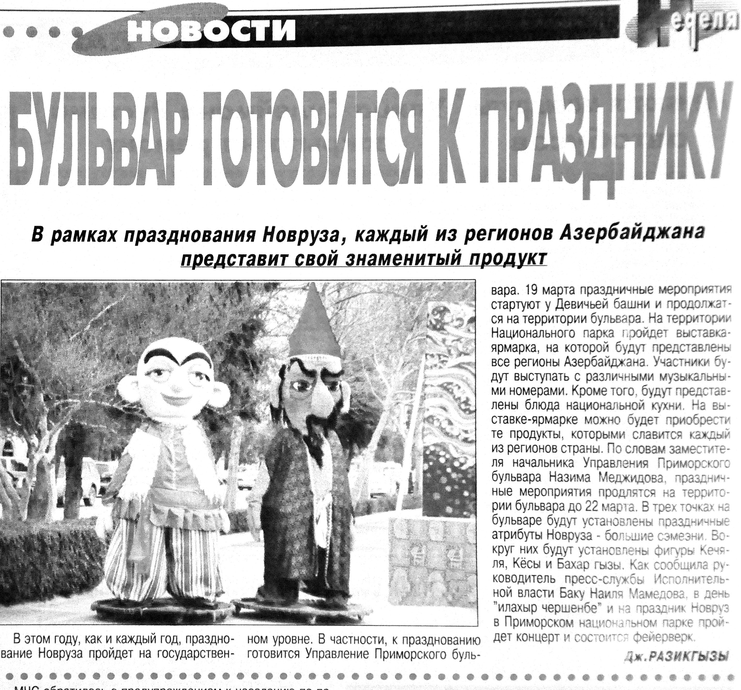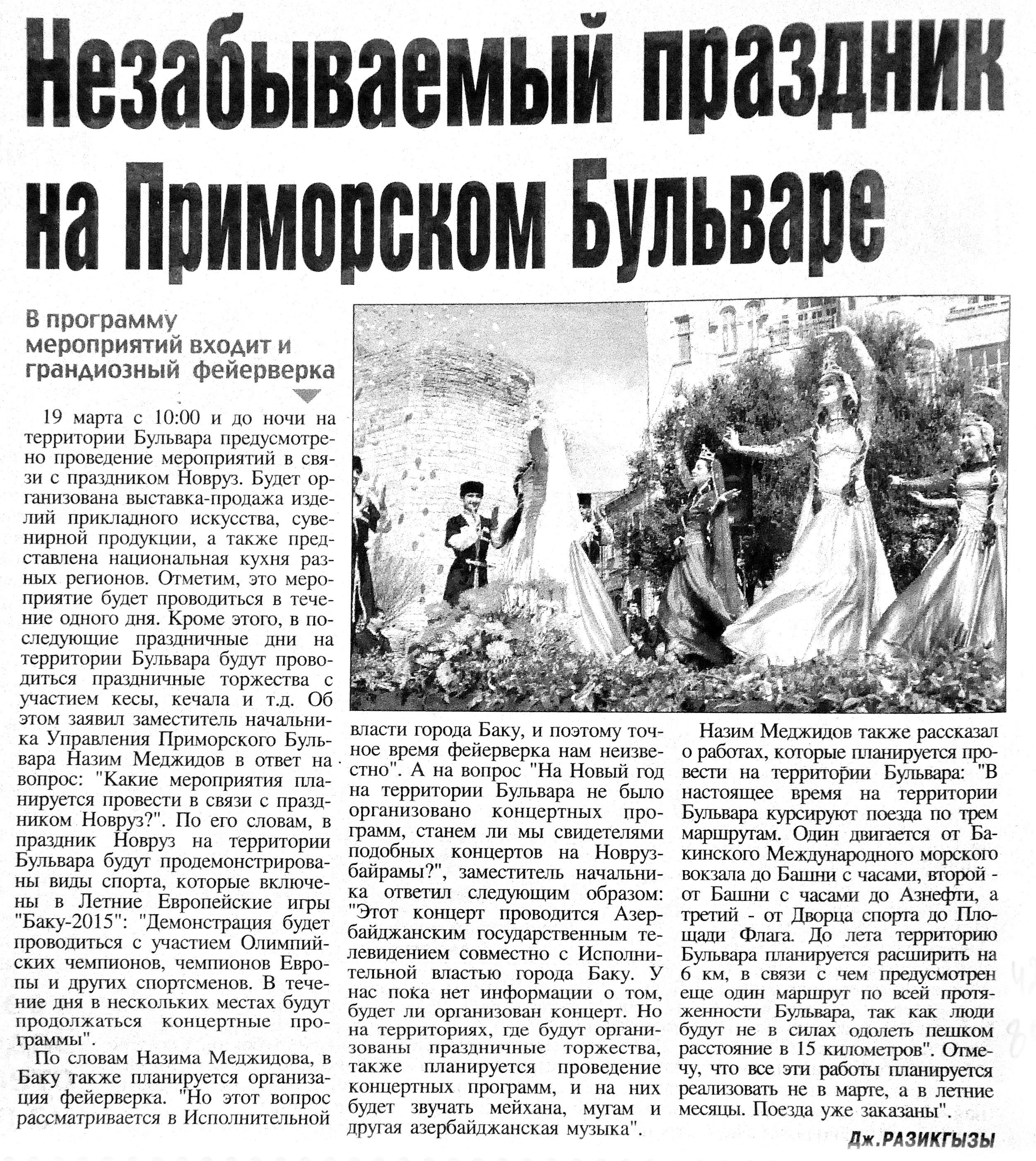456. Агаджанова, Дж. Новруз: обычаи, обряды, традиционные ценности //Комсомольская правда (Азербайджан).- 2015.- 17-23 марта.- С. 12. 457. В Приморском парке завершились последние приготовления к Новруз байрамы //Бакинский рабочий.- 2015. - 18 марта. - С. 6. 458. В Центре Гейдара Алиева открылись международные выставки искусств «Сracking art» и «Семени»: Вице-президент Фонда Гейдара Алиева Лейла Алиева приняла участие в церемонии открытия выставок //Бакинский рабочий.- 2015. - 19 марта. - С. 8. 459. Посади дерево, сделай подарок жизни: [о мероприятии в парке «Деде Горгуд» накануне праздника Новруз] //Бакинский рабочий.- 2015. - 18 марта. - С. 5. 460. Разикгызы, Дж. Бульвар готовится к празднику: В рамках празднования Новруза, каждый из регионов Азербайджана представит свой знаменитый продукт //Неделя. - 2015.- 13 марта.- С. 4. 461. Разикгызы, Дж. Незабываемый праздник на Приморском бульваре: В программу мероприятий входит и грандиозный фейерверк //Комсомольская правда (Азербайджан).- 2015.- 17-23 марта.- С. 6. 462. Яваргызы, И. Добро пожаловать, Новруз!: Во Дворце Гейдара им. Алиева состоится День открытых дверей //Эхо.- 2015.- 20 марта.- С. 10. 463. Яваргызы, И. Художник из Украины посвятил «Ритмы света» празднику Новруз: [о творчестве Елены Шептицькой] //Эхо.- 2015.- 19 марта.- С.8.