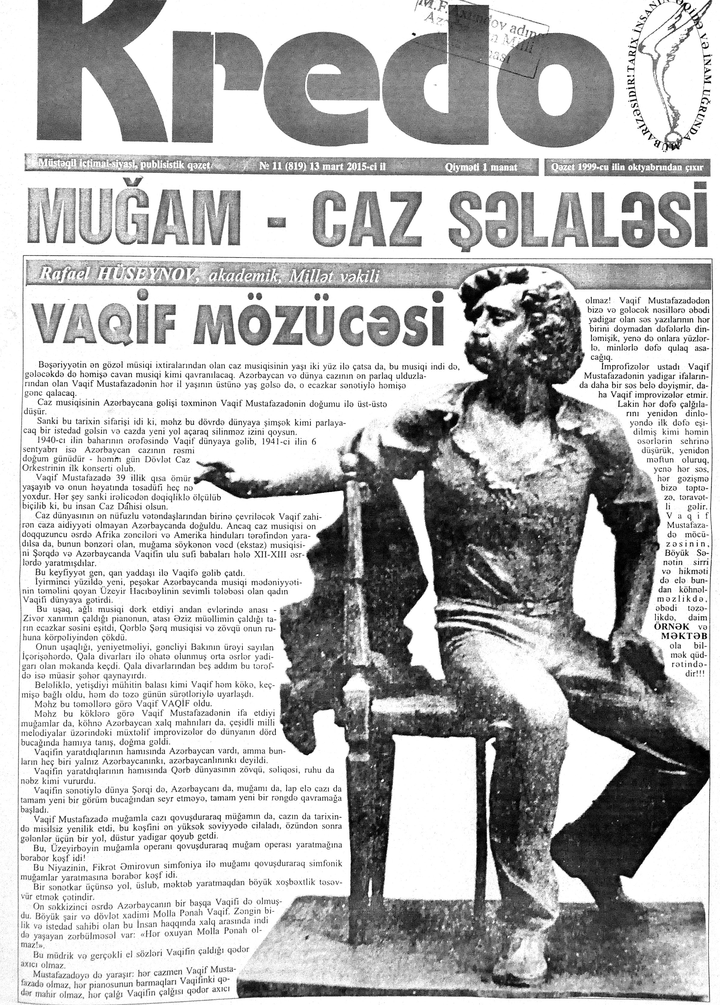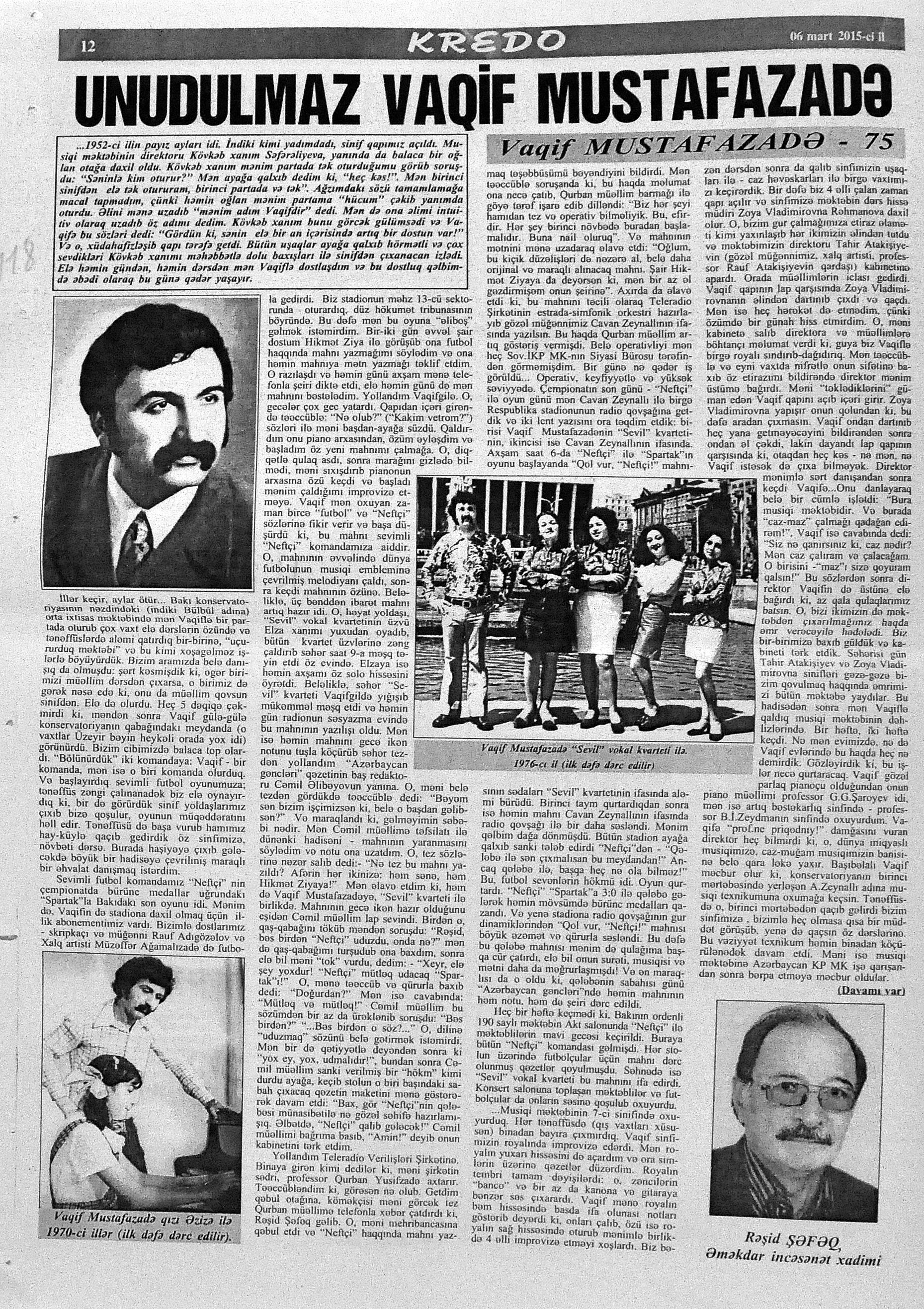 229. Bakı Caz Mərkəzində Vaqif Mustafazadənin 75 illik yubileyi qeyd olunub //Azərbaycan.- 2015.- 17 mart.- S.7. 230. Dahi musiqiçi Vaqif Mustafazadə ənənəvi caz festivalı ilə anılıb [//525-ci qəzet.- 2015.- 17 mart.- S.7. 231. Hüseynov R. Vaqif möcüzəsi: Muğam – caz şəlaləsi //Kredo.- 2015.- 13 mart.- S.1. 232. Hüseynov R. Vaqif möcüzəsi //525-ci qəzet.- 2015.- 14 mart.- S.10-11. 233. Məsud, R. O, ecaskar musiqisi ilə könülləri fəth etmişdi //Respublika.- 2015.- 19 mart.- S.11. 234. Şəfa, Ş. Klassik bəstəkarlara improvizə edən cazmen //Ədalət.- 2015.- 17 mart.- S.8. 235. Şəfəq, R. Unudulmaz Vaqif Mustafazadə //Kredo.- 2015.- 6 mart.- S.12; 13 mart.- S.13; 27 mart.- S.13. 236. Vaqif Mustafazadə sənətinə böyük sevgi: İçərişəhərdə “Vaqifsayağı” caz festivalı keçirildi //Mədəniyyət.- 2015.- 18 mart.- S.4. 237. Vaqif Mustafazadənin yubileyinə həsr olunmuş konsert: [Rəşid Behbudov adına Dövlət Mahnı Teatrında] //Mədəniyyət.- 2015.- 20 mart.- S.5. 238. Vaqif Mustafazadənin 75 illiyi ilə bağlı konsert olub: [Rəşid Behbudov adına Dövlət Mahnı Teatrında] //525-ci qəzet.- 2015.- 19 mart.- S.7. 239. Zümrüd. Vaqif Mustafazadə - 75: Azərbaycan muğam-caz hərəkatının memarı //Səs.- 2015.- 15 mart.- S.12.