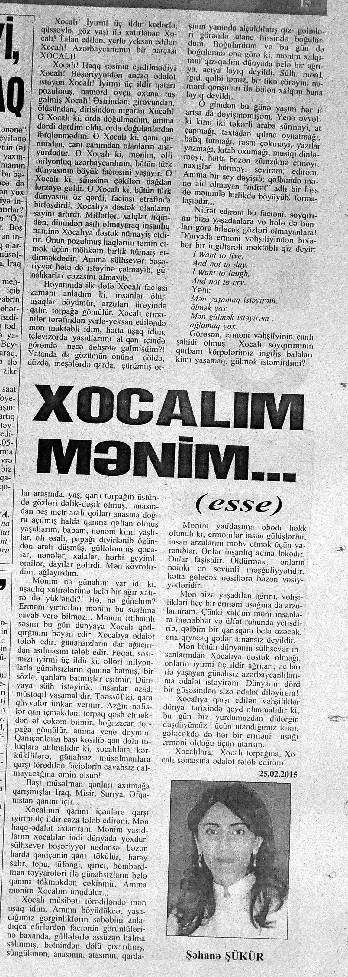 24. Aydınoğlu, T. “Gözü yolda Xocalım...”: Qan yaddaşının harayı: [ADMİU tələbələrinin hazırladığı kompozisiya haqqında] //Xalq qəzeti.- 2015.- 3 mart.- S.7. 25. Gənclər Kitabxanasında anım tədbiri: [soyqırımla bağlı kitab sərgisi haqqında] //Mədəniyyət.- 2015.- 4 mart.- S.14. 26. Heydər Əliyev Fondunun vitse-prezidenti Leyla Əliyeva Moskvada Xocalı soyqırımı ilə bağlı tədbirdə iştirak edib //Azərbaycan.- 2015.- 1 mart.- S.3. 27. Hüseynov F. Xocalı faciəsi qurbanlarına ithaf: Professor Firəngiz Əlizadənin müəllif konserti: [Azərbaycan Dövlət Filarmoniyasında] //Mədəniyyət.- 2015.- 4 mart.- S.5. 28. “Xocalıya ədalət!” kampaniyası Dublin radiosunda: [Avropa-Azərbaycan Cəmiyyətinin (TEAS) London ofisinin ictimaiyyətlə əlaqə və marketinq məsələləri üzrə direktoru Leon Kukun “Sonsuz dəhliz” sənədli filmi barədə məlumat verməsi haqqında] //Azərbaycan.- 2015.- 11 mart.- S.5. 29. Qanla yazılan tariximiz: Bölgələrdə Xocalı soyqırımının ildönümü ilə bağlı tədbirlər keçirilib //Mədəniyyət.- 2015.- 4 mart.- S.13. 30. Nizamiqızı, H. Ağıllı olmaqdansa...: Yaxud “Didro” nun dəlilik resepti: [Rəşid Behbudov adına Dövlət Mahnı Teatrında “Xocalıya ədalət!” beynəlxalq təbliğat kampaniyası çərçivəsində, rejissor və aktyor Turqay Vəlizadənin eyniadlı tamaşasının nümayişi haqqında] //Mədəniyyət.- 2015.- 4 mart.- S.5. 31. “Sonsuz dəhliz” filmi Albaniya Milli Televiziyasında: [filmin ingilis dilində yayımlanması haqqında] //Azərbaycan.- 2015.- 11 mart.- S.5.
