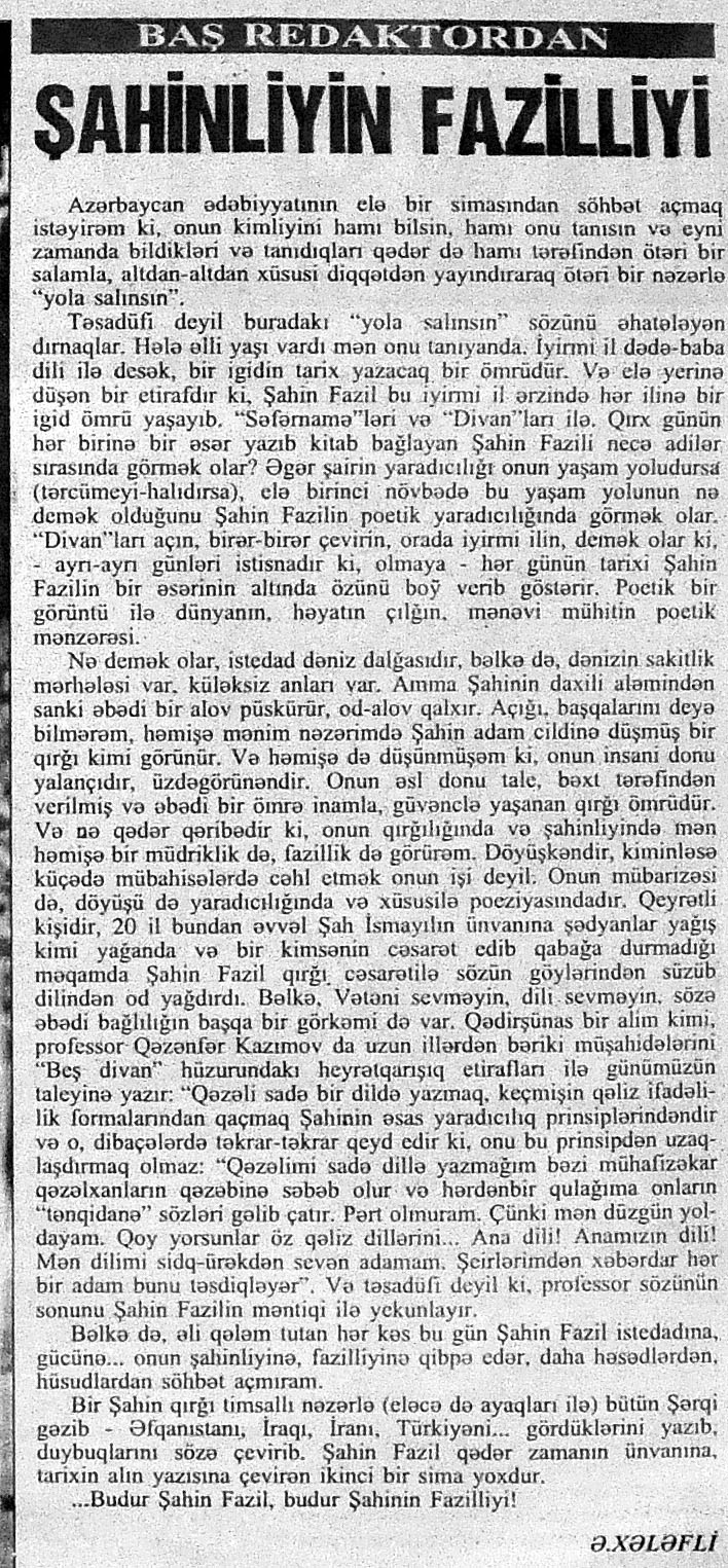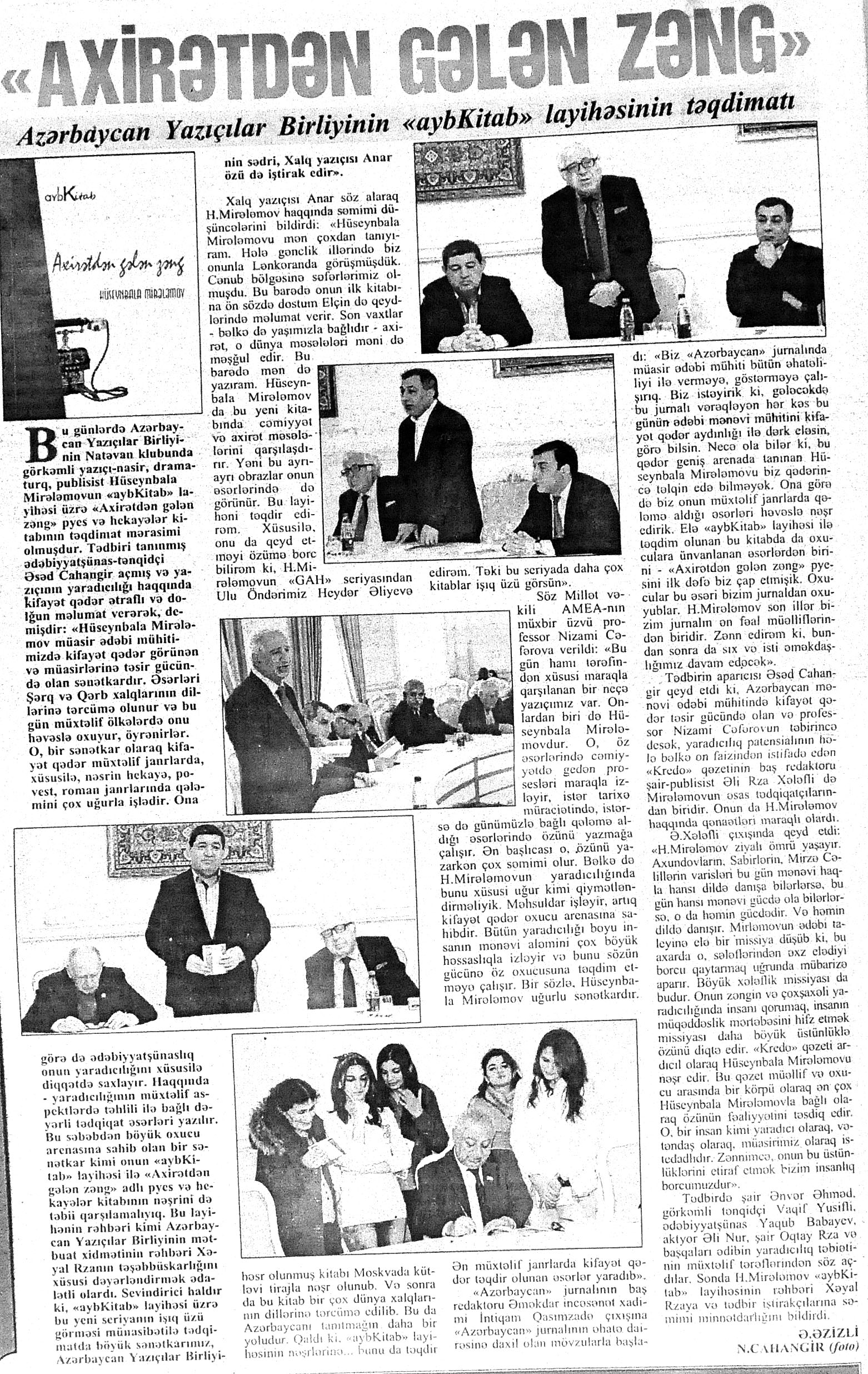 256. Abdullayeva, S. “Yol” filmi İranda keçirilən festivalın baş mükafatını alıb: [gənc rejissor Fehruz Şamıyevin filmi haqqında] //525-ci qəzet.- 2015.- 3 mart.- S.7. 257. Azəri, L. “Axırıncı dayanacaq” ekrana çıxdı: Kinoseans – bir filmə üç baxış: Səmimi insan münasibətləri, detektivə parodik yanaşma, əla yumor hissi: [Fikrət Əliyevin quruluşunda eyniadlı bədii filmin nümayişi haqqında] //Mədəniyyət.- 2015.- 6 mart.- S.12. 258. Azəri, L. “Eşqin sonsuz nəğməsi” ekrana gəlir: [Emin Əfəndiyevin Mədəniyyət və Turizm Nazirliyinin sifarişi ilə çəkilmiş eyniadlı qısametrajlı bədii filmi haqqında] //Mədəniyyət.- 2015.- 20 mart.- S.2. 259. Həmidə.Uğura aparan “Yol”: Gənc rejissorun filmi İranda beynəlxalq festivalın qalibi olub: [Fehruz Şamıyevin filminin Tehranda keçirilən IX “Ruyesh” beynəlxalq qısametrajlı film festivalında mükafata layiq görülməsi haqqında] //Mədəniyyət.- 2015.- 4 mart.- S.8. 260. Hüseynov, F. Bəyin oğurlanması, yaxud hər üç rejissorun seçdiyi Tamara Şakirova: Əməkdar artist Füzuli Hüseynov filmin kadrarxası məqamlarını Milli.Az-a danışdı //Bizim yol.- 2015.- 4 mart.- S.15. 261. “Xeyir ilə Şərin rəqsi”: Yeni filmin çəkilişləri başlanıb: [Yavər Rzayevin quruluşunda] //Mədəniyyət.- 2015.- 6 mart.- S 3. 262. Qafarov, C. Bizim Corc: [Mədəniyyət və İncəsənət Universitetinin I kurs tələbəsi Corc Qafarovla müsahibə] /müsahibəni apardı Etibar Cəbrayıloğlu //Ədalət.- 2015.- 20 mart.- S.14. 263. Şeyxov, Y. Hollivud Hollivuddur, “Azərbaycanfilm” isə “Azərbaycanfilm”: “Bu ikisi heç zaman bir araya gələ bilməz”: [Əməkdar incəsənət xadimi Yusif Şeyxovun Day.az saytına qismən az ixtisarla müsahibəsi] //Mədəniyyət.- 2015.- 6 mart.- S.6. 264. “Yol əhvalatı”nda maraqlı əhvalatlar: Xalq artisti və rejissor film barədə bilmədiyimiz faktları açıqladı: [Hacı İsmayılov və Yusif Əlizadənin söylədikləri] //Azadlıq.- 2015.- 2 mart.- S.14. Bax: 52, 79, 275, 299, 300, 301, 303, 306