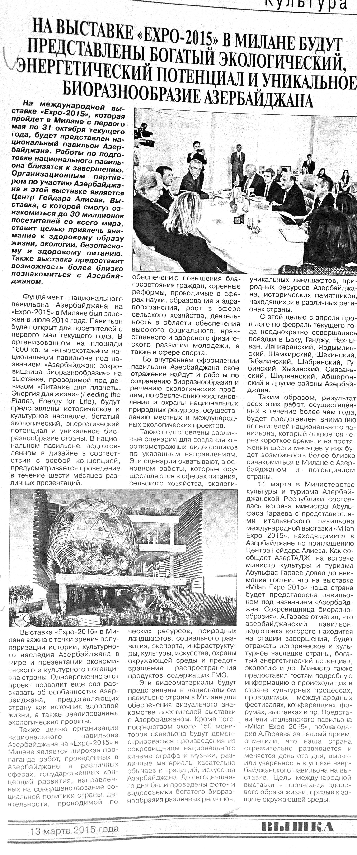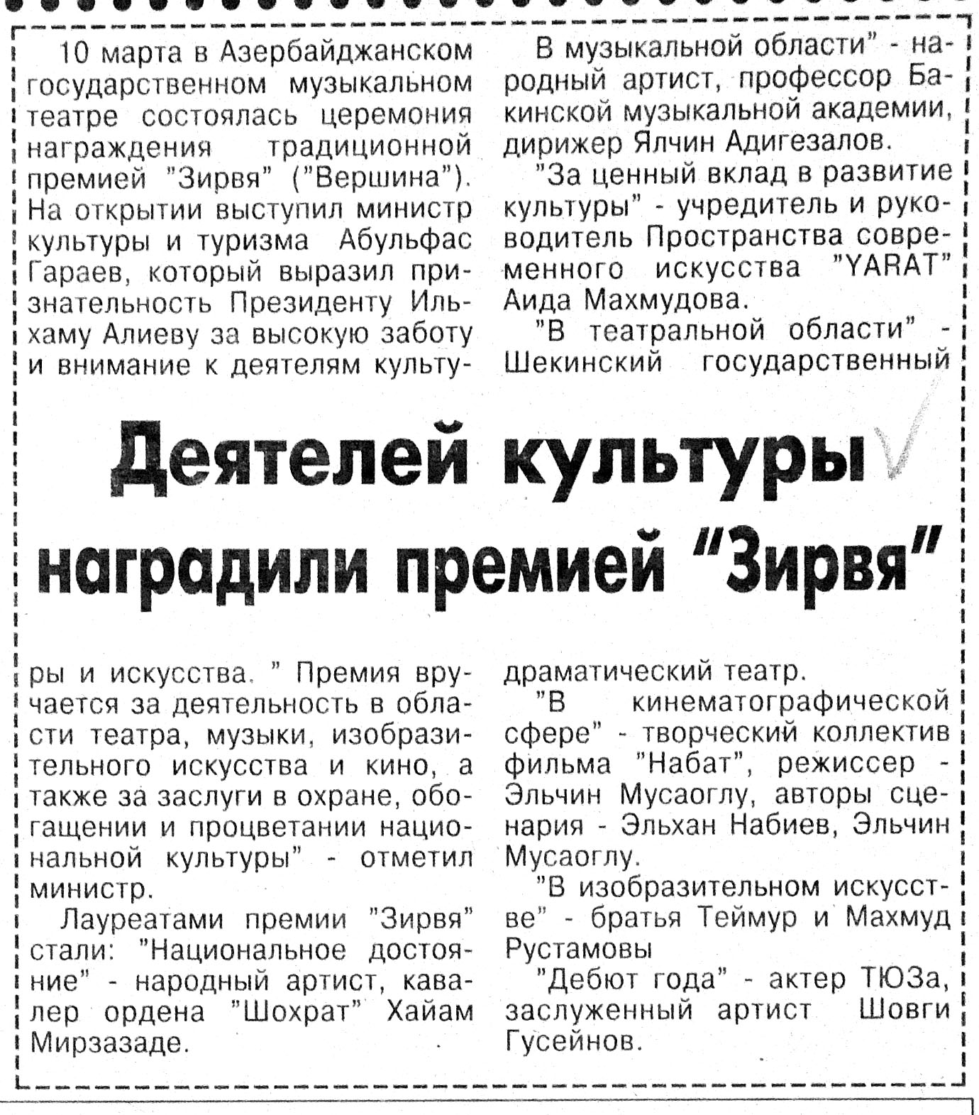 449. Алиева, Э. Журнал о женщинах и для женщин: [весенний выпуск «Азербайджан гадыны»] //Каспiй.- 2015. - 12 марта. - С.9. 450. Алиева, Э. Нестандартный человек: Он пришел в этот мир для добрых дел: [о вкладе Закира Багирова в культуру Азербайджана в одноименной книге Эсмиры Фуад] //Каспiй. - 2015.- 7 марта. - С.10. 451. Багирова, Т. Лауреаты по заслугам: Деятели культу-ры награждены премией «Зирвя» //Азербайджанские известия.- 2015. - 12 марта. - С. 4. 452. Деятелей культуры наградили премией «Зирвя»: [церемония прошла в Государственном Музыкальном Театре] //Неделя.- 2015.- 13 марта. - С.19. 453. Живописная природа и вкусная кухня Габалы: [о мероприятии МКиТ в рамках проекта «Из регионов- в столицу» в ТЮЗе] //Вышка. - 2015 - 6 марта. - С.9. 454. Манаф, Р. Новые столицы народного творчества Азербайджана: [о реализации программы «Столицы народного творчества-2010-2014» МКиТ] //Эхо.- 2015. - 6 марта. - С. 8. 455. Состоялась презентация весеннего выпуска журнала «Азербайджан гадыны» //Бакинский рабочий.- 2015. - 11 марта. - С. 4.