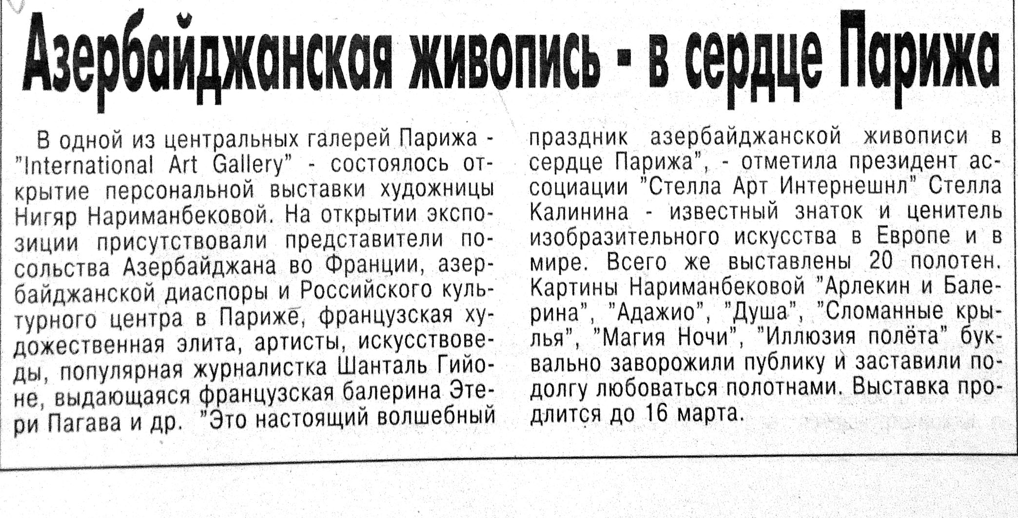516. По случаю открытия Центра современного искусства YARAT в Баку состоялась презентация выставки «Ширин Нешат: Дом моих глаз» //Бакинский рабочий.- 2015.- 30 марта.- С. 7. 517. Спорт в центре внимания: Все фотографии отличались большим профессионализмом: [о фотовыставке «Азербайджанский спорт в центре внимания» в Лондоне] //Комсомольская правда (Азербайджан). - 2015.- 3-9 марта.- С.7. 518. Фотокорреспондент АЗЕРТАДЖа Ильгар Джафаров стал обладателем золотой медали 1-го Международного салона фотографии DONEGAL 2015 //Бакинский рабочий.- 2015. - 18 марта. - С. 6.