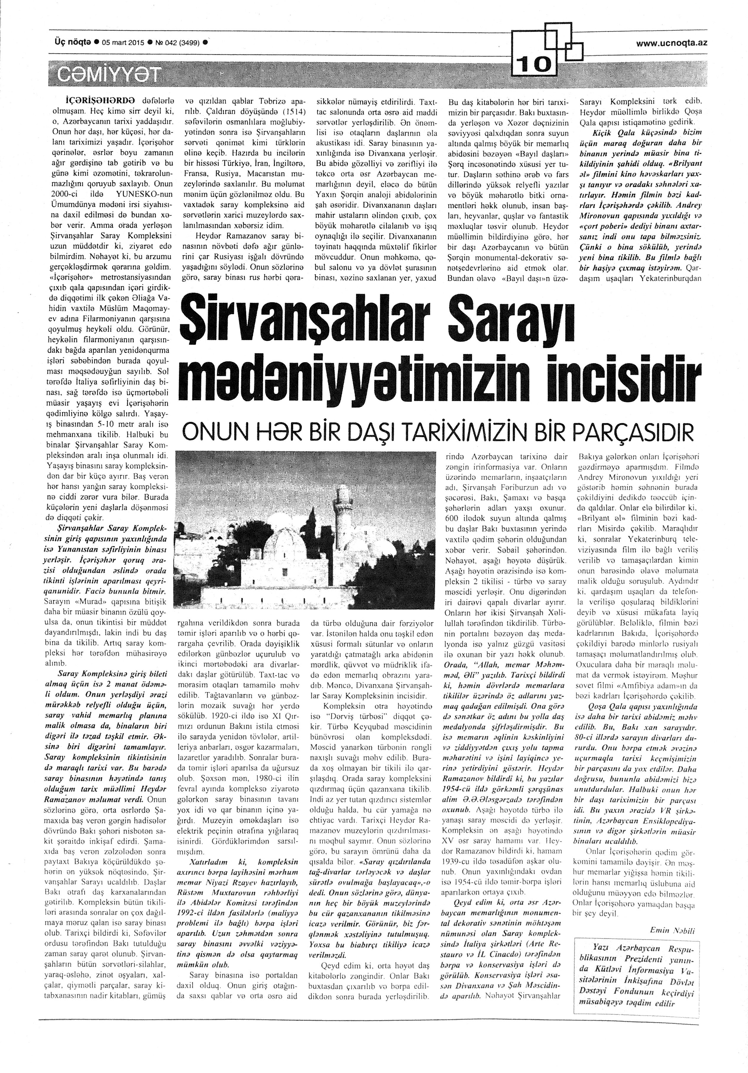 116. Abdullayeva, S. Əbülfəs Qarayev eradan əvvəl VI minilliyə aid yaşayış məskənini ziyarət edib: [mədəniyyət və turizm nazirinin Tovuz rayonundakı Göytəpə qədim yaşayış məskəninə səfəri haqqında] //525-ci qəzet.- 2015.- 31 mart.- S.7. 117. Azəri, L. Hər daşın öz yaddaşı: [xanəgah, məscid və türbələr haqqında] //Mədəniyyət.- 2015.- 4 mart.- S.13. 118. Bəkirova, M. “Oğuz abidələri”nin təqdimatı: [Oğuz Rayon Mərkəzi Kitabxanasında eyniadlı kitabın təqdimatı haqqında] //Mədəniyyət.- 2015.- 20 mart.- S.11. 119. Bərdə İmamzadəsi: layihənin icrası başa çatır //İki sahil.- 2015.- 19 mart.- S.21. 120. Hadiyev, E. “Hamamın içində, içində də çölündə...”: Hamamlar paklıq və mədəniyyət ocaqları, həm də tarixi abidələrdir //Azərbaycan.- 2015.- 15 mart.- S.7. 121. İsmayılova, N. Nəqşicahanda adına türbə ucaldılan Yusif Küseyr oğlu kim olub? //İki sahil.- 2015.- 14 mart.- S.18. 122. Qarabağlı, R. Tərtər rayonunun memarlıq abidələri //Kredo.- 2015.- 27 mart.- S.12-14. 123. Nəbili, E. Şirvanşahlar Sarayı mədəniyyətimizin incisidir: Onun hər bir daşı tariximizin bir parçasıdır //Üç nöqtə.- 2015.- 5 mart.- S.10.