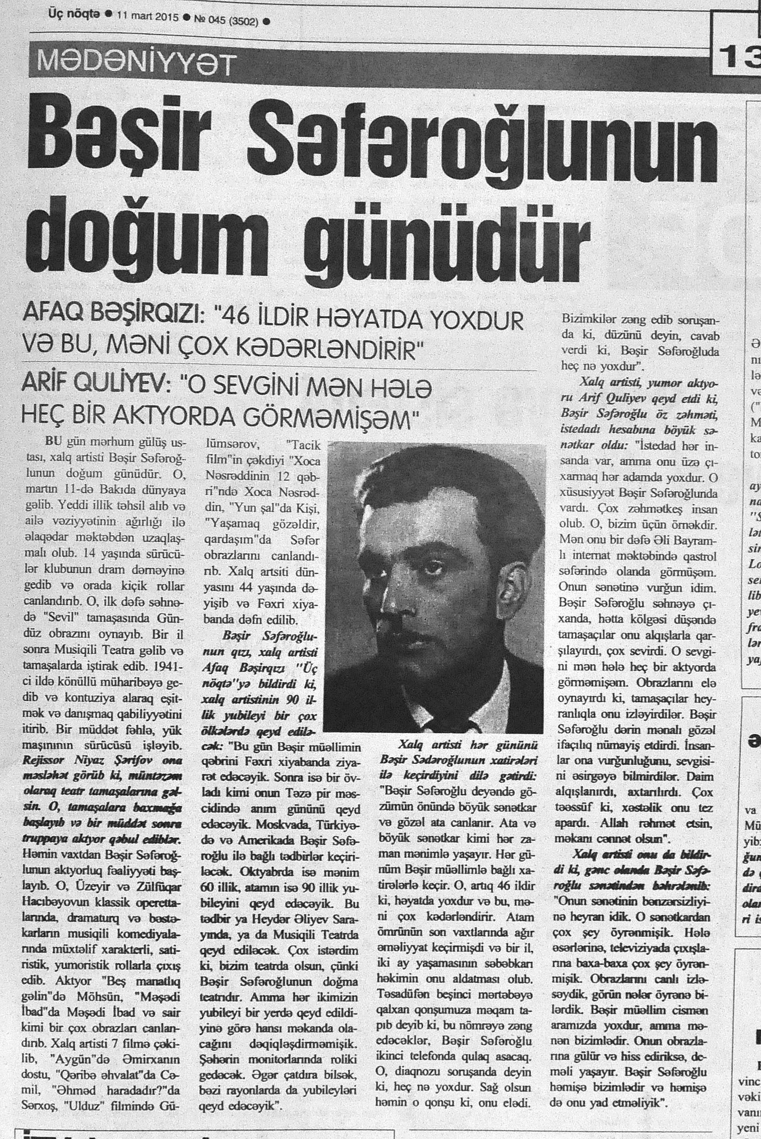 303. Abbaslı, T. O... yandı...: Özü də telesəhnəciklərdən birində dediyi kimi, “yavaş-yavaş” yox, atəş-atəş yandı!: [aktyor Bəşir Səfəroğlu haqqında] //Mədəniyyət.- 2015.- 11 mart.- S.13. 304. Bəşir Səfəroğlunun doğum günüdür: Afaq Bəşirqızı: 46 ildir həyatda yoxdur və bu, məni çox kədərləndirir: //Üc nöqtə.- 2015.- 11 mart.- S.13. 305. Hüseynov, F. Bəşir Səfəroğlunun 90 illiyi ilə bağlı xatirə mərasimi keçirilib: [Fəxri xiyabanda] //Mədəniyyət.- 2015.- 13 mart.- S.5. 306. Xəlilzadə, F. Qəm dolu ürəyin gülüşü: Bəşir Səfəroğlu– 90 //Kaspi.- 2015.- 11 mart.- S.13. 307. Kazımzadə, A. Güldürən və düşündürən komediya ustası: Bəşir Səfəroğlu-90 //Azərbaycan.- 2015.- 15 mart.- S.6. 308. Süleymanova, A. Ölünü güldürən aktyor – Səfəroğlu Bəşir... //Kaspi.- 2015.- 13 mart.- S.11.