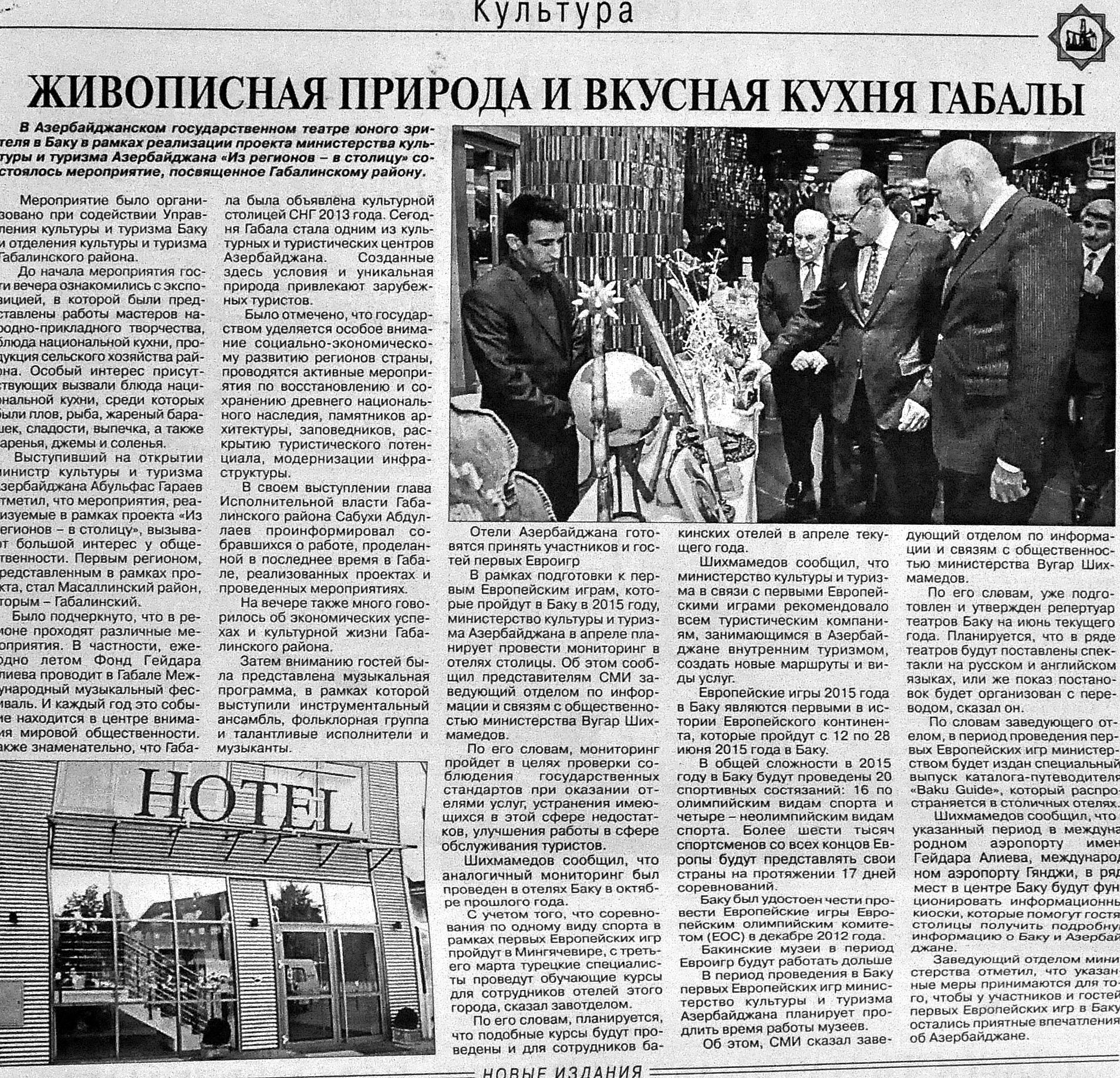 567. Гараев, А. Абульфас Гараев, министр культуры и туризма: «Пока мы играем на качество. Даст бог, оно перерастет в количество: [о турпроектах МКиТ] /интервью провела М.Сидельникова //Азербайджанские известия. - 2015. - 19 марта. - С. 1.