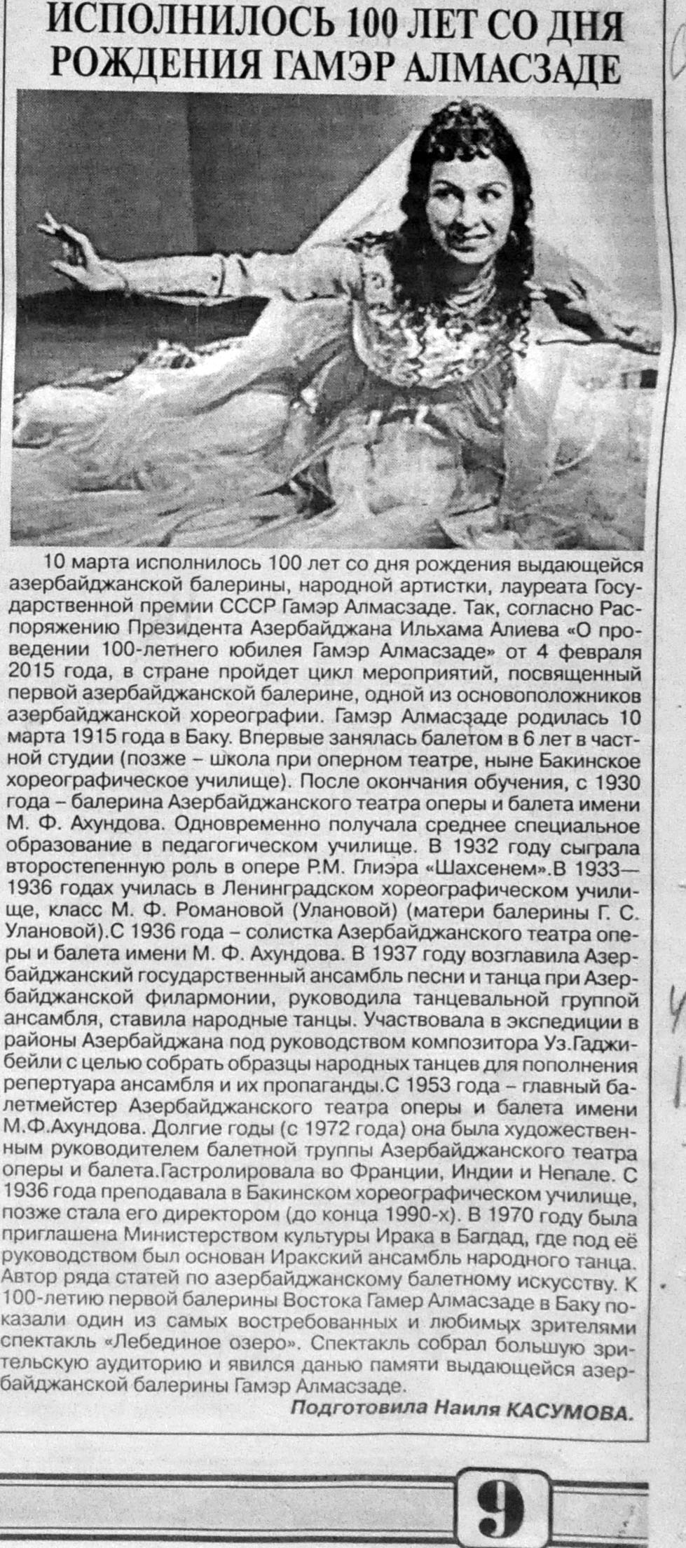 554. Агаев, Н. Блистательная прима национального балета: Исполняется 100 лет со дня рождения первой азербайджанской балерины Гамэр Алмасзаде //Азербайджанские известия.- 2015. - 7 марта - С. 3. 555. Алиева, Н. Грани творчества: Ная Алиева: Танец - это мой протест против всего, что я не в силах изменить /интервью провела Н. Рагимова //Каспiй.- 2015.-11 марта.- С.12. 556. Бабич, А. Андрей Бабич: «Азербайджан - моя родина. Была, есть и останется ею навсегда»: [беседа с создателем шоу-балета «Спайдер», проживающим в Испании] //Эхо.- 2015. - 5 марта. - С. 8. 557. Касумова, Н. Исполнилось 100 лет со дня рождения Гамэр Алмасзаде //Вышка. - 2015. - 13 марта. - С. 9.