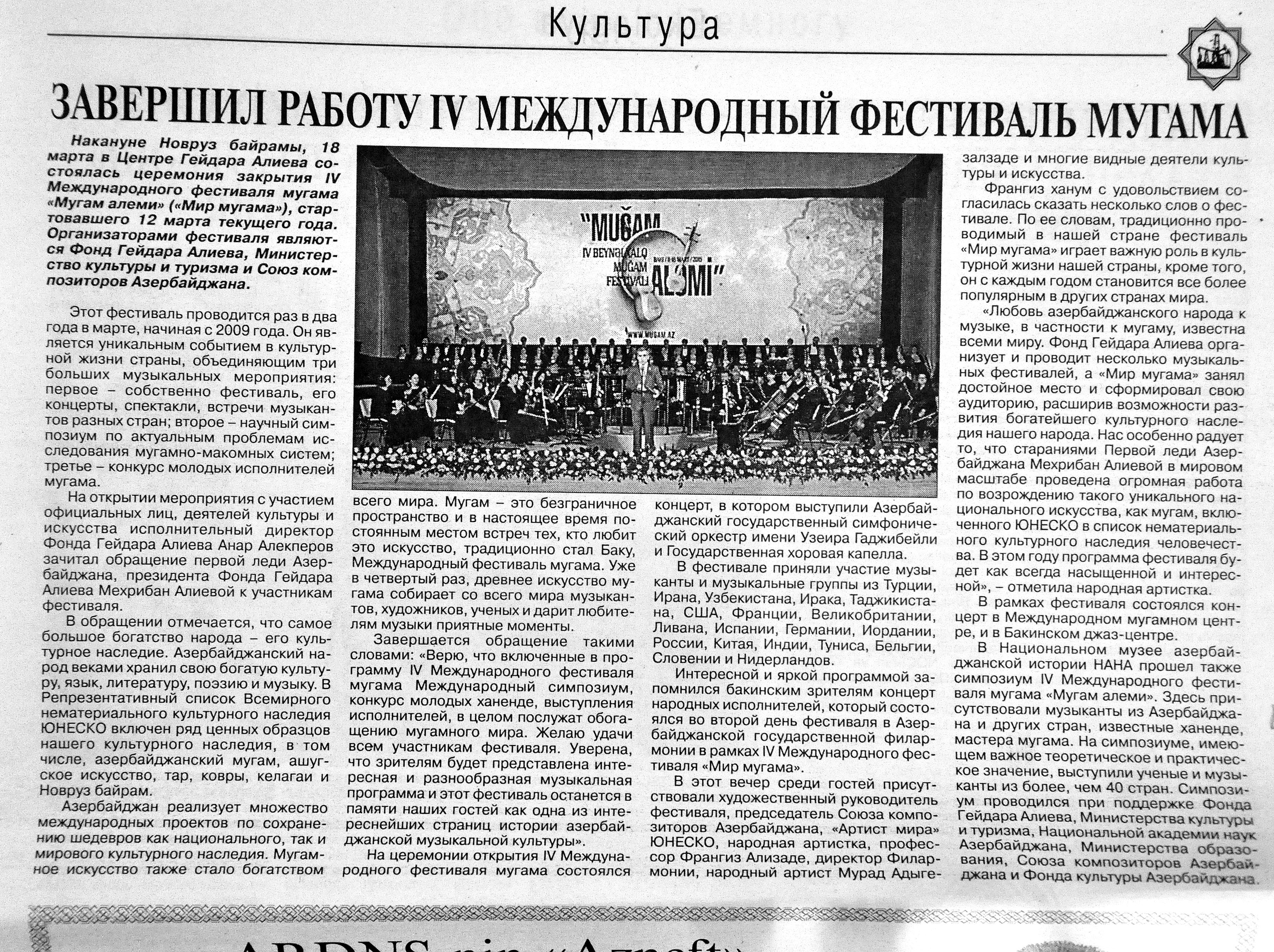 534. Асадова, И. «Мир мугама» начался: В Центре Гейдара Алиева состоялось открытие IV Международного фестиваля мугама //Эхо.- 2015. - 14 марта. - С. 10. 535. В Баку начал работу четвертый международный музыковедческий симпозиум «Мир мугама» //Бакинский рабочий.- 2015. - 13 марта. - С. 5. 536. В Центре Гейдара Алиева состоялось открытие IV Международного фестиваля мугама //Бакинский рабочий.- 2015. - 13 марта. - С. 6. 537. Горизонты мастерства: Четвертый Бакинский фестиваль мугама близится к финалу //Азербайджанские известия.- 2015. - 18 марта. - С. 3. 538. Гусейнов, Э. Голос Лачина: Этирам Гусейнов: Мы еще услышим новые великие имена… //Каспiй.- 2015.-14 марта.- С. 18. 539. Завершил работу IV Международный фестиваль мугама //Вышка. - 2015.- 19 марта. - С.3. 540. Лейла Алиева: «Традиция живет и обновляется: передаваясь от учителя к ученику, она обретает бессмертие» //Бакинский рабочий.- 2015. - 17 марта. - С. 3. 541. Микеладзе, Г. Воспевая величие мугама: Подведены итоги Международного фестиваля //Каспiй.- 2015.- 19 марта.- С. 12.