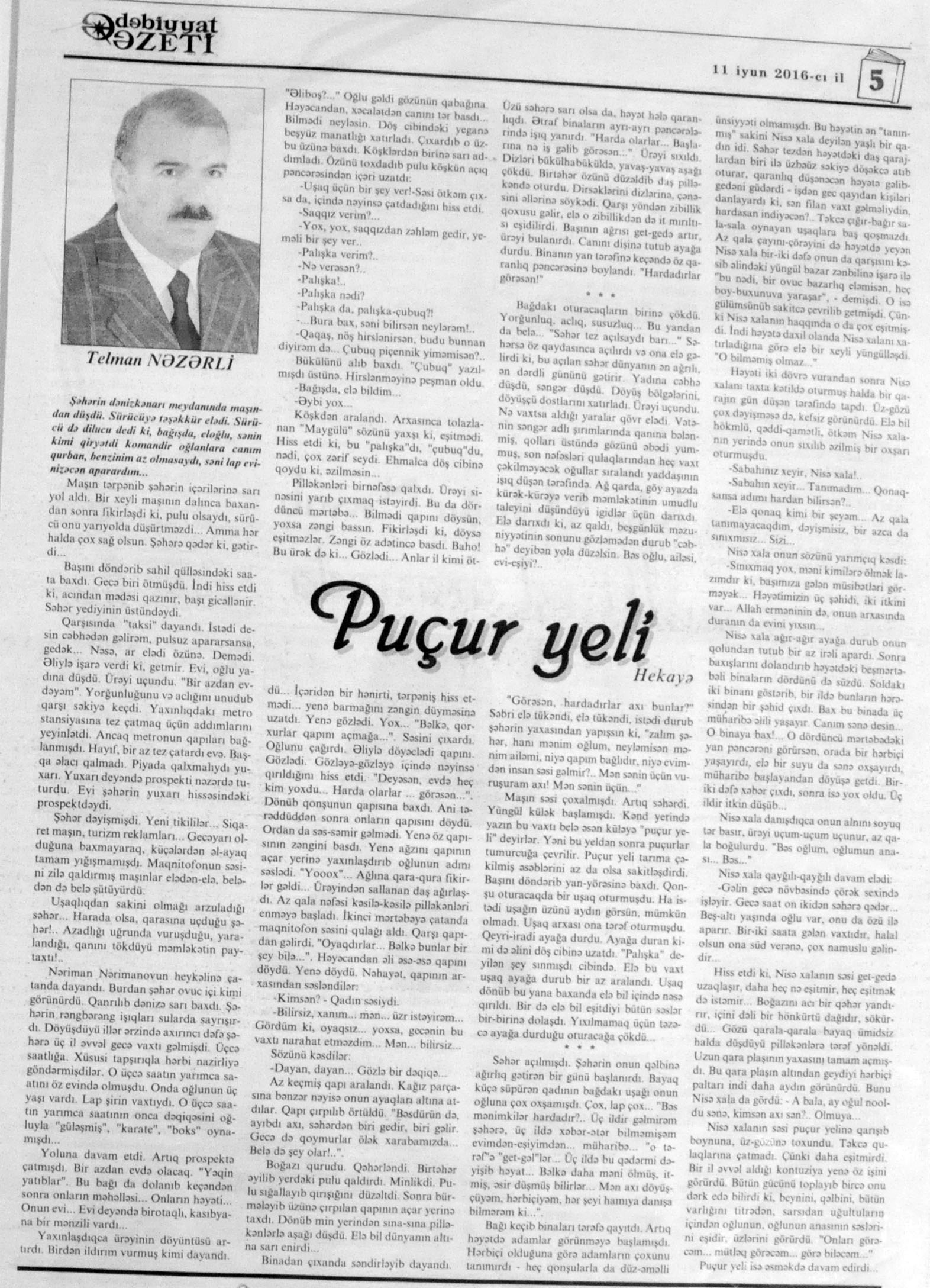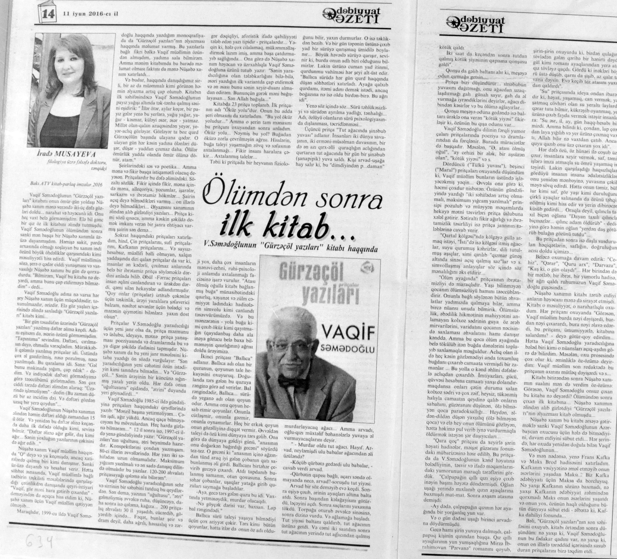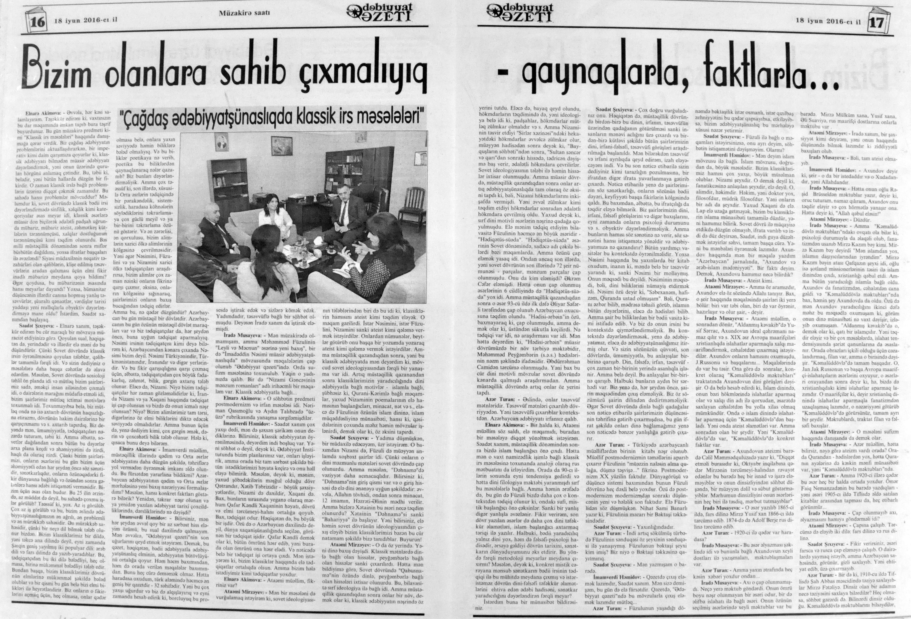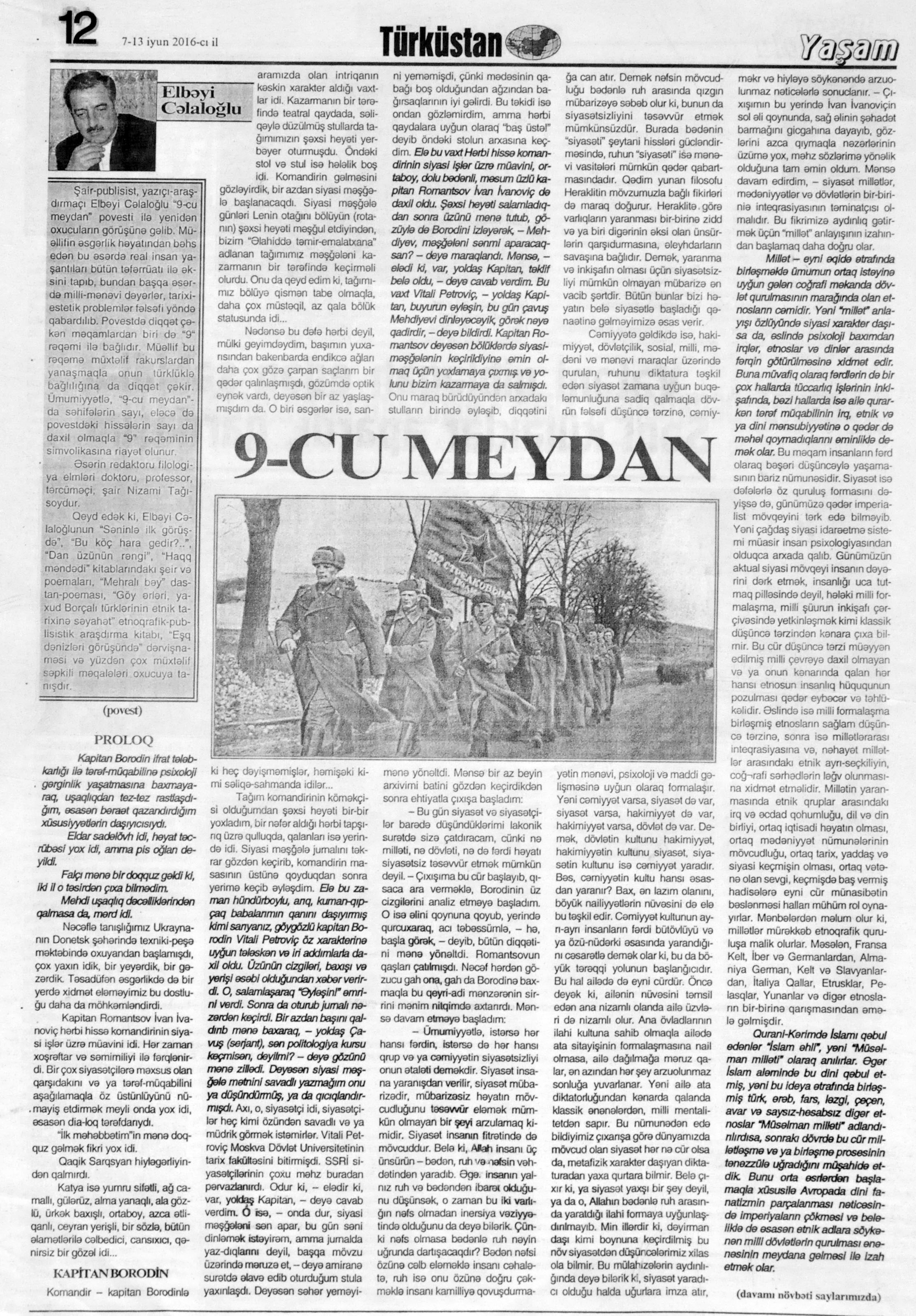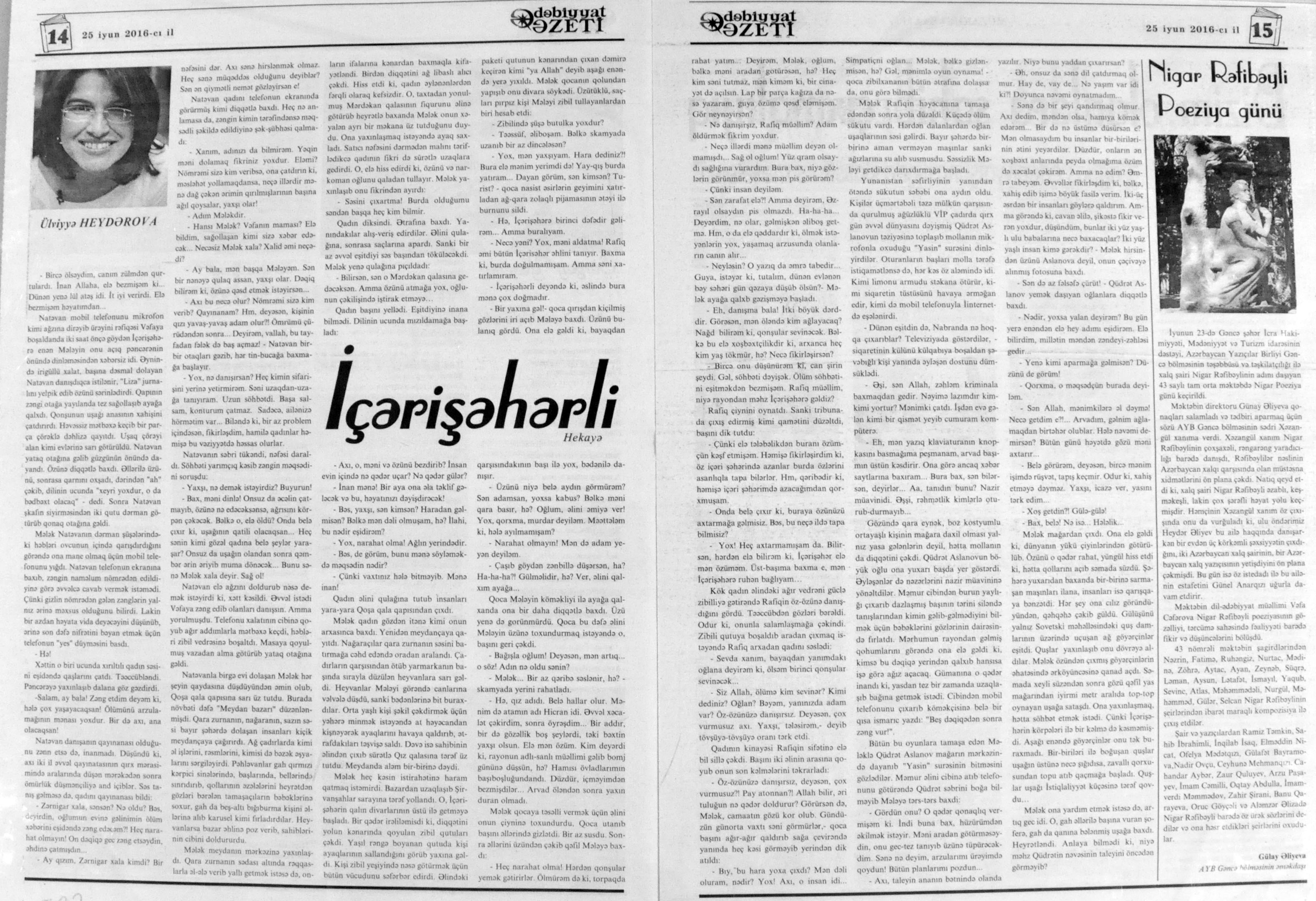 636. Cəlaloğlu, E. 9-cu meydan //Türküstan.- 2016.- 14-20 iyun.- S.12. 637. Cəlaloğlu, E. 9-cu meydan //Türküstan.- 2016.- 7-13 iyun.- S.12. 638. Cəlaloğlu, E. 9-cu meydan //Türküstan.- 2016.-21-27 iyun.- S.12. 639. Nəcəfoğlu, N. Qoytuləli körpüsü – “Bir sədanın ardınca” povestindən parça //525-ci qəzet.- 2016.- 11 iyun.- S.18-19. 640. Nəcəfoğlu, N. Qoytuləli körpüsü – “Bir sədanın ardınca” povestindən parça //525-ci qəzet.- 2016.- 18 iyun.- S.18-19.