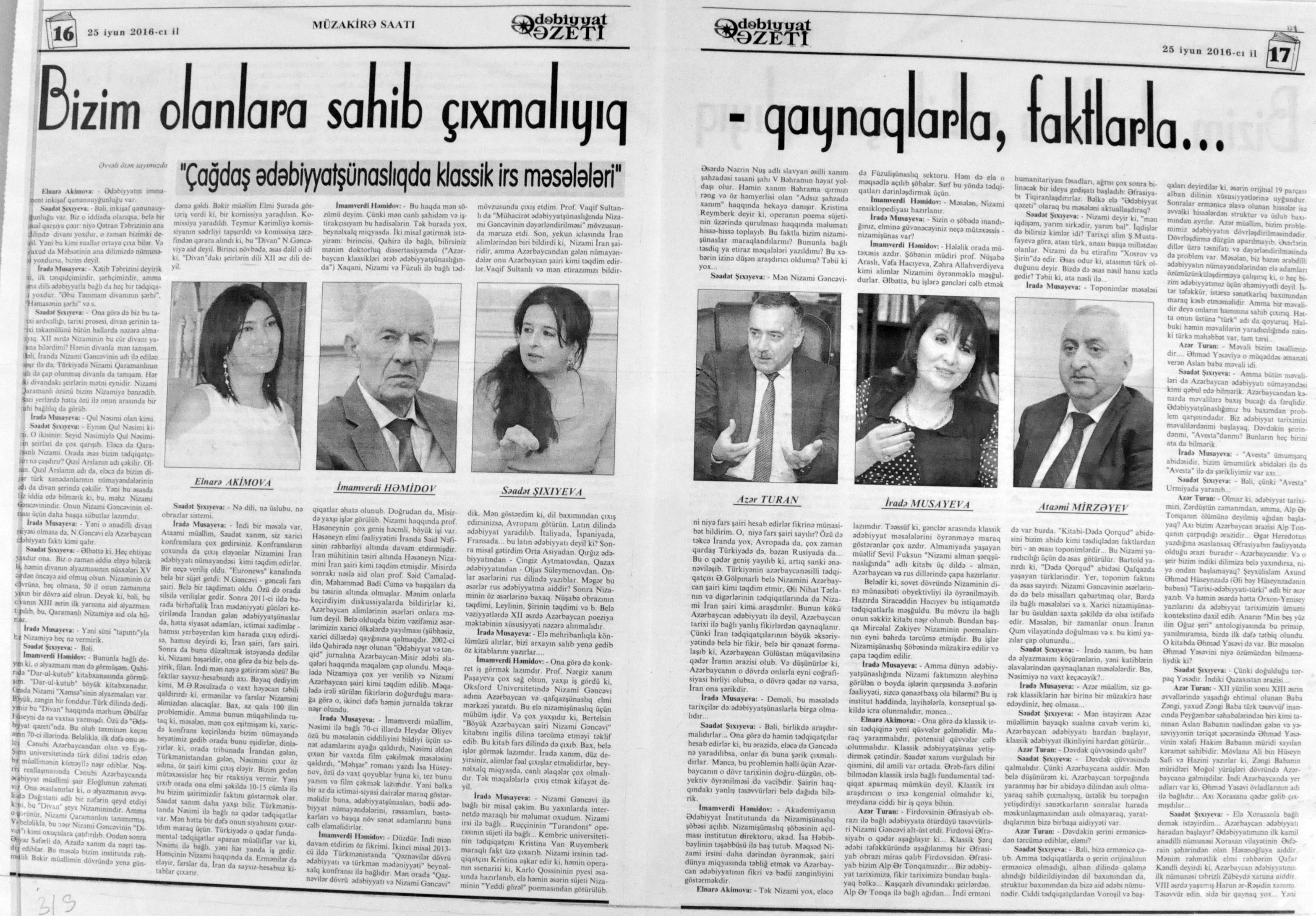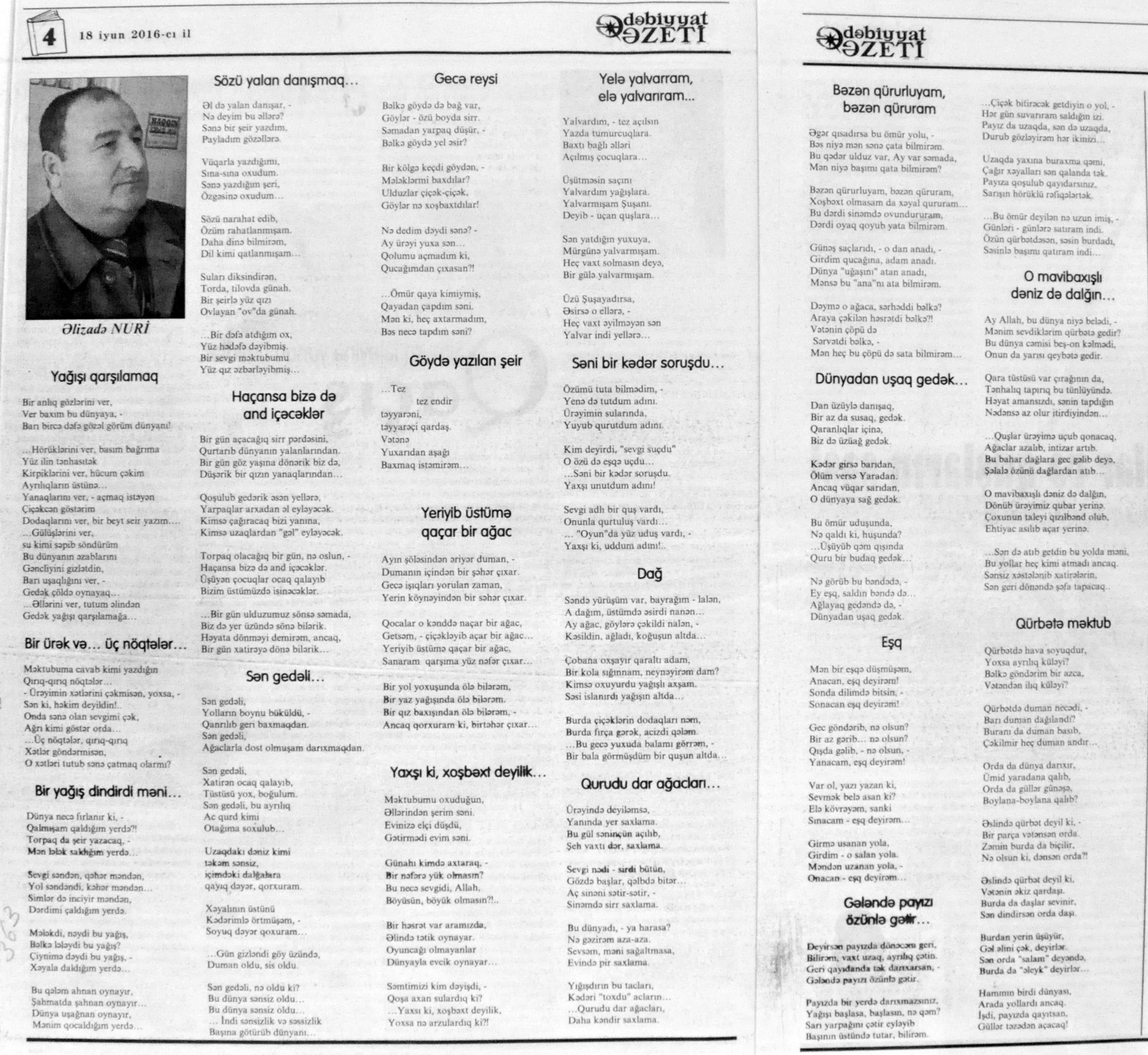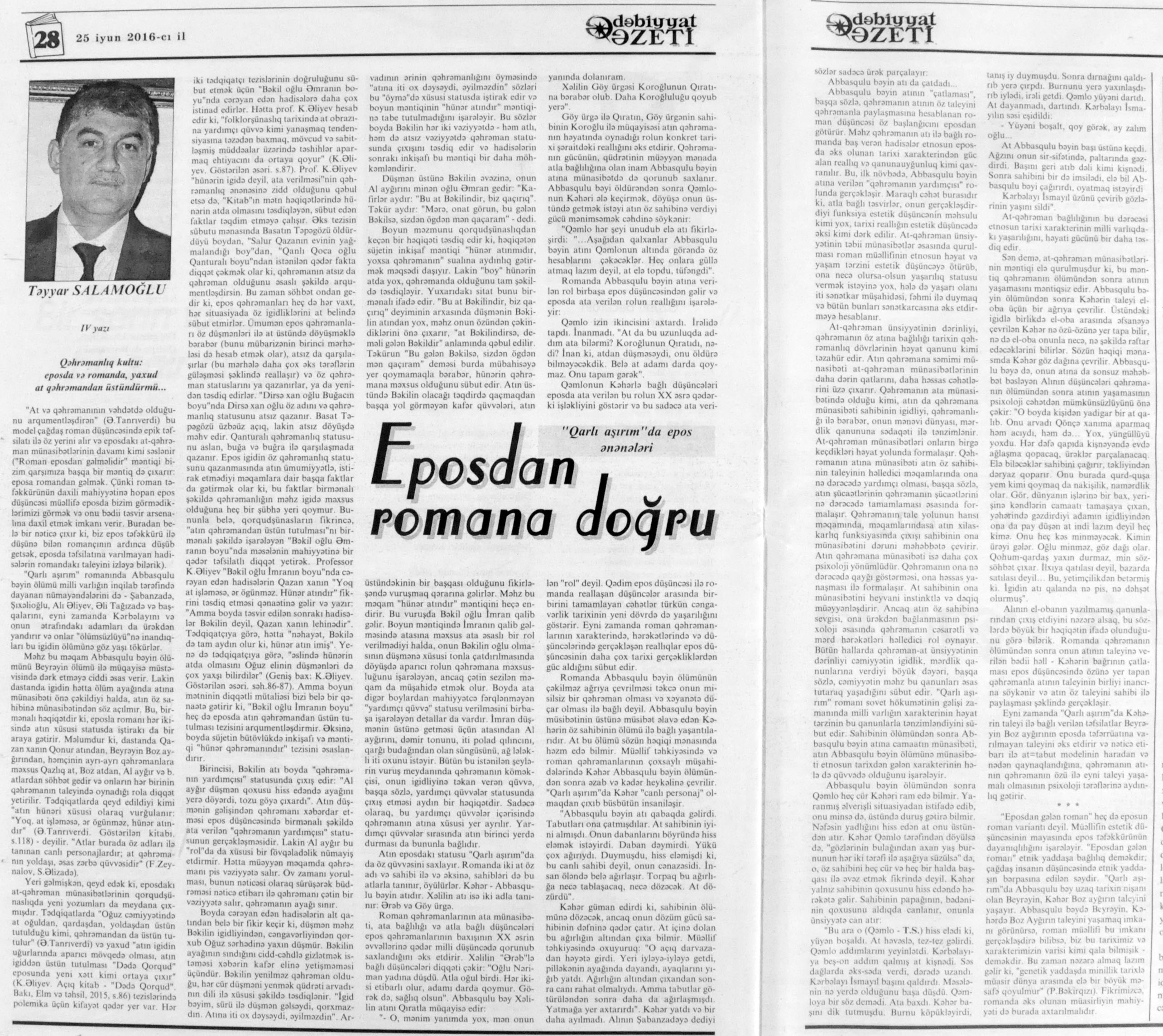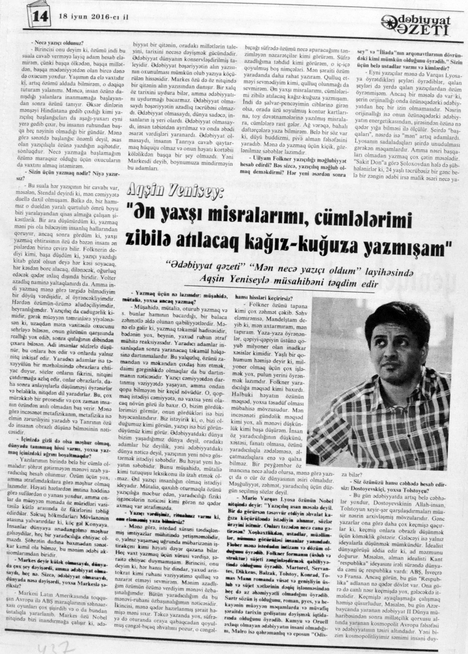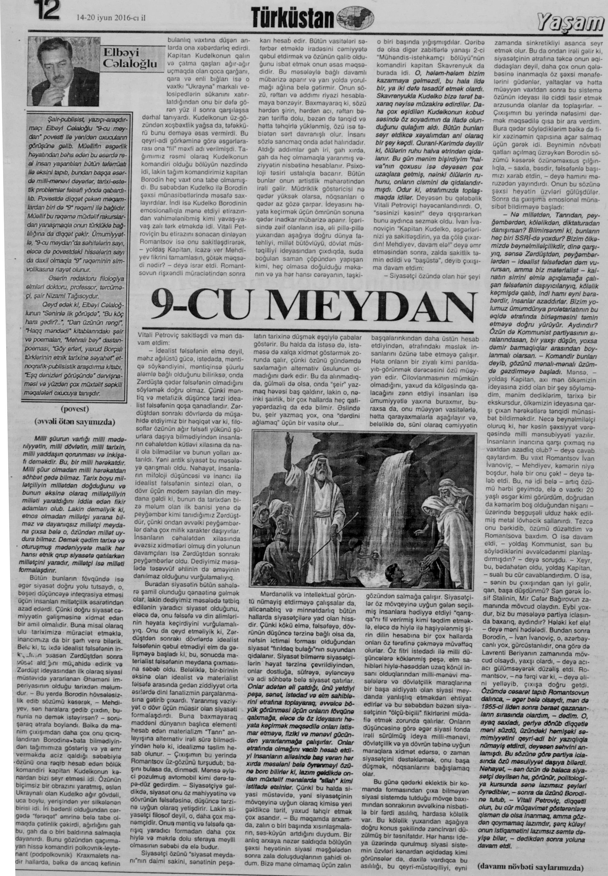 636. Cəlaloğlu, E. 9-cu meydan //Türküstan.- 2016.- 14-20 iyun.- S.12. 637. Cəlaloğlu, E. 9-cu meydan //Türküstan.- 2016.- 7-13 iyun.- S.12. 638. Cəlaloğlu, E. 9-cu meydan //Türküstan.- 2016.-21-27 iyun.- S.12. 639. Nəcəfoğlu, N. Qoytuləli körpüsü – “Bir sədanın ardınca” povestindən parça //525-ci qəzet.- 2016.- 11 iyun.- S.18-19. 640. Nəcəfoğlu, N. Qoytuləli körpüsü – “Bir sədanın ardınca” povestindən parça //525-ci qəzet.- 2016.- 18 iyun.- S.18-19.