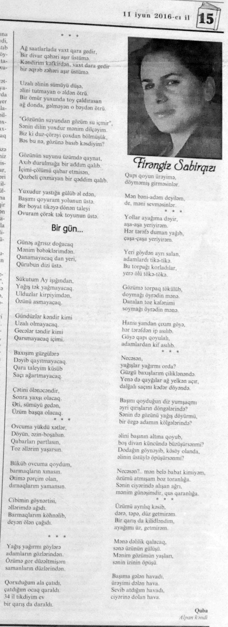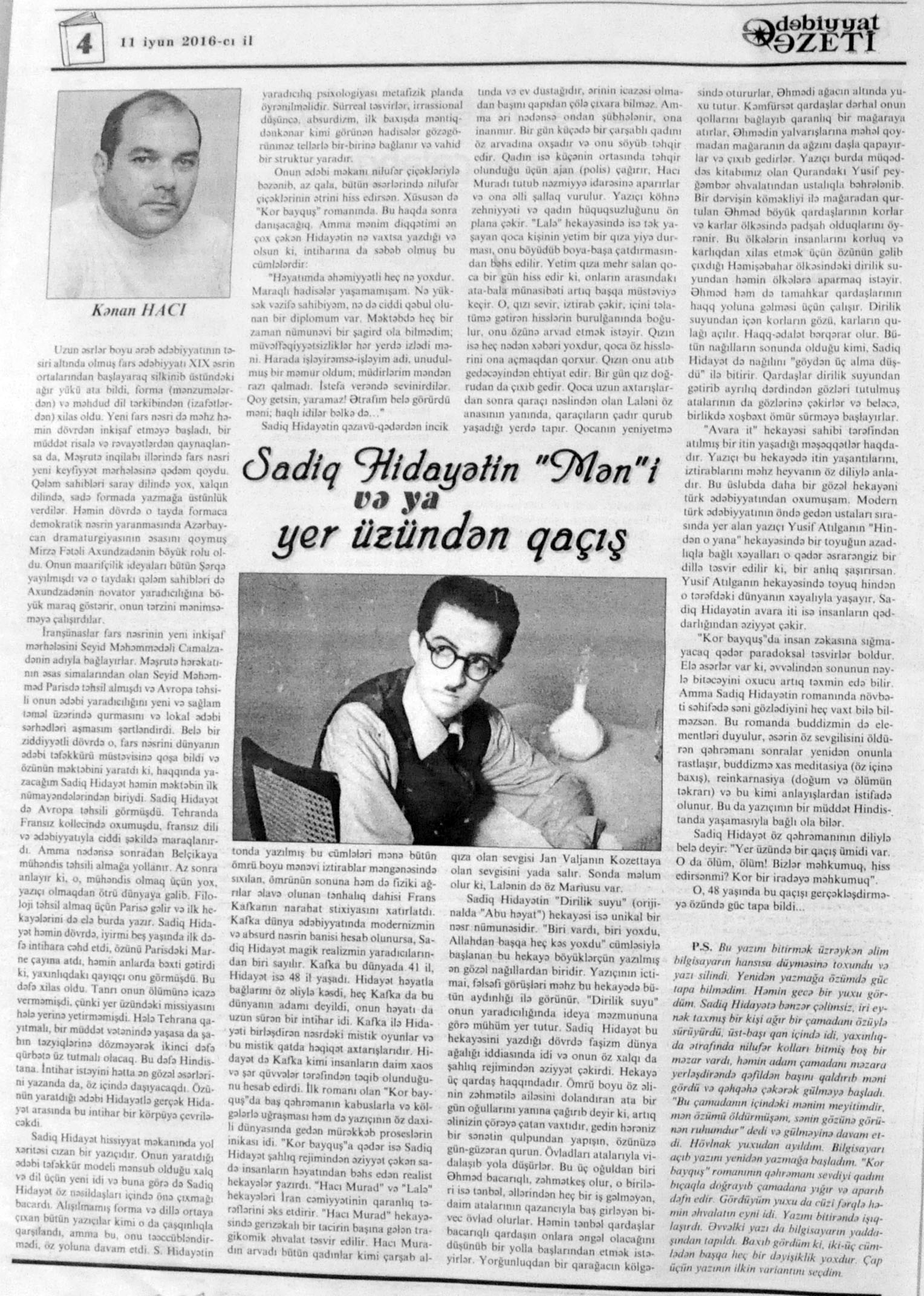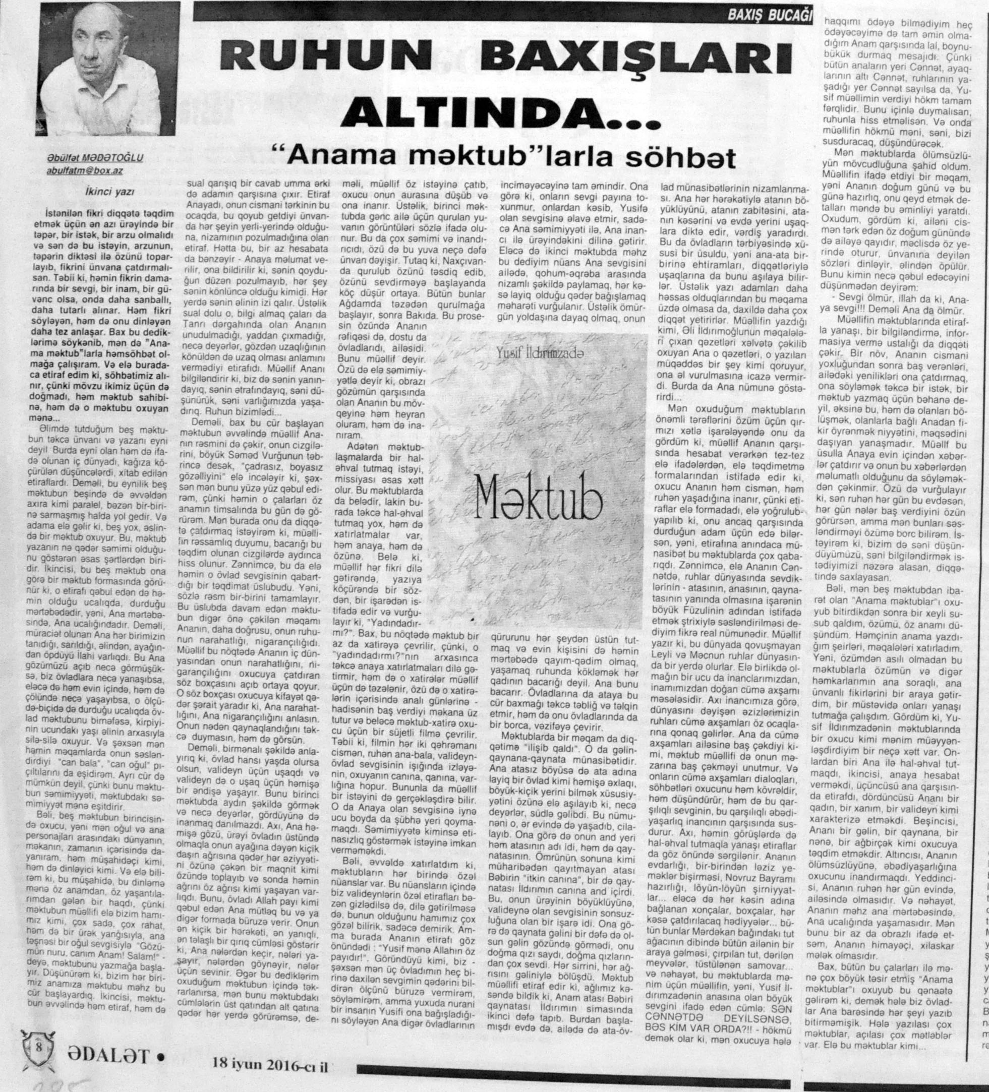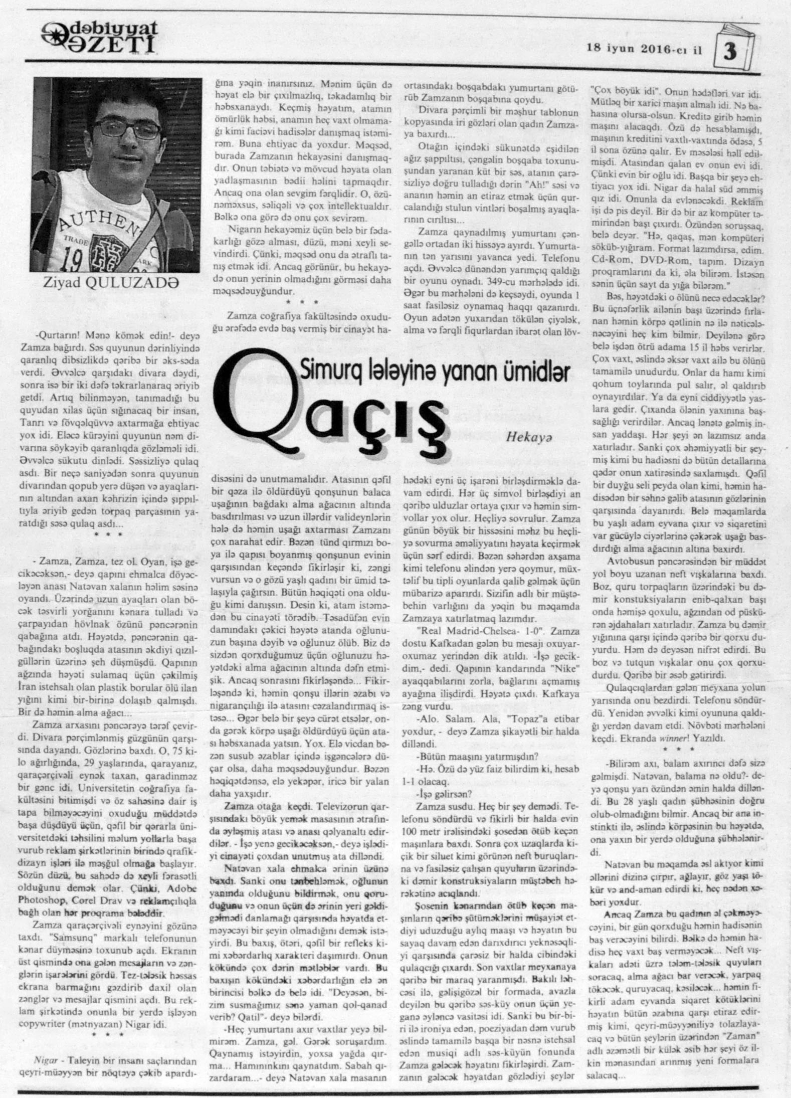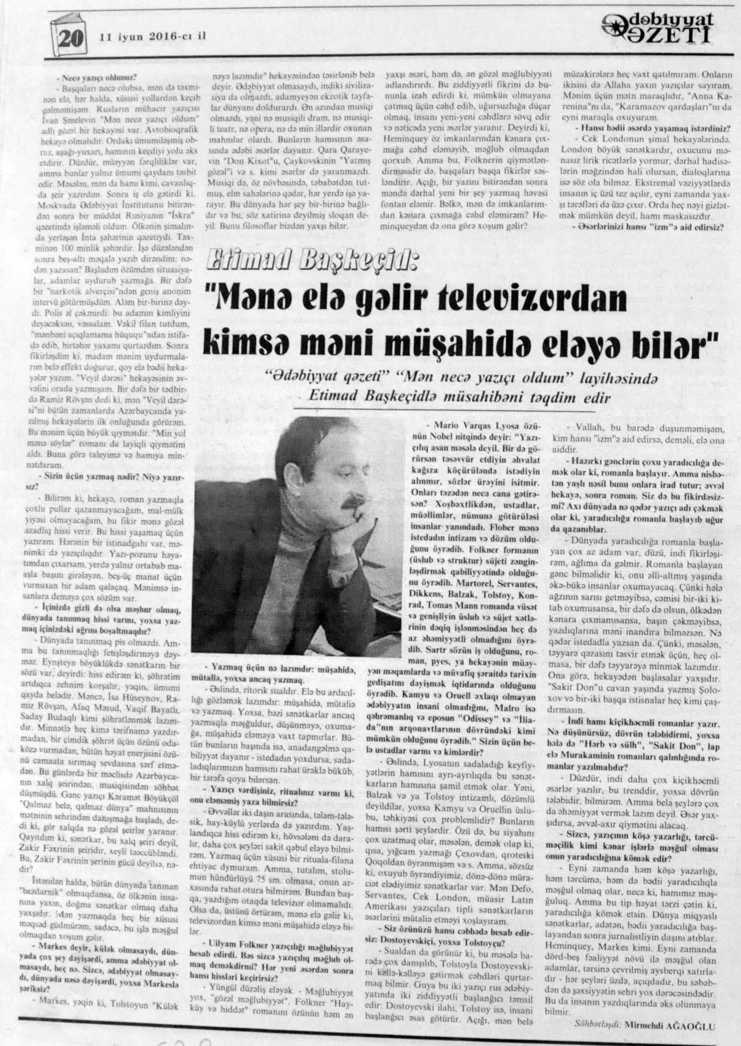 636. Cəlaloğlu, E. 9-cu meydan //Türküstan.- 2016.- 14-20 iyun.- S.12. 637. Cəlaloğlu, E. 9-cu meydan //Türküstan.- 2016.- 7-13 iyun.- S.12. 638. Cəlaloğlu, E. 9-cu meydan //Türküstan.- 2016.-21-27 iyun.- S.12. 639. Nəcəfoğlu, N. Qoytuləli körpüsü – “Bir sədanın ardınca” povestindən parça //525-ci qəzet.- 2016.- 11 iyun.- S.18-19. 640. Nəcəfoğlu, N. Qoytuləli körpüsü – “Bir sədanın ardınca” povestindən parça //525-ci qəzet.- 2016.- 18 iyun.- S.18-19.