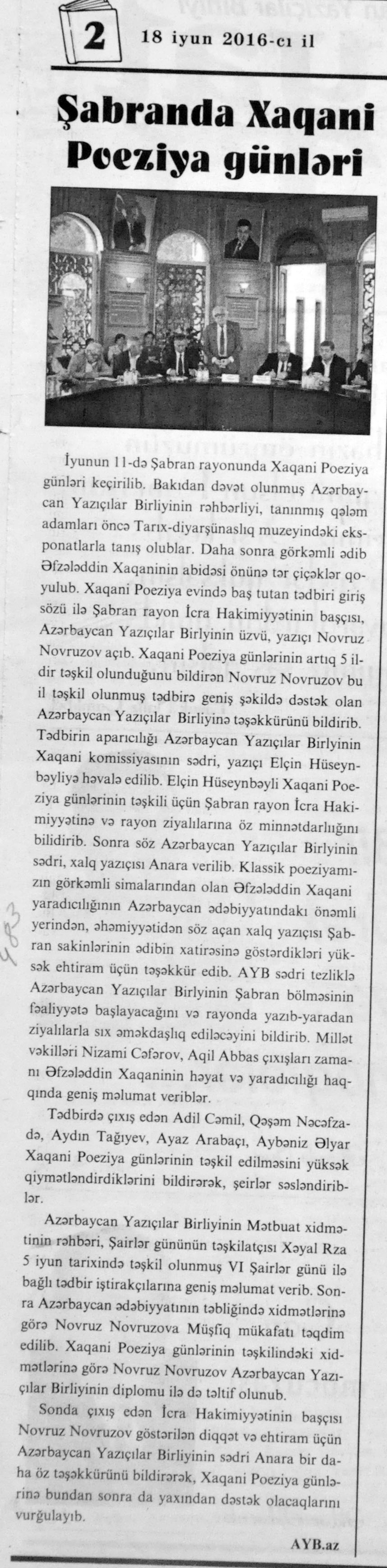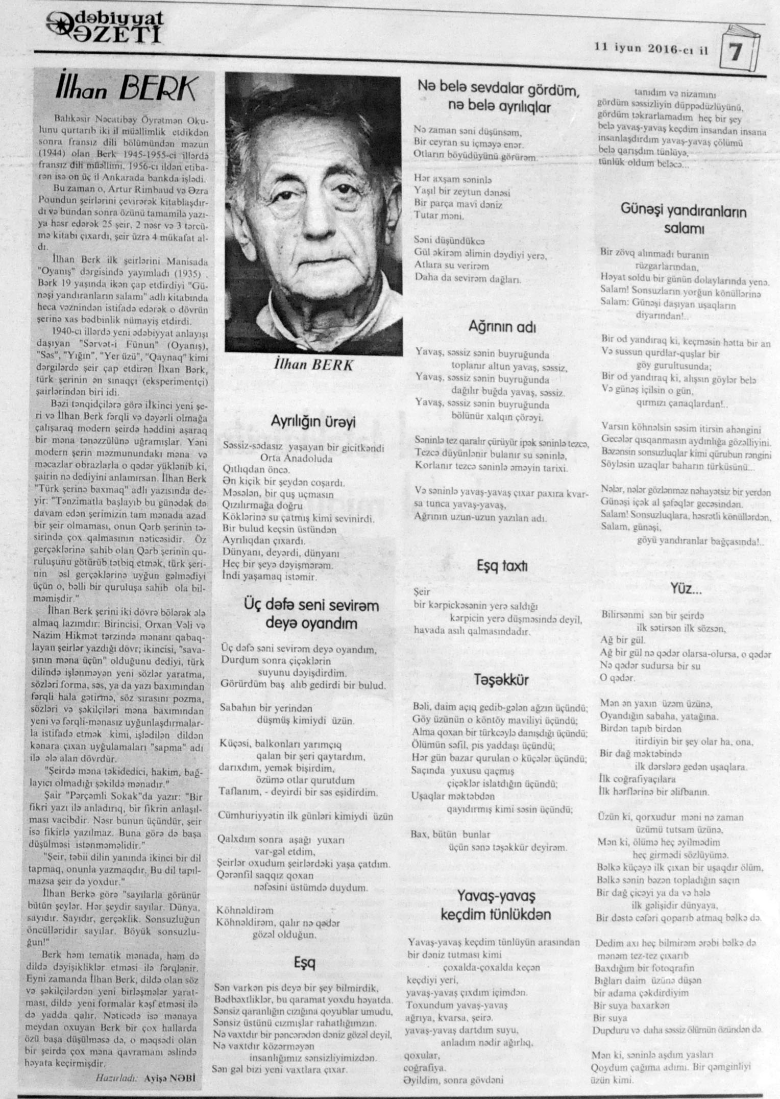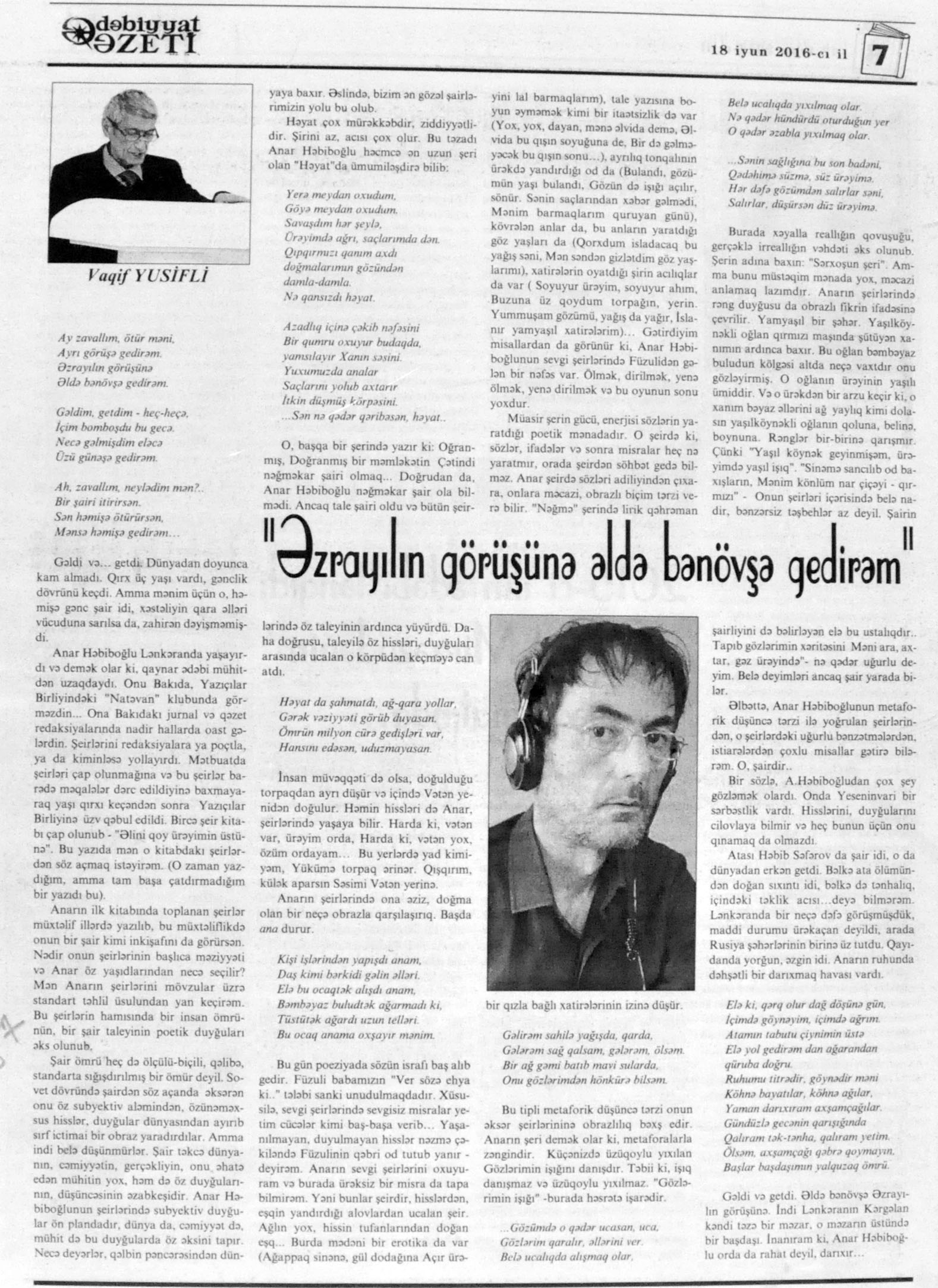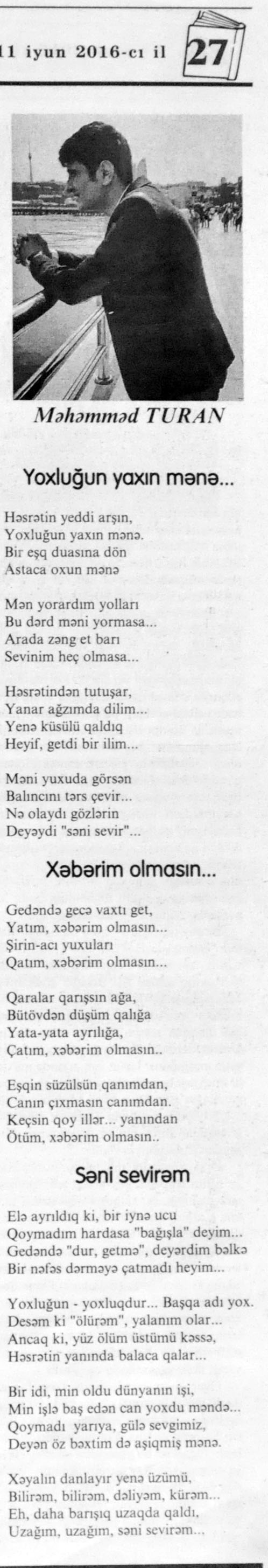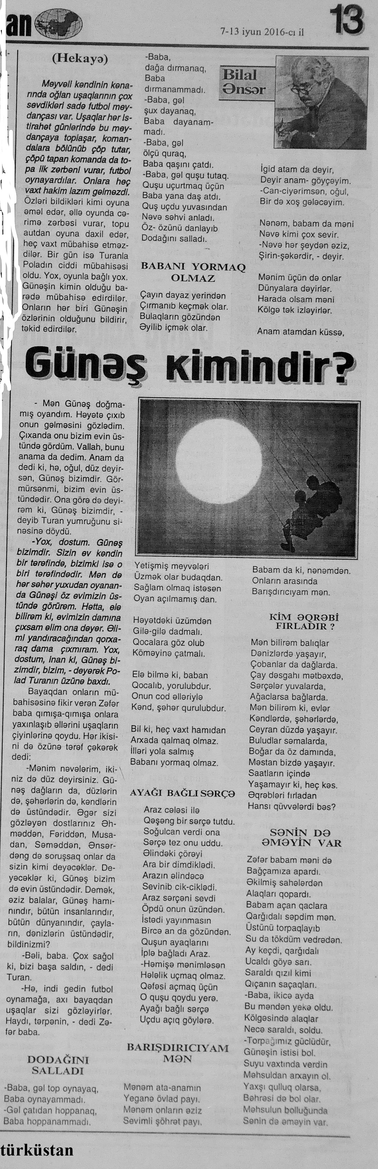 636. Cəlaloğlu, E. 9-cu meydan //Türküstan.- 2016.- 14-20 iyun.- S.12. 637. Cəlaloğlu, E. 9-cu meydan //Türküstan.- 2016.- 7-13 iyun.- S.12. 638. Cəlaloğlu, E. 9-cu meydan //Türküstan.- 2016.-21-27 iyun.- S.12. 639. Nəcəfoğlu, N. Qoytuləli körpüsü – “Bir sədanın ardınca” povestindən parça //525-ci qəzet.- 2016.- 11 iyun.- S.18-19. 640. Nəcəfoğlu, N. Qoytuləli körpüsü – “Bir sədanın ardınca” povestindən parça //525-ci qəzet.- 2016.- 18 iyun.- S.18-19.