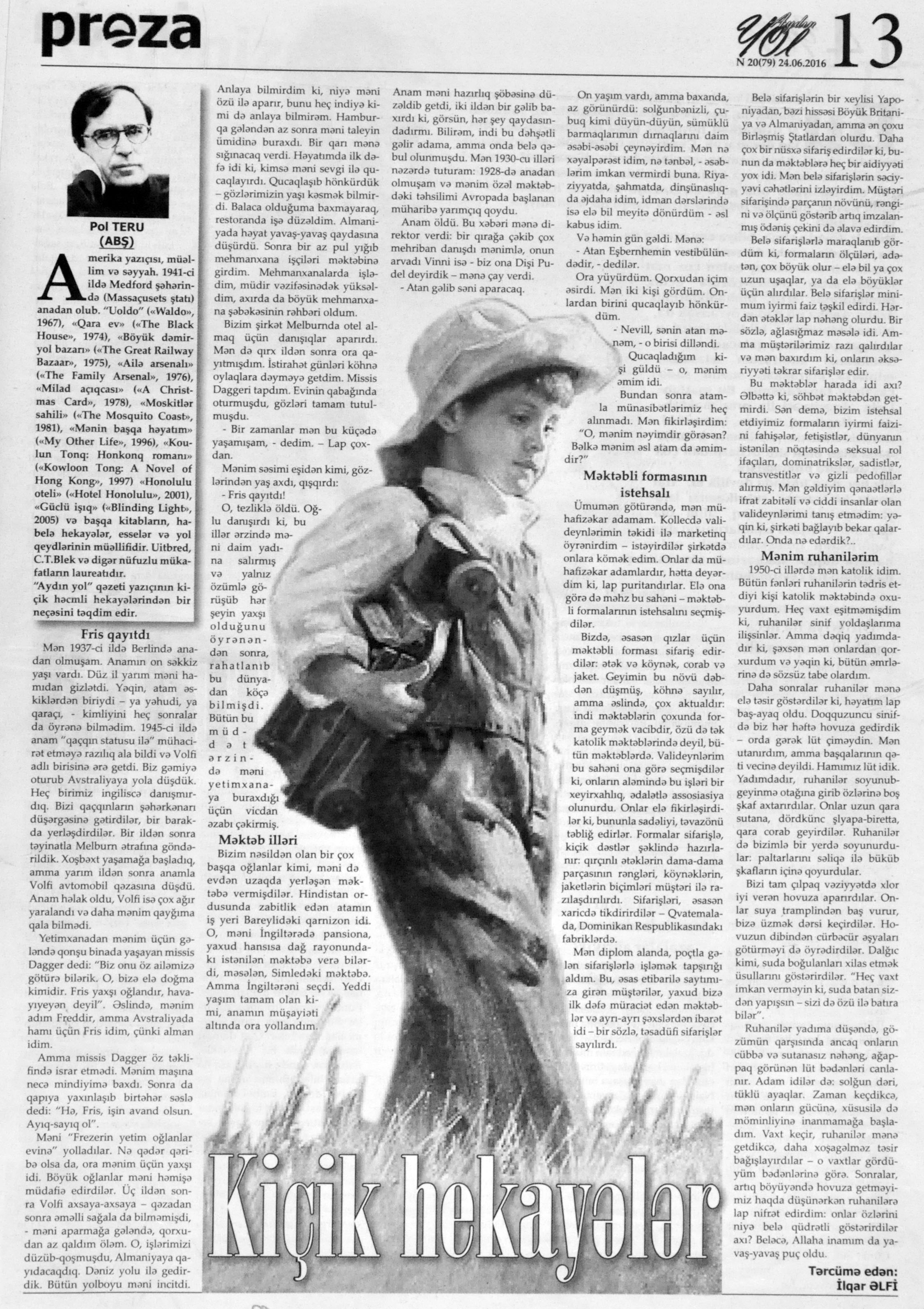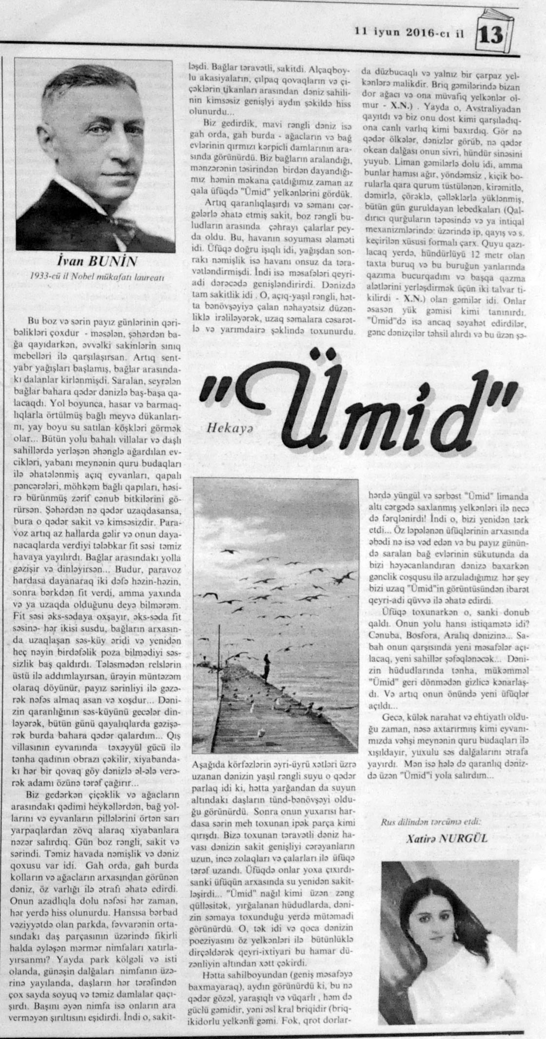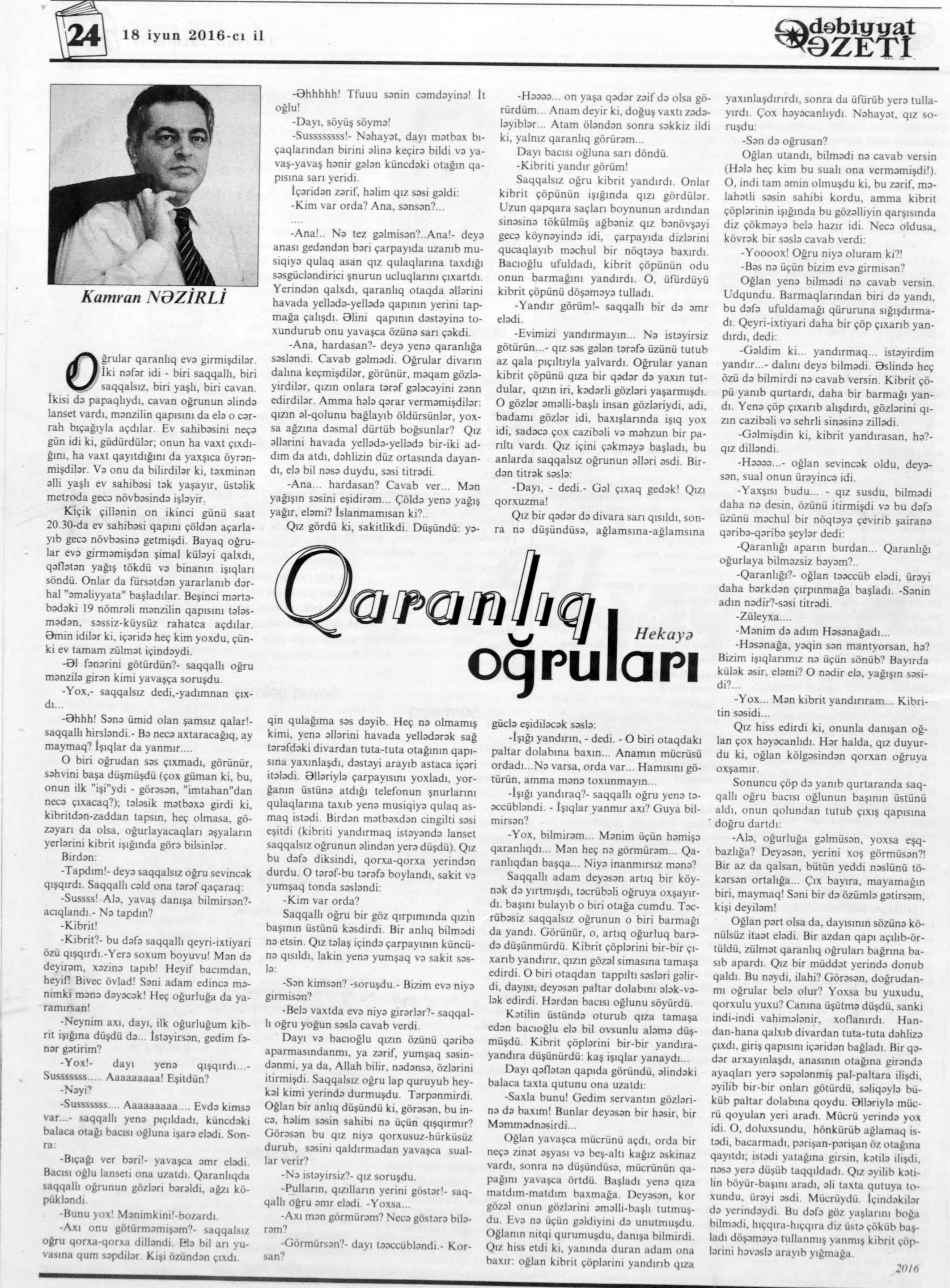 596. Abasova, A. Stəkan //Ədəbiyyat qəzeti.- 2016.- 4 iyun.- S.28. 597. Aran, S. Sazaq //Ədəbiyyat qəzeti.- 2016.- 4 iyun.- S.4. 598. Barbüs, A. Şəfqət: [rus dilindən tərcümə] /tərc. etdi Xatirə Nurgül //Ədəbiyyat qəzeti.- 2016.- 4 iyun.- S.24. 599. Bəxtiyar, N. Quzu //Ədalət.-2016.- 22 iyun. - S.4. 600. Bunin, İ. “Ümid”: [rus ədəbiyyatından tərcümə] /tərc. etdi Xatirə Nurgül // Ədəbiyyat qəzeti.- 2016.- 11 iyun.- S.13. 601. Əbdülhəlimov, H. Əşrəfi şillə – (xatirə-hekayə) //525-ci qəzet.- 2016.- 21 iyun.- S.7-8. 602. Əhmədov, X. Tut ağacının kölgəsi //Kaspi.- 2016.- 11-13 iyun.- S.17. 603. Əlioğlu, Ə. Dərman //Kaspi.- 2016.- 11-13 iyun.- S.20. 604. Əlioğlu, Ə. Qırma //Kaspi.- 2016.- 11-13 iyun.- S.20. 605. Ənsər, B. Günəş kimindir? //Türküstan.- 2016.- 7-13 iyun.- S.13. 606. Əşrəfqızı, R. Cavanam, keçmə məndən //525-ci qəzet.- 2016.- 14 iyun.- S.7-8. 607. Heydərova, Ü. İçərişəhərli //Ədəbiyyat qəzeti.- 2016.- 25 iyun.- S.14-15. 608. İsmayılov, İ.Yurd gürzəsi //Azərbaycan.- 2016.- 10 iyun.- S.5; Ədalət.- 2016.- 11 iyun. - S.5. 609. Kanetti, E. Uşaqlığın tarixçəsi: [avstriya dilindən tərcümə] /tərc. etdi Nəriman Əbdülrəhmanlı //Aydın yol.- 2016.- 3 iyun.- S.13. 610. Quluzadə, Z. Simruq lələyinə yanan ümidlər: Qaçış //Ədəbiyyat qəzeti.- 2016.- 18 iyun.- S.3. 611. Mehdi, Q. İslahat(çı) – (çoxseriyalı hekayə) //525-ci qəzet.- 2016.- 11 iyun.- S.21-22. 612. Mişima, Y. Turşəng çiçəkləri: [Yapon ədəbiyyatından tərcümə] /tərc. etdi Xatirə Nurgül //Ədəbiyyat qəzeti.- 2016.- 25 iyun.- S.26. 613. Nəbi, A. Alma //Ədəbiyyat qəzeti.- 2016.- 4 iyun.- S.25. 614. Nəzərli, T. Puçur yeli //Ədəbiyyat qəzeti.- 2016.- 11 iyun.- S.5. 615. Nəzirli, K. Qaranlıq oğruları //Ədəbiyyat qəzeti.- 2016.- 18 iyun.- S.24. 616. Nəzirli, K. Sarışın mələk //Kaspi.- 2016.- 25-28 iyun.- S.21. 617. Osamu, D. Gilənar çiçəkləri və fileyta: [Yapon ədəbiyyatından tərcümə] /tərc. etdi Güldəstə //Aydın yol.- 2016.- 17 iyun.- S.13. 618. Səxavət, S. Kenquru: Bakıda Yusif Səmədoğlu ilə qəbirüstü söhbət //525-ci qəzet.- 2016.- 4 iyun.- S.22. 619. Şahani, X. Uğurun sirri: [fars ədəbiyyatından tərcümə] /tərc.etdi Bəhlul Seyfəddinoğlu //Aydın yol.- 2016.- 10 iyun.- S.13. 620. Teru, P. Kiçik hekayələr: [Amerika ədəbiyyatından tərcümə] /tərc etdi İlqar Əlfi //Aydın yol.- 2016.- 24 iyun.- S.13. 621. Vəli, Ş. Ölü doğulan şeir //525-ci qəzet.- 2016.- 23 iyun.- S.7. 622. Yılmaz, Ş. Sürgün //Kaspi.- 2016.- 25-28 iyun.- S.22-23.
