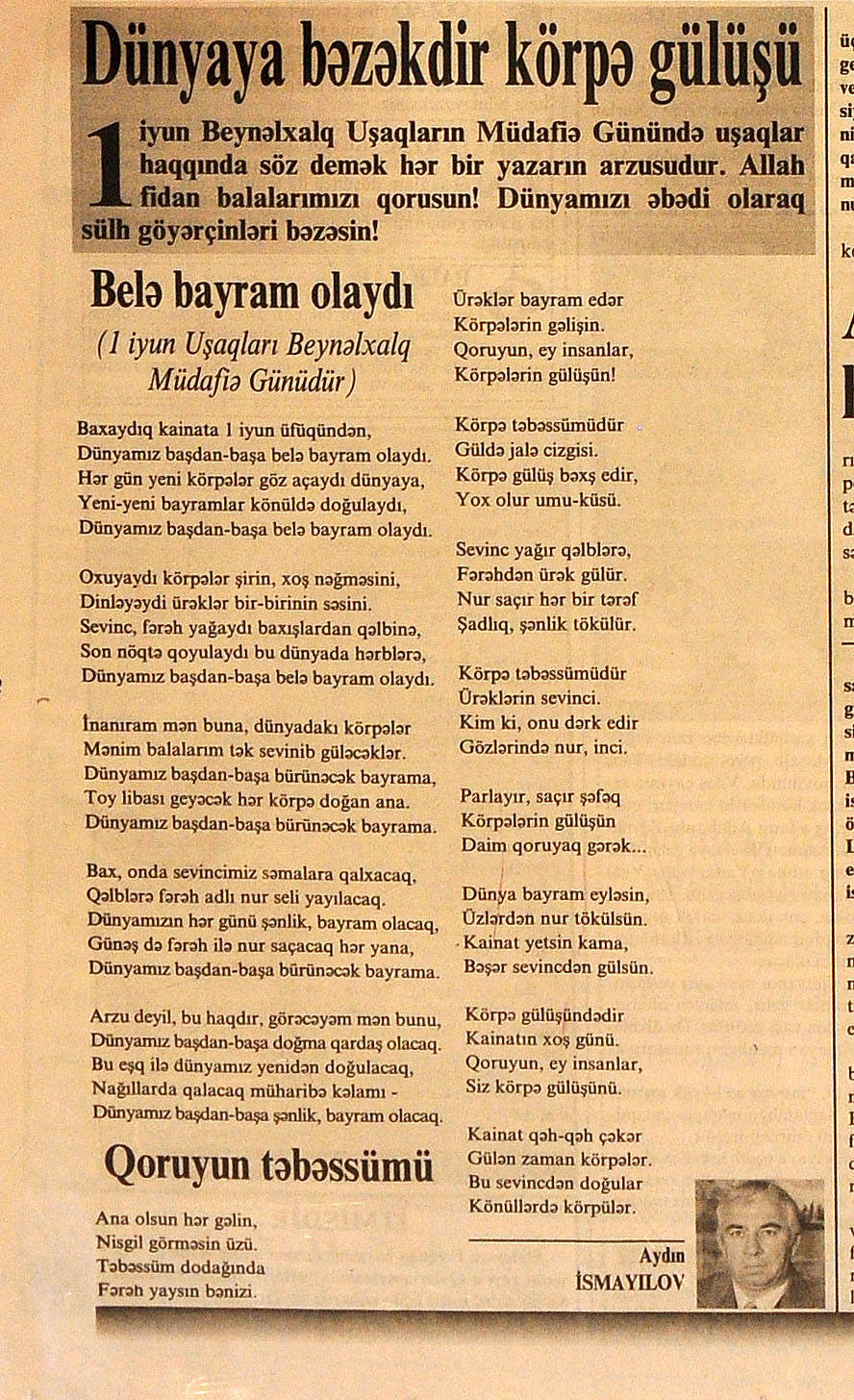 55. Azəri, L. Musiqi məktəbində bayram tədbiri: [Şövkət Ələkbərova adına 20 saylı Uşaq Musiqi məktəbində] //Mədəniyyət.- 2016.- 3 iyun.- S.6. 56. Bakı musiqi məktəblərinin açıq səma altında bayram konserti //Mədəniyyət.- 2016.- 1 iyun.- S.2. 57. “Bugünün qönçələri, sabahın çiçəkləri”: [Xalça Muzeyinin keçirdiyi eyniadlı tədbir haqqında] //Mədəniyyət.- 2016.- 3 iyun.- S.8. 58. Dünyanı uşaqlara verək: Bölgələrdə 1 İyun – Beynəlxalq Uşaqları Müdafiə Gününə həsr olunmuş tədbir keçirilib //Mədəniyyət.- 2016.- 3 iyun.- S.7. 59. Fərəcov, S. Bütün uşaqların qayğıya ehtiyacı var: [Cəfər Cabbarlı adına Dövlət Teatr Muzeyində keçirilən tədbir haqqında] //Mədəniyyət.- 2016.- 1 iyun.- S.2. 60. Fərəcov, S. Dövlət Uşaq Filarmoniyasından daha bir konsert proqramı //Mədəniyyət.- 2016.- 3 iyun.- S 6. 61. Hüseynov, F. Uşaq Filarmoniyasında növbəti musiqi axşamı //Mədəniyyət.-2016.-1 iyun.- S.3. 62. “Musiqi fidanları”: [Niyazinin mənzil-muzeyində eyniadlı konsert proqramının keçirilməsi haqqında] //Mədəniyyət.- 2016.- 3 iyun.- S.5. 63. Roman Viktyukun teatrı Uşaqların Beynəlxalq Müdafiəsi Günündə Bakıda qeyri-adi tamaşa təqdim edib: [“ÜNS” Yaradıcılıq Səhnəsində] //Azərbaycan.- 2016.- 3 iyun.- S.7. 64. Uşaqların bayram günündə açıq havada sərgi və konsert //Mədəniyyət.- 2016.- 3 iyun.- S.8.