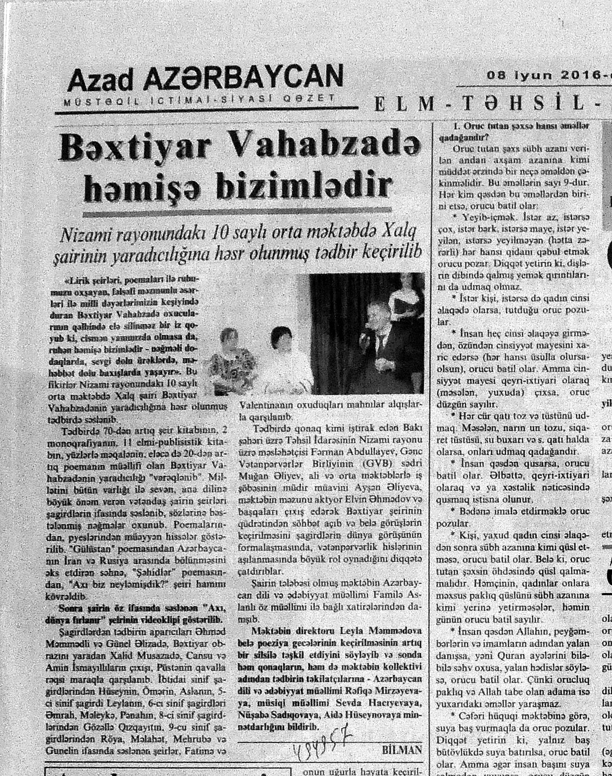 45. Aydınoğlu, T. “Qurtuluş” azadlıq erasının başlanğıcı oldu: [Xalq şairi Fikrət Qocanın ulu öndər Heydər Əliyevin Qurtuluş konsepsiyasının əhəmiyyətini yüksək dəyərləndirməsi haqqında] //Xalq qəzeti.- 2016.- 15 iyun.- S.6. 46. Baxşəliyev, R. Səbaildə möhtəşəm bayram tədbiri keçirilib //Azərbaycan.- 2016.- 14 iyun.- S. 4. 47. Bölgələrdə bayram tədbirləri //Mədəniyyət .- 2016.- 17 iyun.- S.14. 48. Əliyev, S. Qazaxda möhtəşəm bayram tədbiri //Azərbaycan.- 2016.- 17 iyun.- S. 12. 49. Gənc rəssamın fərdi rəsm sərgisi: [Xumar Kazımlının] //Mədəniyyət.- 2016.- 17 iyun.- S.7. 50. Kitabxanaların onlayn görüşü //Mədəniyyət.-2016.- 15 iyun.- S.15. bax 51. Məmmədov, Z. Qurtuluşdan başlanan yüksəliş: [Heydər Əliyevin siyasi fəaliyyəti haqqında] //İki sahil.- 2016.-14 iyun.- S.11. 52. Mükərrəmoğlu, M. “15 İyun – Milli Qurtuluş Günüdür” adlı kitab sərgisi: [M.F.Axundov adına Milli Kitabxanada] //Xalq qəzeti.- 2016.- 14 iyun.- S.5. 53. Nərimanov rayonunda 15 İyun - Milli Qurtuluş Gününə həsr olunmuş bayram tədbiri keçirilib //Yeni Azərbaycan.-2016.- 15 iyun.- S.5. 54. Vəliyev, M. Möhtəşəm bayram tədbiri //Respublika.- 2016.- 14 iyun.- S.8.