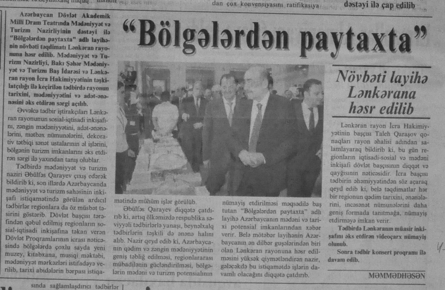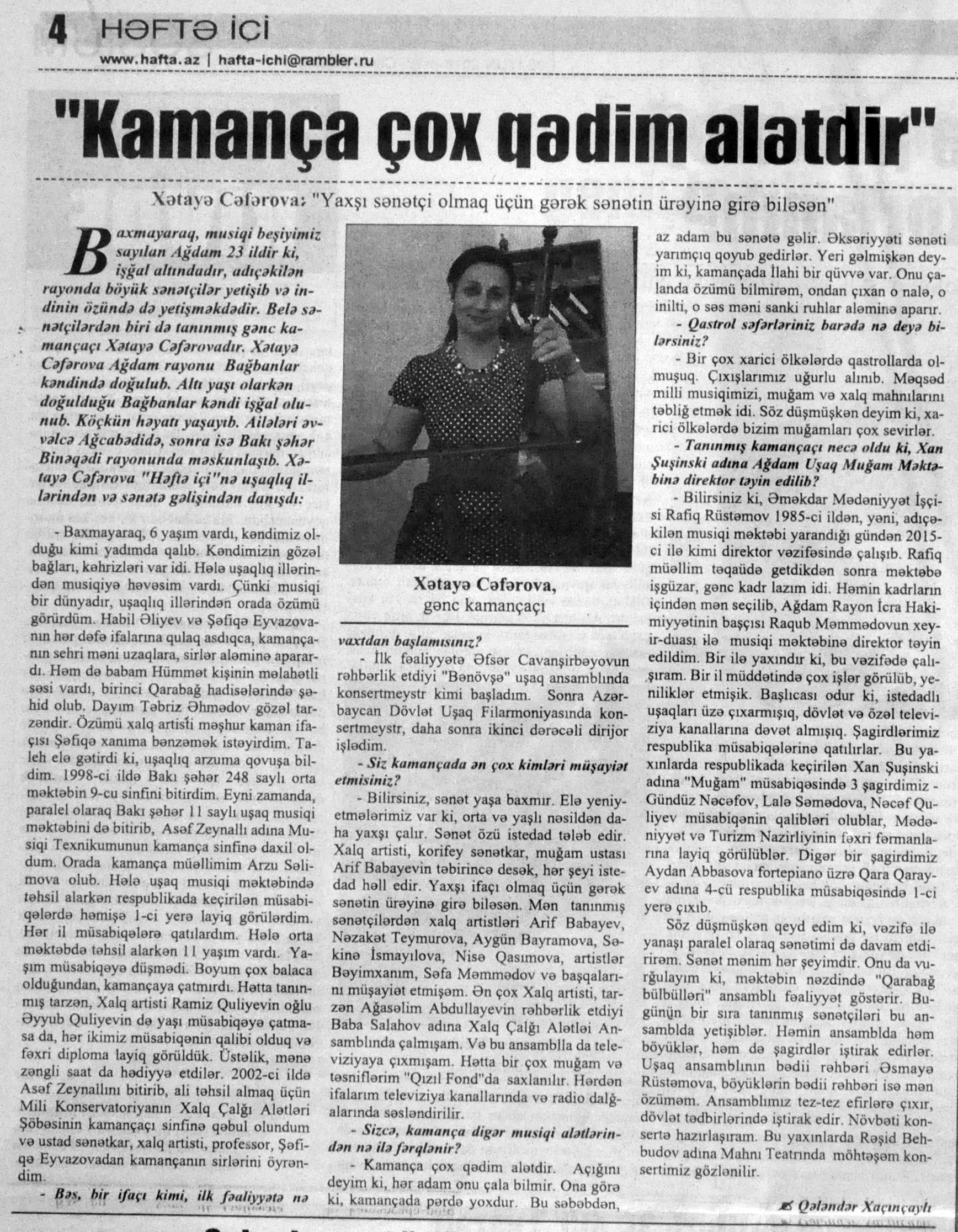 272. Həmişə müasir olan qədim sənət nümunələri //Azərbaycan.- 2016.- 19 iyun.- S. 8. 273. Səlimov, Ə. Möhtəşəm tarix – modern inkişaf: Lahıc sənətkarlıqla elmin qovuşduğu məkandır //Azərbaycan.- 2016.- 23 iyun.- S.1;7. 274. Uşaq İncəsənət məktəbinin 45 illiyi qeyd edilib: [Sumqayıt Şəhər Bülbül adına Uşaq İncəsənət məktəbi haqqında] //Mədəniyyət.- 2016.- 22 iyun.- S. 5. 275. Zümrüd. İsmayıllıda “Sənətkarlıq bazarı” //Səs.- 2016.- 23 iyun.- S. 13.