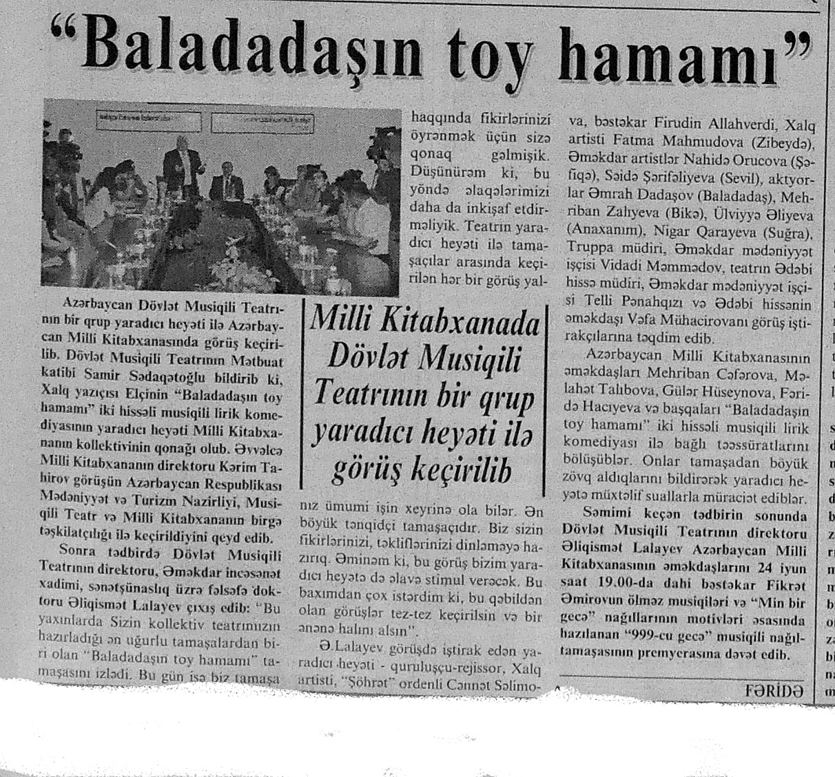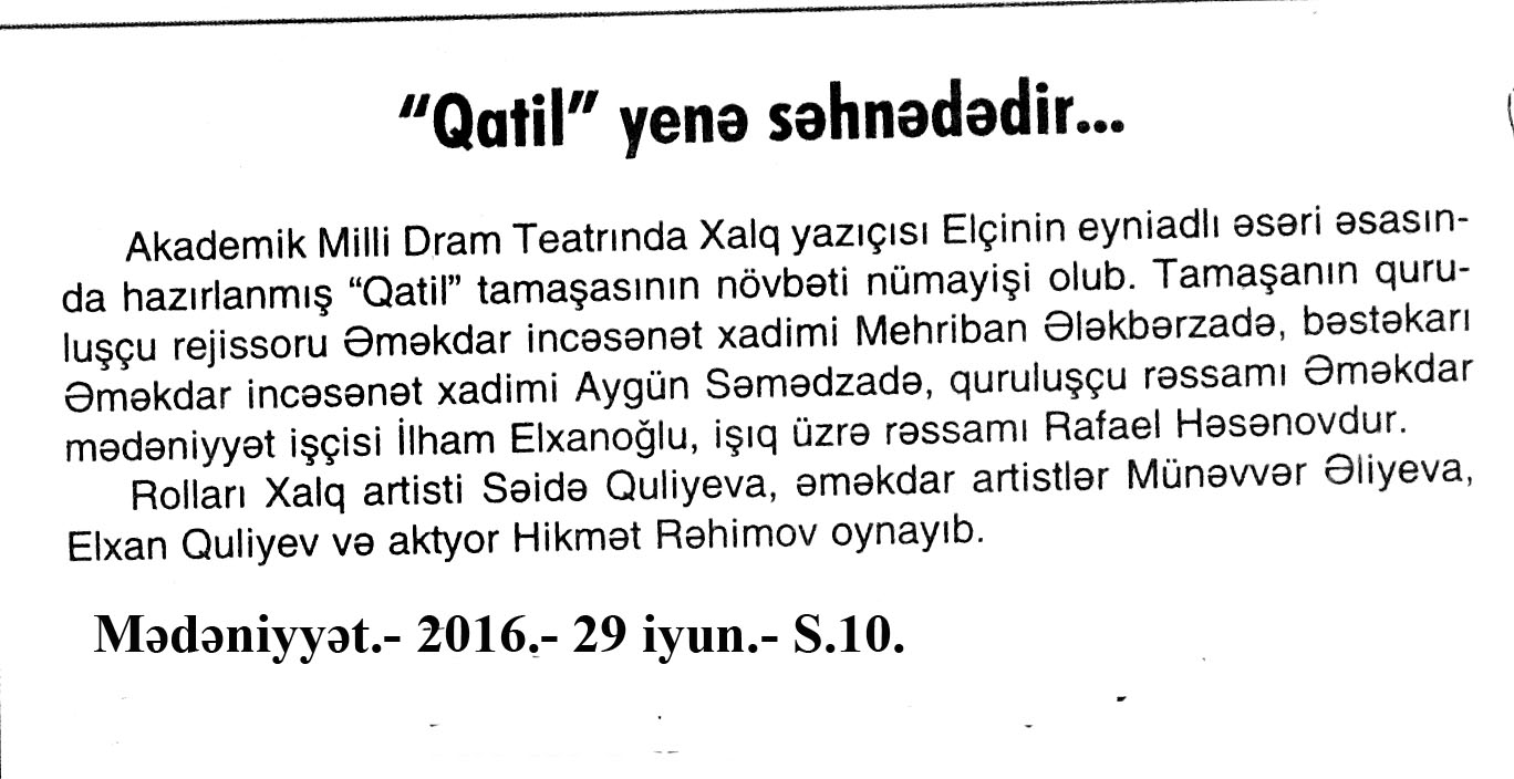 468. “Baladadaşın toy hamamı”nın yaradıcı heyəti ilə görüş: [Milli Kitabxanada Cənnət Səlimovanın hazırladığı eyniadlı tamaşanın yaradıcı heyəti ilə keçiriləcək görüş haqqında] //Mədəniyyət.- 2016.- 8 iyun.- S.7. 469. Cəbrayıloğlu, E. Uğur onun qismətidir: Sevdiyi işi sevə-sevə görən Əliqismət Lalayevin 60 illiyinə //Ədalət.- 2016.- 18 iyun.- S. 10. 470. Fəridə. “Baladadaşın toy hamamı”: [Milli Kitabxanada Cənnət Səlimovanın eyniadlı tamaşasının yaradıcı heyəti ilə keçirilən görüş haqqında] //Azad Azərbaycan.- 2016.- 10 iyun.- S.7. 471. Xəlilzadə, F. O gülmürdü, güldürürdü: Hacıbaba Bağırov həmişə tamaşaçıya təbəssüm bəxş edib, güldürə-güldürə düşündürüb //Kaspi.-2016.- 11-13 iyun.- S.7. 472. Lalə. Milli Kitabxanada “Baladadaşın toy hamamı”nın yaradıcı heyəti ilə görüş: “Aktyorların öz oyunları haqqında tamaşaçı rəylərini öyrənməsi çox əhəmiyyətlidir”: [Cənnət Səlimovanın eyniadlı tamaşasının yaradıcı heyəti ilə keçirilən görüş haqqında] //Mədəniyyət.- 2016.- 10 iyun.- S.6. 473. Musiqili Teatr Xaçmazda balacalar üçün tamaşa göstərib //Mədəniyyət.- 2016.- 10 iyun.- S.5. 474. Musiqili Teatrın aktrisası festivaldan diplomla qayıdıb: [Kiyevdə keçirilmiş IV “O-FEST” Beynəlxalq Musiqi Festivalında ölkəmizi Əməkdar artist Nərgiz Kərimovanın təmsil et-məsi haqqında] //Mədəniyyət.- 2016.- 15 iyun. - S.11. 475. Pirimova, N. Mindən bir gecə əskik: [Gəncə Dövlət Dram Teatrının Baş rejissoru İradə Gözəlovanın Musiqi Teatrda hazırladığı “999-cu gecə” adlı tamaşa haqqında] //Kaspi.- 2016.-2 iyun.- S.12.