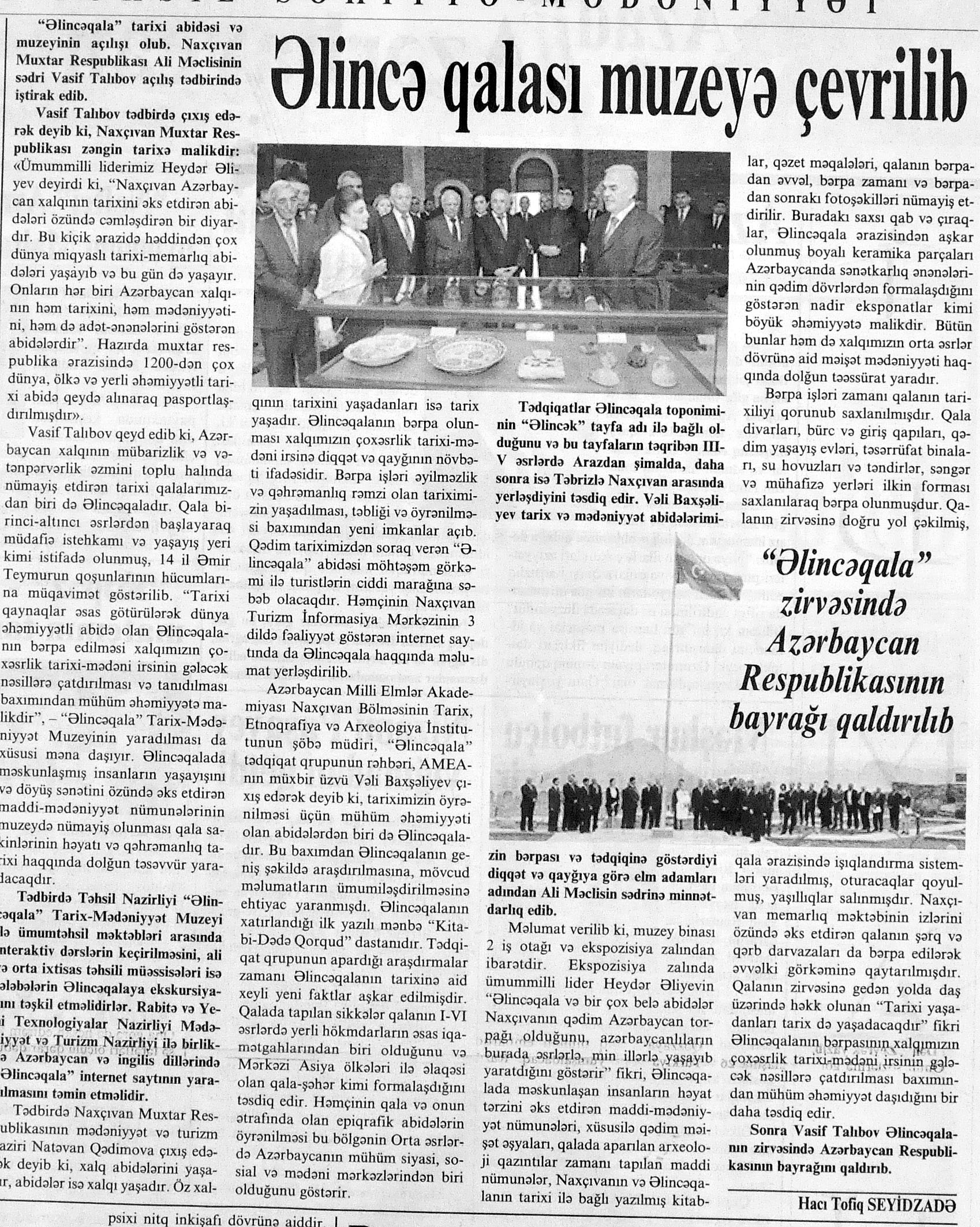 266. Cavid. Qafqaz Albaniyasının qədim dini məbədləri //Xalq cəbhəsi.- 2016.- 11 iyun.- S.13. 267. “Əlincəqala” tarixi abidəsi və muzeyi istifadəyə verilib: [Naxçıvan Muxtar Respublikasında] //İki sahil.- 2016.- 18 iyun.- S.8-9. 268. Əsədov, V. Qafqaz Albaniyasının dini məbədləri //Xalq cəbhəsi.- 2016.- 10 iyun.- S.13. 269. “Əshabi-Kəhf” ziyarətgahı Dini-Mədəni Abidə Kompleksində təmir-bərpa işləri aparılıb: [Naxçıvan şəhərinin 2018-ci il üçün İslam Mədəniyyətinin Paytaxtı elan edilməsi ilə əlaqədar] //Azərbaycan.- 2016.- 22 iyun.- S. 3. 270. Prezident İlham Əliyev Nardarandakı “Rəhimə xanım” məscid-ziyarətgah kompleksi ilə tanış olub //Azərbaycan.- 2016.- 22 iyun.- S.3. 271. Seyidzadə, T. Əlincə qalası muzeyə çevrilib //Azad Azərbaycan.- 2016.- 22 iyun.- S.7.