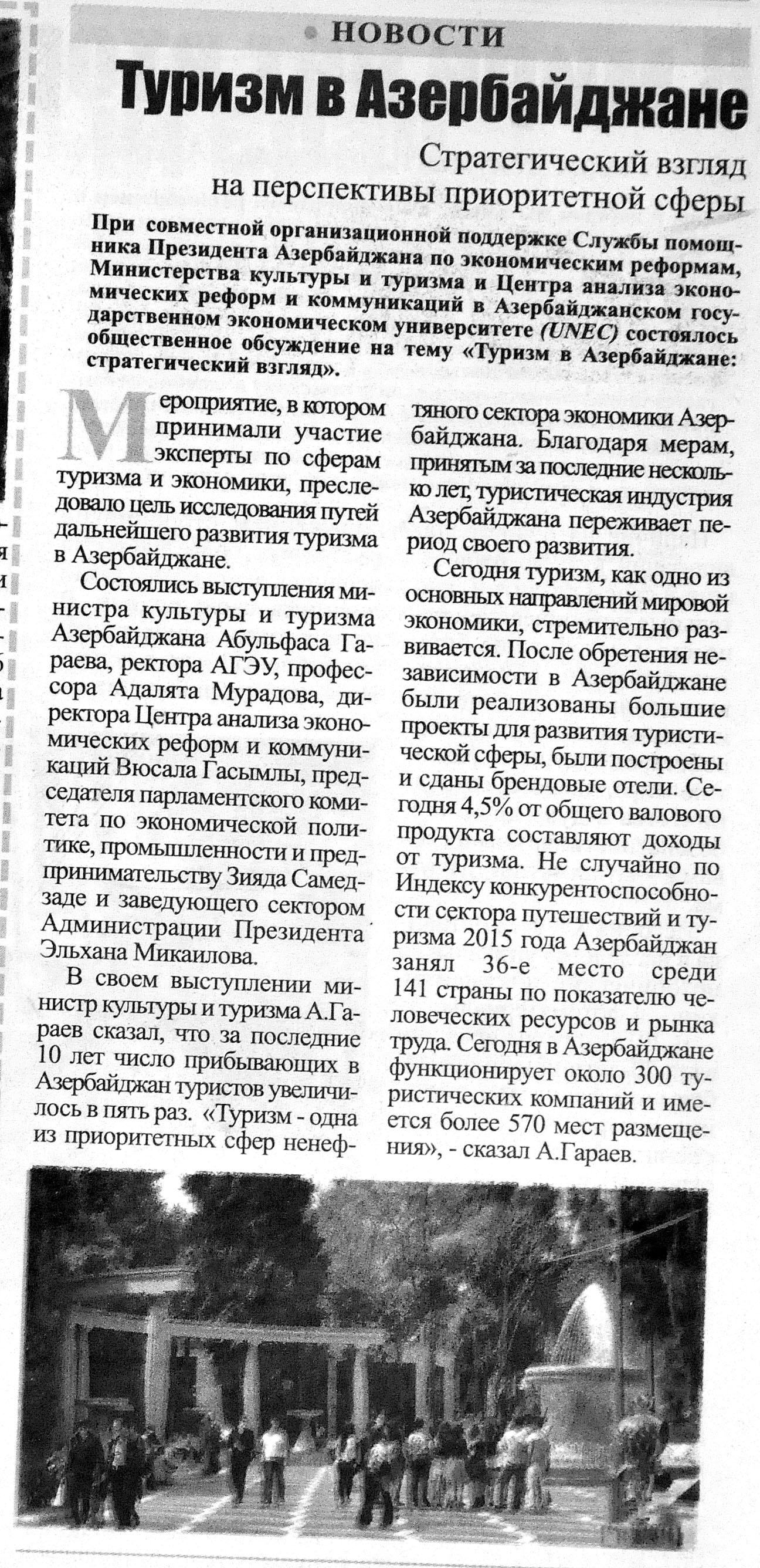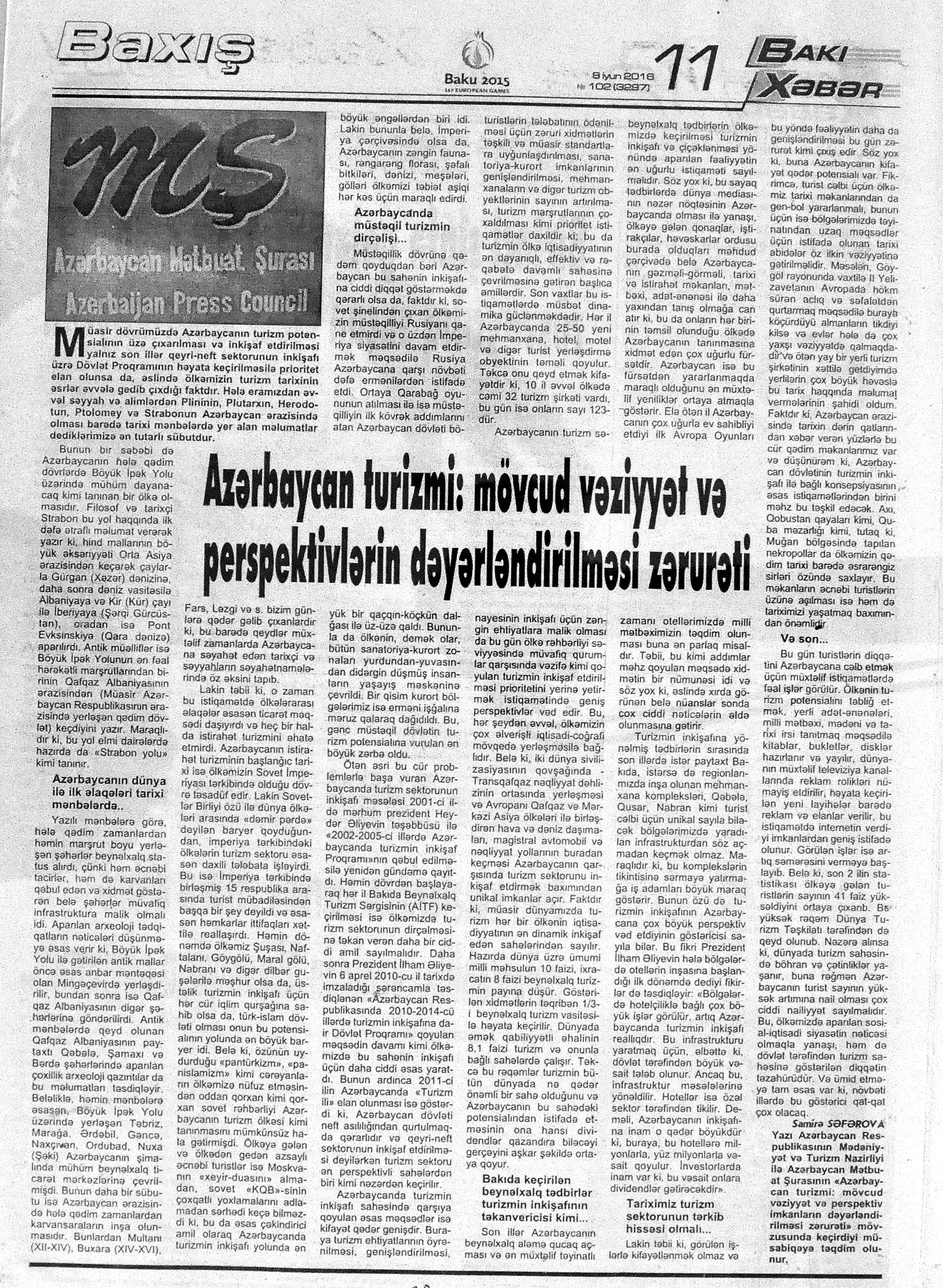 953. Асадова, И. Возрожденная легенда Шабрана: Репортаж о «жемчужине» лечебного туризма в Галаалты //Эхо.- 2016.- 11 июня.- С.10. 954. Манафов, Ш. В толще Соляной горы: «Дуздаг» - один из самых раскрученных брендов Нахчывана //Каспiй.- 2016.- 11 июня.- С.12-13. 955. Рзаев, Т. Открыт летний сезон в «Шахдаге» //Неделя.- 2016.- 11 июня.- С.12-13. 956. Страхование туристов может стать обязательным //Ежедневные новости.- 2016.- 3 июня.- С.4. 957. Туризм в Азербайджане: Стратегический взгляд на перспективы приоритетной сферы //Каспiй.- 2016.- 11 июня.- С. 13. 958. Шахдаг входит в первую тройку самых популярных курортов для трекинга в странах СНГ //Бакинский рабочий.- 2016.- 23 июня.- С.5.