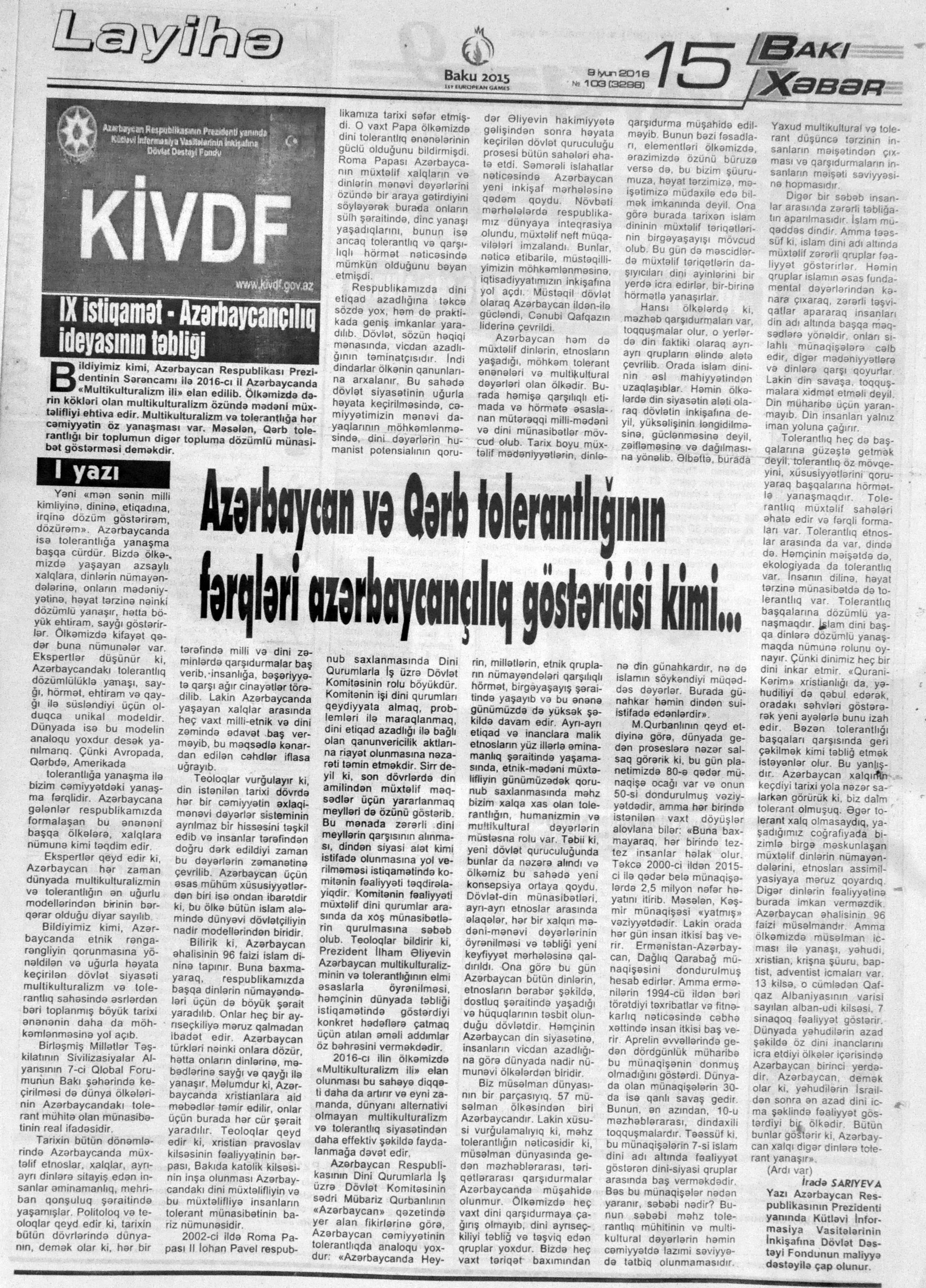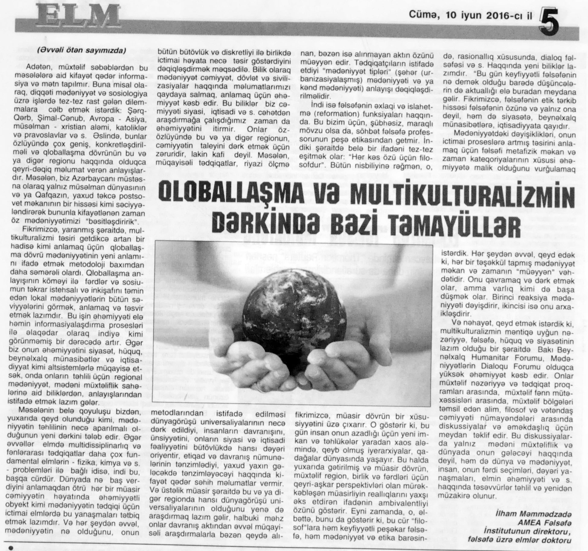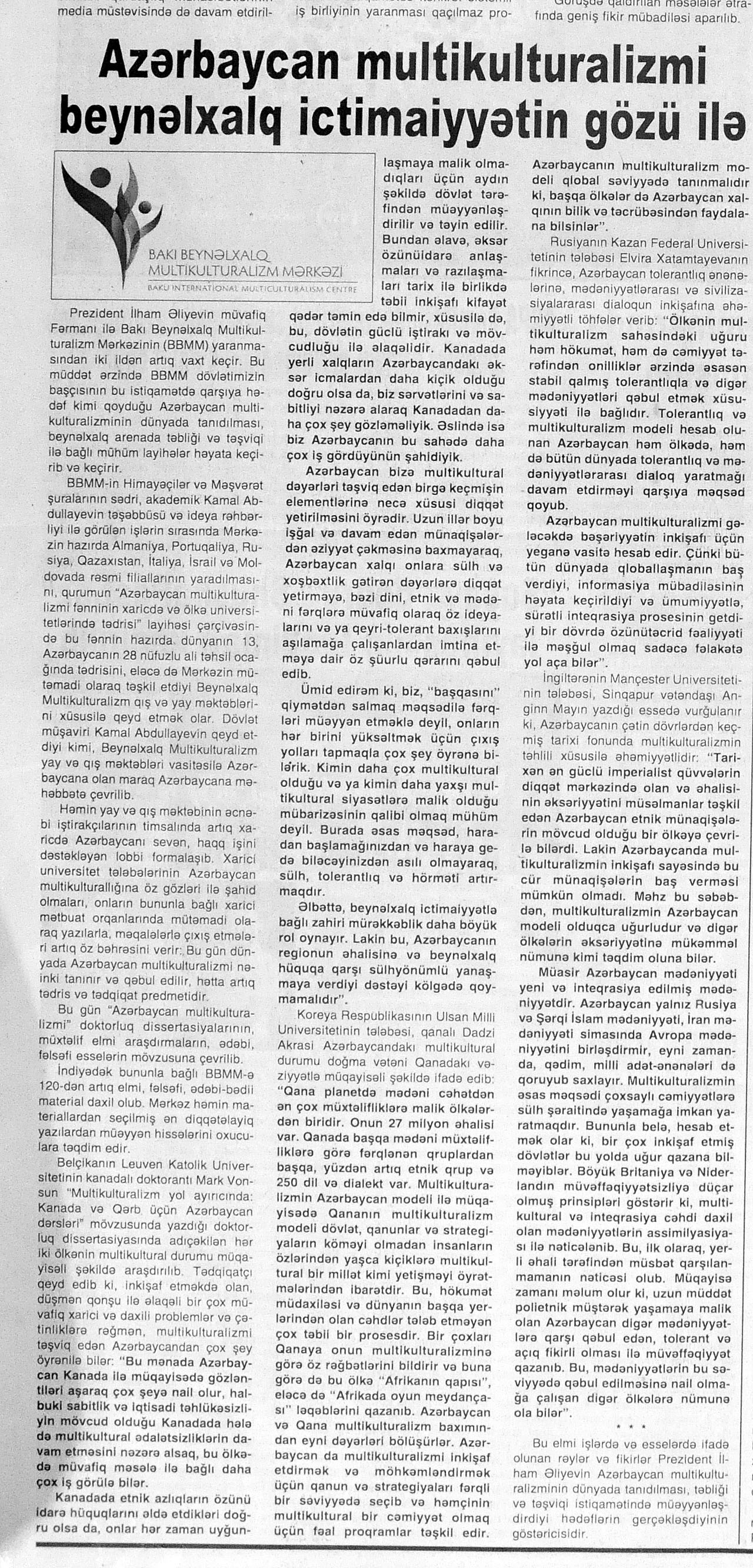 72. Abbasov, V. Yeni nəşrin işığı: “Multikulturalizm” jurnalının ilk sayı haqqında qeydlər //525-ci qəzet.- 2016.- 25 iyun.- S.14. 73. Abdullayev, K. “Azərbaycana olan maraq Azərbaycana sevgiyə çevrilməkdədir”: [Bakı Beynəlxalq Multikulturalizm Mərkəzinin Himayəçilər Şurasının sədri, akademik Kamal Abdullayevin müsahibəsi] //Aydın yol.- 2016.- 3 iyun.- S.4. 74. Arye Qut: Multikulturalizm, dini dözümlülük Azərbaycanın ən böyük milli sərvətidir: [İsrailin “Cəmiyyət üçün beynəlxalq layihələr” qeyri-hökumət təşkilatının rəhbəri, beynəlxalq əlaqələr üzrə tanınmış ekspertin AZƏRTAC-a müsahibəsi] //Azərbaycan.- 2016.- 12 iyun.- S.2. 75. “Azərbaycan multikulturalizminin ədəbi-bədii qaynaqları” təqdim edilib: [Qəbələ rayonunda Bakı Beynəlxalq Multikulturalizm Mərkəzinin nəşri olan eyniadlı kitab haqqında] //Mədəniyyət.- 2016.- 29 iyun.- S. 5. 76. “Azərbaycan multikulturalizminin ədəbi-bədii qaynaqları” müzakirə olunub //Mədəniyyət.- 2016.- 17 iyun.- S. 6. 77. Azərbaycan multikulturalizmi beynəlxalq ictimaiyyətin gözü ilə //İki sahil.- 2016.- 24 iyun.- S.6. 78. Azərbaycanda dinlərarası münasibətlər yüksək səviyyədədir //Azərbaycan.- 2016.- 2 iyun.- S. 5.; Yeni Azərbaycan.- 2016.- 2 iyun.- S.5. 79. Azərbaycanda həyata keçirilən multikulturalizm siyasəti ölkənin inkişafında mühüm rol oynayır //Azərbaycan.- 2016.- 12 iyun.- S.2. 80. Azəri, L. “Multikultural dəyərləri yaşadaq”: [Xaçmazda möhtəşəm multikulturalizm festivalının keçirilməsi haqqında] //Mədəniyyət.- 2016.- 29 iyun.- S.8. 81. Baxşəliyev, R. Azərbaycanın tolerantlıq və dinlərarası birgəyaşayış modeli Böyük Britaniyada maraqla qarşılanıb: [Bakı Beynəlxalq Multikulturalizm Mərkəzinin Himayəçilər Şurasının sədri, akademik Kamal Abdullayevin bu səfərlə və keçirilən tədbirlərlə bağlı açıqlaması ] //Azərbaycan.- 2016.- 2 iyun.- S.5. 82. Bilik Fondunda “Multikulturalizm” jurnalının təqdimatı oldu: [Azərbaycan Respublikasının Prezidenti yanında] //Azərbaycan.- 2016.- 30 iyun.- S.5. 83. Cavid. “Azərbaycan etnik, mədəni baхımdan zəngin ölkədir”: Antropoloqlar Azərbaycan xalqının tolerantlığının tarixi köklərini araşdırıb dünyaya bir nümunəvi təcrübə kimi təqdim edə bilərlər //Xalq cəbhəsi.- 2016.- 17 iyun.- S.13. 84. Cavid. Multikulturalizm: Nəzəri yanaşmalar və gündəlik həyatın reallıqları: I yazı //Xalq cəbhəsi.- 2016.- 14 iyun.- S.13. 85. Cavid. Multikulturalizm: Nəzəri yanaşmalar və gündəlik həyatın reallıqları: II yazı //Xalq cəbhəsi.- 2016.- 15 iyun.- S.13. 86. Danilova, L. Azərbaycan biz rusların da doğma yurdudur: Multikulturalizm İli – 2016 //Azərbaycan.- 2016.- 9 iyun.- S. 9. 87. “Dostluq dünyamız”: [Heydər Əliyev Sarayında Beynəlxalq Uşaqları Müdafiə Günü və “Multikulturalizm İli” münasibətilə keçirilən eyniadlı ümumşəhər mahnı və rəqs festivalı haqqında] //Mədəniyyət.-2016.- 3 iyun.- S.5. 88. Ələddinqızı, N. Azərbaycan multikulturalizm modeli dünyaya örnəkdir: YAP Quba Rayon təşkilatı Qırmızı Qəsəbə ərazi ilk partiya təşkilatında “Multikulturalizm ili” çərçivəsində tədbir keçirilib //Səs.- 2016.- 25 iyun.- S. 12. 89. Əliyev, A. Xaçmazda “Multikultural dəyərləri qoruyaq” festivalı keçirildi //Azərbaycan.- 2016.- 26 iyun.- S.12. 90. Əmircanov, P. Xaçmazda möhtəşəm multikulturalizm festivalı //Xalq qəzeti.- 2016.- 26 iyun.- S.6. 91. Fərəcov, S. Uşaq incəsənət məktəbinin yaradıcılıq hesabatı: [Fikrət Əmirov adına 6 saylı onbirillik uşaq incəsənət məktəbində “Multikulturalizm ili”nə həsr olunmuş tədbirin keçirilməsi haqqında] //Mədəniyyət.- 2016.- 17 iyun.- S.7. 92. Fərəcov, S. Uşaq incəsənət məktəbinin yaradıcılıq hesabatı: [Fikrət Əmirov adına 6 saylı onbirillik uşaq incəsənət məktəbində keçirilən tədbir haqqında] //Mədəniyyət.- 2016.- 15 iyun.- S. 4. 93. Fransalı senatorlara Azərbaycandakı multikultural və tolerant mühit barədə məlumat verilib //Azərbaycan.- 2016.- 22 iyun.- S. 4. 94. Gəncədə “Multikulturalizm çərçivəsində milli və dini icmaların həmrəylik nümayişi” adlı tədbir keçirilib //Yeni Azərbaycan.- 2016.-1 iyun.- S.6. 95. Göygöldə “Multikultural və tolerant dəyərlərimiz: tarixilik, varislik, müasirlik” mövzusunda konfrans keçirilib //Azərbaycan.- 2016.- 30 iyun.- S.5. 96. Haqverdiyev, H. Azərbaycanda multikulturalizmin tarixi-coğrafi aspektləri //Respublika.- 2016.- 19 iyun.- S.7. 97. Hüseynli, Q. Sivilizasiya və multikulturalizm //Respublika.- 2016.- 18 iyun.- S.6. 98. Xudiyev, N. Heydər Əliyev və multikulturalizmin Azərbaycan modeli //Səs.- 2016.- 17 iyun.- S.8-9. 99. Kamal Abdullayev: Azərbaycana olan maraq Azərbaycana sevgiyə çevrilməkdədir: [Bakı Beynəlxalq Multikulturalizm Mərkəzinin Himayəçilər Şurasının sədrinin müsahibəsi] //Xalq qəzeti.- 2016.- 2 iyun.- S.4. 100. Quliyeva, A. Azərbaycanın multikulturalist ənənəli dövlət siyasəti beynəlxalq münasibətlər sistemində: (Azərbaycanda və xaricdə keçirilən simpozium, forum, konfrans materialları əsasında) //Respublika.- 2016.- 22 iyun.- S.6. 101. Quliyeva, A. Azərbaycanın multikulturalist ənənəli dövlət siyasəti beynəlxalq münasibətlər sistemində: (Azərbaycanda və xaricdə keçirilən simpozium, forum, konfrans materialları əsasında) //Respublika.- 2016.- 23 iyun.- S.6. 102. Quliyeva, A. Azərbaycanın multikulturalist ənənəli dövlət siyasəti beynəlxalq münasibətlər sistemində: (Azərbaycanda və xaricdə keçirilən simpozium, forum, konfrans materialları əsasında) //Respublika.- 2016.- 24 iyun.- S.6. 103. Qurbanlı, M. “Xalqımızın öz milli-mənəvi dəyərlərinə bağlılığıdır”: Azə