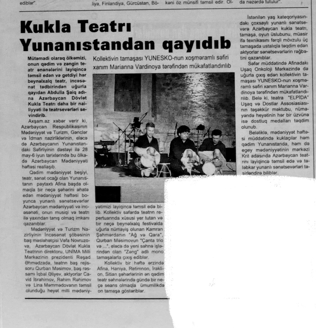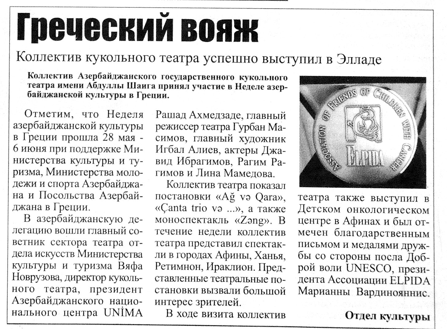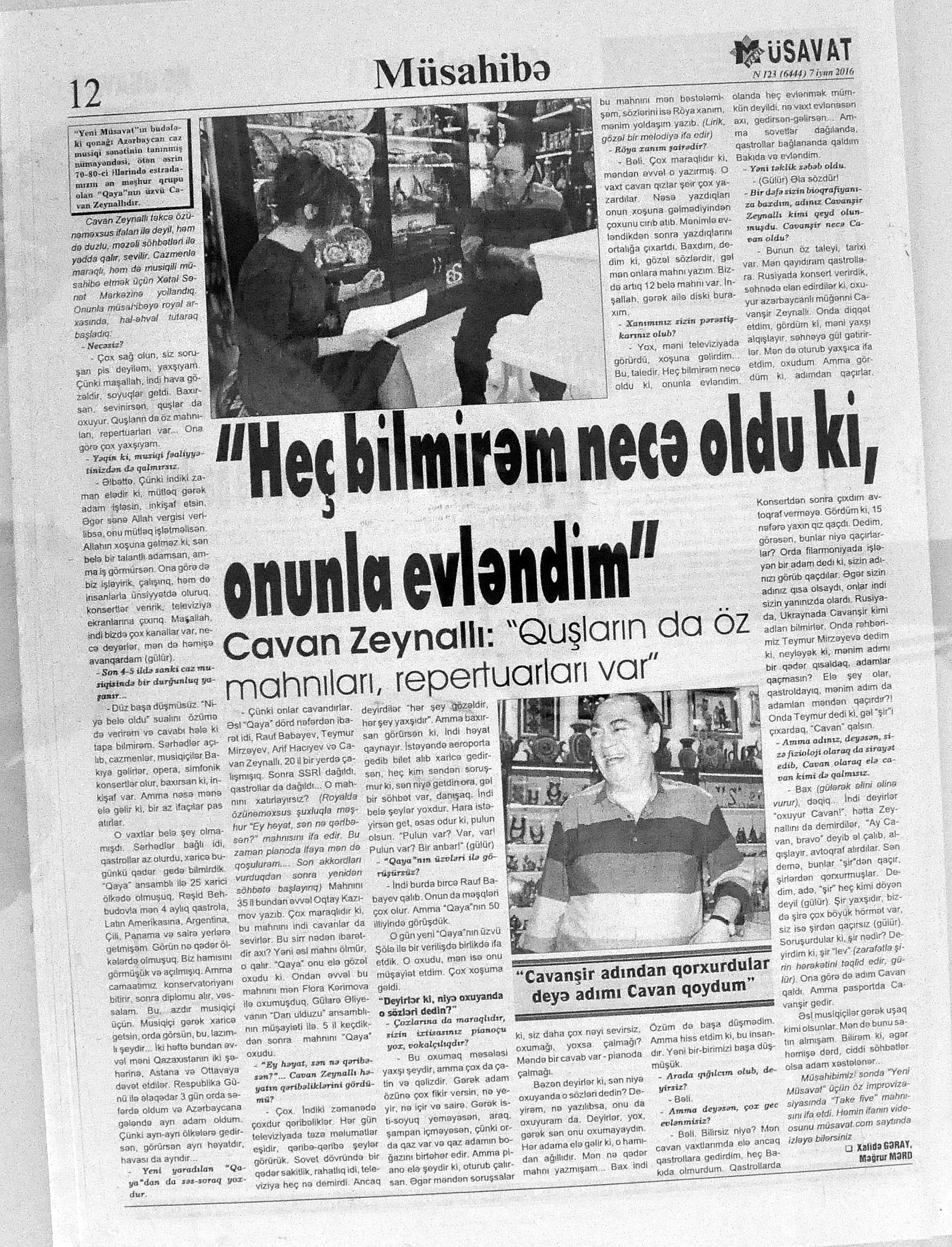 945. Алиева, Э. В ком билось пламенное сердце: Мохсун Санани в воспоминаниях современников //Каспiй.- 2016.- 25 июня.- С.19. 946. Алиева, Э. Новая встреча с Пуччини: Классика на сцене Азербайджанского Государственного Академического Театра Оперы и Балета //Каспiй.- 2016.- 4 июня.- С.18. 947. Амирбеков, О. Олег Амирбеков: «Между понятиями рейтинг и качество нельзя ставить знак равенства: Интервью с актером Азербайджанского Государственного Русского Драматического Театра имени С.Вургуна /провела Х.Велиева //Эхо.- 2016.- 24 июня.- С.8. 948. Асадова, И. «Казанова: уроки любви» на закрытие сезона: 95-й театральный сезон в Русском Драмтеатре закроют спектаклем Ильгара Сафата //Эхо.- 2016.- 30 июня.- С.8. 949. Греческий вояж: Коллектив Кукольного Театра успешно выступил в Элладе //Каспiй.- 2016.- 10 июня.- С.12.