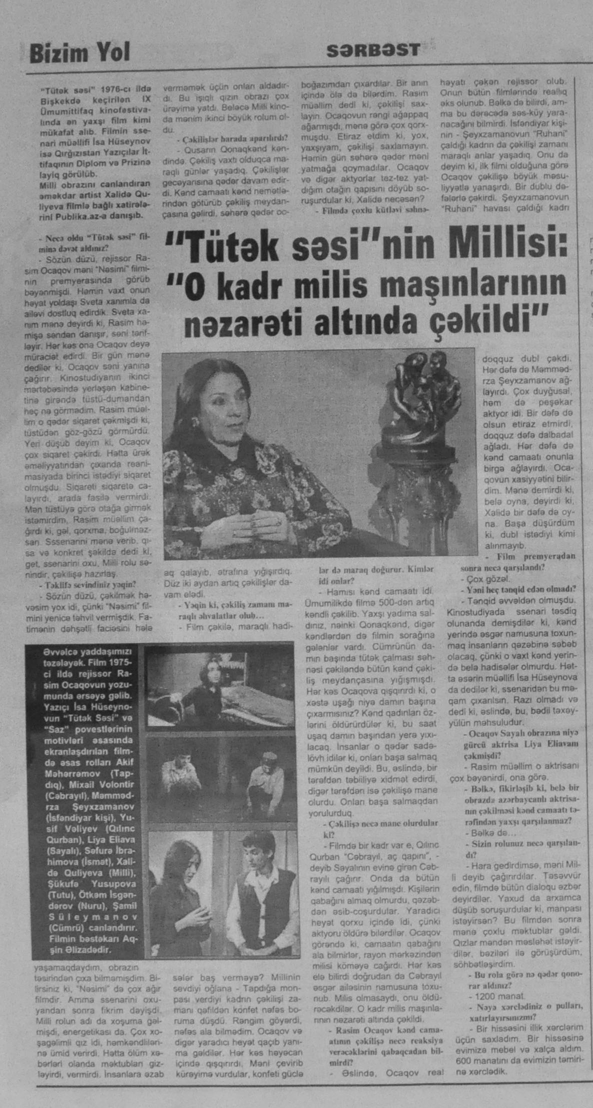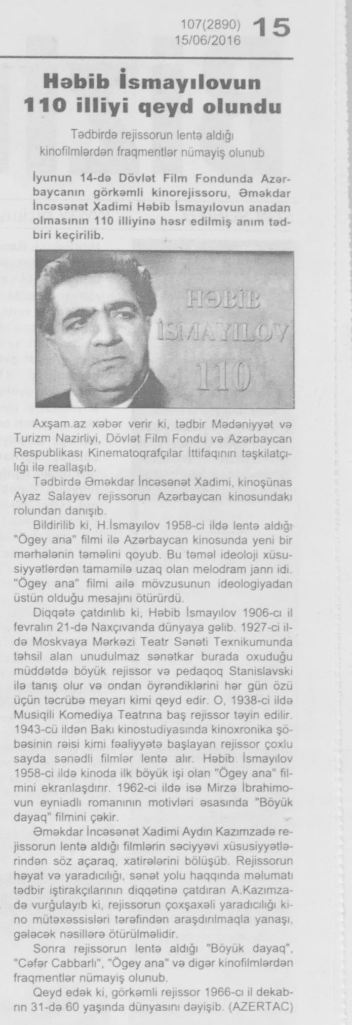 406. Abbaslı, T. Çiçək tək incə...: İpək kimi zərif, şimşəktək şaqraq Səs, Hökümlü Səda, lətif hal-əda mücəssəməsi – Hökumə Qurbanova!: [Azərbaycanın və SSRİ-nin Xalq artisti, Dövlət mükafatı laureatı, görkəmli teatr və kino aktrisası haqqında] //Mədəniyyət.- 2016.- 10 iyun.- S.13. 407. Azəri, L. Üç gün və bir ömür”: Yeni bədii film çəkilir: [Babək Şirinsifətin hazırladığı eyniadlı film haqqında] //Mədəniyyət.- 2016.- 1 iyun.- S.6. 408. Fariz. Xalqa xidmətdə keçən ömür yolu: Görkəmli dövlət xadimi, akademik Vəli Axundovun 100 illik yubileyi qeyd olundu: [Müslüm Maqomayev adına Azərbaycan Dövlət Filarmoniyasında Yavər Rzayevin lentə aldığı “Vəli Axundov. XXI əsrdən baxış” adlı sənədli filminin nümayişi haqqında] //Mədəniyyət.- 2016.- 3 iyun.- S.2. //525-ci qəzet.- 2016.- 4 iyun.- S.12. 409. Fərəcov, S. Kino sənətimizdə Hüseyn Seyidzadə yolu: [kinorejissor haqqında] //Mədəniyyət.- 2016.- 1 iyun.- S.12. 410. Fətəliyev, R. Daha nüfuzlu ola bilərdim: [kino-ssenarist və rejissor Ramiz Fətəliyevin Azadlıq radiosuna müsahibəsi] //Ekspress.- 2016.- 8 iyun.- S.13. 411. Həbib İsmayılovun 110 illiyi qeyd olundu: [Dövlət Film Fondunda] //Bizim yol.- 2016.- 15 iyun.- S.2. 412. Hüseynov, F. “Yarımçıq xatirələr” həbsxanada nümayiş olundu: [Elxan Cəfərovun quruluş verdiyi eyniadlı film haqqında] //Mədəniyyət.- 2016.- 8 iyun.- S.6. 413. Hüseynov, F. Kinoya həsr olunan ömrün 70-ci zirvəsi: Tanınmış ssenarist və kinorejissor Ramiz Fətəliyevin yubileyi qeyd olundu: [Nizami Kino Mərkəzində] //Mədəniyyət.- 2016.- 8 iyun.- S.2. 414. “Köşk” filminin çəklişləri başlanıb: [rejissor Mirsadıq Ağazadənin hazırladığı eyniadlı film haqqında] //Mədəniyyət.- 2016.- 8 iyun.- S.6. 415. Qəbələdə yeni filmlər nümayiş olunur: [Qəbələ Mədəniyyət Mərkəzində C.Cabbarlı adına “Azərbaycanfilm” kinostudiyasının istehsal etdiyi filmlər] //Mədəniyyət.- 2016.- 8 iyun.- S.4. 416. Quliyeva X. “Tütək səsi” nin Millisi: “O kadr milis maşınlarının nəzərəti altında çəkıldı”: [aktrisa Xalidə Quliyevanin müsahibəsi] //Bizim yol.- 2016.- 8 iyun.- S.15. 417. Lalə. Görkəmli rejissorun xatirəsi yad olundu: [Dövlət Film Fondunda kinorejissor, Əməkdar incəsənət xadimi Həbib İsmayılovun anadan olmasının 110 illiyinə həsr edilmiş xatirə gecəsinin keçirilməsi haqqında] //Mədəniyyət.- 2016.- 15 iyun.- S. 2. 418. Lalə. Nadir almazın axtarışı: “Xeyirlə Şərin rəqsi” bədii filminin təqdimatı keçirildi: [Nizami Kino Mərkəzində Yavər Rzayevin eyniadlı filminin təqdimatı haqqında] //Mədəniyyət.- 2016.- 1 iyun.- S.6. 419. Mirməmməd, G. “Lətif”dən “Dərs”ədək: Ekran önündə yaranan düşüncələr: [uşaq obrazları yaradılan “Lətif”; “Ögey ana”; “Bizim Cəbiş müəllim” və s. filmlər haqqında] //Mədəniyyət.- 2016.- 1 iyun.- S.13. 420. Rəis, X. Onlar uşaqları filmə çəkmirlər, film çəkməyi öyrədirlər: Azərbaycan ilk Uşaq Kino Məktəbindən reportaj //Kaspi.- 2016.- 17 iyun.- S.11. 421. Verdiyev, M. “Mən həmişə inqilabçı olmuşam”: “Babək” filminin Buğdayı 20 ildən sonra Azərbaycana qayıdıb: [Məhəmməd Verdiyevin müsahibəsi] //Bizim yol.- 2016.- 4 iyun.- S.15.