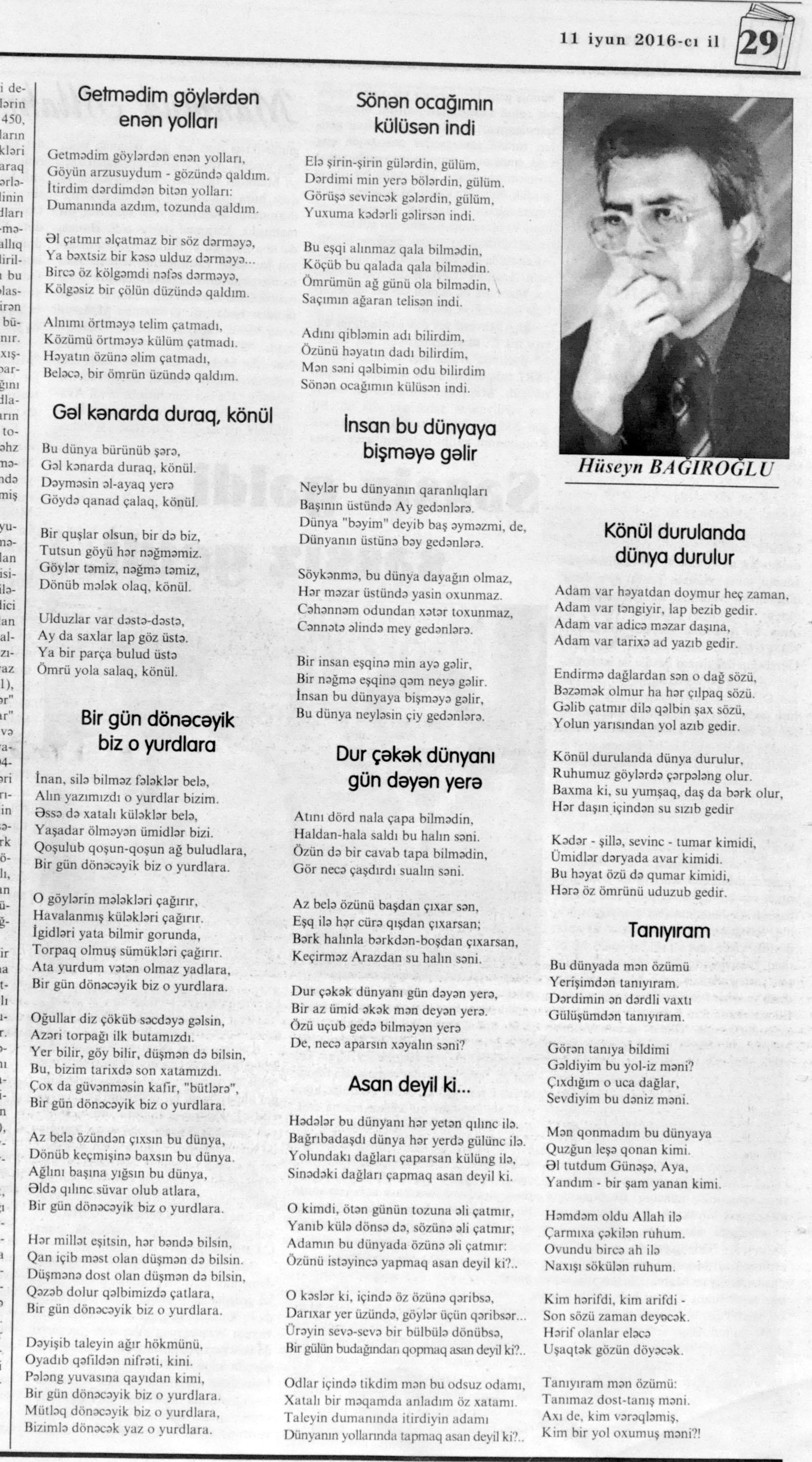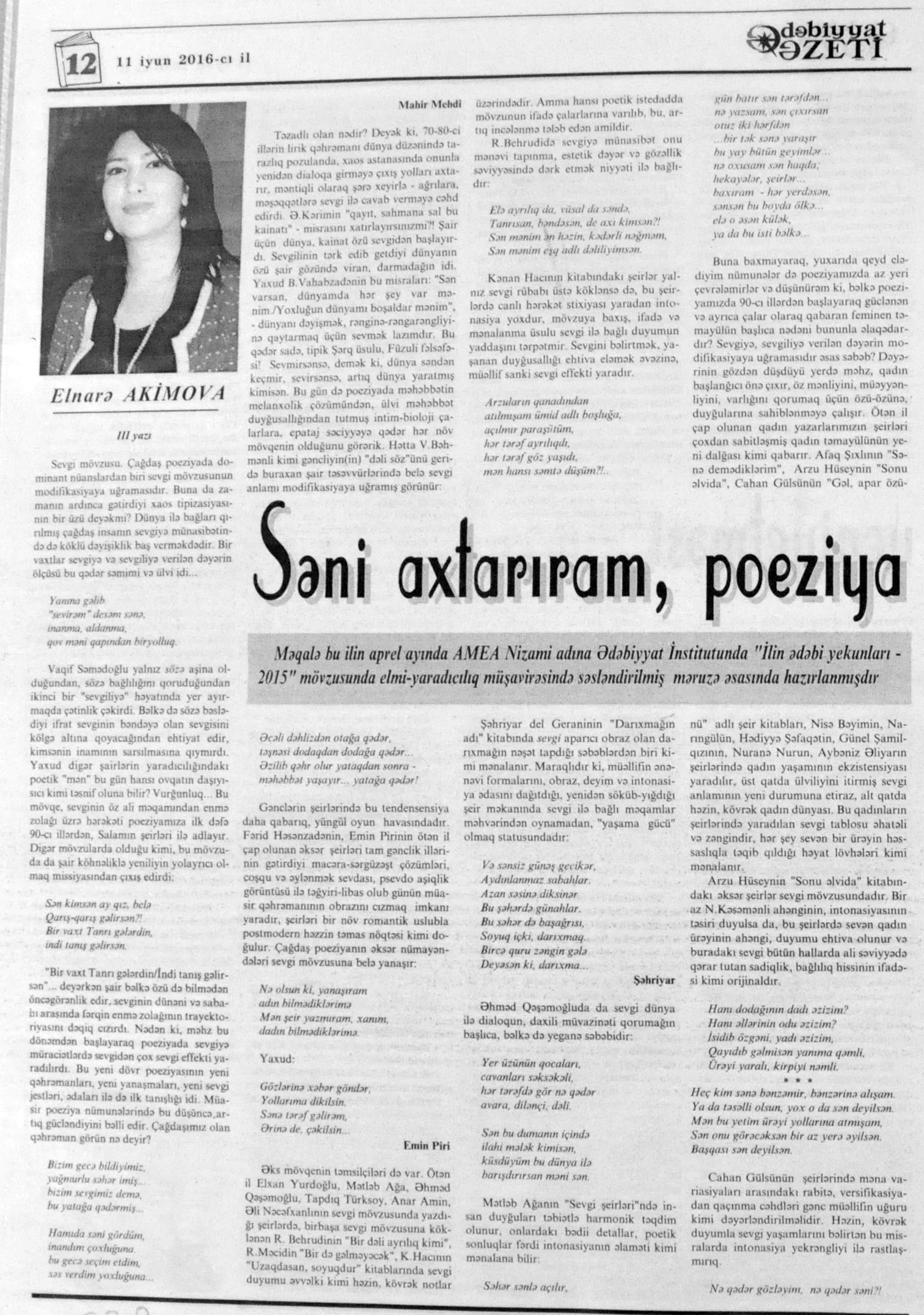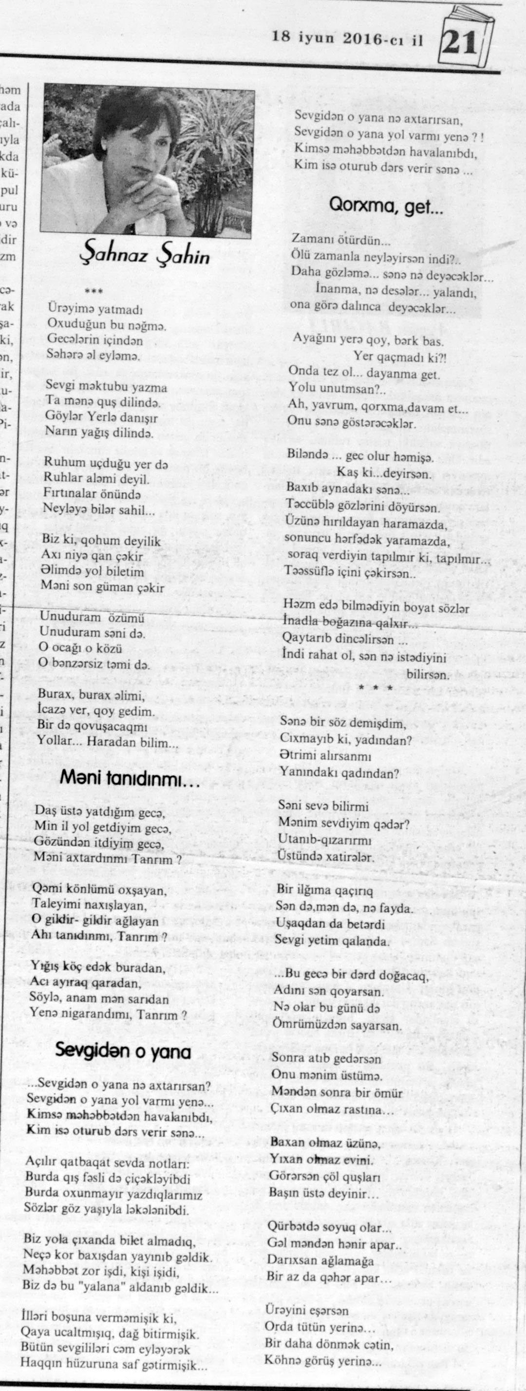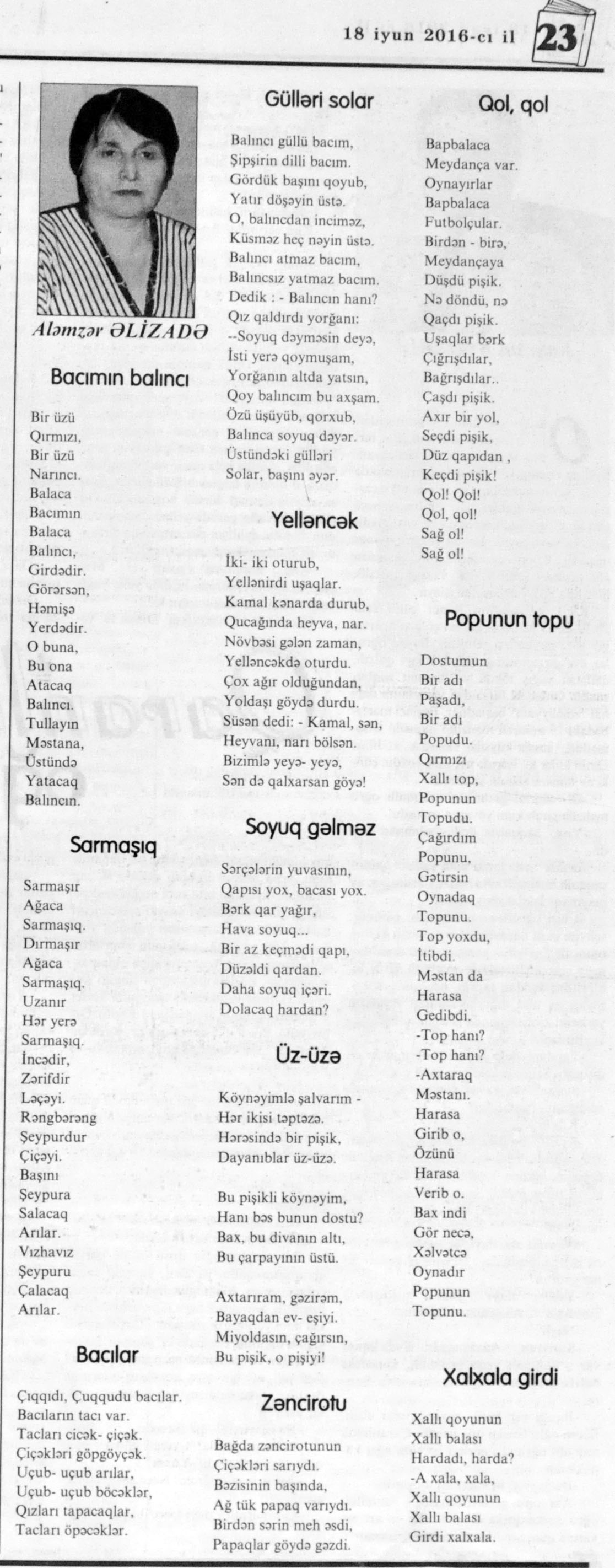545. Abiyeva, K. Məzunlarıma //Azərbaycan müəllimi.- 2016.- 4 iyun.- S.10. 546. Ağa, A. Əllərimiz; Qoca; Tellər, küləklər və s. //Ədəbiyyat qəzeti.- 2016.- 25 iyun.- S.7. 547. Ağa, A. Qoca; Düşür; Şəkillər; Top-xatirə və s. //Kaspi.- 2016.- 11-13 iyun.- S.22. 548. Alarlı, B. İllər //Azərbaycan müəllimi.- 2016.- 4 iyun.- S.10. 549. Alarlı, B. Yuxu; Büt; Xırda və s. //Ədəbiyyat qəzeti.- 2016.- 4 iyun.- S.22. 550. Aygün Yavər qızının şeir dünyası...: Əgər qadın olmasaydım...; Yorğun baxtım; Bayramdan-bayrama və s. //Ədalət.- 2016.- 3 iyun.- S.4. 551. Bağırov, H. Getmədim göylərdən enən yolları; Gəl kənarda duraq, könül; Bir gün dönəcəyik biz o yurdlara və s. //Ədəbiyyat qəzeti.- 2016.- 11 iyun.- S.29. 552. Bayramlı, M. Xəritələnmiş əl //Ədəbiyyat qəzeti.- 2016.- 4 iyun.- S.29. 553. Berk, İ. Ayrılığın ürəyi; Üç dəfə seni sevirəm deyə oyandım; Eşq və s.: [türk ədəbiyyatı] /təqdim etdi Ayişə Nəbi //Ədəbiyyat qəzeti.- 2016.- 11 iyun.- S.7. 554. Cavadov, S. Meyvələr şahıdır, başında tac var //Azərbay-can.- 2016.- 7 iyun.- S.8. 555. Cəfəri, Ç. Burada bir kücə var sənsizlikdən darıxır: Yenilikdir; Heç kimsəni sevmir; Gəl və s. /İlham Qəhrəmanın təqdimatında //Kaspi.- 2016.- 4-6 iyun.- S.14. 556. Əbülfəz Ü. Dünyada; Onsuz da...; Qəribə qatardır, ömür qatarım və s. //Ədəbiyyat qəzeti.- 2016.- 4 iyun.- S.21. 557. Əhmədli, N. Dünyanın dəli çayları, dönüb axırlar üstümə: Gəl, bir az dua edək; Silkələmə nar ağacın //525-ci qəzet.- 2016.-25 iyun.- S.22. 558. Əlizadə, A. Bacımın balıncı; Sarmaşıq; Bacılar və s. //Ədəbiyyat qəzeti.- 2016.- 18 iyun.- S.23. 559. Əzimli, Ə. Bu yol; Qaytar; Bomboz günlərdə; Yadımdan çıxdı adım və s. //Ədalət.- 2016.- 9 iyun.- S.4. 560. Əzimli, Ə. Gecə düşüncələr; Quru səs; Yarpaq ölümü və s. //Kaspi.- 2016.- 25-28 iyun.- S.15. 561. Fərruxzad, F. Puç; Gecənin soyuq xiyabanlarında; Yuxu; Yorğun: [fars dilindən tərcümə] /tərc. etdi Məhəmməd Nuri //Ədəbiyyat qəzeti.- 2016.- 4 iyun.- S.31. 562. Hacıyev, E. Yuxusuzluq himni //Ədəbiyyat qəzeti.- 2016.- 4 iyun.- S.29. 563. Hüseyn, F. Xilaskar qan kilsəsində; Fikir yorğununun dedikləri; Çara məktub və s.: “Səfər şeirləri” silsiləsi – Sankt-Peterburq //Kaspi.- 2016.- 25-28 iyun.- S.17. 564. Hüseynbəyli, F. Zamanı tutmaq olmur; Dünya bir tərəfdə, sən bir tərəfdə; Özünü qoru //Ədəbiyyat qəzeti.- 2016.- 11 iyun.- S.8-9. 565. Hüseynzadə, M. Özünü becərdin; Atamız şeir yazsın...; Yetmiş yetir və s. //Ədəbiyyat qəzeti.- 2016.- 25 iyun.- S.27. 566. Xəzri, N. Qanadsız ev – tufandakı gəmidir, o nə batır, nə limana yetişir: İstiqlal marşı; Şuşa; Şuşanın yolları və s.//Aydın yol.- 2016.- 10 iyun.- S.7. 567. İsgəndərova, Z. Keçmişə səfər; Kiməm mən; Sevmə məni; Sonuncu şeir //Ədəbiyyat qəzeti.- 2016.- 4 iyun.- S.29. 568. İsmayıl, İ. Sustu yüreğim; Gelme; Bulamazsın və s. //Türküstan.- 2016.- 14-20 iyun.- S.15. 569. İsmayılov, A. Dünyaya bəzəkdir körpə gülüşü: Belə bayram olaydı (1 İyun Uşaqları Beynəlxalq Müdafiə Günüdür); Qoruyun təbəssümü //Azad Azərbaycan.- 2016.- 1 iyun.- S.7. 570. İsmayılzadə, M. Şəhidlərə himn oxuyur körpə uşaq //Ədalət.- 2016.- 15 iyun.- S.4. 571. İsrafilova, F. Ya Qarabağ, ya ölüm! Özgə çarə yox artıq!... //Azərbaycan müəllimi.- 2016.- 4 iyun.- S.10. 572. Qafarlı, Z. Düşmədi; Zeynəbim; Bu dəniz və s. //Kaspi.- 2016.- 18-20 iyun.- S.22. 573. Qaraqızı, Z. Əziz anam, ağlama!; Qələbəylə dönəcəyəm yanına //Azərbaycan müəllimi.- 2016.- 4 iyun.- S.10. 574. Qurbanov, S. Cavidin ev-muzeyində; Yadına düşər ki, unudulmuşam; Məni aldatmağın çətin ki, deyil və s. //Ədəbiyyat qəzeti.- 2016.- 25 iyun.- S.20. 575. Məmmədova, N. Xocalım //Azərbaycan müəllimi.- 2016.- 4 iyun.- S.10. 576. Nəğməkar, Y. Ağrın uzanmasın!...: (İstedadlı qələm qardaşım Sayman Aruza) //525-ci qəzet.- 2016.- 21 iyun.- S.7. 577. Nəğməkar, Y. Mənim şeirlərimin adı Yusifdir; Gözləyir...; Göy sözü və s. //Ədəbiyyat qəzeti.- 2016.- 4 iyun.- S.18. 578. Nurəli, T. Küləkli pəncərə; Yol; Ayna üçün; Qəmli bir nəğmə və s. //Kaspi.- 2016.- 11-13 iyun.- S.16-17. 579. Nuri, Ə. Yağışı qarşılamaq; Bir ürək və... üç nöqtələr...; Bir yağış dindirdi məni və s. //Ədəbiyyat qəzeti.- 2016.- 18 iyun.- S.4-5. 580. Osmanlı, D. “Öz canımı oxuyuram” silsiləsindən: Adam özünü tanısın...; Öz canımı oxuyuram; İsmarış və s. //Ədəbiyyat qəzeti.- 2016.- 4 iyun.- S.11. 581. Pirəliyev, Ə. Təbrizim mənim //Azad Azərbaycan.- 2016.- 18 iyun.- S.7. 582. Rövşən, R. Yavaş-yavaş sevdim səni: Qara paltarlı qadın; Yavaş-yavaş sevdim səni; Gəlin açın yumruğumu və s. //Ədalət.- 2016.- 4 iyun.- S.14. 583. Rübail. Kül üstündə bitən çiçək //525-ci qəzet.- 2016.- 18 iyun.- S.22. 584. Sabirqızı, F. Ağ saatlarla da vaxt qara gedir...; Bir gün...; Ovcuma yükdü xətlər... və s. //Ədəbiyyat qəzeti.- 2016.- 11 iyun.- S.15. 585. Sadiq, B. Payız məktubları: Sonet çələngi: Bir misra yaxın gəl, bənövşəgözlüm...; Güzgülər ölümün cavan üzüdü...; Üzündə dil açmış o lal qırışlar... və s. //Ədəbiyyat qəzeti.- 2016.- 11 iyun.- S.3. 586. Səma, G. Sənsizlik Ürəyimə düşdün; Sən ki yaxşı bilirdin... //Kaspi.- 2016.- 11-13 iyun.- S.22. 587. Sözlü, H. Olsun; Yollar; Ulu dağlar və s.: Hüseyn Sözlü – 70 //Kaspi.- 2016.- 18-20 iyun.- S.21. 588. Şahin, Ş. Ürəyimə yatmadı; Məni tanıdınmı...; Sevgidən o yana və s. //Ədəbiyyat qəzeti.- 2016.- 18 iyun.- S.21. 589. Şimşək, Ə. Düşünək //Azad Azərbaycan.- 2016.- 18 iyun.- S.7. 590. Təvəkküloğlu, A. Dərd çəkmə; Səndən xəbər yox; Yaşamaq ölçüləri; Adı //K