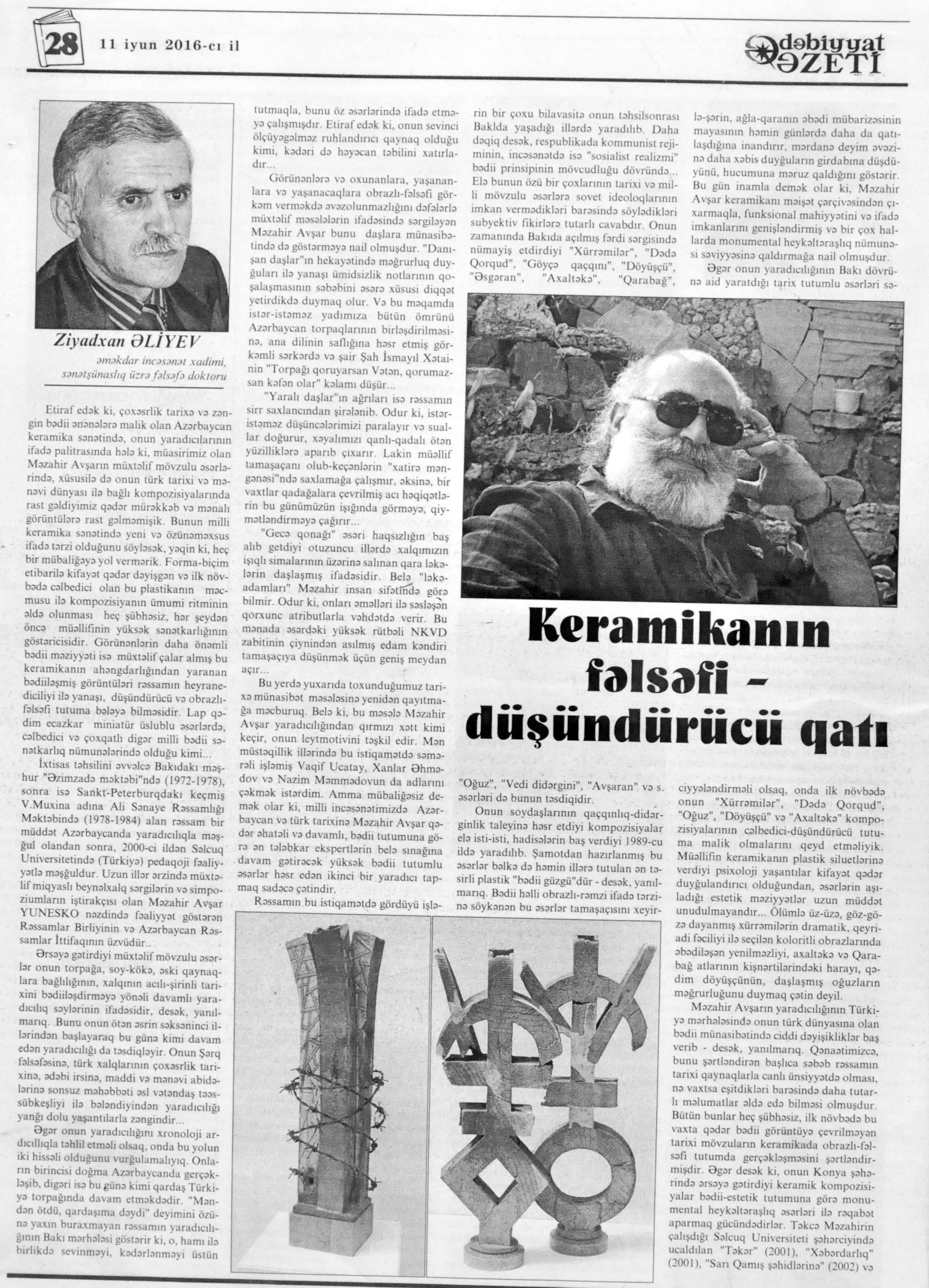328. Qaliboğlu, S. Torpaqdan yaradan rəssam: [qrafik, rəngkar və keramikaçı Mirteymur Məmmədov haqqında] //Mədəniyyət.- 2016.- 3 iyun.- S.11.