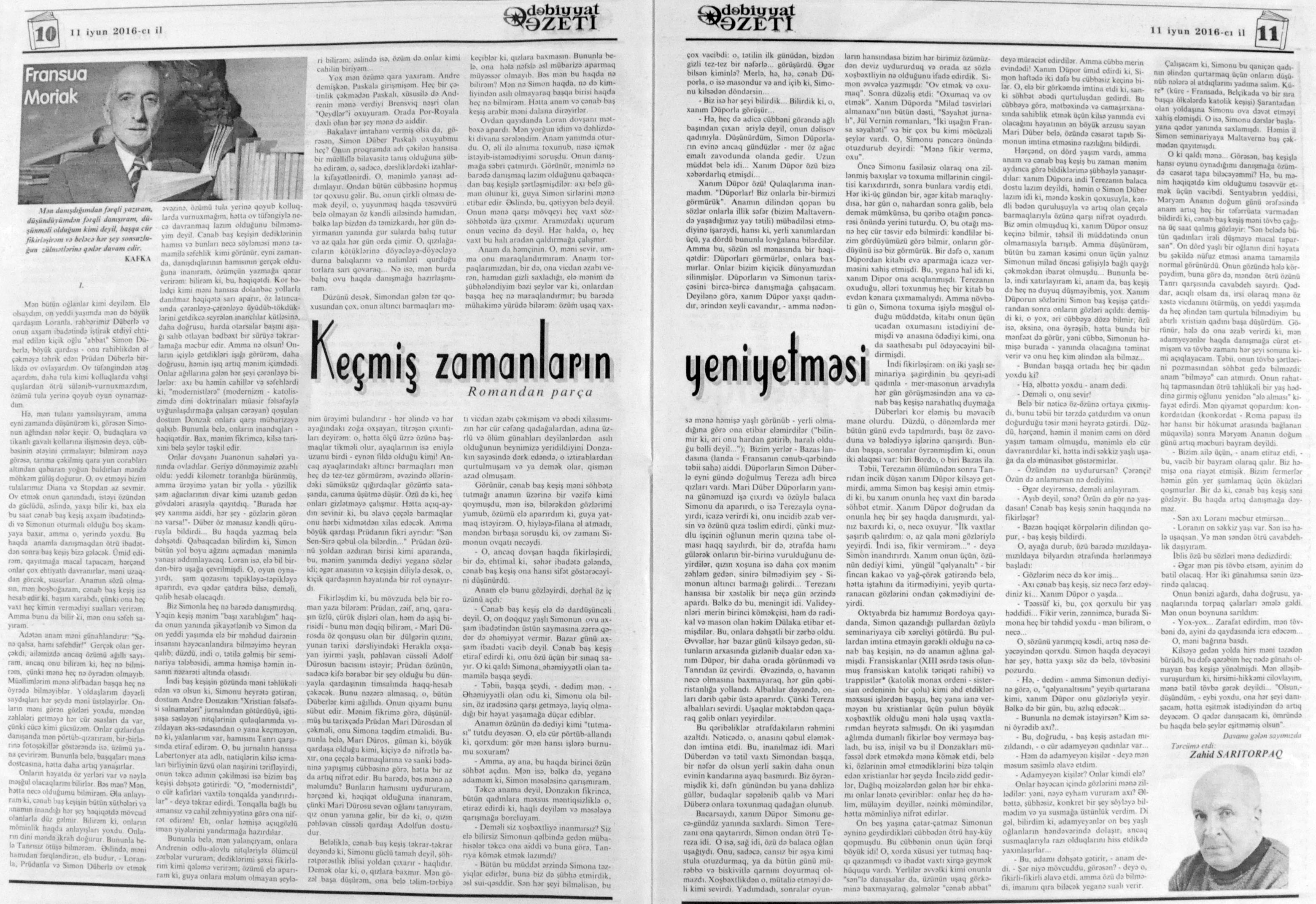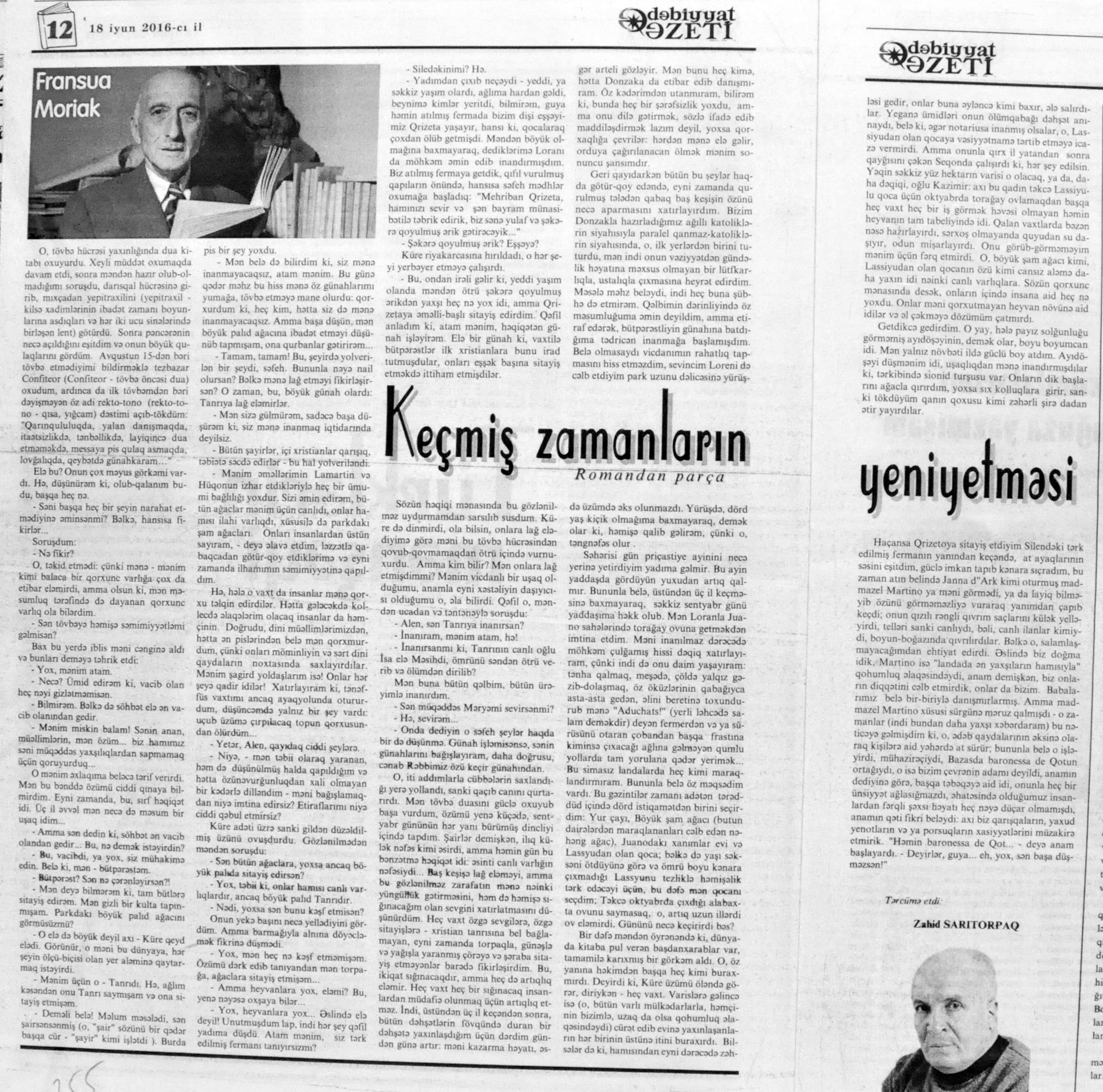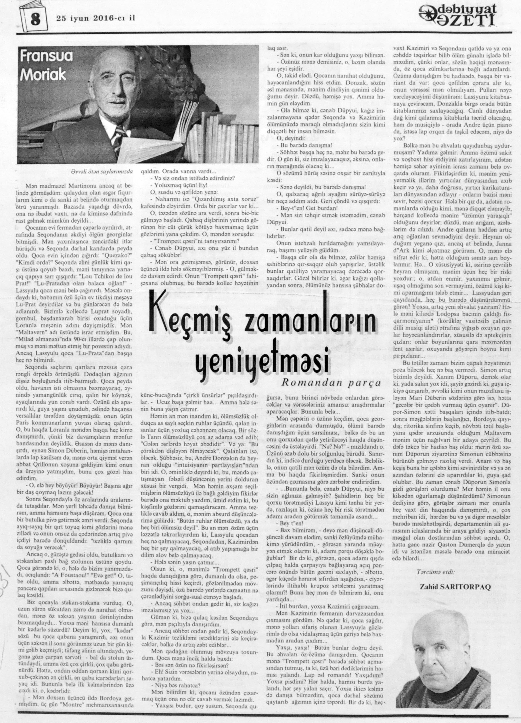 646. Fəhmi, İ. Qapalı dairə və ya bitmək istəməyən XX: Əsərdən fraqmentlər //Ədəbiyyat qəzeti.- 2016.- 4 iyun.- S.14-15. 647. Fəhmi, İ. Qapalı dairə və ya bitmək istəməyən XX: Əsərdən fraqmentlər //Ədəbiyyat qəzeti.- 2016.- 11 iyun.- S.18-19. 648. Moriak, F. Keçmiş zamanların yeniyetməsi: Romandan parça: [Fransa ədəbiyyatından tərcümə] /tərc. etdi Zahid Sarıtorpaq //Ədəbiyyat qəzeti.- 2016.- 11 iyun.- S.10-11. 649. Moriak, F. Keçmiş zamanların yeniyetməsi: [Fransa ədəbiyyatından tərcümə] /tərc.etdi Zahid Sarıtorpaq //Ədəbiyyat qəzeti.- 2016.- 18 iyun.- S.12-13. 650. Moriak, F. Keçmiş zamanların yeniyetməsi: Romandan parça: [Fransa ədəbiyyatından tərcümə] /tərc. etdi Zahid Sarıtorpaq //Ədəbiyyat qəzeti.- 2016.- 25 iyun.- S.8.