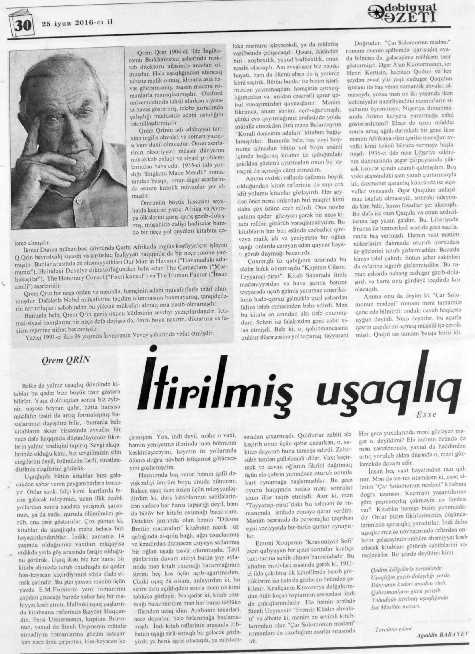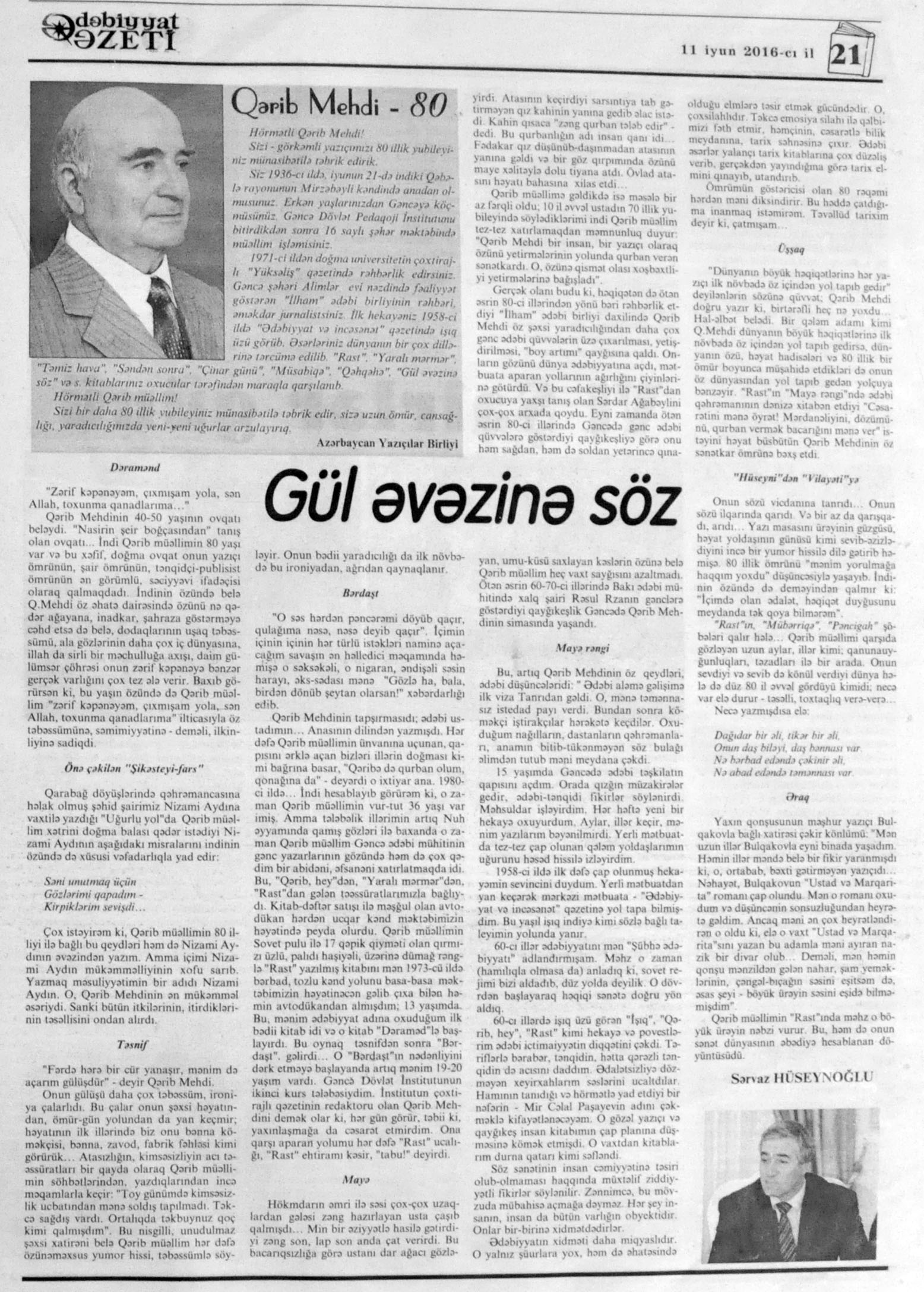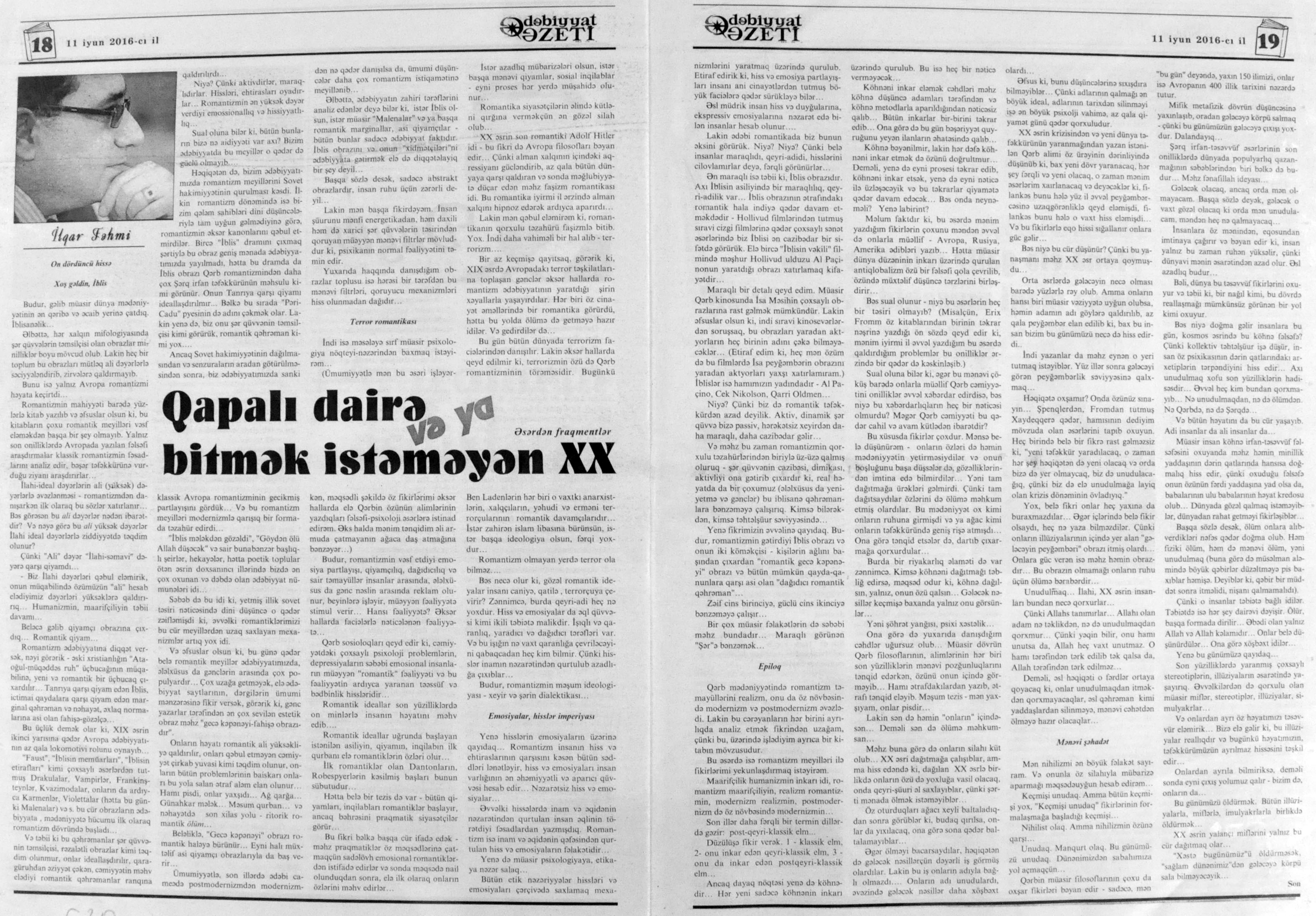 646. Fəhmi, İ. Qapalı dairə və ya bitmək istəməyən XX: Əsərdən fraqmentlər //Ədəbiyyat qəzeti.- 2016.- 4 iyun.- S.14-15. 647. Fəhmi, İ. Qapalı dairə və ya bitmək istəməyən XX: Əsərdən fraqmentlər //Ədəbiyyat qəzeti.- 2016.- 11 iyun.- S.18-19. 648. Moriak, F. Keçmiş zamanların yeniyetməsi: Romandan parça: [Fransa ədəbiyyatından tərcümə] /tərc. etdi Zahid Sarıtorpaq //Ədəbiyyat qəzeti.- 2016.- 11 iyun.- S.10-11. 649. Moriak, F. Keçmiş zamanların yeniyetməsi: [Fransa ədəbiyyatından tərcümə] /tərc.etdi Zahid Sarıtorpaq //Ədəbiyyat qəzeti.- 2016.- 18 iyun.- S.12-13. 650. Moriak, F. Keçmiş zamanların yeniyetməsi: Romandan parça: [Fransa ədəbiyyatından tərcümə] /tərc. etdi Zahid Sarıtorpaq //Ədəbiyyat qəzeti.- 2016.- 25 iyun.- S.8.