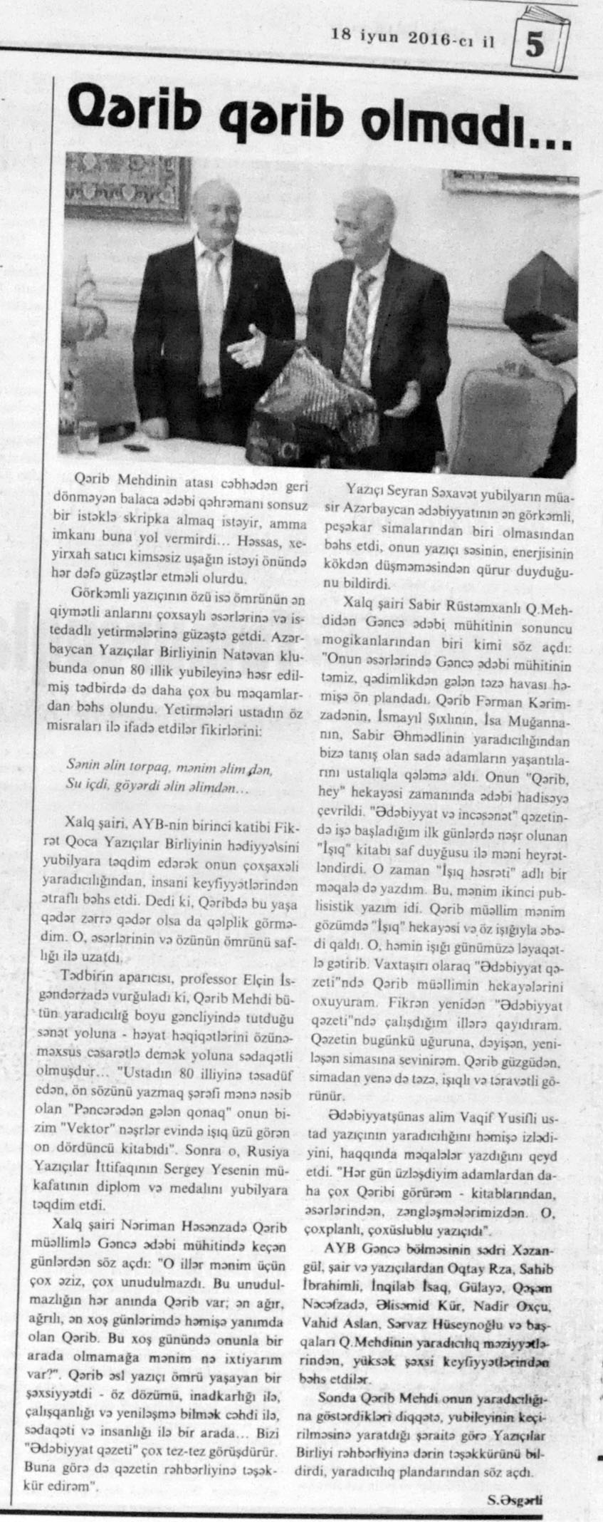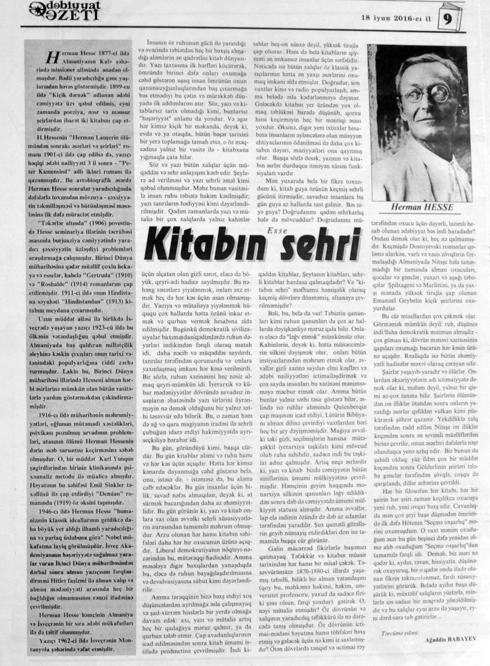 624. Abdulla, K. Birun və əndərun: “Düma ilə Coys arasında” kitabından //525-ci qəzet.- 2016.- 25 iyun.- S.18-19. 625. Abdurəhmanova, F. Sonuncu dərs //Ədəbiyyat qəzeti.- 2016.- 4 iyun.- S.23. 626. Faxralı, R. Dağların yallısı //Ədəbiyyat qəzeti.- 2016.- 4 iyun.- S.8. 627. Hesse, H. Kitabın sehri: [alman ədəbiyyatından tərcümə] /tərc. etdi Ağaddin Babayev //Ədəbiyyat qəzeti.- 2016.- 18 iyun.- S.9. 628. İsax, A. Bir damla göz yaşı... //Kaspi.- 2016.- 11-13 iyun.-S.23. 629. İsax, A. İslanmış nağıl... //Kaspi.- 2016.- 11-13 iyun.- S.23. 630. İsax, A. Vurmaz demə //Kaspi.- 2016.- 11-13 iyun.- S.23. 631. Qrin, Q. İtirilmiş uşaqlıq: [ingilis ədəbiyyatından tərcümə] /tərc. etdi Ağaddin Babayev//Ədəbiyyat qəzeti.- 2016.- 25 iyun.- S.30. 632. Vüsal, B. Hədisi–Zülf yaxud zülfün dastanı //Ədəbiyyat qəzeti.-2016.- 4 iyun.- S.26. 633. Vüsal, B. Hədisi-Zülf, Zülfün dastanı, yaxud, “Könlüm qondu zülfünə”... //Ədəbiyyat qəzeti.- 2016.- 21-27 iyun.- S.15. 634. Vüsal, B. Kamalın meracı //525-ci qəzet.- 2016.- 25 iyun.- S.14;17.