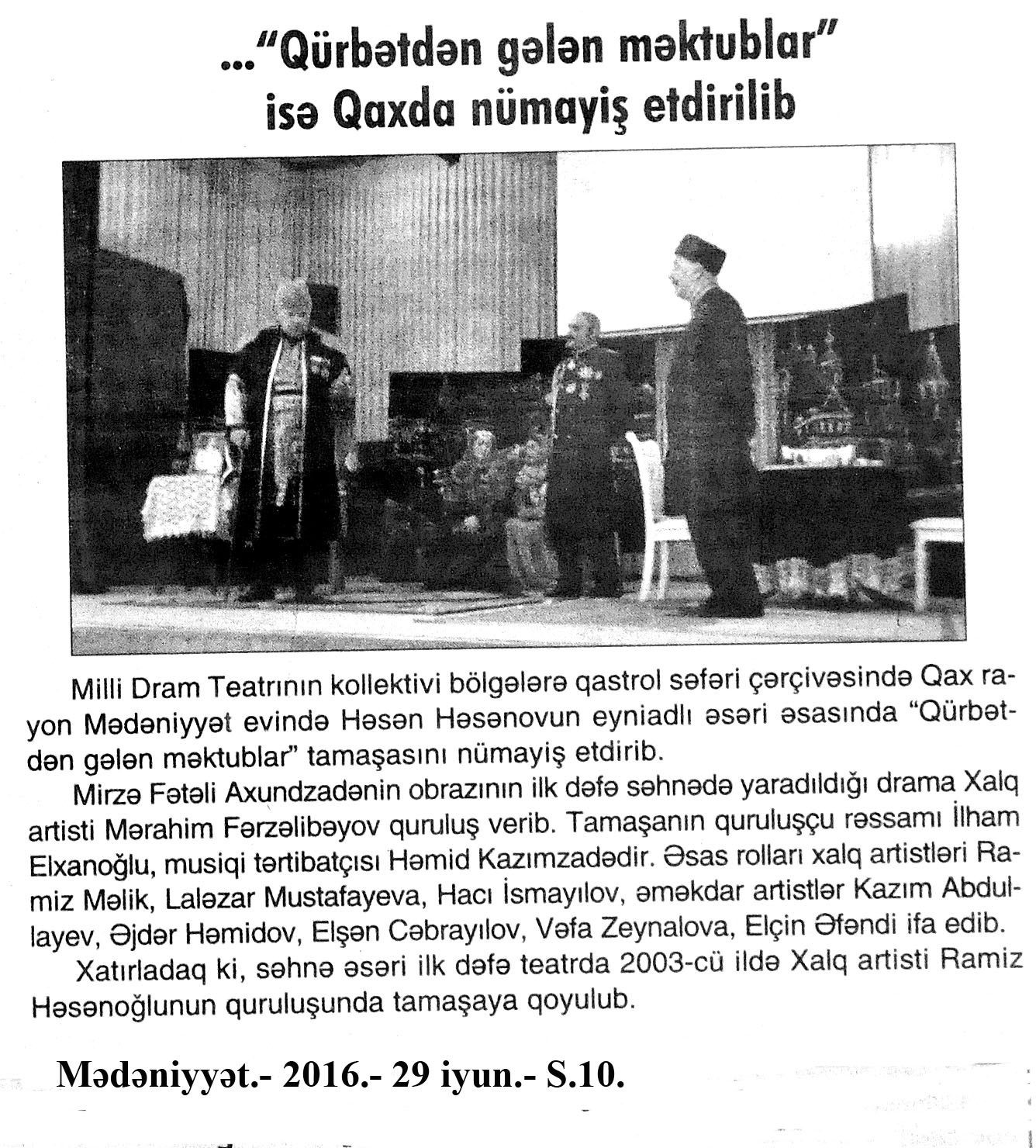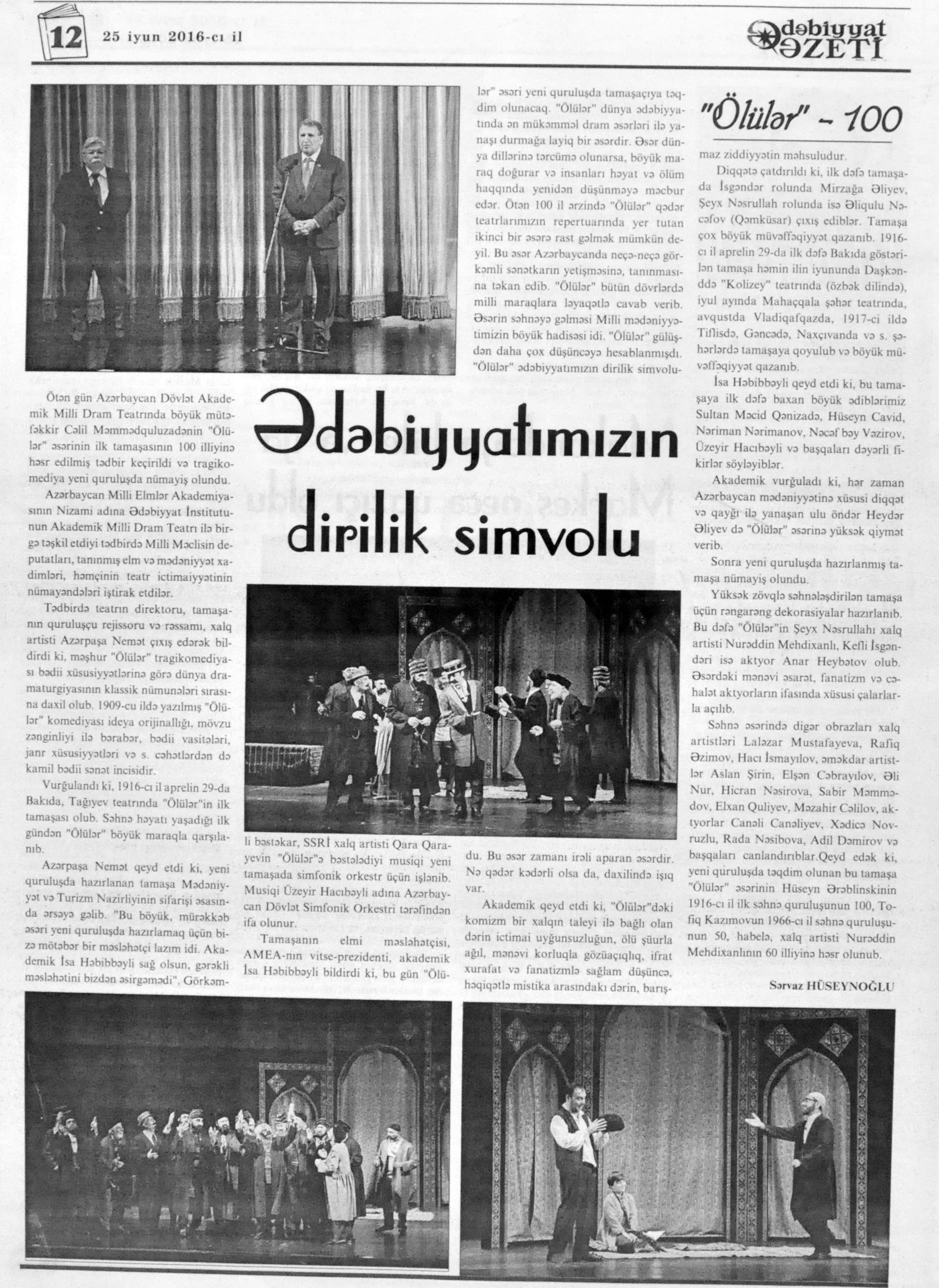 458. Əzimov, R. “Nə yaxşı kı, teatrda Azərpaşa Nemətov var”: Rafik Əzimov: “Milli Dram Teatrı uçurumda idi, o qaytardı”: [Xalq artisti ilə müsahibə] /müsahibəni apardı Tahirə Məmmədqızı //Şərq.- 2016.- 6 iyun.- S.13. 459. Hüseynoğlu, S. Ədəbiyyatımızın dirlik simvolu: “Ölülər” – 100: [Cəlil Məmmədquluzadənin eyniadlı əsərinin ilk tamaşasının yubileyinə həsr edilmiş tədbirin keçirilməsi haqqında] //Ədəbiyyat.- qəzeti 2016.- 25 iyun.- S.12. 460. ...“Qürbətdən gələn məktublar” isə Qaxda nümayiş etdirilib: [rejissor Mərahim Fərzəlibəyovun hazırladığı eyniadlı tamaşa] //Mədəniyyət.- 2016.- 29 iyun.- S.10. 461. Milli Dram Teatrı bölgələrdə “Xəcalət” tamaşasını təqdim edib: [Bəhram Osmanovun hazırladığı eyniadlı tamaşa haqqında] //Mədəniyyət.- 2016.- 22 iyun.- S. 13. 462. Mirməmməd, G. Bizi deyib gələn “Ölülər”: Səhnədə göstərilənlər və bizim gördüklərimiz barədə: [Xalq artisti Azərpaşa Nemətin hazırladığı eyniadlı tamaşa haqqında] //Mədəniyyət.- 2016.- 3 iyun.- S.12. 463. Osmanov, B. “Teatrda canlı ünsiyyət imkanı var”: Bəhram Osmanov: “Bunu heç bir sosial media ilə əvəzləmək, müqayisə etmək mümkün deyil”: [Əməkdar incəsənət xadimi ilə müsahibə] /müsahibəni apardı Tahirə Məmmədqızı //Şərq.- 2016.- 8 iyun.- S.13. 464. “Ölülər” yeni quruluşda səhnəyə qayıtdı: Cəlil Məmmədquluzadənin ölməz tragikomediyası 100 il sonra daha bir premyerasını yaşadı: [Xalq artisti Azərpaşa Nemətin hazırladığı eyniadlı tamaşa haqqında] //Mədəniyyət.- 2016.- 1 iyun.- S.5. 465. Yusifli, V. Səs: (Xalq artisti Mikayıl Mirzəni xatırlarkən) //Ədalət.- 2016.- 7 iyun - S.4. 466. Yüz ilin “Ölülər”i və “Ölülər”in yüz ili: [Xalq artisti Azərpaşa Nemətin quruluş verdiyi eyniadlı tamaşa haqqında] //Mədəniyyət.- 2016.- 29 iyun.- S.6. 467. Zümrüd. “Ölülər” əsəri yeni quruluşda nümayiş olundu: [Xalq artisti Azərpaşa Nemətin quruluş verdiyi eyniadlı tamaşa haqqında] //Səs.- 2016.- 29 iyun.- S.11.