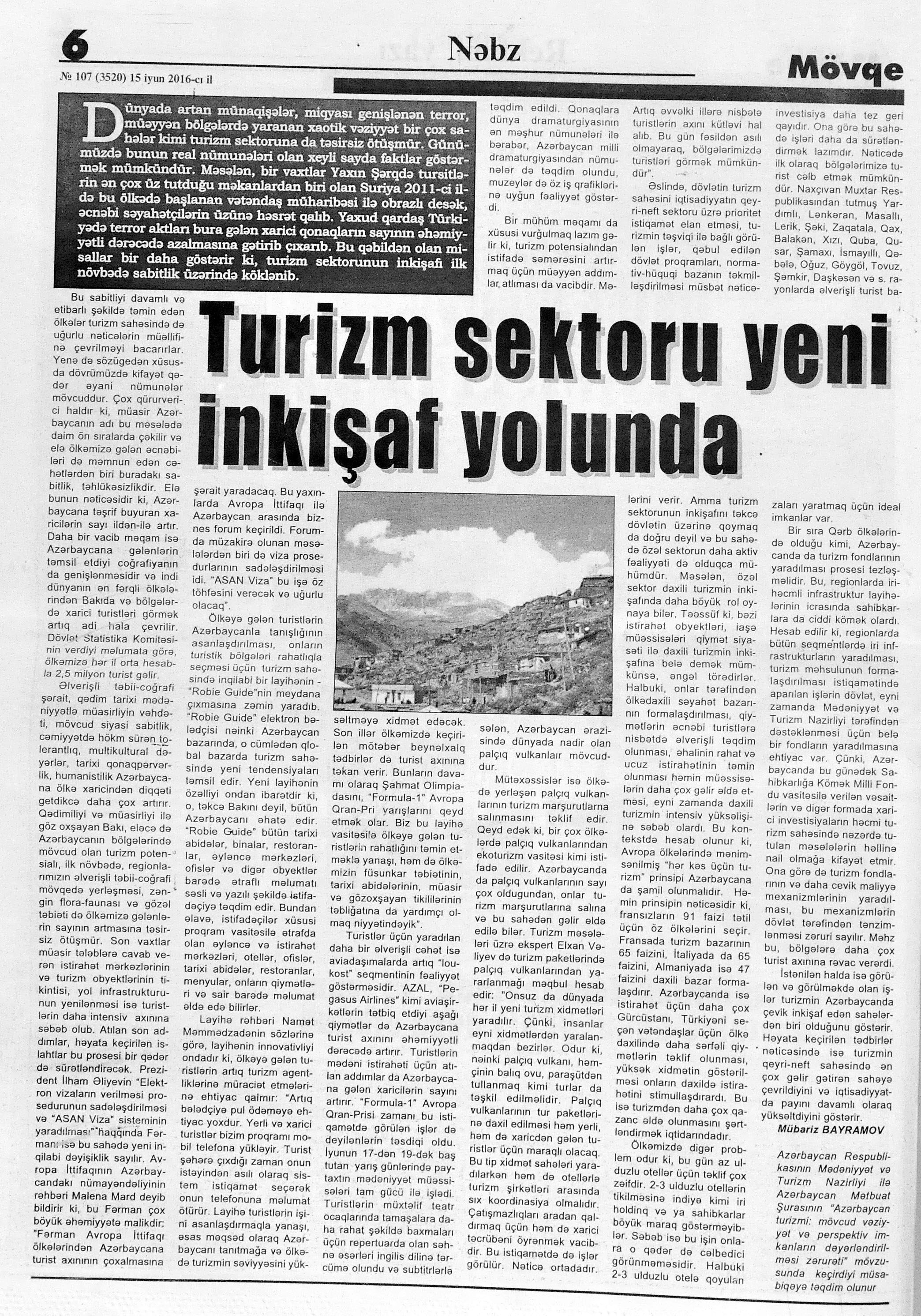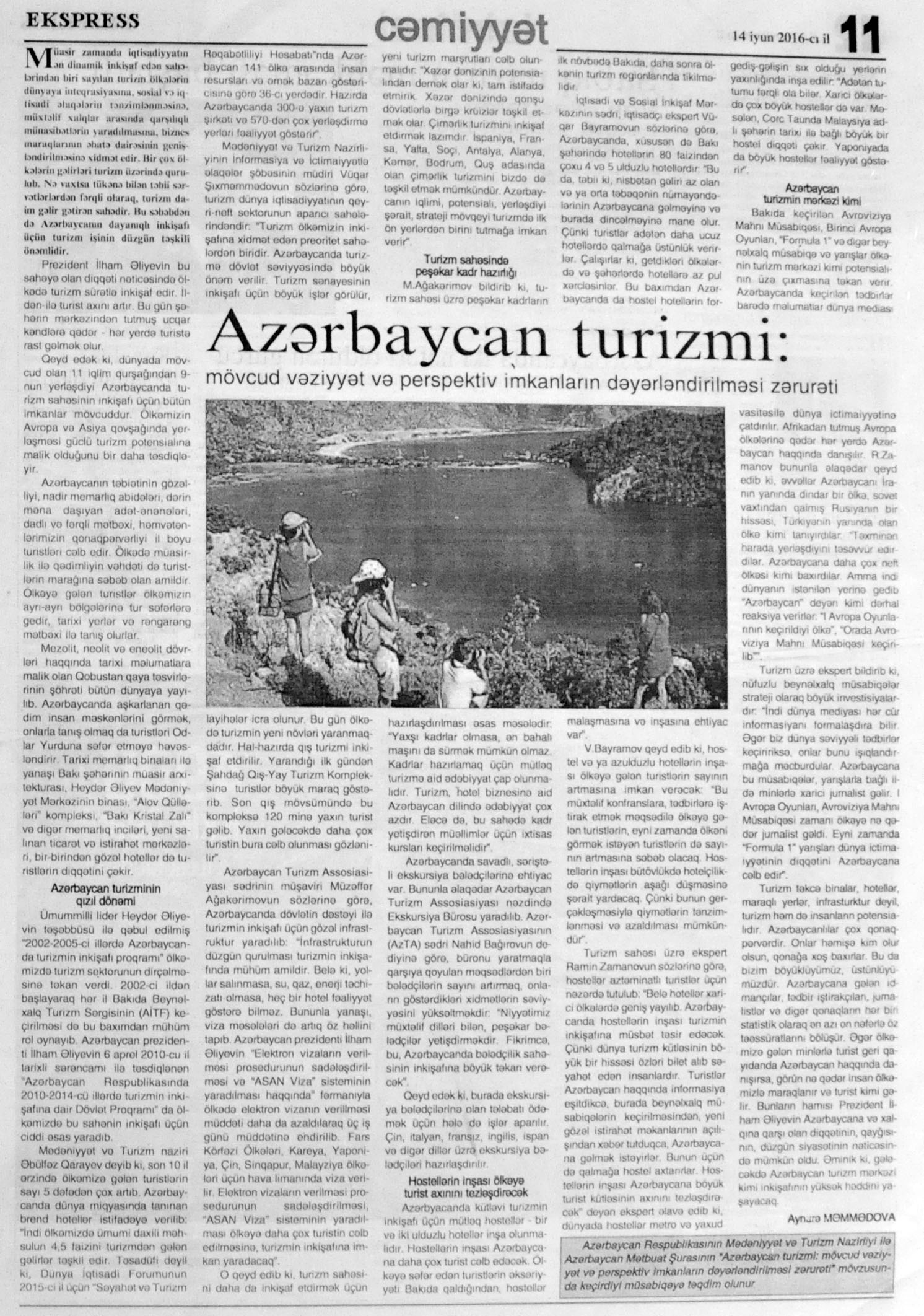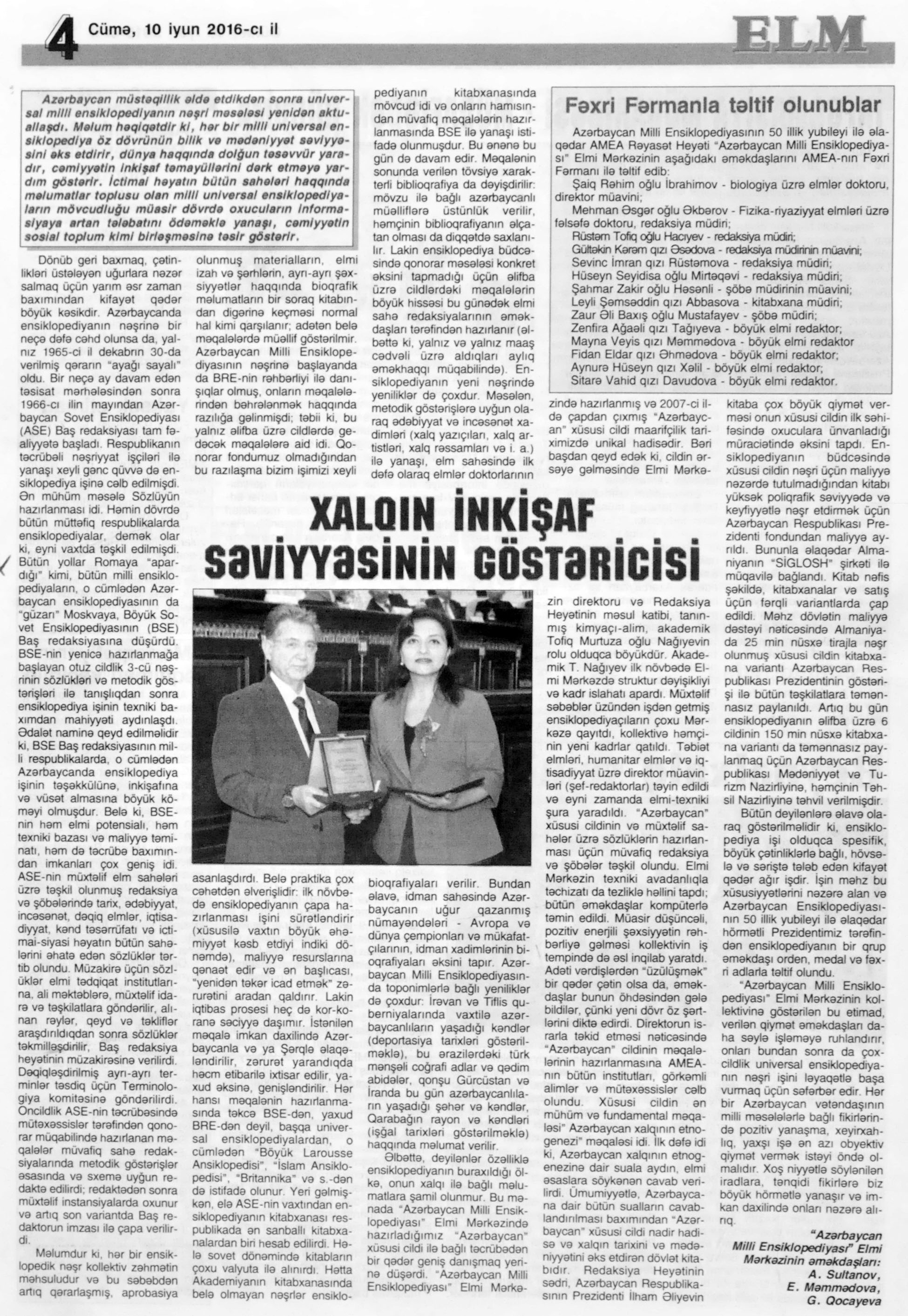 11. Abdullayeva, N. “Həqiqətlərin dünya ictimaiyyətinə çatdırılmasında Milli Ensiklopediya böyük rol oynamalıdır”: [AMEA-da Azərbaycan Milli Ensiklopediyasının 50 illik yubileyinə həsr olunmuş tədbirin keçirilməsi haqqında] //Palitra.- 2016.- 9 iyun.- S.7. 12. Amanov, R. Zaqatala: mədəniyyətə qayğı dünənimizə, bugünümüzə, gələcəyimizə qayğıdır: (Azərbaycanda və xaricdə keçirilən simpozium, forum, konfrans materialları əsasında): [rayon Mədəniyyət və Turizm Şöbəsinin müdiri Zümrüd Ağakişiyeva haqqında //Respublika.- 2016.- 22 iyun.- S.6. 13. Aşırlı, A. I Bakı Türkoloji Qurultayı Azərbaycan mətbuatında //Şərq.- 2016. - 17 iyun.- S.5. 14. Aşırlı, A. I Bakı Türkoloji Qurultayı Azərbaycan mətbuatında //Şərq.- 2016. - 18 iyun.- S.5. 15. Aşırlı, A. I Bakı Türkoloji Qurultayı Azərbaycan mətbuatında //Şərq.- 2016. - 21 iyun.- S.5. 16. Aşırlı, A. I Bakı Türkoloji Qurultayı Azərbaycan mətbuatında //Şərq.- 2016. - 22 iyun.- S.5. 17. Avropa Şurası Mədəniyyət, irs və landşaft məsələləri üzrə Rəhbər Komitəsinin iclası: [Fransanın Strasburq şəhərində keçirilən eyniadlı iclasda Mədəniyyət və Turizm nazirinin müavini Sevda Məmmədəliyevanın iştirak etməsi haqqında] //Mədəniyyət.- 2016.- 15 iyun.- S. 3. 18. Azərbaycan Milli Ensiklopediyasının 50 illik yubileyi qeyd olunub: [AMEA-da] //Azərbaycan.- 2016.- 9 iyun.- S.5; Xalq qəzeti.- 2016.- 9 iyun.- S.7; Yeni Azərbaycan.- 2016.- 9 iyun.- S.4.; Azərbaycan müəllimi.- 2016.- 11 iyun.- S.2. 19. Azəri, L. Gəncə şəhərinin sosial-iqtisadi inkişafı: real vəziyyət və perspektivlər: [adı çəkilən şəhərin mədəniyyəti və turizmi haqqında] //Mədəniyyət.- 2016.- 29 iyun.- S.12. 20. Bakı Turizm Peşə Məktəbində plov festivalı //Mədəniyyət.- 2016.- 3 iyun.- S. 3. 21. “Bəsləsən atlas olar tut yarpağından”: [Qax rayonunun Qum kəndində keçirilən eyniadlı festivalda tutdan hazırlanan mətbəx nümunələri və məhsulların nümayiş olunması haqqında] //Mədəniyyət.- 2016.- 22 iyun.- S. 7. 22. Daşkəsəndə mədəniyyət müəssisələri rəhbərlərinin iştirakı ilə işçi müşavirə //Mədəniyyət.- 2016.- 22 iyun.- S.2. 23. Elm, mədəniyyət, media sahəsində tanınan diaspor nümayəndələri təltif olunub //Mədəniyyət.- 2016.- 3 iyun.- S.2. 24. Hadiyev, E. Təməl möhkəm olanda...: Zirə Mədəniyyət Mərkəzində yeniyetmə və gənclərin mənalı istirahəti, hərtərəfli inkişafı üçün hər şərait var //Azərbaycan.- 2016.- 29 iyun.- S.7. 25. Hüseynov, F. “Bölgələrdən paytaxta” layihəsində Lənkəranın təqdimatı: Bənzərsiz təbiəti, zəngin mədəniyyət və mətbəxi turistlərin bu bölgəyə marağını artırır: [Azərbaycan Dövlət Akademik Milli Dram Teatrında reallaşan eyniadlı təqdimat haqqında] //Mədəniyyət.- 2016.- 8 iyun.- S.3. 26. Hüseynov, F. Mədəniyyət və Turizm nazirinin vətəndaşlarla növbəti görüşü Samuxda keçirildi: “Mövcud problemlər dinlənildi, bir sıra maraqlı təklif və təşəbbüslər irəli sürüldü” //Mədəniyyət.- 2016.- 15 iyun.- S.5. 27. Hüseynov, F. Türkdilli dövlətlərin müstəqilliyinin 25 illiyinə sənət töhfəsi: TÜRKSOY-un təşəbbüsü ilə yaradılan xalq çalğı alətləri orkestri konsert proqramı təqdim edib: [M. Maqomayev adına Azərbaycan Dövlət Filarmoniyasında] //Mədəniyyət.- 2016.- 29 iyun.- S.3. 28. Qasımov, H. Qafqazın ən böyük Kitab evi Gəncədə açıldı //Xalq qəzeti.- 2016.- 17 iyun.- S.6. 29. Quliyev, L. Ağdam “mədəniyyət beşiyi” adını inamla doğruldur //Azərbaycan.- 2016.- 1 iyun.- S. 8. 30. Qusar rayonunda “Vətənpərvərlik həftəsi”: [Silahlı Qüvvələr Günü ilə bağlı keçirilən musiqili tədbir haqqında] //Mədəniyyət.- 2016.- 24 iyun.- S. 11. 31. Lalə. Teatr-konsert müəssisələrinin mətbuatla əlaqələri müzakirə olunub: Yaxın vaxtlarda nazirlik tərəfindən mədəniyyət müəssisələrinin fəaliyyətini əks etdirən yeni sayt təqdim ediləcək : [Milli Kitabxanada eyniadlı mövzuya dair keçirilən tədbir haqqında] //Mədəniyyət.- 2016.- 29 iyun.- S.4. 32. Mədəniyyət və Turizm naziri Samux rayonunda vətəndaşlarla görüşüb: [nazir Əbülfəz Qarayev] //Azərbaycan.- 2016.- 11 iyun.- S.3; Respublika.- 2016.- 11 iyun.- S.4; İki sahil.- 2016.- 11 iyun.- S. 19. 33. Mədəniyyət və Turizm nazirinin müavini Koreya portalına müsahibə verib //Mədəniyyət.- 2016.- 24 iyun.- S.4. 34. Məmmədhəsən. “Bölgələrdən paytaxta” : Nöbvəti layihə Lənkərana həsr edilib //Azad Azərbaycan.- 2016.- 8 iyun.- S.7. 35. Naxçıvanda “İstedadlı uşaqlar” festivalı: [“Naxçıvanqala” Tarix-Memarlıq Muzey Kompleksində eyniadlı festivalın keçirilməsi haqqında] //Mədəniyyət.- 2016.- 3 iyun.- S.5. 36. Naxçıvanın “İslam mədəniyyəti paytaxtı” elan edilməsi ilə əlaqədar Təşkilat Komitəsi yaradılıb //Mədəniyyət.- 2016.- 3 iyun.- S.2. 37. Ölkəmizin “Yəhudi irsi üzrə Avropa marşrutu” layihəsində iştirakı müzakirə olunub //Mədəniyyət.- 2016.- 3 iyun.- S.5. 38. Pərvin. TÜRKSOY-dan müstəqilliyimizə ərmağan: [TÜRKSOY-yun Filarmoniya salonunda keçirdiyi konsert proqramı haqqında] //525-ci qəzet.- 2016.- 29 iyun.- S.4. 39. Sabirabad və Ağcabədidə kitab bayramları: [ulu öndər Heydər Əliyevin döğum günü münasibətilə] //Mədəniyyət.- 2016.- 1 iyun.- S.11. 40. Sultanov, A. Xalqın inkişaf səviyyəsinin göstəricisi: [Azərbaycan Milli Ensiklopediyasının 50 illik yubileyinə həsr olunan tədbirin keçirilməsi haqqında] //Elm.- 2016.- 10 iyun.- S.4. 41. Sumqayıt mədəniyyət evləri və klub müəssisələrinin hesabat konsertləri //Mədəniyyət.-2016.- 15 iyun.- S.10. 42. Topçu, Y. “Azərbaycanın hər bölgəsi türk dünyasının mədəniyyət paytaxtı 