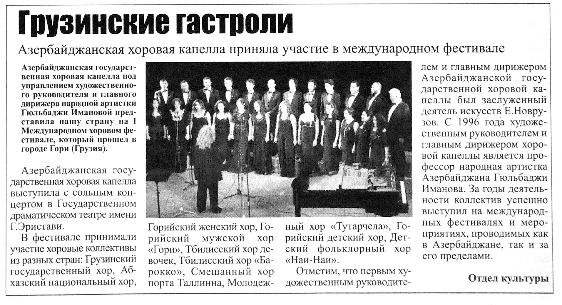 900. Аббасов, Д. Музыка свыше, или Откровения композитора: [беседа с Заслуженным деятелем искусств Джалалом Аббасовым] /провела С.Кулиева //Каспiй.- 2016.- 11 июня.- С.8-9. 901. Асадова, И. Юные скрипачи Зенфиры Багирзаде выступили с концертом: Концерт состоялся в «Капельхаусе» //Каспiй.- 2016.- 9 июня.- С.8. 902. Ахундова, Е. Оркестр культуры: Норвежские мастера провели мастер-классы для студентов духовиков и струнников: [беседа с проректором БМА по международным связям Е.Ахундовой] /провела А.Ислам //Каспiй.- 2016.- 3 июня.- С.13. 903. В Баку поставили памятник Рашиду Бейбутову: [скульптора Фуада Салаева] //Ежедневные новости.- 2016.- 17 июня.- С.10. 904. В Минске состоялась премьера балета «Любовь и Смерть» Полада Бюльбюльоглу //Ежедневные новости.- 2016.- 17 июня.- С.10. 905. В России издана брошюра Полада Бюльбюльоглы: [«Международный диалог культур: Азербайджан-Россия»] //Ежедневные новости.- 2016.- 3 июня.- С.5. 906. Грузинские гастроли: Азербайджанская хоровая капелла приняла участие в международном фестивале //Каспiй.- 2016.- 3 июня.- С.13. 907. Ислам, А. Фархад Бадалбейли дал напутствие выпускникам: В БМА состоялся концерт, посвященный очередному выпуску студентов //Эхо.- 2016.- 29 июня.- С.8. 908. Ислам, А. Pera piano: В Турции прошел международный музыкальный конкурс: [инициатор его проведения выпускник БМА Рафаэль Гасымов] //Каспiй.- 2016.- 11 июня.- С.20. 909. Кязимова, С. Дарование высокой пробы: «Золотая книга» юных талантов Азербайджана пополнилась новыми именами //Азербайджанские известия.- 2016.- 18 июня.- С.3. 910. Мамедов, Т. Пропагандируя наследие: Бакинской Музыкальной Академии - 95: [беседа с доктором искусствоведения Т.Мамедовым] /провела А.Ислам //Каспiй.- 2016.- 18 июня.- С.20. 911. Мустафаева, Э. «Бременские музыканты» как итоговый экзамен: Детский оперный театр школы - студии БМА отчитался перед зрителями и педагогами //Эхо.- 2016.- 14 июня.- С.8. 912. П.Бюльбюльоглу: «Вручение премии «Звезды Содружества» — радостная весть, которая разнесется по всему СНГ»: [церемонии вручения премии в Минске] //Бакинский рабочий.- 2016.- 14 июня.- С.7.