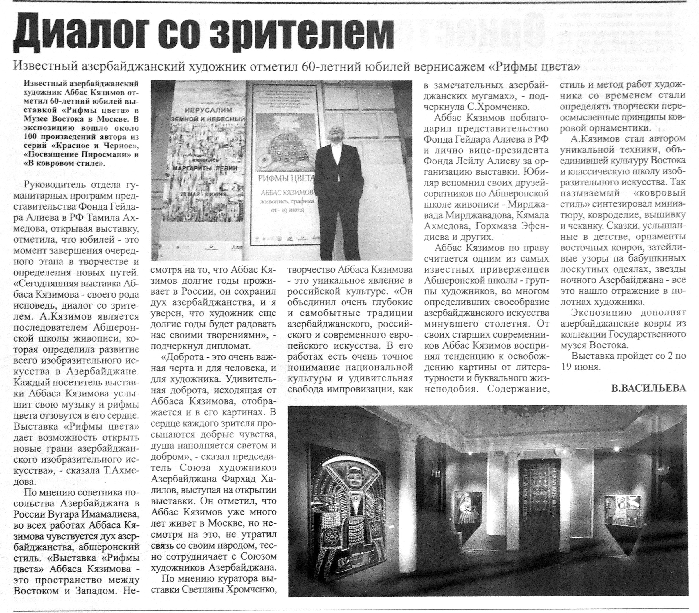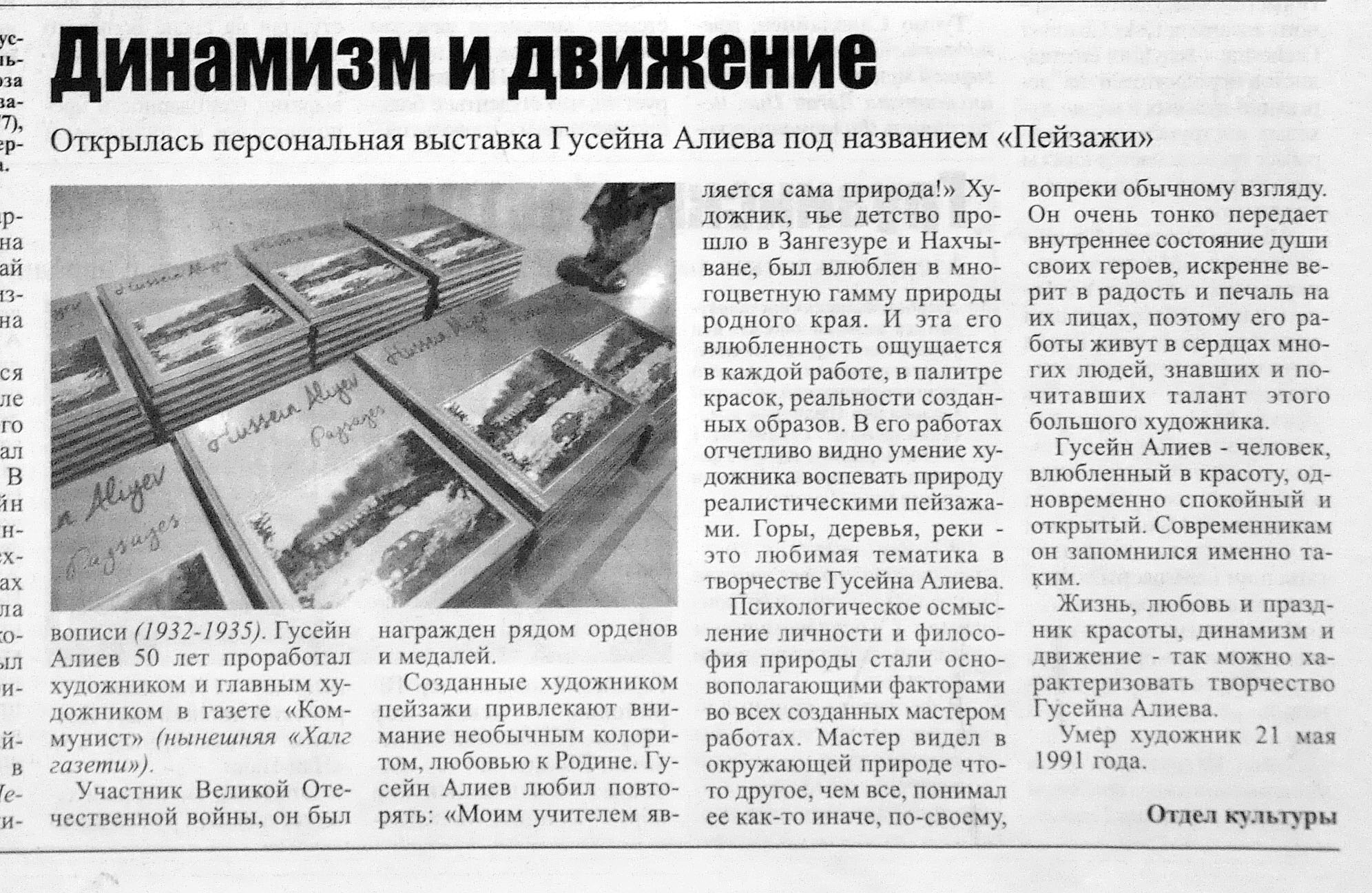 877. Асадова, И. «Аплодисменты жюри» для Нигяр Нариманбековой: Группа художников ассоциации «Стелла Арт Интернешнл» удостоена приза международного фестиваля «Традиции и современность» //Эхо.- 2016.- 8 июня.- С.8. 878. Асадова, И. «Игра света и тени» в работах Джамиля Гусейнова: В Баку открылась выставка молодого художника: [в галерее «Гыз галасы»] //Эхо.- 2016.- 15 июня.- С.8. 879. Асадова, И. Нигяр Нариманбекова - «Лучший художник 2016 года во Франции и в Европе»: Национальная федерация культуры Франции наградила азербайджанского художника высшей наградой знаменитого Осеннего салона независимых художников Франции - TOILE D'OR //Эхо.- 2016.- 9 июня.- С.8. 880. Асадова, И. «Пейзажи» Гусейна Алиева: В Музее современного искусства открылась выставка одного из самых выдающихся представителей изобразительного искусства нашей страны //Бакинский рабочий.- 2016.- 3 июня.- С.8. 881. В Лувре открылась персональная выставка талантливой молодой художницы Марьям Алекберли //Бакинский рабочий.- 2016.- 1 июня.- С.8. 882. В Москве открылась выставка известного азербайджанского художника: [Аббаса Кязимова в Музее Востока] //Ежедневные новости.- 2016.- 3 июня.- С.10. 883. В Музее современного искусства состоялось открытие персональной выставки народного художника Гусейна Алиева под названием «Пейзажи» //Бакинский рабочий.- 2016.- 2 июня.- С.6; Азербайджанские известия.- 2016.- 4 июня.- С.1, 3. 884. Васильева, В. Диалог со зрителем: Известный азербайджанский художник отметил 60-летний юбилей вернисажем «Рифмы цвета»: [Аббас Кязимов] //Каспiй.-2016.- 3 июня.- С.14. 885. Гурбанов, Г. Гудрат Гурбанов, художник: «Мечтаю написать Худаферинский мост с натуры» /беседу провела Р.Асланова //Азербайджанские известия.- 2016.- 11 июня.- С. 3. 886. Динамизм и движение: Открылась персональная выставка Гусейна Алиева под названием «Пейзажи» //Каспiй.- 2016.- 11 июня.- С. 3. 887. Мирзоева, С. Тема творчества — героика: Юбилейная выставка стала достойной данью памяти известного художника: [Бабы Aлиeва в Музее Искусств] //Азербайджанские известия.- 2016.- 18 июня.- С. 3. 888. Нариманбекова, Н. Нигяр Нариманбекова: «Как можно продавать волшебство, любовь, доброту или милосердие? »: [беседа с художником] /провела И.Асадова] //Эхо.- 2016.- 25 июня.- С.10.
