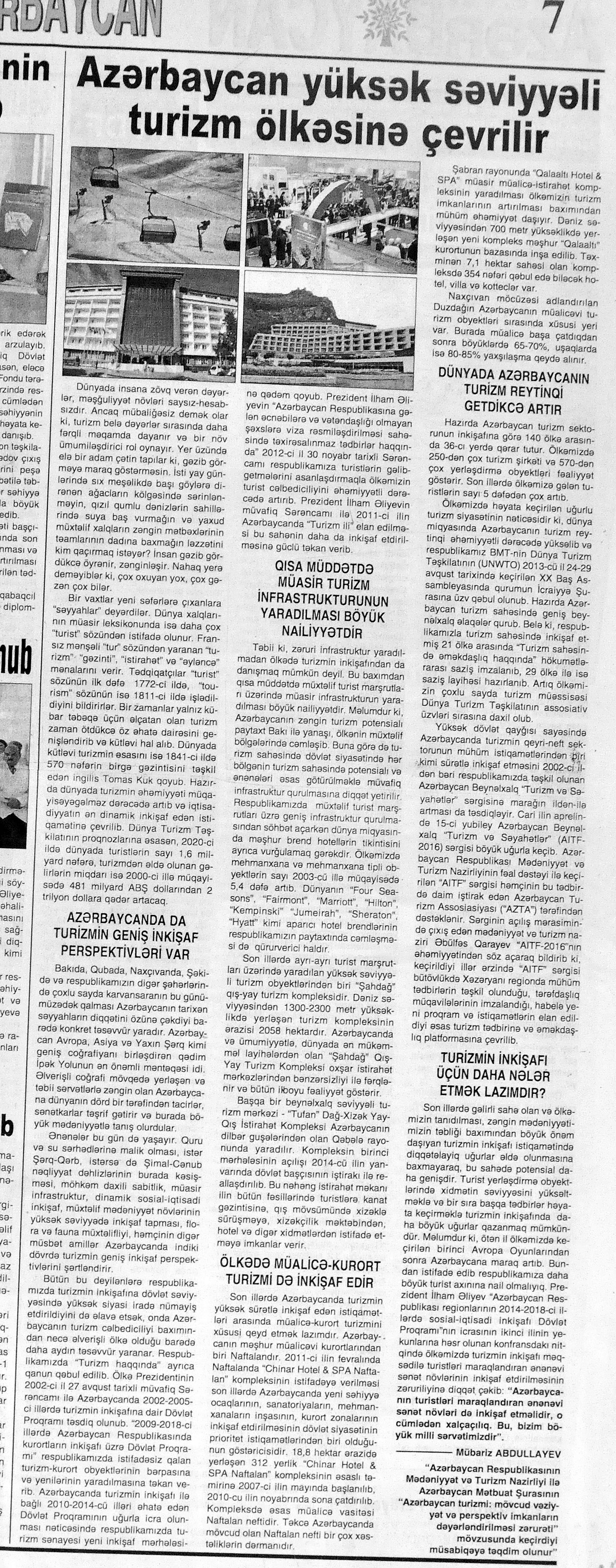 485. Abdullayev, M. Azərbaycan yüksək səviyyəli turizm ölkəsinə çevrilir //Yeni Azərbaycan.- 2016.- 18 iyun.- S. 7. 486. Abdullayev, M. Azərbaycanın regionlarının turizm potensialından geniş istifadə olunur //Yeni Azərbaycan.- 2016.- 23 iyun.- S. 8. 487. Ankarada COMCEC işçi qrupunun iclası: [İslam Əməkdaşlıq Təşkilatının İqtisadi və Ticarət Əməkdaşlığı üzrə Daimi Komitəsinin iclasında turizm və digər sahələr üzrə məsələlərin müzakirə olunması haqqında] //Mədəniyyət.- 2016.- 3 iyun.- S.4. 488. Asimqızı, A. Viza probleminin asan həlli: Elektron vizaların verilməsi prosedurunun “Asan Xidmət”ə həvalə edilməsi razılıqla qarşılanıb //Kaspi.- 2016.- 3 iyun.- S.6. 489. ATMU-nun turizm nəşrləri: [“Turizm və qonaqpərvərlik tədqiqatları” beynəlxalq jurnalının növbəti sayının çapdan çıxması haqqında] //Mədəniyyət.- 2016.- 1 iyun. - S.9. 490. Azərbaycan və Qazaxıstanın turizm təmsilçilərinin görüşü //Mədəniyyət.- 2016.- 8 iyun.- S.2. 491. Babaxanov, N. Təbiətin gətirdiyi gəlir: Azərbaycanın mövcud turizm potensialından səmərəli istifadə olunması bu sahənin inkişafının əsas şərtidir //Azərbaycan.- 2016.- 10 iyun.- S.6. 492. Bayramov, M. Turizm sektoru yeni inkişaf yolunda //Mövqe.- 2016.- 15 iyun.- S.6. 493. Dağlar qoynunda yay istirahəti: [Qax rayonu haqqında] //Mədəniyyət.- 2016.- 17 iyun.- S.9. 494. Əliyev, S. Kənd turizmi: daha sərfəli, daha keyfiyyətli: Gədəbəydə turizmin bu istiqamətinin inkişafı üçün geniş imkanlar var //Azərbaycan.- 2016.- 8 iyun.- S. 2;8. 495. Əlləddinqızı, N. Turizm sürətlə inkişaf edən iqtisadi sektora çevrilib //Səs.- 2016.- 8 iyun.- S.4. 496. Fariz. Azərbaycanda turizm: strateji baxış: İctimai müzakirələrdə turizm sənayesinin inkişaf etdirilməsi ilə bağlı görülən və görüləcək işlərdən söz açılıb: [İqtisad Universitetində keçirilən ey-niadlı tədbir haqqında] //Mədəniyyət.- 2016.- 10 iyun.- S.3. 497. Fətəliyev, A. Xoşbəxt yaşamağın yeganə yolu pozitiv olmaqdır: [Chevrolet Azərbaycanın Marketinq departamentinin direktoru və Turizm və Menecment Universitetinin müəllimi Anar Fəth Fətəliyevlə müsahibə] /müsahibəni apardı Lalə Musaqızı //Kaspi.-2016.-17 iyun.- S.8. 498. “Gördüyüm mənzərəni sözlə təsəvvür edə bilmirəm”: Fransalı turistin Xınalıq təəssüratı: [Quba rayonunun Xınalıq kən-dini ziyarət etmiş Kventin Merellinin təəssüratları] //Mədəniyyət.- 2016.- 22 iyun.- S.10. 499. Göyçayda “Gənclər üçün turizm və mədəniyyət dü-şər-gəsi” //Mədəniyyət.- 2016.- 8 iyun.- S.9. 500. Hotelçilik ixtisası üzrə fənn proqramının müzakirəsi keçirilib: [Azərbaycan Turizm və Menecment Universitetində] //Mədəniyyət.- 2016.- 1 iyun. - S.9. 501. Hüseynov, F. Azərbaycan turizmi: mövcud imkanlar daha böyük inkişaf üçün zəmindir //Mədəniyyət.- 2016.-10 iyun.- S.12. 502. Hüseynov, F. Naxçıvana tur təşkil olunub //Mədəniyyət.- 2016.- 1 iyun.- S.9. 503. Hüseynov, F. Naxçıvana turist səfərləri artıb //Mədəniyyət.- 2016.- 24 iyun.- S. 9. 504. Hüseynov, F. Turizm və Menecment Universiteti növbəti məzun buraxılışına hazırlaşır //Mədəniyyət.- 2016.- 22 iyun.- S.4. 505. İlk piknik zonasına gələn turistlərin sayı artmaqdadır: [Qobustan rayonu ərazisində yerləşən “Qobulənd” istirahət mərkəzi haqqında] //Mədəniyyət.- 2016.- 22 iyun.- S.16. 506. İran və Birləşmiş Ərəb Əmirliklərindən gələn turistlərin sayı artıb //Mədəniyyət.- 2016.- 29 iyun.- S. 7. 507. İsmayıllıda “Sənətkarlıq bazarı”nın açılış mərasimi keçirilib: Layihə bölgələrdə turizmin inkişafına və regional marşrutların populyarlaşdırılmasına xidmət edir //Mədəniyyət.- 2016.- 17 iyun.- S.8. 508. İstirahət mərkəzində səyyar kitabxana xidməti: [Qəbələ rayonunda turistlər və yerli sakinlərin istirahətini daha maraqlı etmək üçün] //Mədəniyyət.- 2016.- 22 iyun.- S. 7. 509. Küveyt qəzetində Azərbaycan haqqında məqalə //Mədəniyyət.- 2016.- 10 iyun.- S.9. 510. Küveytin media nümayəndələri ölkəmizə səfər edib //Mədəniyyət.- 2016.- 1 iyun.- S.9. 511. Qara dəniz regionunda turizm əməkdaşlığı müzakirə olunub //Mədəniyyət.- 2016.- 24 iyun.- S.3. 512. Qələndərli, N. Turizm sahəsində həyata keçirilən uğurlu siyasət regionların sosial-iqtisadi inkişafına mühüm töhfələr verir //Yeni Azərbaycan.- 2016.- 3 iyun. - S.7. 513. Qorqud. Azərbaycan turizmi: mövcud vəziyyət və perspektivlərin dəyərləndirilməsi zərurəti //Bakı xəbər.-2016.-9 iyun.- S.15. 514. Qorqud. Qalaaltı Hotel və Sanatoriya kompleksində xidmət paketlərinə iyun endirimləri //Palitra.- 2016.- 9 iyun.- S.15. 515. Quliyeva, A. Azərbaycan turizmi: Mövcud vəziyyət və perspektiv imkanların dəyişdirilməsi zərurəti //525-ci qəzet.- 2016.-14 iyun.- S.4. 516. Lənkəranda turizm işçiləri üçün treninqlər başa çatıb //Mədəniyyət.- 2016.- 15 iyun. - S. 9. 517. Məhərrəmzadə, Ə. Azərbaycan turizm sektorunun böyük inkişaf perspektivləri //Respublika.- 2016.- 18 iyun.- S.5. 518. Məmmədova, A. Azərbaycan turizmi: mövcud vəziyyət və perspektiv imkanların dəyərləndirilməsi zərurəti //Ekspress.- 2016.- 14 iyun.- S.11. 519. Məmmədova, Y. Məqsəd Azərbaycan turizminin böyük imkanlarını təqdim etməkdir //İqtisadiyyat.- 2016.- 10-13 iyun.- S.2. 520. Mənsimov, E. Paytaxtımız “Formula -1” yarışları ərəfəsindədir //Azərbaycan.- 2016.- 3 iyun.- S. 1; 6. 521. “Müasir İpək Yolu” mədəni turizm marşrutu layihəsi reallaşır: Dörd ölkədən 11 turizm şirkətinin tərəfdaş olduğu layihə üzrə memorandum imzalanıb: [Qazaxıstanın Çolpan-Ata şəhərində Türkdilli dövlətlərin keçirdiyi görüş haqqında] //Mədəniyy