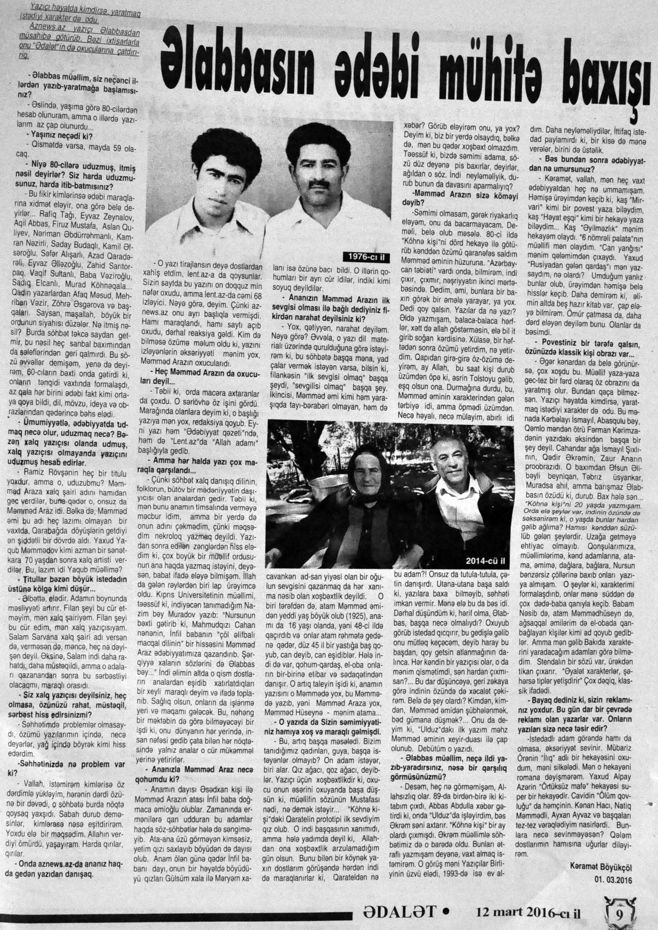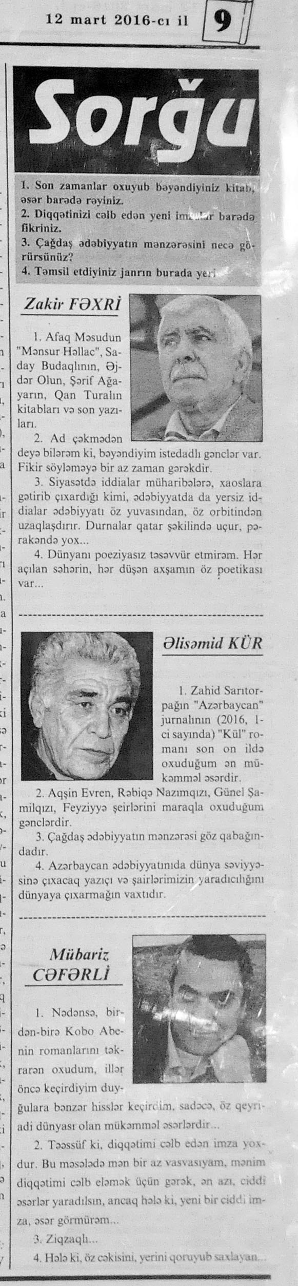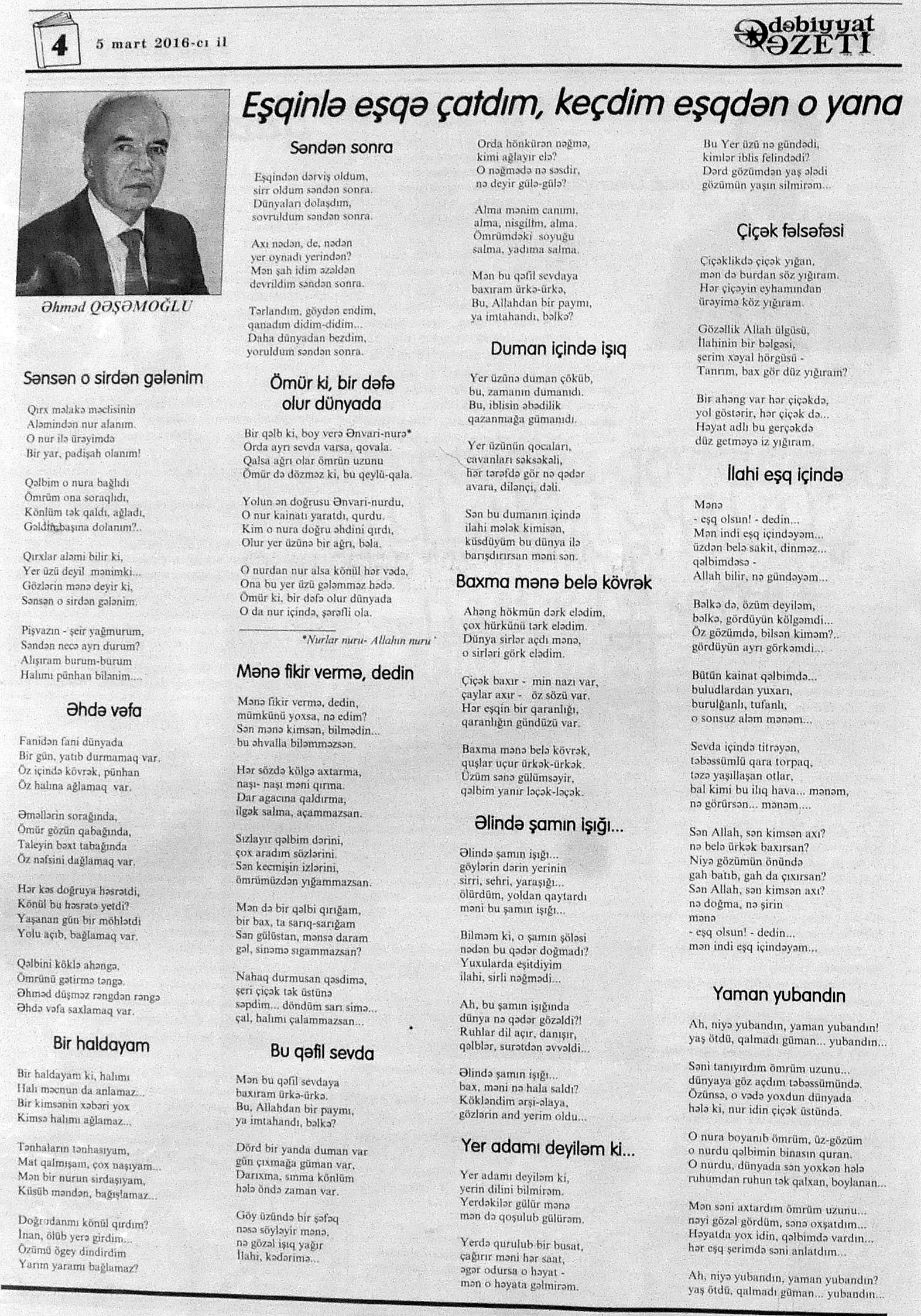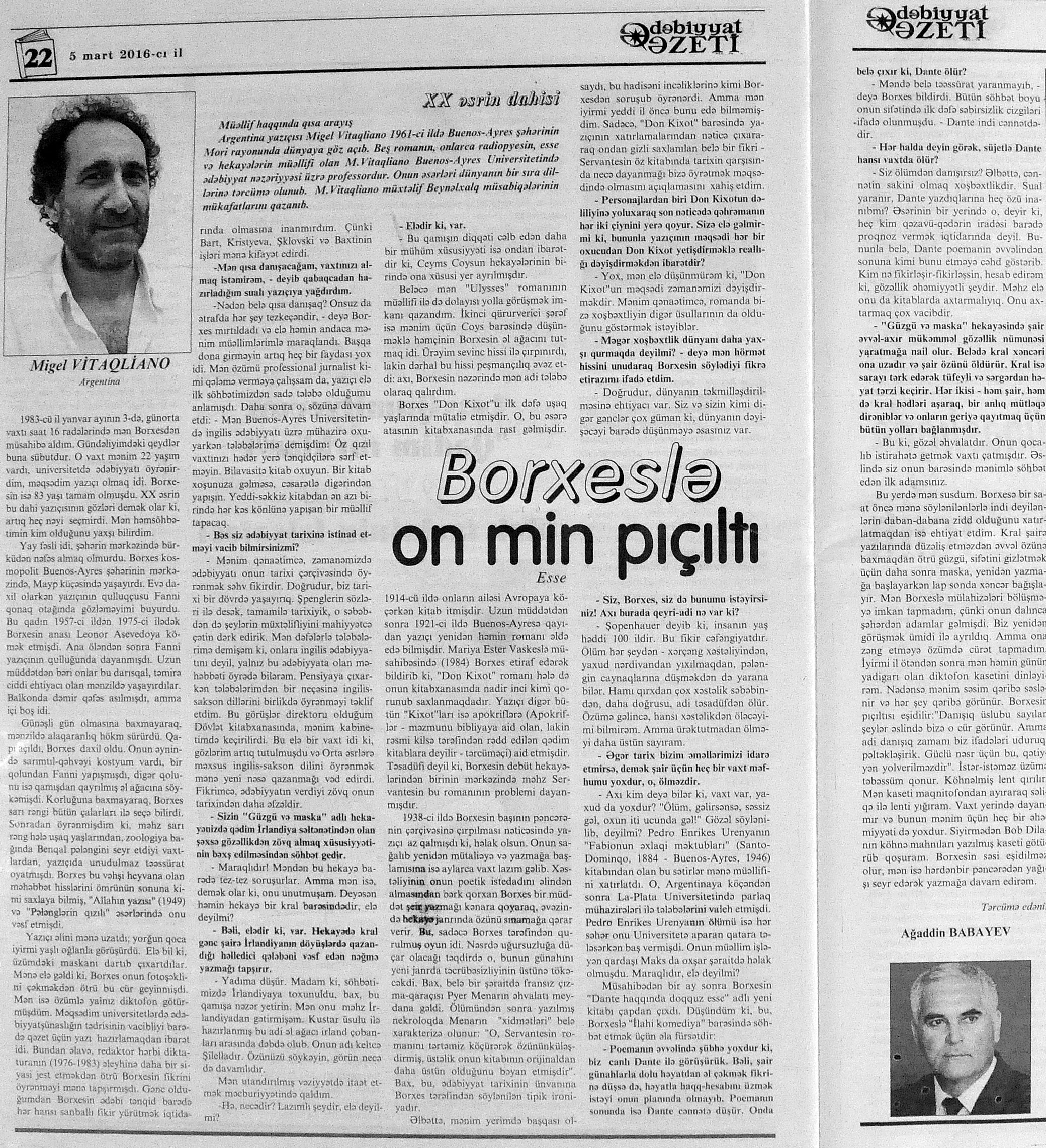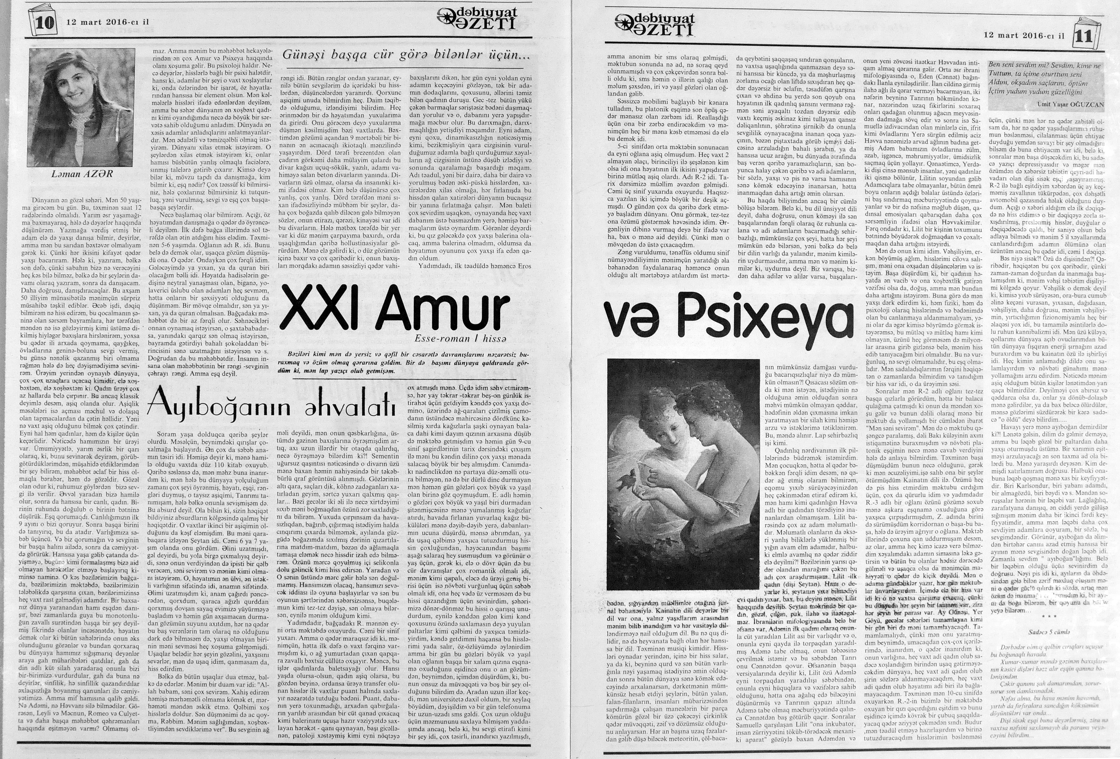 603. Azər, L. XXI Amur və Psixeya: Esse-roman: I hissə: Ayıboğanın əhvalatı //Ədəbiyyat qəzeti.- 2016.- 12 mart.- S.10-11. 604. İdrisoğlu, A. Allahqulunun əbədiyaşar əsəri: (Portret cizgiləri-esse) //Azad Azərbaycan.- 2016.- 11 mart.- S. 7. 605. Rəhimov, Ə. Qəribə adlar //Ədalət.- 2016.-11 mart.- S.4. 606. Vitaqliano, M. Borxeslə on min pıçıltı //Ədəbiyyat qəzeti.- 2016.- 5 mart.- S.22-23. 607. Yelinek, E. Mütaliə haqqında: [Avstriya ədəbiyyatından tərcümə]/tərc.etdi Ağaddin Babayev //Ədəbiyyat qəzeti.- 2016.- 12 mart.- S.9.