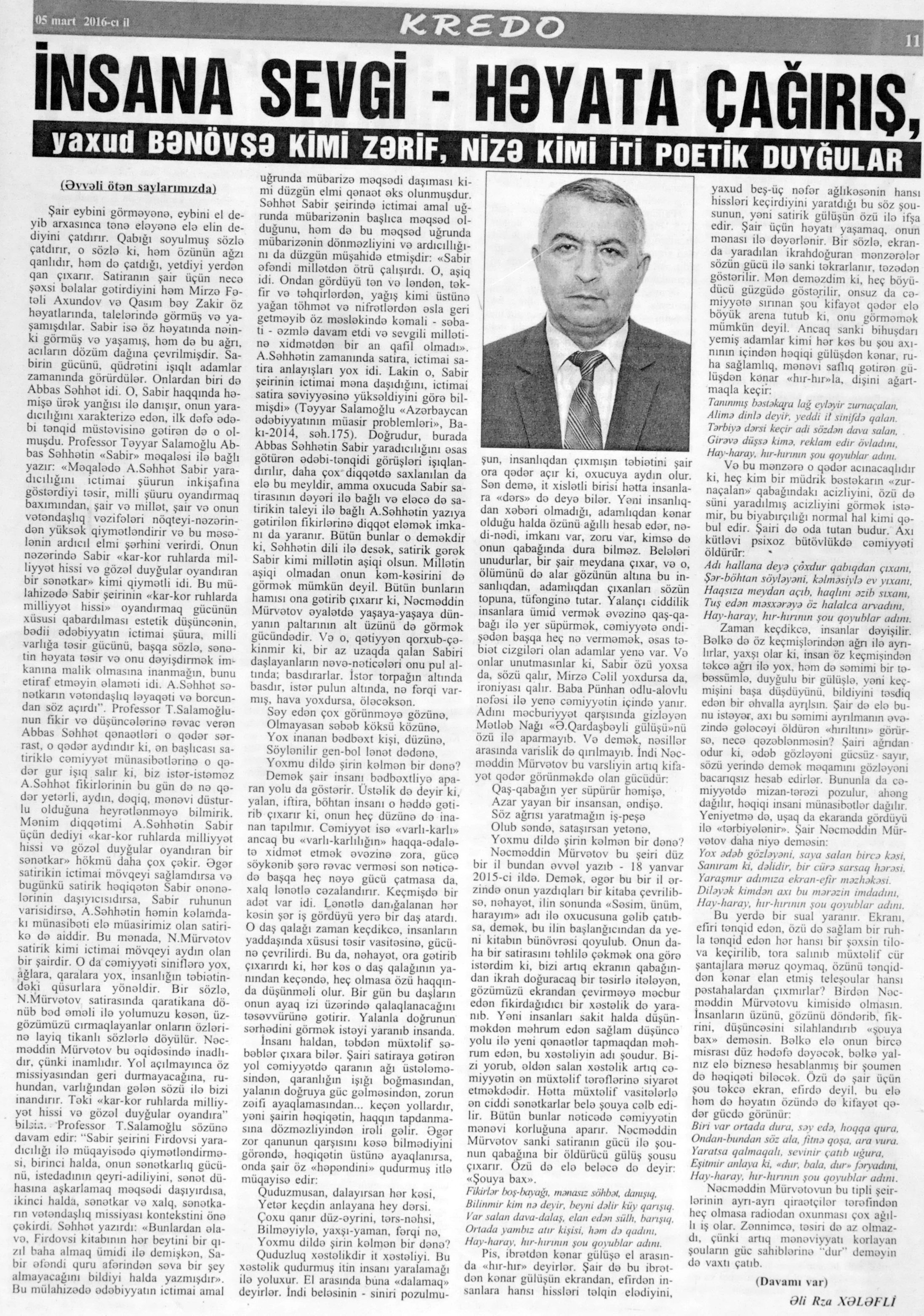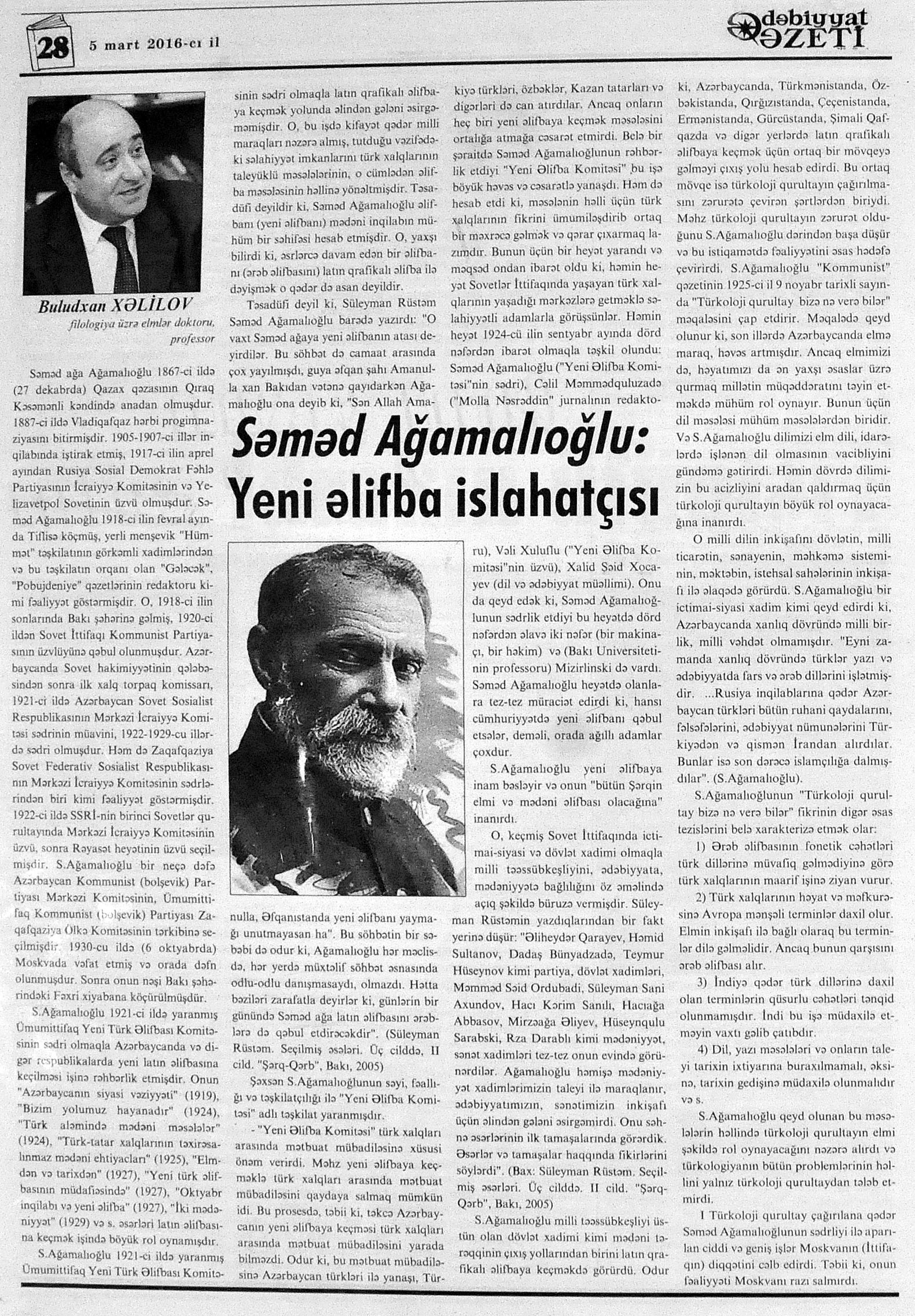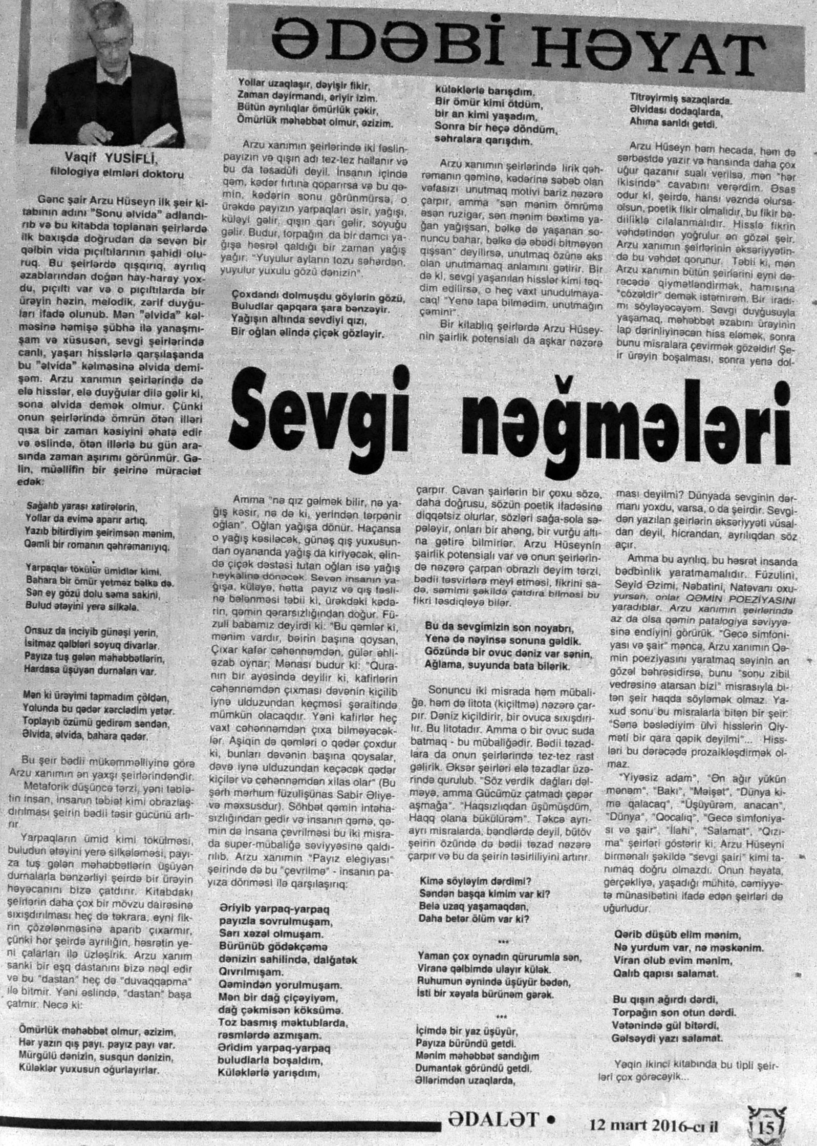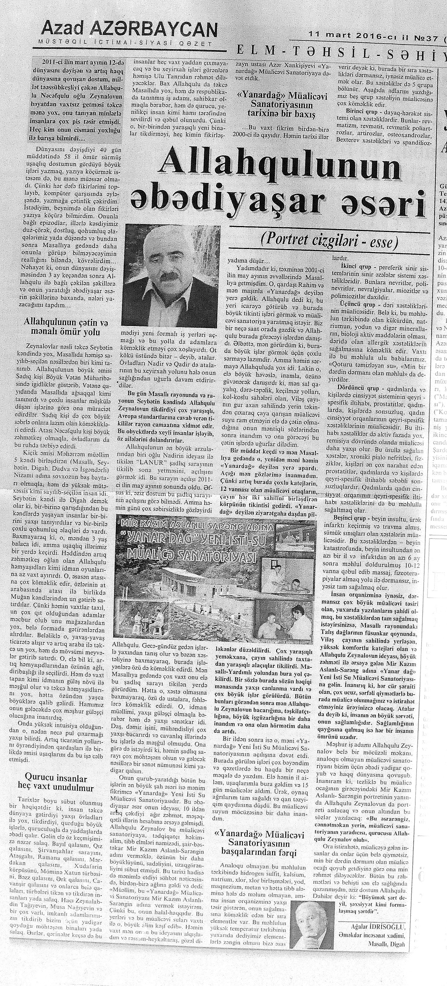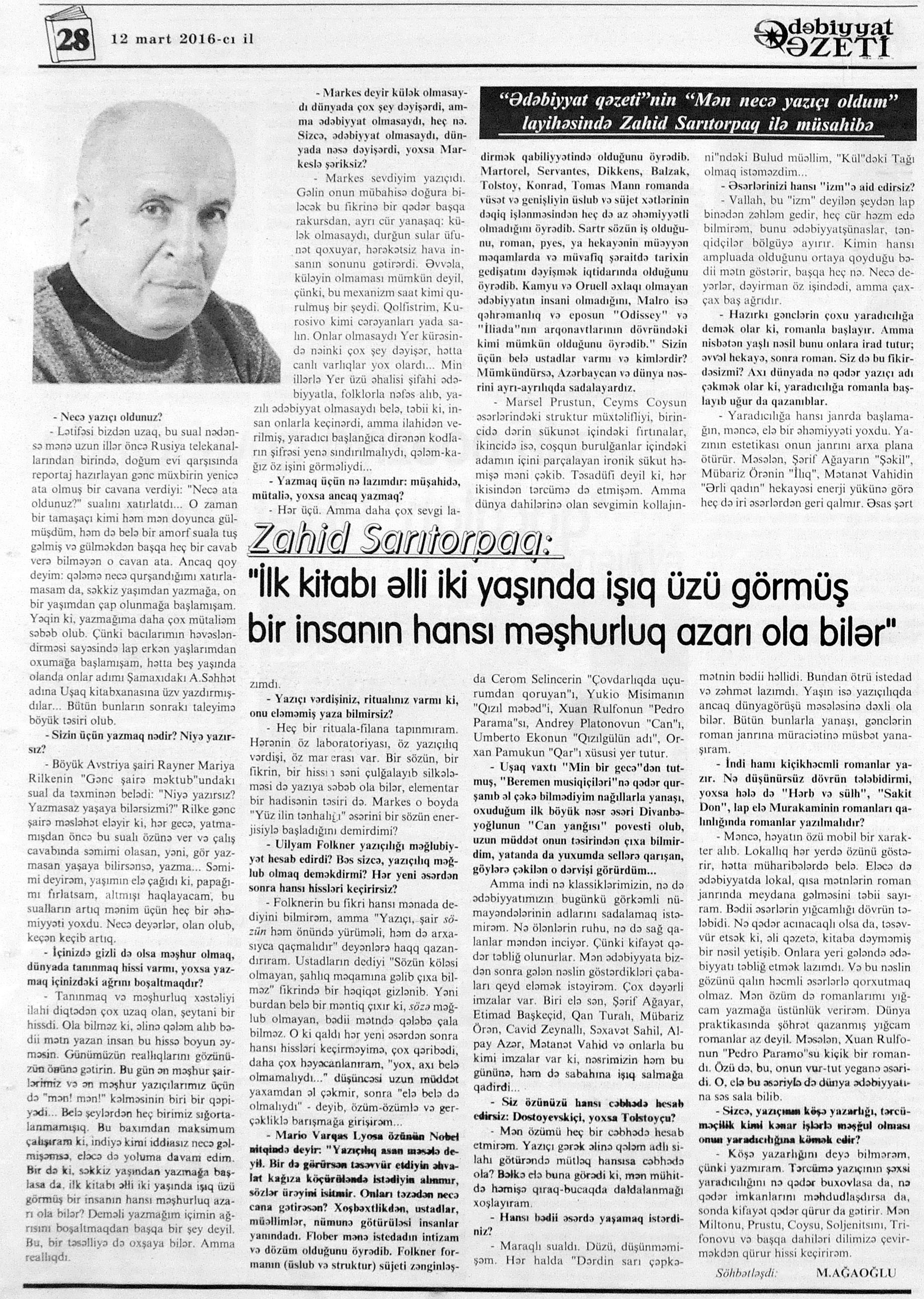 603. Azər, L. XXI Amur və Psixeya: Esse-roman: I hissə: Ayıboğanın əhvalatı //Ədəbiyyat qəzeti.- 2016.- 12 mart.- S.10-11. 604. İdrisoğlu, A. Allahqulunun əbədiyaşar əsəri: (Portret cizgiləri-esse) //Azad Azərbaycan.- 2016.- 11 mart.- S. 7. 605. Rəhimov, Ə. Qəribə adlar //Ədalət.- 2016.-11 mart.- S.4. 606. Vitaqliano, M. Borxeslə on min pıçıltı //Ədəbiyyat qəzeti.- 2016.- 5 mart.- S.22-23. 607. Yelinek, E. Mütaliə haqqında: [Avstriya ədəbiyyatından tərcümə]/tərc.etdi Ağaddin Babayev //Ədəbiyyat qəzeti.- 2016.- 12 mart.- S.9.