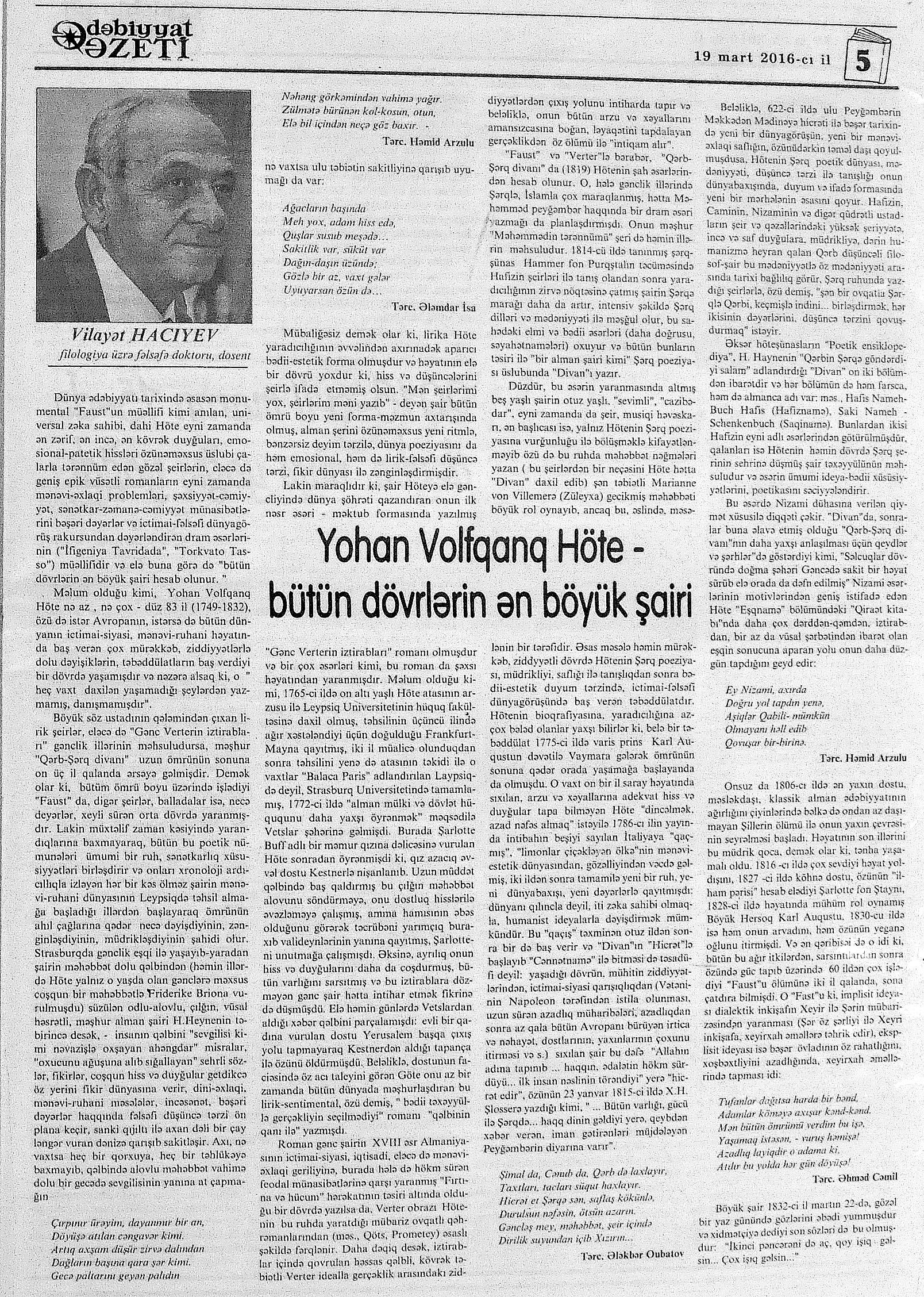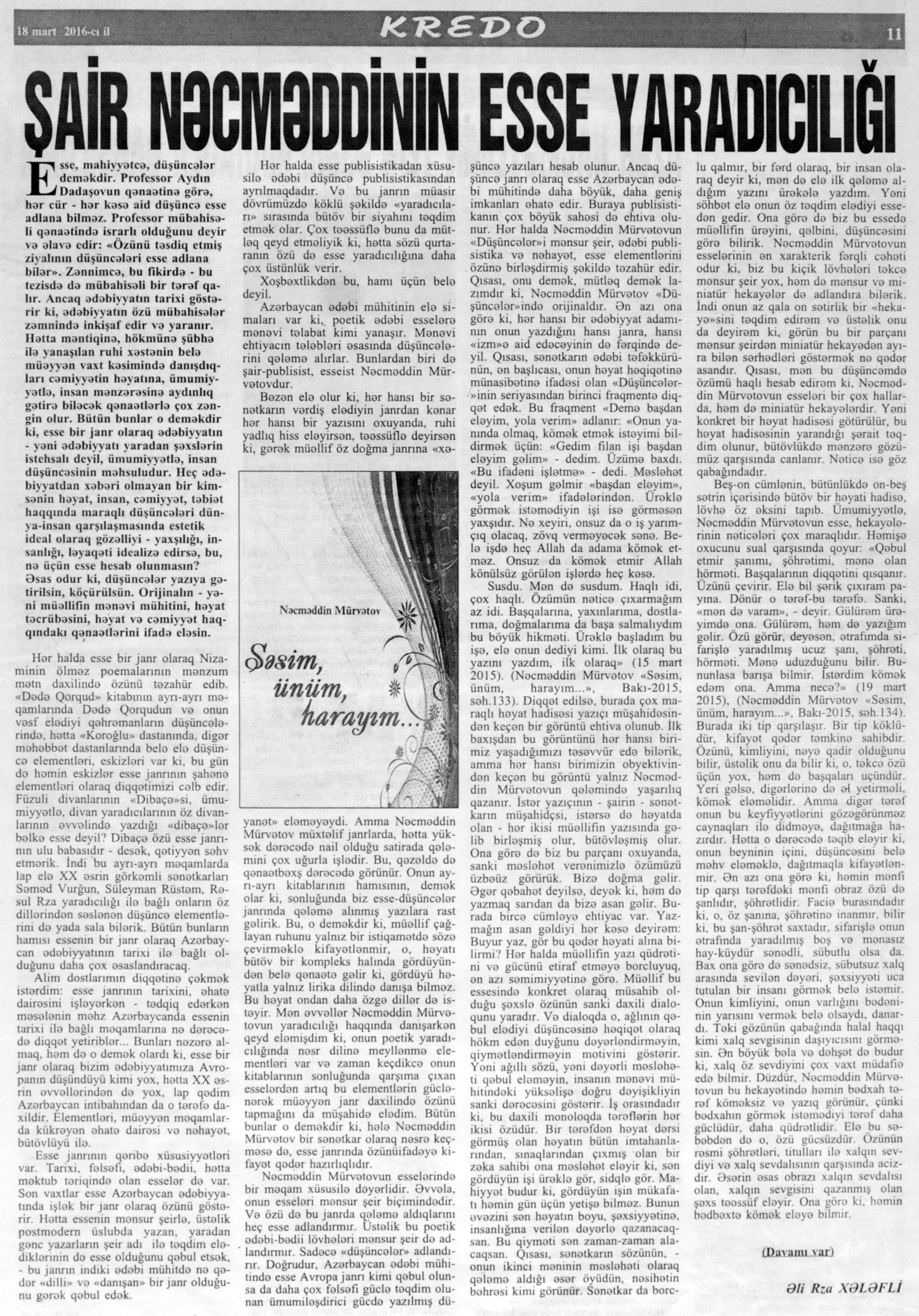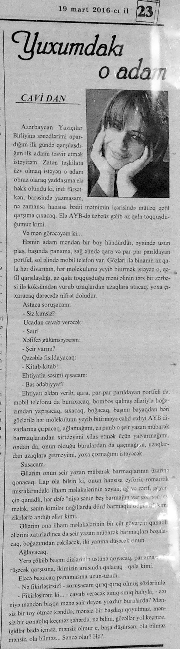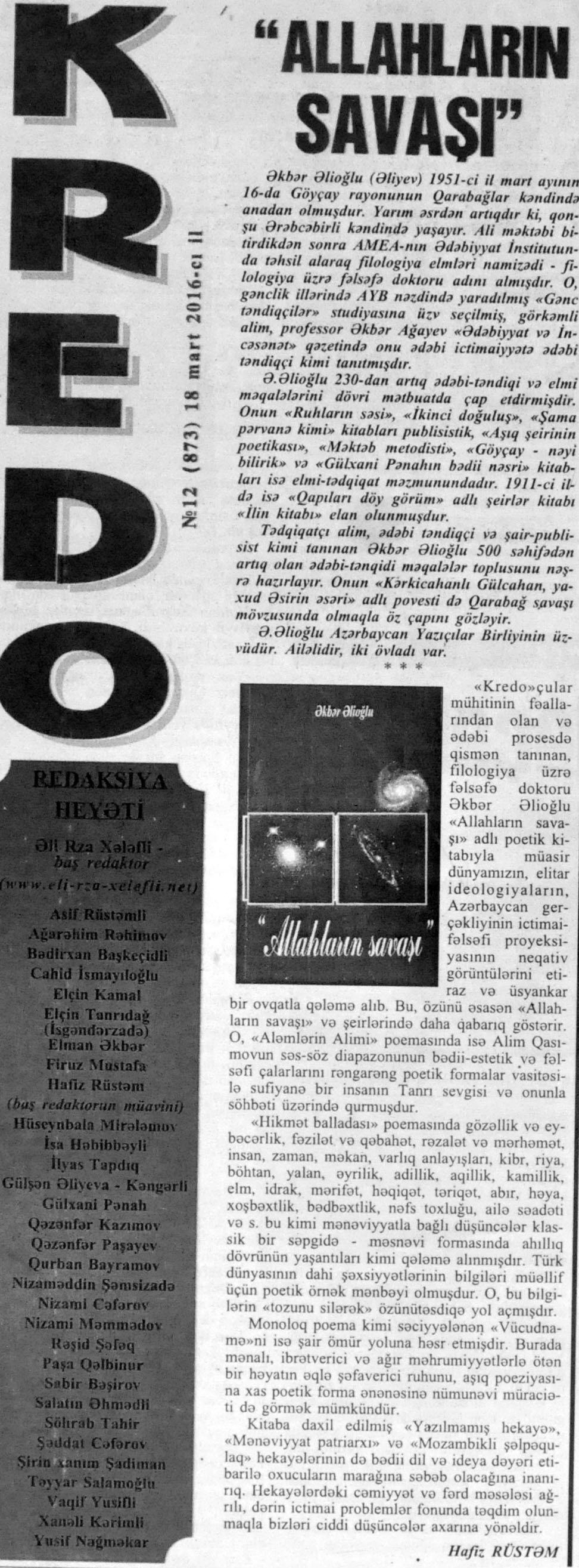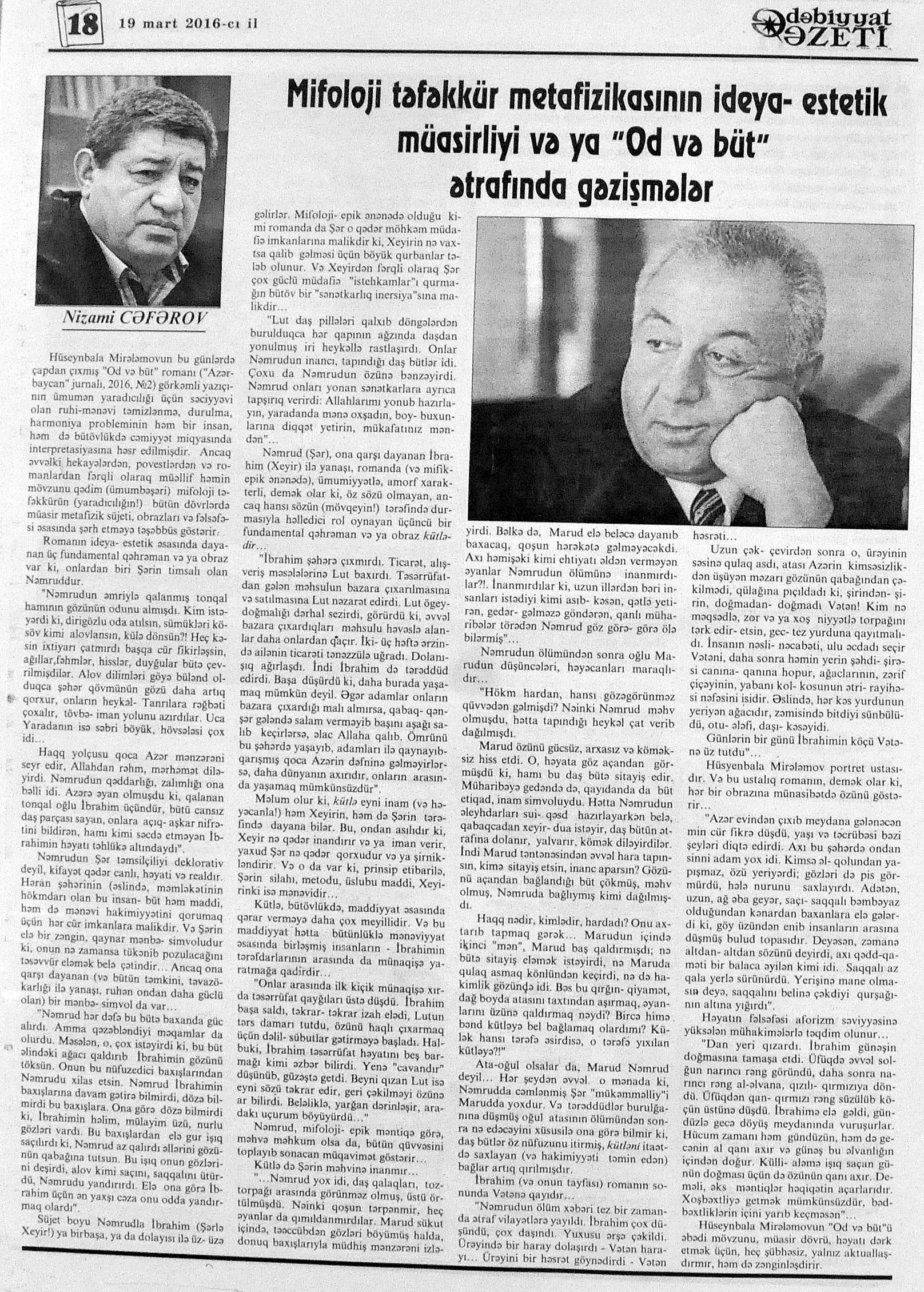 603. Azər, L. XXI Amur və Psixeya: Esse-roman: I hissə: Ayıboğanın əhvalatı //Ədəbiyyat qəzeti.- 2016.- 12 mart.- S.10-11. 604. İdrisoğlu, A. Allahqulunun əbədiyaşar əsəri: (Portret cizgiləri-esse) //Azad Azərbaycan.- 2016.- 11 mart.- S. 7. 605. Rəhimov, Ə. Qəribə adlar //Ədalət.- 2016.-11 mart.- S.4. 606. Vitaqliano, M. Borxeslə on min pıçıltı //Ədəbiyyat qəzeti.- 2016.- 5 mart.- S.22-23. 607. Yelinek, E. Mütaliə haqqında: [Avstriya ədəbiyyatından tərcümə]/tərc.etdi Ağaddin Babayev //Ədəbiyyat qəzeti.- 2016.- 12 mart.- S.9.