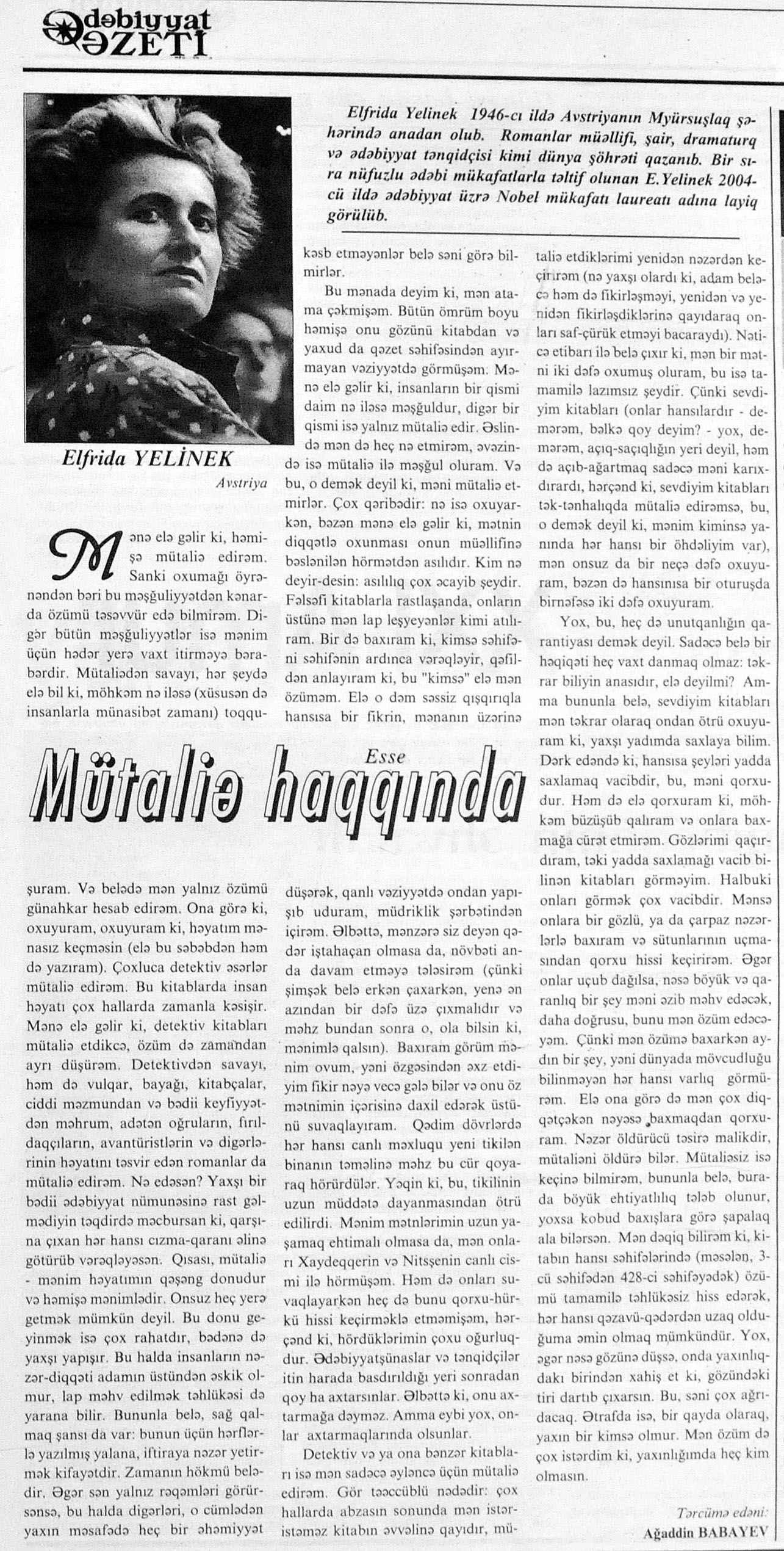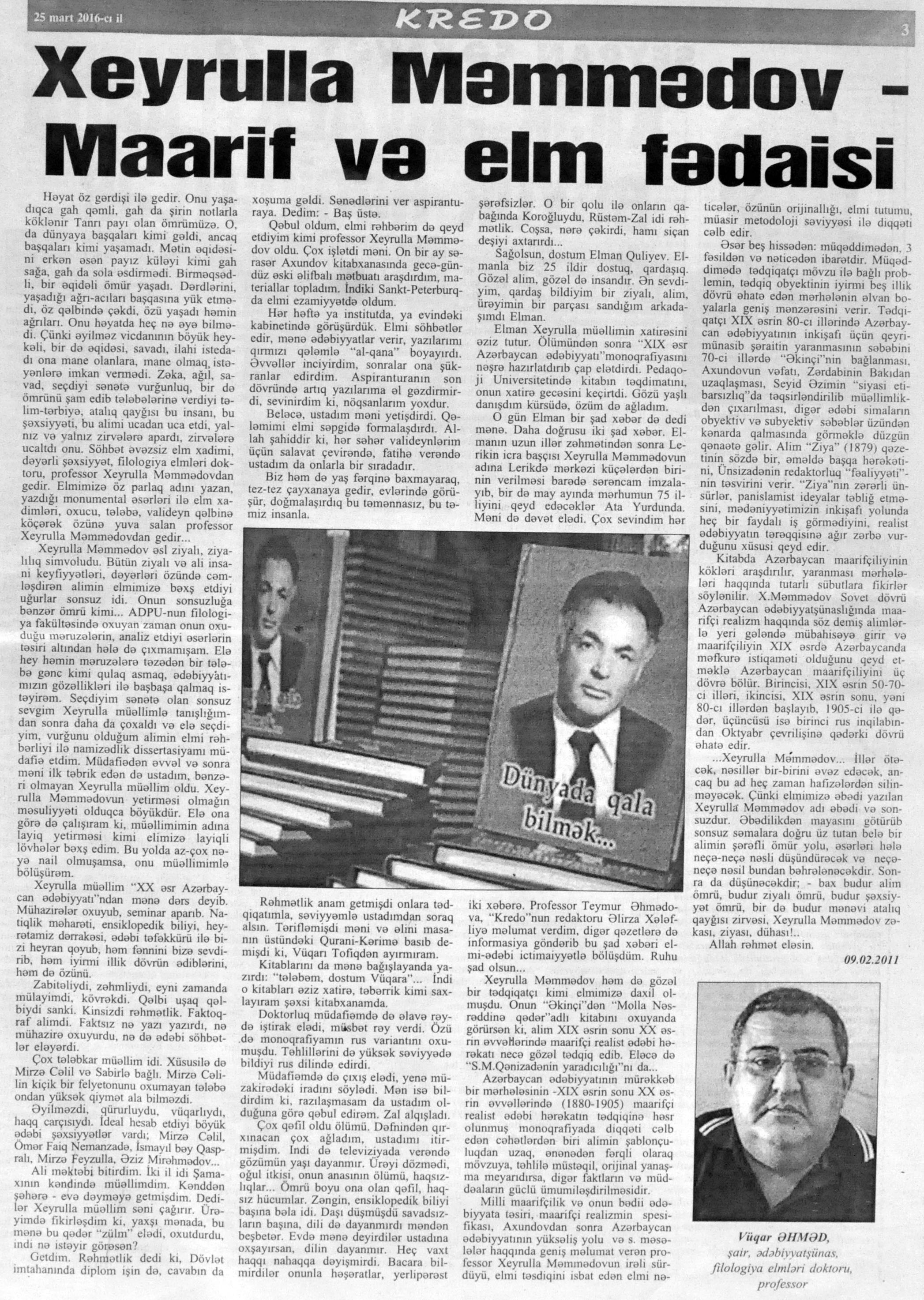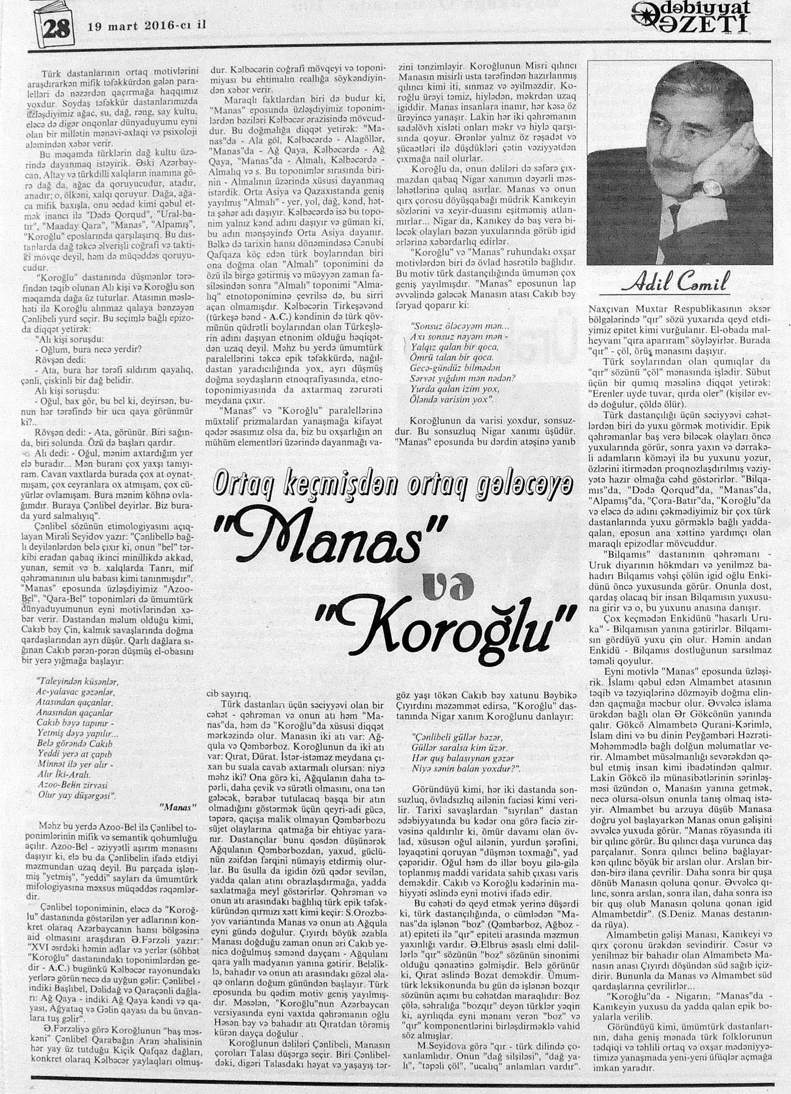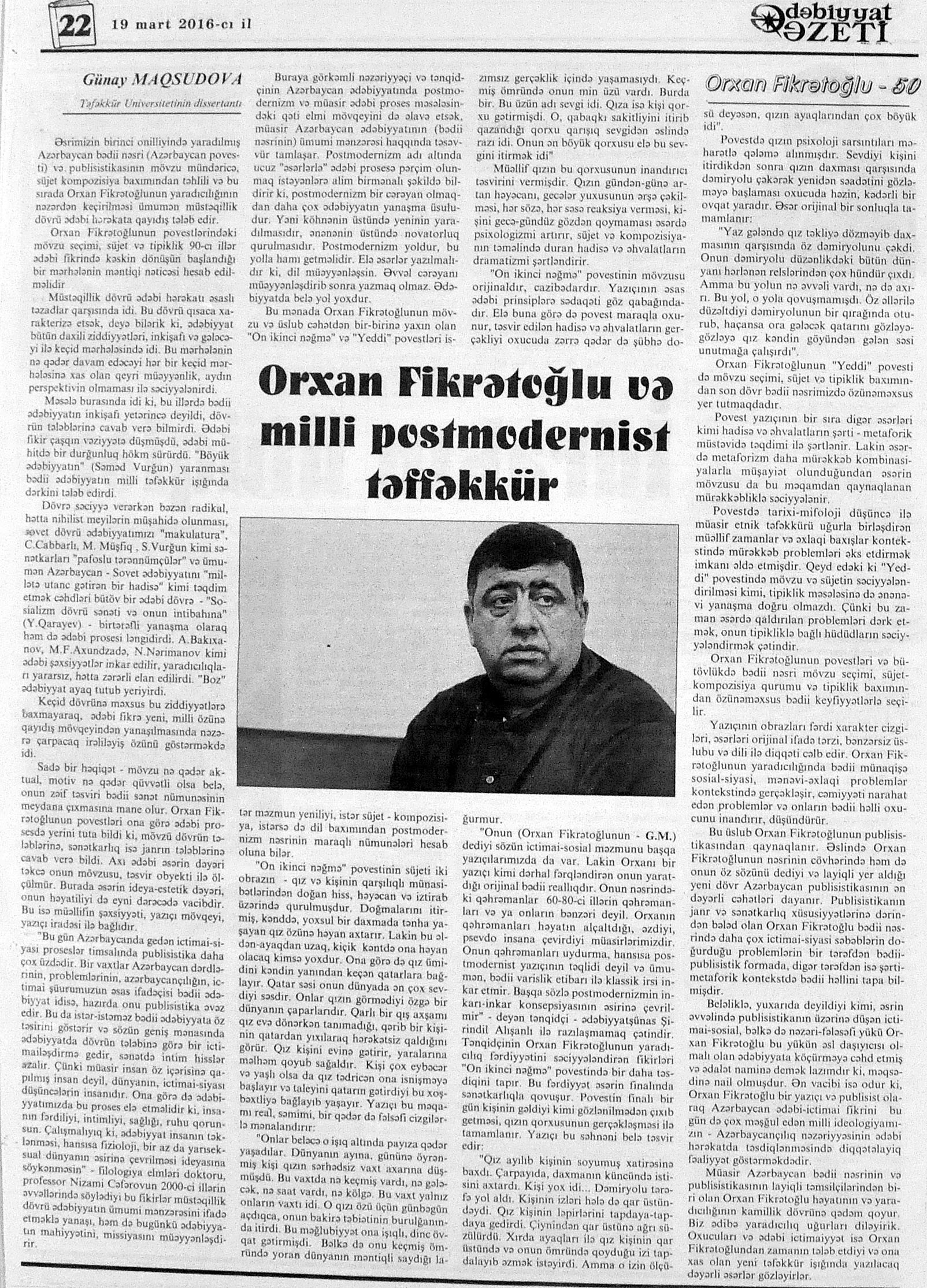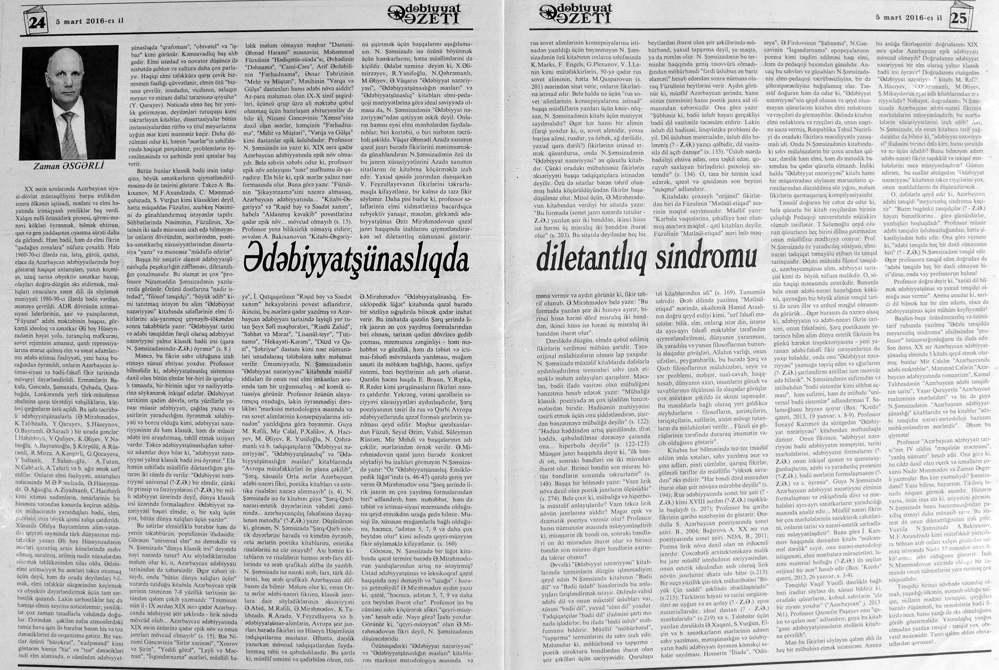 603. Azər, L. XXI Amur və Psixeya: Esse-roman: I hissə: Ayıboğanın əhvalatı //Ədəbiyyat qəzeti.- 2016.- 12 mart.- S.10-11. 604. İdrisoğlu, A. Allahqulunun əbədiyaşar əsəri: (Portret cizgiləri-esse) //Azad Azərbaycan.- 2016.- 11 mart.- S. 7. 605. Rəhimov, Ə. Qəribə adlar //Ədalət.- 2016.-11 mart.- S.4. 606. Vitaqliano, M. Borxeslə on min pıçıltı //Ədəbiyyat qəzeti.- 2016.- 5 mart.- S.22-23. 607. Yelinek, E. Mütaliə haqqında: [Avstriya ədəbiyyatından tərcümə]/tərc.etdi Ağaddin Babayev //Ədəbiyyat qəzeti.- 2016.- 12 mart.- S.9.