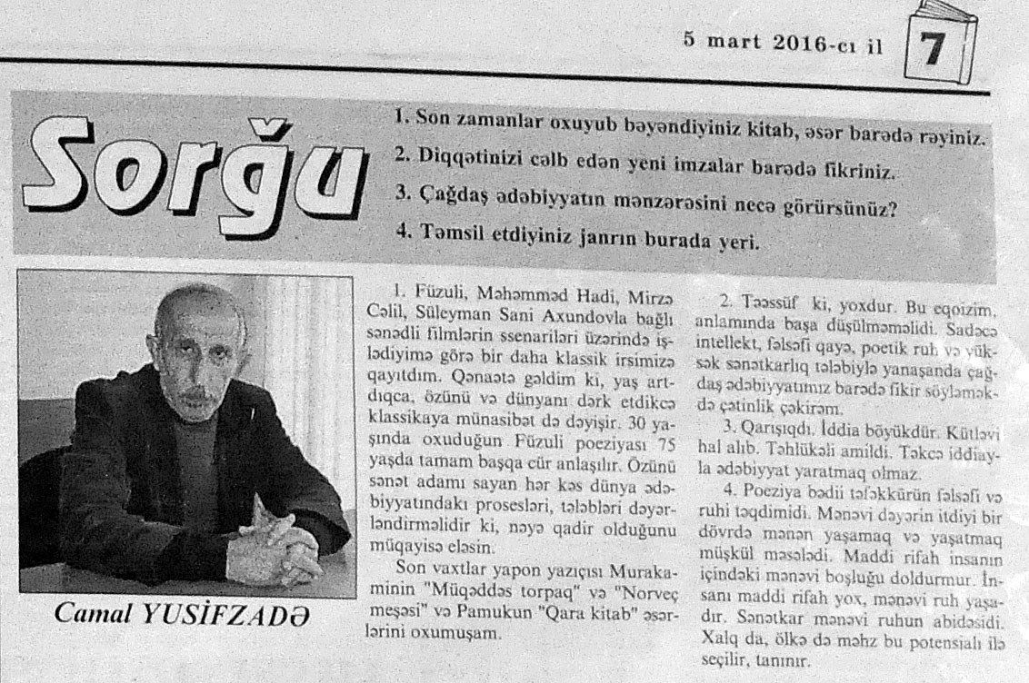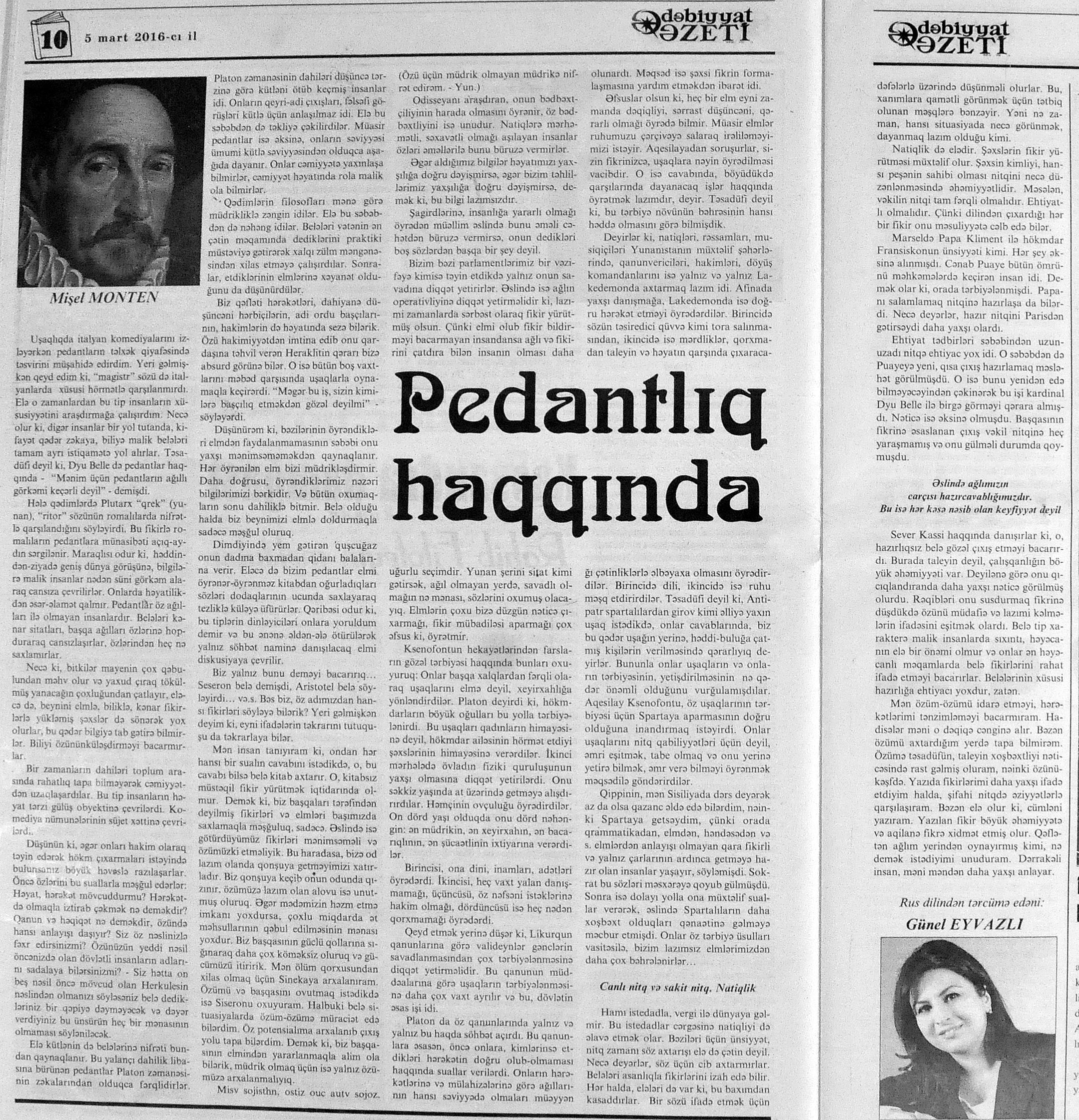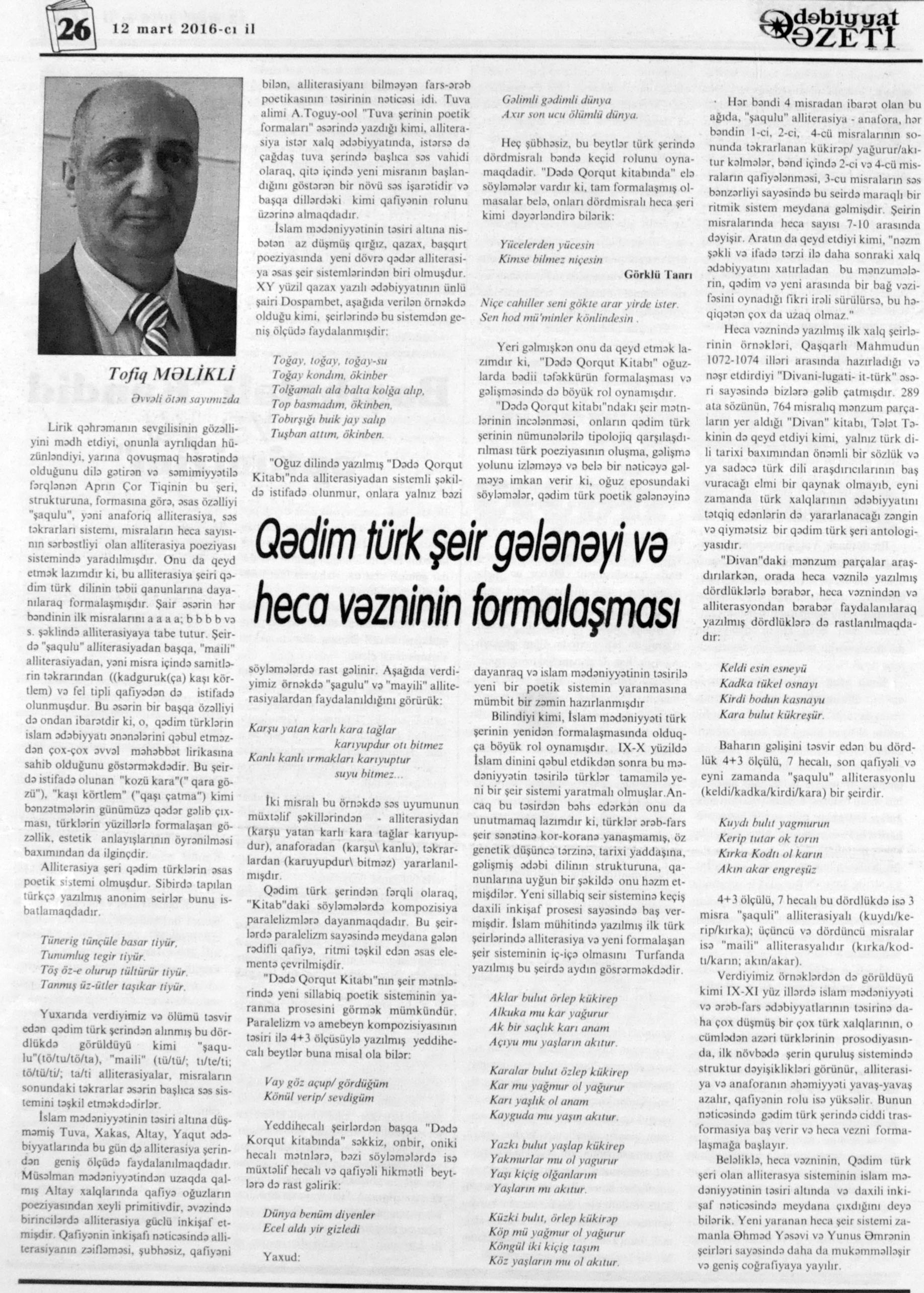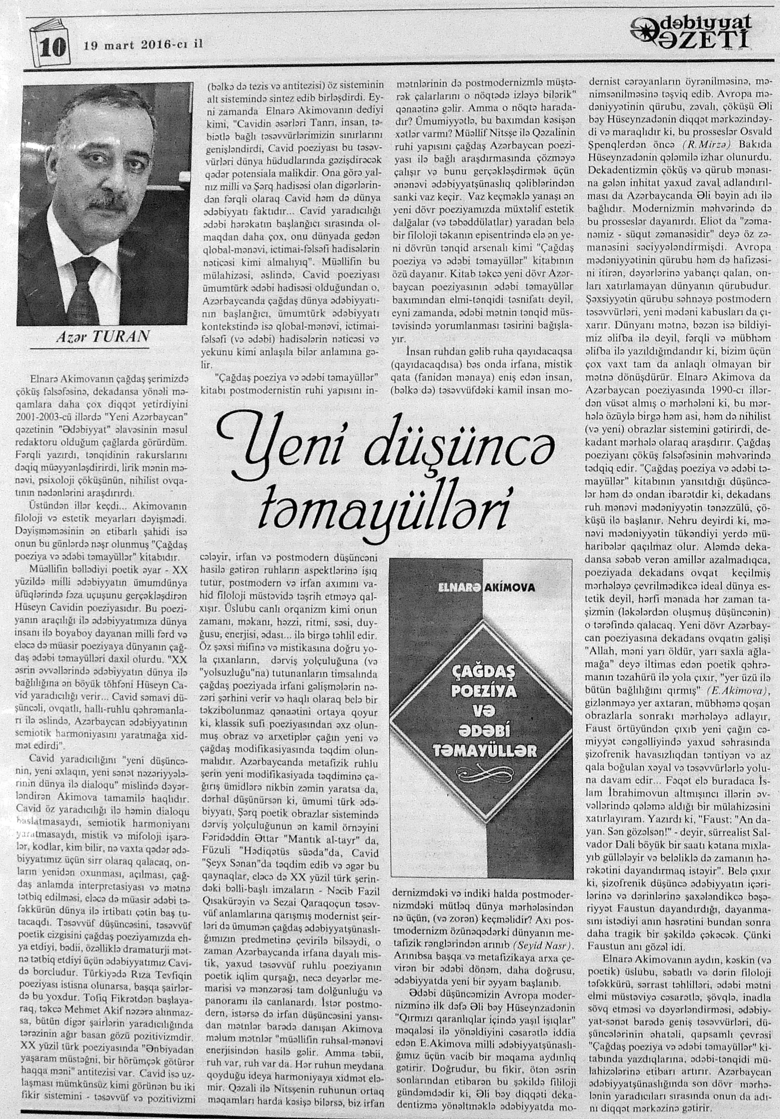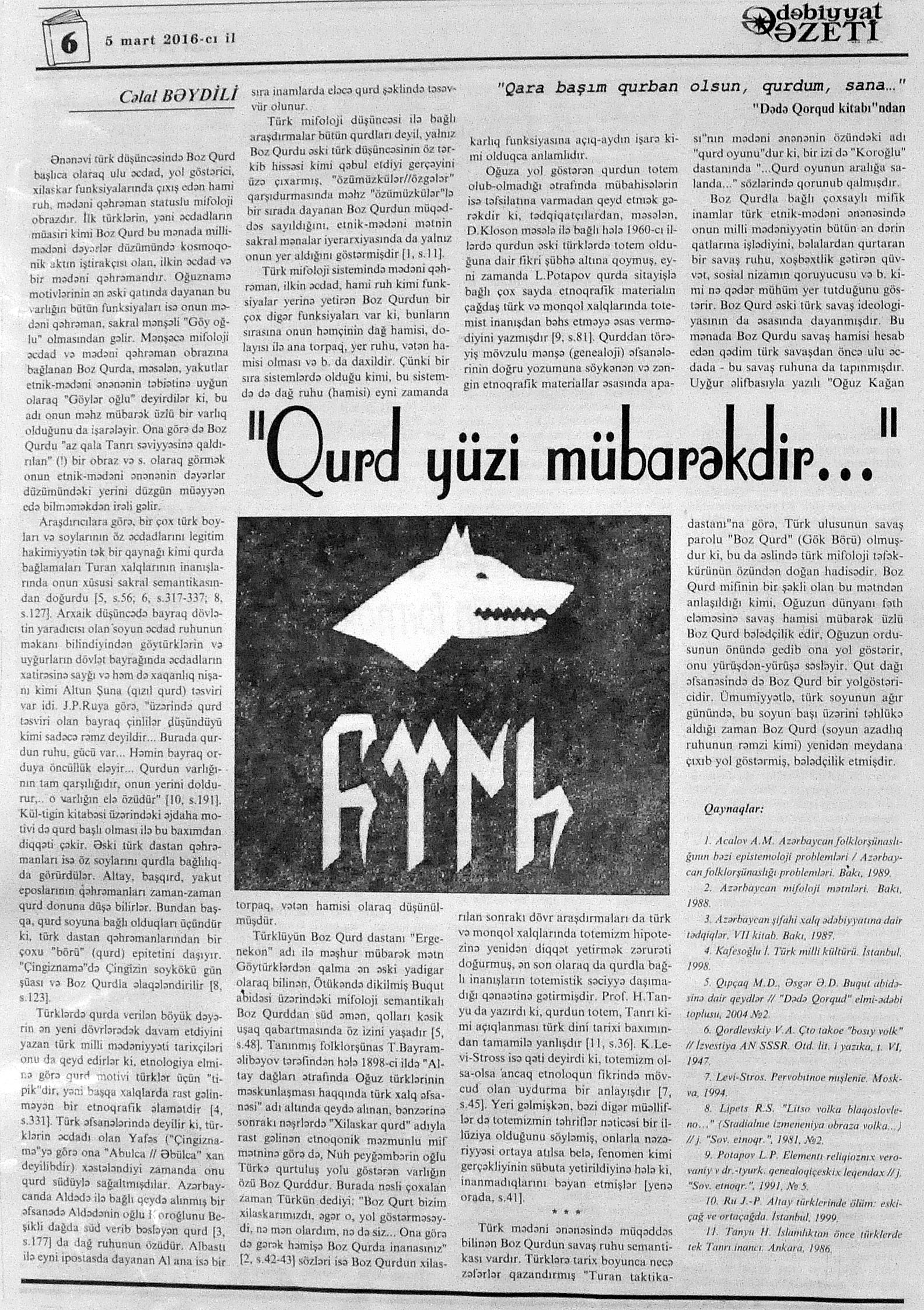 603. Azər, L. XXI Amur və Psixeya: Esse-roman: I hissə: Ayıboğanın əhvalatı //Ədəbiyyat qəzeti.- 2016.- 12 mart.- S.10-11. 604. İdrisoğlu, A. Allahqulunun əbədiyaşar əsəri: (Portret cizgiləri-esse) //Azad Azərbaycan.- 2016.- 11 mart.- S. 7. 605. Rəhimov, Ə. Qəribə adlar //Ədalət.- 2016.-11 mart.- S.4. 606. Vitaqliano, M. Borxeslə on min pıçıltı //Ədəbiyyat qəzeti.- 2016.- 5 mart.- S.22-23. 607. Yelinek, E. Mütaliə haqqında: [Avstriya ədəbiyyatından tərcümə]/tərc.etdi Ağaddin Babayev //Ədəbiyyat qəzeti.- 2016.- 12 mart.- S.9.