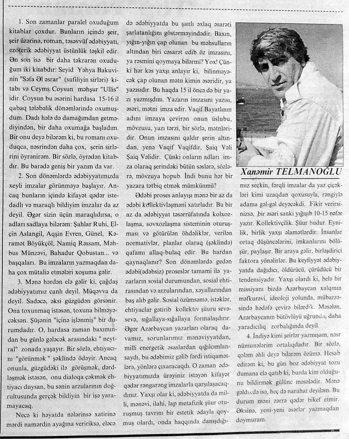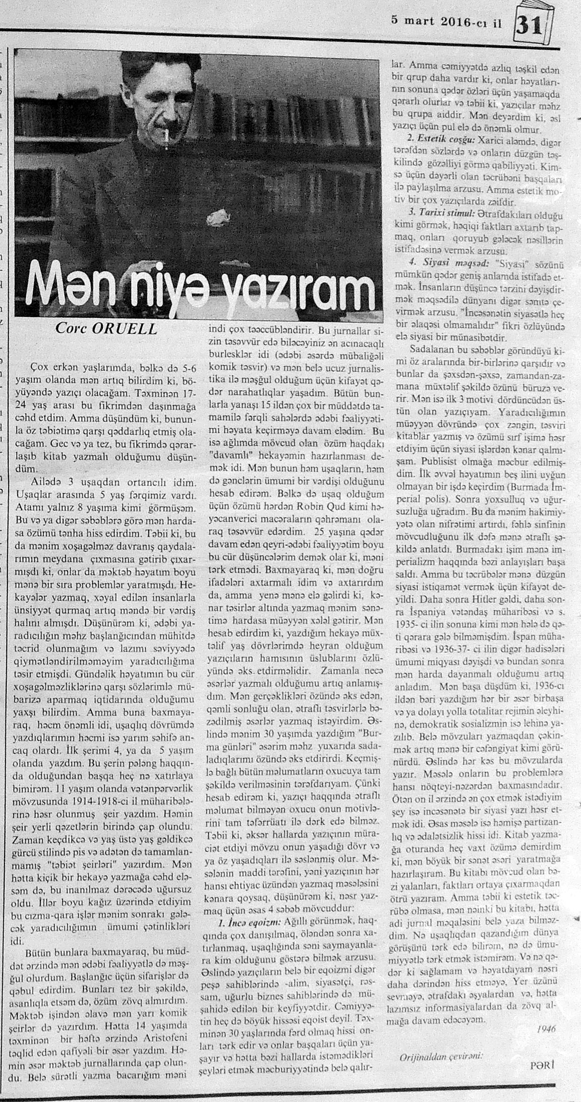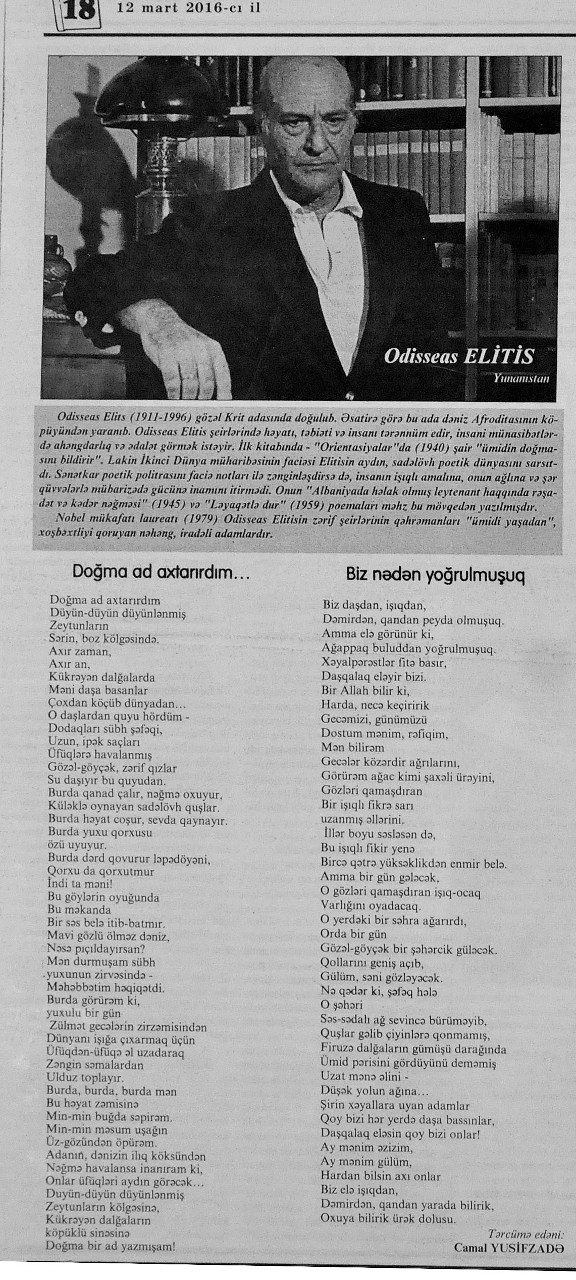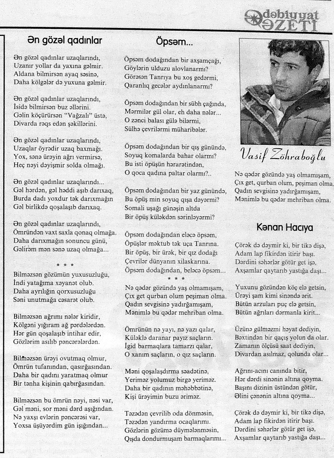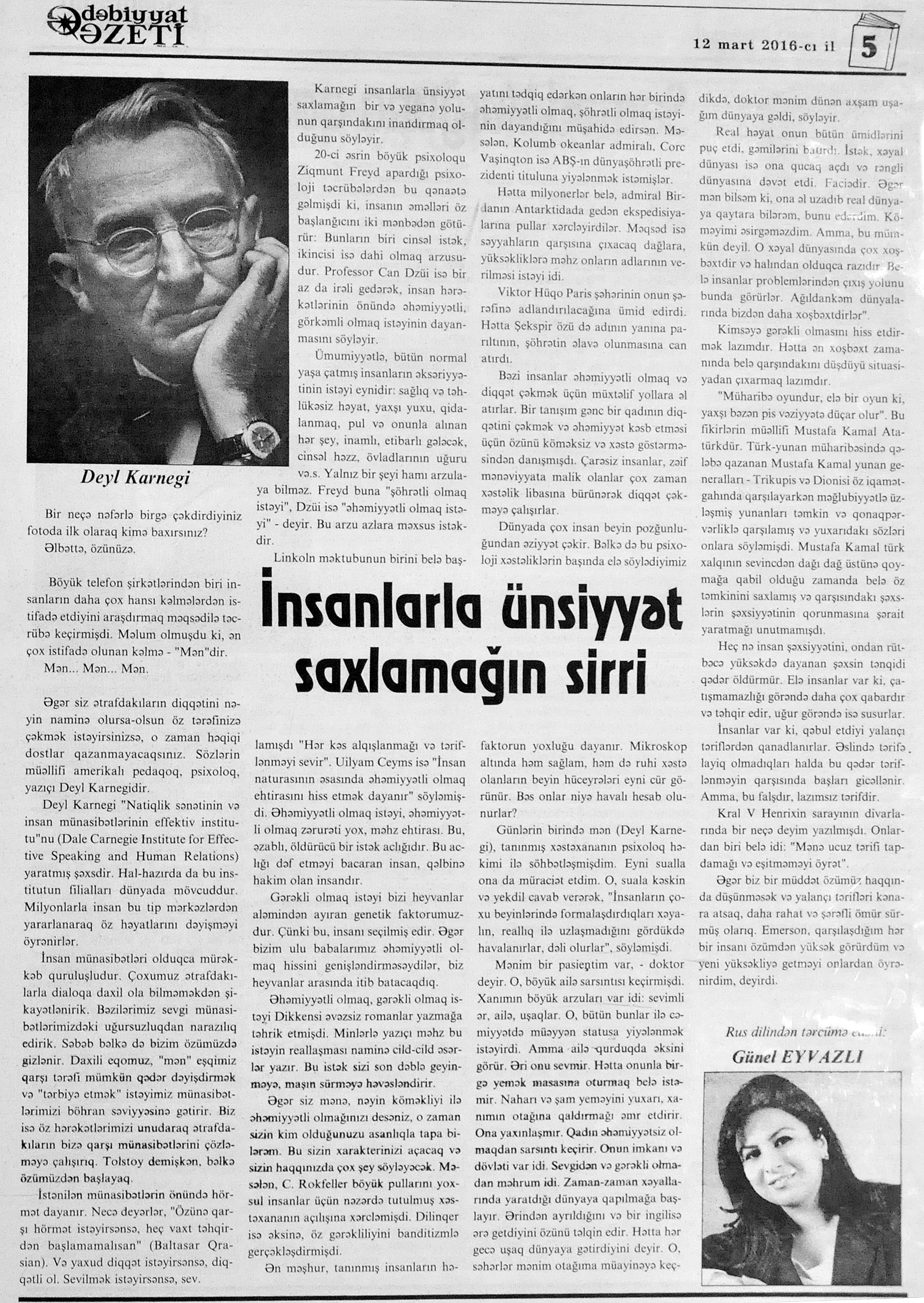 603. Azər, L. XXI Amur və Psixeya: Esse-roman: I hissə: Ayıboğanın əhvalatı //Ədəbiyyat qəzeti.- 2016.- 12 mart.- S.10-11. 604. İdrisoğlu, A. Allahqulunun əbədiyaşar əsəri: (Portret cizgiləri-esse) //Azad Azərbaycan.- 2016.- 11 mart.- S. 7. 605. Rəhimov, Ə. Qəribə adlar //Ədalət.- 2016.-11 mart.- S.4. 606. Vitaqliano, M. Borxeslə on min pıçıltı //Ədəbiyyat qəzeti.- 2016.- 5 mart.- S.22-23. 607. Yelinek, E. Mütaliə haqqında: [Avstriya ədəbiyyatından tərcümə]/tərc.etdi Ağaddin Babayev //Ədəbiyyat qəzeti.- 2016.- 12 mart.- S.9.