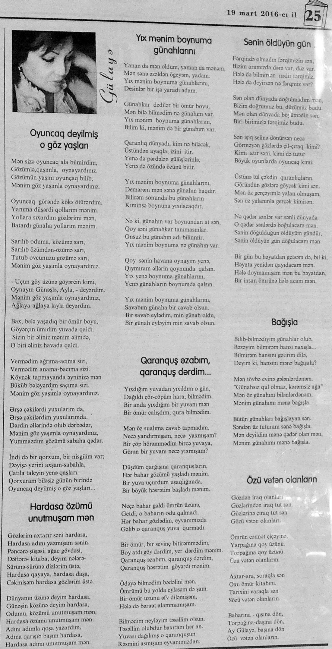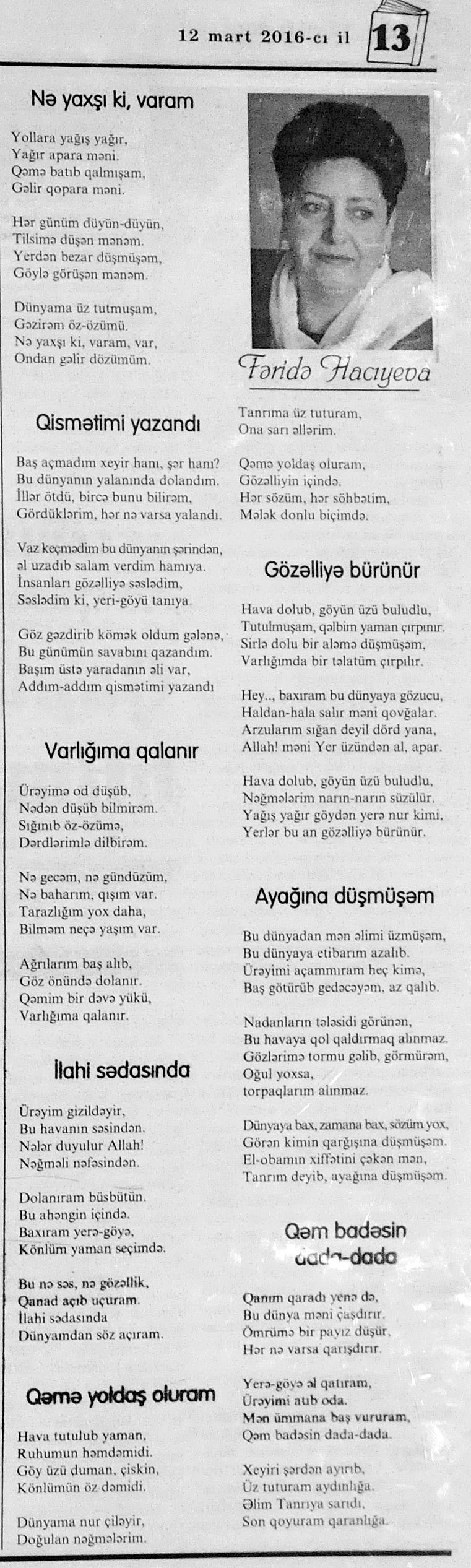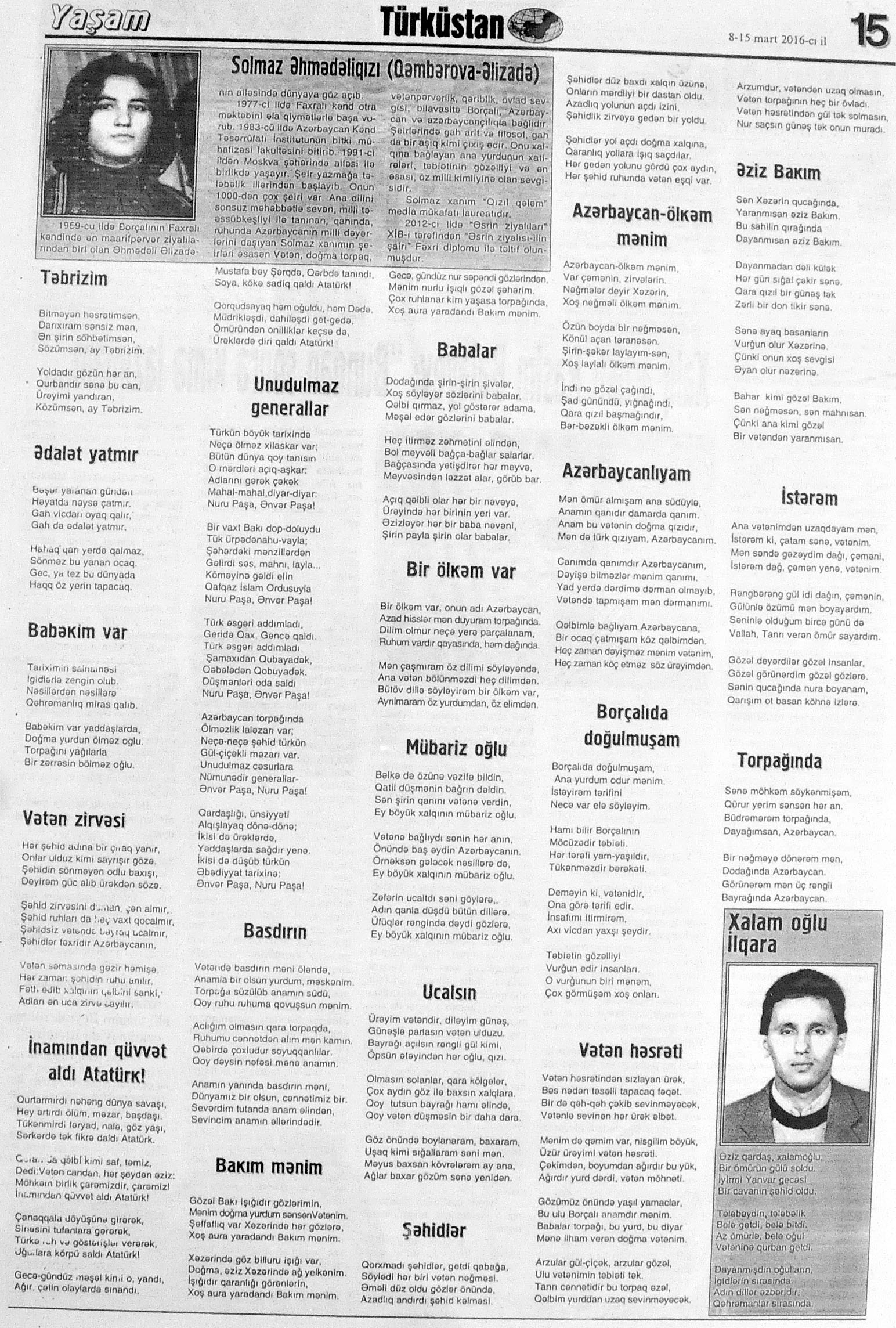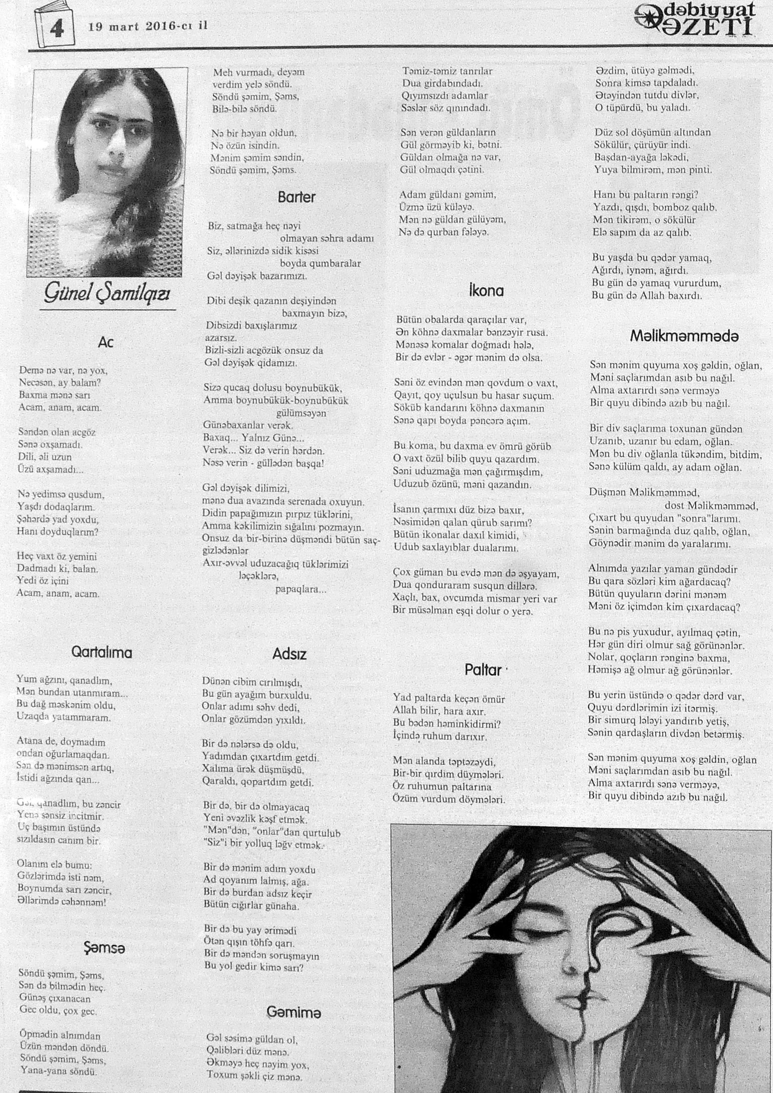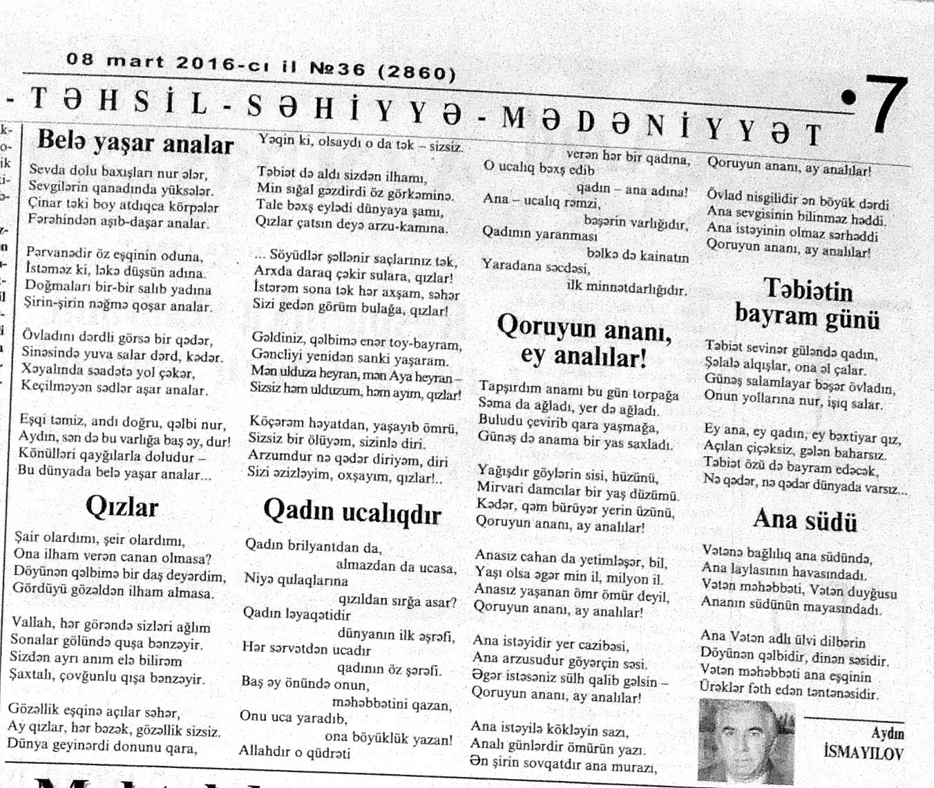 541. Abbasov, V. Unutmayın oğullar; İlahi; Demərəm; İnsanlar //Azad Azərbaycan.- 2016.- 5 mart.- S.7. 542. Alovlu, İ. Əbədi şəhidlər, canlı şəhidlər!; Zəlimxan; Böyük şairin ad gününə ithaf; Asimanımdı //Azad Azərbaycan.- 2016.- 18 mart. - S.7. 543. Aslanxanlı, M. Ömür - yuxu...; Unudularmı...; İnam olsa... və s. //525-ci qəzet.- 2016.- 10 mart.- S.7. 544. Dərviş, B. Qarabağ müşkülünə dair siyasi xəttimizə; “Şiroko” //Təzadlar.- 2016.- 8 mart.- S.15. 545. Eldar, G. İstərəm; Aşıq Pəri inciləri //Təzadlar.- 2016.- 1 mart.- S.15. 546. Elitis, O. Doğma ad axtarırdım...; Biz nədən yoğrulmuşuq: [yunan ədəbiyyatından tərcümə] /tərc. etdi Camal Yusifzadə //Ədəbiyyat qəzeti.- 2016.- 12 mart.- S.18. 547. Əfşan, M. Gömrükdədi //Təzadlar.- 2016.- 1 mart.- S.11. 548. Əhmədəliqızı, S. Təbrizim; Ədalət yatmır; Babəkim var və s. //Türküstan.- 2016.- 8-15 mart.- S.15. 549. Əliyar, A. Məni; Unudulmuş qadındır dəniz...; Bir ağ kağıza yazacam adını... və s. //Ədalət.- 2016.- 12 mart.- S.13. 550. Əsədullaqızı, M. Göy qurşağı: Səmanın al günəşi; Döyəcəm qapını; Bu həyat yolunda //525-ci qəzet.- 2016.- 1 mart.- S.7. 551. Göybulud, Z. İstərəm ki, bir görsün; Məhmət Akifə; Könüldür xülasəsi: [Türkiyə ədəbiyyatından tərcümə] /tərc.etdi İbrahim İlyaslı //Türküstan.- 2016.- 29 mart.-5 aprel.- S.15. 552. Gülayə. Oyuncaq deyilmiş o göz yaşları; Hardasa özümü unutmuşam mən; Yıx mənim boynuma günahlarını və s. //Ədəbiyyat qəzeti.- 2016.- 19 mart.- S.25. 553. Hacısoy, F. Novruz bayramınız mübarək olsun: (Aşıqsayağı) //Azad Azərbaycan.- 2016.- 18 mart. - S.7. 554. Hacısoy, H. Hər şeyin öz mahiyyəti; Necədi; Ruh, nəfs...və s. //525-ci qəzet.- 2016. -19 mart. - S. 23. 555. Hacıyeva, F. Nə yaxşı ki, varam; Qismətimi yazandı; Varlığıma qalanır və s. //Ədəbiyyat qəzeti.- 2016.- 12 mart.- S.13. 556. Həsrət, Ə. Qərib ayaq izləri; Yolum düşdü doğma yurda; Səni sevib bağışladım və s. //Kaspi.- 2016.- 5-7 mart.- S.22. 557. Xələfli, Ə. İncimək olmasın... //Kredo.- 2016.- 25 mart.- S.16. 558. Xələfli, Ə. Söz qəlbimin səsidir, ruhumun nəfəsidir //Kredo.- 2016.- 18 mart.- S.8-9. 559. Xələfli, Ə. Şair Nəcməddinin esse yaradıcılığı: [Nəcməddin Mürvətovun “Səsim ünüm, harayım” kitabı haqqında] //Kredo.- 2016.- 18 mart.- S.11. 560. Xəlilov, M. Səni; Mənlə //Təzadlar.- 2016.- 1 mart.- S.15. 561. İmanzadə, İ. Gəldim görüşünə (Anam Ruqiyyə Bəşir qızının əziz xatirəsinə); Acı söz; İlk sevgi və s. //Ədalət.- 2016.- 12 mart.- S.22. 562. İnsan, cəmiyyət və zaman münasibətlərindən bəhs edən yeni kitab: [şair-publisist Hikmət Məlikzadənin “Mənzərə Sadıqovanın yaradıcılığında insan-cəmiyyət-zaman münasibətləri” kitabı haqqında] //Azərbaycan.- 2016.- 29 mart.- S.7. 563. İsmayılov, A. Belə yaşar analar; Qızlar; Qadın ucalıqdır və s. //Azad Azərbaycan.- 2016.- 8 mart.- S.7. 564. İsmayılov, A. Yaz gəlib, ay ellər! //Azad Azərbaycan.- 2016.- 15 mart.- S.7. 565. İşıq, S. Həsrət; Səhəri açıram gülüşlərinlə...; Bu gün də xətrimə dəydi, ay ana //Kaspi.- 2016.- 19-28 mart.- S.23. 566. Kərim, Ə. Sevmirsən; Qadın; Bu saat və s. //Kaspi.- 2016.- 19-28 mart.- S.23. 567. Qarabulaq, H. Ana torpaq, sənin gücün sirillah: Hardan, nə cür; Əsas borc; Arxayınam və s. //Kredo.- 2016.- 11 mart.- S.8. 568. Qaratorpaq, S. Yadımdan çıxır daha...; Necə girdin ürəyimə...; Bilmirəm nə deyim sənə bu yaşda və s.//Kaspi.- 2016.- 5-7 mart.- S.23. 569. Qəşəmoğlu, Ə. Sənsən o sirdən gələnim; Əhdə vəfa; Bir haldayam və s. //Ədəbiyyat qəzeti.- 2016.- 5 mart.- S.4. 570. Qoca, F. Analar, xanımlar, mələklər, bayramınız mübarək! //525-ci qəzet.- 2016.- 8 mart.- S.7. 571. Məftun, M. Sən oldun...: Unudulmaz Nurəngiz Günün əziz xatirəsinə //525-ci qəzet.- 2016.- 4 mart.- S.4. 572. Nəzakət. Darıxıram, ay ana; Zabit anasıyam mən!; Amandı və s. //Ədalət.- 2016.- 8 mart. - S.4. 573. Salmanoğlu, D. Bir daha səninlə görüşmərəm mən; Özüm də özümü tanımadım heç; Müşkülə, düyünə düşmüşük, Allah; Gülü budaqsız dərmə //Azad Azərbaycan.- 2016.- 19 mart.- S. 7. 574. Salmanoğlu, D. Savablıq hər zaman diləyin olsun!; Sənsiz, gülüm, mən neyləyim?; Günahkar bizikmi, dünyamı, Gülüm? və s. //Azad Azərbaycan.- 2016.- 15 mart.- S. 7. 575. Sevil, X. Bütün güclü qadınlar bədbəxtdir; Əllərim bir tənha qucaqdı sənsiz; Qocalıq və s. //Kaspi.- 2016.- 5-7 mart.- S.18. 576. Şahin, Ş. Yenidən doğulacağam; Şeirimin şəklini çəkən oğlana //Ədəbiyyat qəzeti.- 2016.- 12 mart.- S.8. 577. Şahməmmədov, Ş. Şahməmməd yaradıcılığının bugünkü rəngləri: Azərbaycan baş ölkədir; Yel çərşənbəsi; Yaşıdlarım və s. //Kredo.- 2016.- 25 mart.- S.8-9. 578. Şamilqızı, G. Ac; Qartalıma; Şəmsə və s. //Ədəbiyyat qəzeti.- 2016.- 19 mart.- S.4. 579. Şeyda, S. Yaz küləkləri; Gəlməmişəm qürbətə; Ana və s.: Simax Şeyda – 80 //Kaspi.- 2016.- 19-28 mart.- S.22. 580. Tahir, S. Tutmuşam; Öləndə; Başıma nələr gələcək və s. //Ədəbiyyat qəzeti.- 2016.- 19 mart.- S.16-17. 581. Yadigar, A. Bu yol Təbriz yoludur; Bu günəş; Ulu Cavid və s. //Ədəbiyyat qəzeti.- 2016.- 19 mart.- S.15. 582. Yusifoğlu, İ. Körpə balalara qış sövqatı: Qış təbibdi; Bulaqda yazdı; Dağlar çiçəkləyibdir və s. //Kaspi.- 2016.- 5-7 mart.- S.21. 583. Zamanlı, S. Sənə, dünya; Bağışla məni; Ayrılıq və s. //Ədəbiyyat qəzeti.- 2016.- 5 mart.- S.13. 584. Zöhraboğlu, V. Ən gözəl qadınlar; Bilməzsən gözümün yuxusuzluğu; Öpsəm... və s. //Ədəbiyyat qəzeti.- 2016.- 19 mart.- S.32. Bax: 215