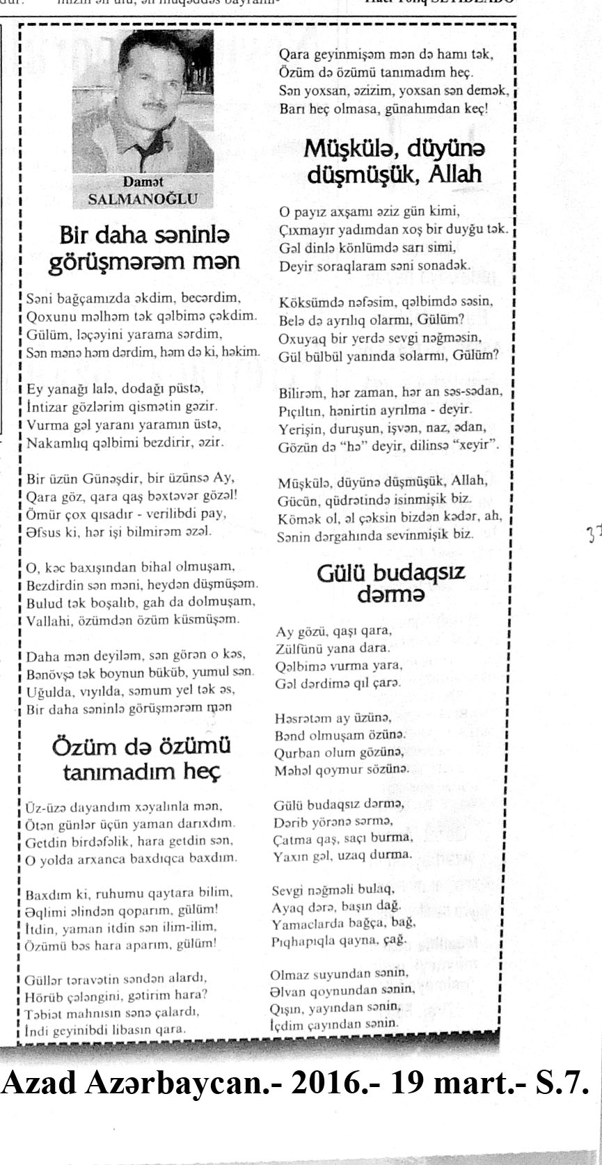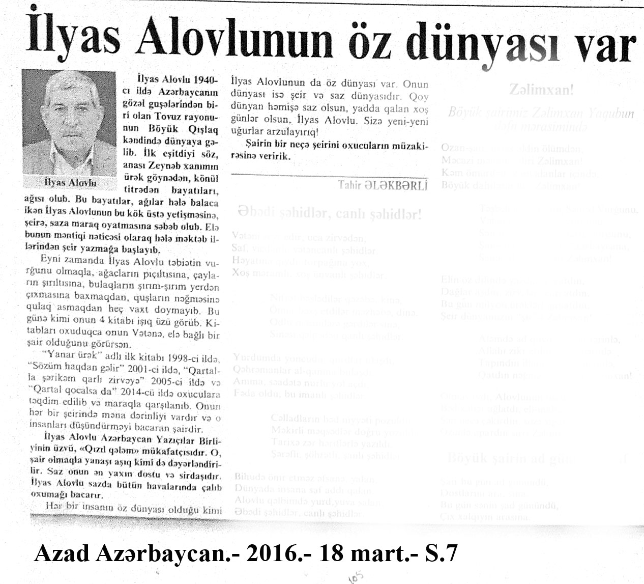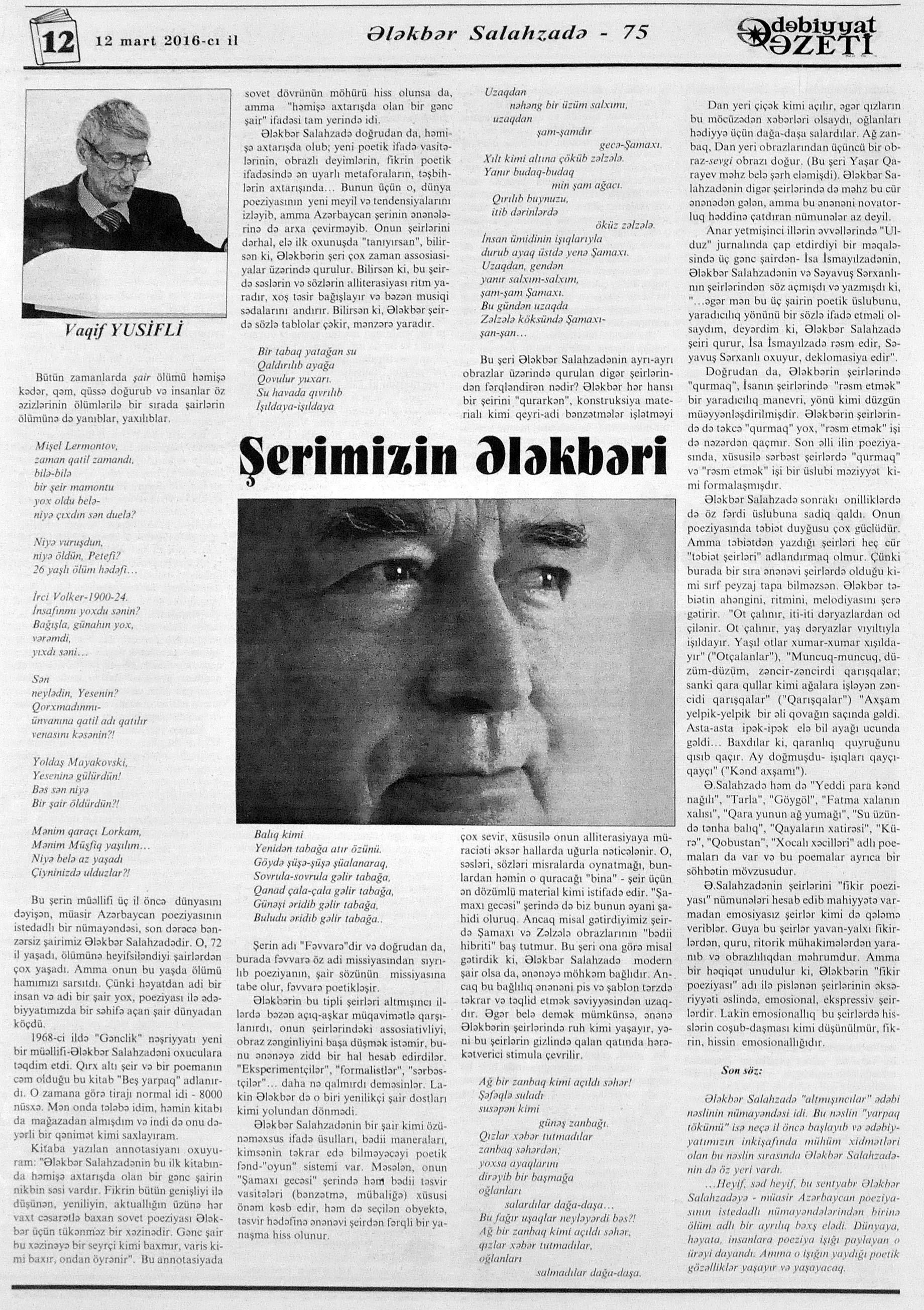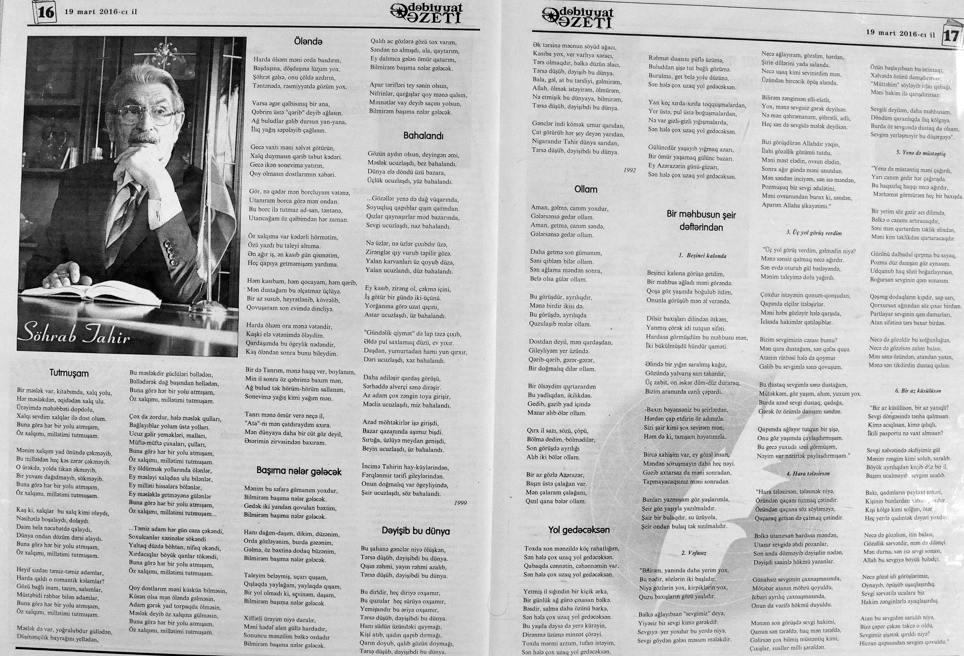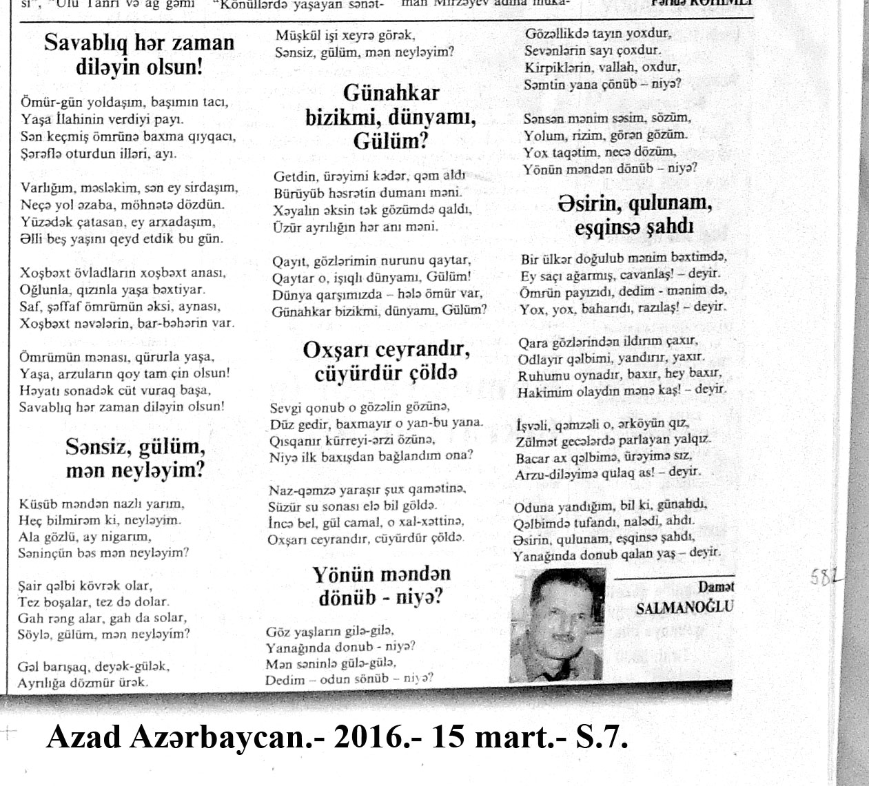 541. Abbasov, V. Unutmayın oğullar; İlahi; Demərəm; İnsanlar //Azad Azərbaycan.- 2016.- 5 mart.- S.7. 542. Alovlu, İ. Əbədi şəhidlər, canlı şəhidlər!; Zəlimxan; Böyük şairin ad gününə ithaf; Asimanımdı //Azad Azərbaycan.- 2016.- 18 mart. - S.7. 543. Aslanxanlı, M. Ömür - yuxu...; Unudularmı...; İnam olsa... və s. //525-ci qəzet.- 2016.- 10 mart.- S.7. 544. Dərviş, B. Qarabağ müşkülünə dair siyasi xəttimizə; “Şiroko” //Təzadlar.- 2016.- 8 mart.- S.15. 545. Eldar, G. İstərəm; Aşıq Pəri inciləri //Təzadlar.- 2016.- 1 mart.- S.15. 546. Elitis, O. Doğma ad axtarırdım...; Biz nədən yoğrulmuşuq: [yunan ədəbiyyatından tərcümə] /tərc. etdi Camal Yusifzadə //Ədəbiyyat qəzeti.- 2016.- 12 mart.- S.18. 547. Əfşan, M. Gömrükdədi //Təzadlar.- 2016.- 1 mart.- S.11. 548. Əhmədəliqızı, S. Təbrizim; Ədalət yatmır; Babəkim var və s. //Türküstan.- 2016.- 8-15 mart.- S.15. 549. Əliyar, A. Məni; Unudulmuş qadındır dəniz...; Bir ağ kağıza yazacam adını... və s. //Ədalət.- 2016.- 12 mart.- S.13. 550. Əsədullaqızı, M. Göy qurşağı: Səmanın al günəşi; Döyəcəm qapını; Bu həyat yolunda //525-ci qəzet.- 2016.- 1 mart.- S.7. 551. Göybulud, Z. İstərəm ki, bir görsün; Məhmət Akifə; Könüldür xülasəsi: [Türkiyə ədəbiyyatından tərcümə] /tərc.etdi İbrahim İlyaslı //Türküstan.- 2016.- 29 mart.-5 aprel.- S.15. 552. Gülayə. Oyuncaq deyilmiş o göz yaşları; Hardasa özümü unutmuşam mən; Yıx mənim boynuma günahlarını və s. //Ədəbiyyat qəzeti.- 2016.- 19 mart.- S.25. 553. Hacısoy, F. Novruz bayramınız mübarək olsun: (Aşıqsayağı) //Azad Azərbaycan.- 2016.- 18 mart. - S.7. 554. Hacısoy, H. Hər şeyin öz mahiyyəti; Necədi; Ruh, nəfs...və s. //525-ci qəzet.- 2016. -19 mart. - S. 23. 555. Hacıyeva, F. Nə yaxşı ki, varam; Qismətimi yazandı; Varlığıma qalanır və s. //Ədəbiyyat qəzeti.- 2016.- 12 mart.- S.13. 556. Həsrət, Ə. Qərib ayaq izləri; Yolum düşdü doğma yurda; Səni sevib bağışladım və s. //Kaspi.- 2016.- 5-7 mart.- S.22. 557. Xələfli, Ə. İncimək olmasın... //Kredo.- 2016.- 25 mart.- S.16. 558. Xələfli, Ə. Söz qəlbimin səsidir, ruhumun nəfəsidir //Kredo.- 2016.- 18 mart.- S.8-9. 559. Xələfli, Ə. Şair Nəcməddinin esse yaradıcılığı: [Nəcməddin Mürvətovun “Səsim ünüm, harayım” kitabı haqqında] //Kredo.- 2016.- 18 mart.- S.11. 560. Xəlilov, M. Səni; Mənlə //Təzadlar.- 2016.- 1 mart.- S.15. 561. İmanzadə, İ. Gəldim görüşünə (Anam Ruqiyyə Bəşir qızının əziz xatirəsinə); Acı söz; İlk sevgi və s. //Ədalət.- 2016.- 12 mart.- S.22. 562. İnsan, cəmiyyət və zaman münasibətlərindən bəhs edən yeni kitab: [şair-publisist Hikmət Məlikzadənin “Mənzərə Sadıqovanın yaradıcılığında insan-cəmiyyət-zaman münasibətləri” kitabı haqqında] //Azərbaycan.- 2016.- 29 mart.- S.7. 563. İsmayılov, A. Belə yaşar analar; Qızlar; Qadın ucalıqdır və s. //Azad Azərbaycan.- 2016.- 8 mart.- S.7. 564. İsmayılov, A. Yaz gəlib, ay ellər! //Azad Azərbaycan.- 2016.- 15 mart.- S.7. 565. İşıq, S. Həsrət; Səhəri açıram gülüşlərinlə...; Bu gün də xətrimə dəydi, ay ana //Kaspi.- 2016.- 19-28 mart.- S.23. 566. Kərim, Ə. Sevmirsən; Qadın; Bu saat və s. //Kaspi.- 2016.- 19-28 mart.- S.23. 567. Qarabulaq, H. Ana torpaq, sənin gücün sirillah: Hardan, nə cür; Əsas borc; Arxayınam və s. //Kredo.- 2016.- 11 mart.- S.8. 568. Qaratorpaq, S. Yadımdan çıxır daha...; Necə girdin ürəyimə...; Bilmirəm nə deyim sənə bu yaşda və s.//Kaspi.- 2016.- 5-7 mart.- S.23. 569. Qəşəmoğlu, Ə. Sənsən o sirdən gələnim; Əhdə vəfa; Bir haldayam və s. //Ədəbiyyat qəzeti.- 2016.- 5 mart.- S.4. 570. Qoca, F. Analar, xanımlar, mələklər, bayramınız mübarək! //525-ci qəzet.- 2016.- 8 mart.- S.7. 571. Məftun, M. Sən oldun...: Unudulmaz Nurəngiz Günün əziz xatirəsinə //525-ci qəzet.- 2016.- 4 mart.- S.4. 572. Nəzakət. Darıxıram, ay ana; Zabit anasıyam mən!; Amandı və s. //Ədalət.- 2016.- 8 mart. - S.4. 573. Salmanoğlu, D. Bir daha səninlə görüşmərəm mən; Özüm də özümü tanımadım heç; Müşkülə, düyünə düşmüşük, Allah; Gülü budaqsız dərmə //Azad Azərbaycan.- 2016.- 19 mart.- S. 7. 574. Salmanoğlu, D. Savablıq hər zaman diləyin olsun!; Sənsiz, gülüm, mən neyləyim?; Günahkar bizikmi, dünyamı, Gülüm? və s. //Azad Azərbaycan.- 2016.- 15 mart.- S. 7. 575. Sevil, X. Bütün güclü qadınlar bədbəxtdir; Əllərim bir tənha qucaqdı sənsiz; Qocalıq və s. //Kaspi.- 2016.- 5-7 mart.- S.18. 576. Şahin, Ş. Yenidən doğulacağam; Şeirimin şəklini çəkən oğlana //Ədəbiyyat qəzeti.- 2016.- 12 mart.- S.8. 577. Şahməmmədov, Ş. Şahməmməd yaradıcılığının bugünkü rəngləri: Azərbaycan baş ölkədir; Yel çərşənbəsi; Yaşıdlarım və s. //Kredo.- 2016.- 25 mart.- S.8-9. 578. Şamilqızı, G. Ac; Qartalıma; Şəmsə və s. //Ədəbiyyat qəzeti.- 2016.- 19 mart.- S.4. 579. Şeyda, S. Yaz küləkləri; Gəlməmişəm qürbətə; Ana və s.: Simax Şeyda – 80 //Kaspi.- 2016.- 19-28 mart.- S.22. 580. Tahir, S. Tutmuşam; Öləndə; Başıma nələr gələcək və s. //Ədəbiyyat qəzeti.- 2016.- 19 mart.- S.16-17. 581. Yadigar, A. Bu yol Təbriz yoludur; Bu günəş; Ulu Cavid və s. //Ədəbiyyat qəzeti.- 2016.- 19 mart.- S.15. 582. Yusifoğlu, İ. Körpə balalara qış sövqatı: Qış təbibdi; Bulaqda yazdı; Dağlar çiçəkləyibdir və s. //Kaspi.- 2016.- 5-7 mart.- S.21. 583. Zamanlı, S. Sənə, dünya; Bağışla məni; Ayrılıq və s. //Ədəbiyyat qəzeti.- 2016.- 5 mart.- S.13. 584. Zöhraboğlu, V. Ən gözəl qadınlar; Bilməzsən gözümün yuxusuzluğu; Öpsəm... və s. //Ədəbiyyat qəzeti.- 2016.- 19 mart.- S.32. Bax: 215