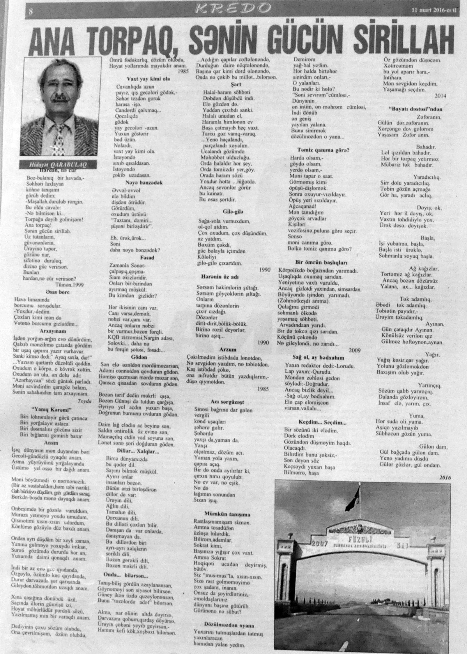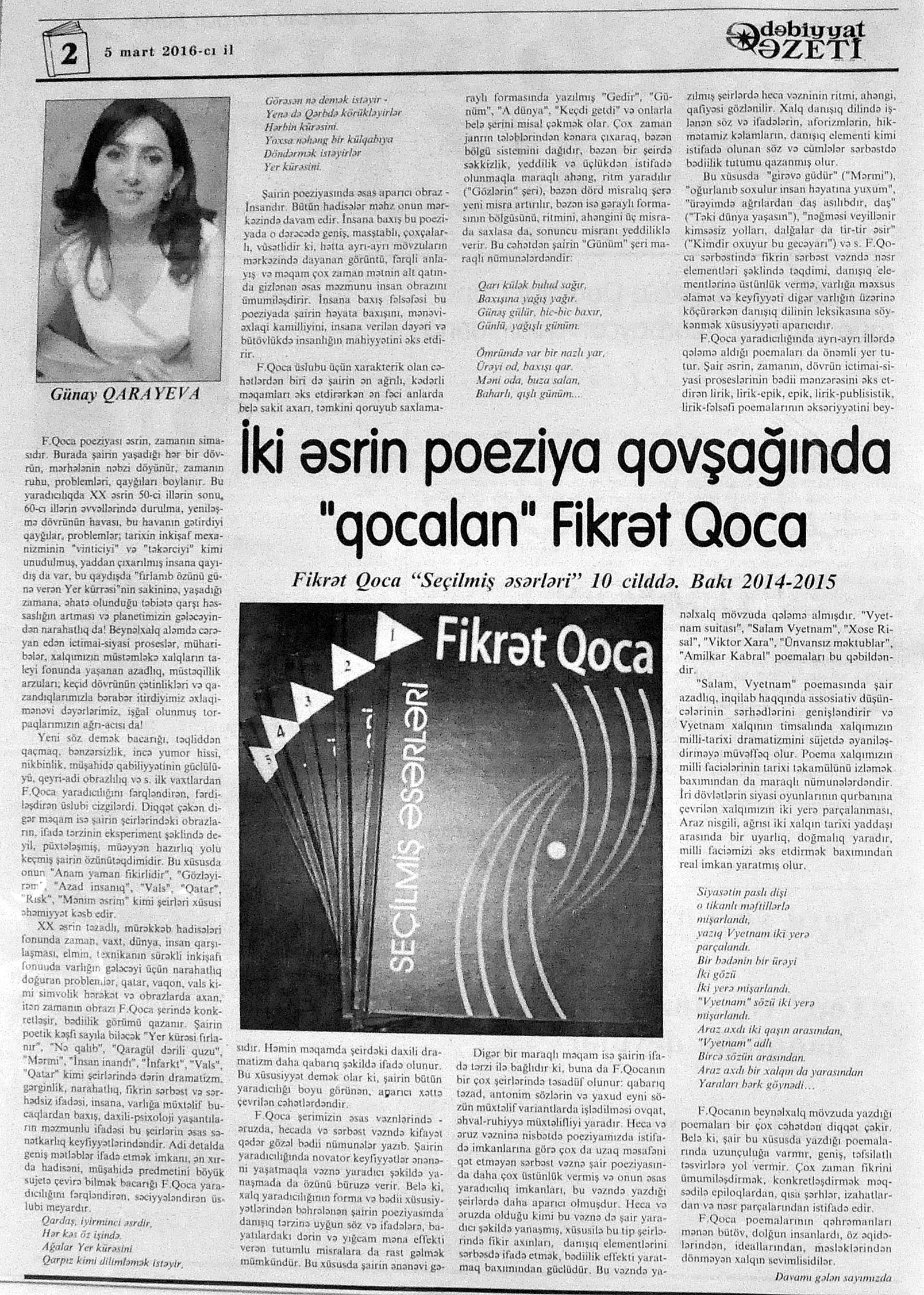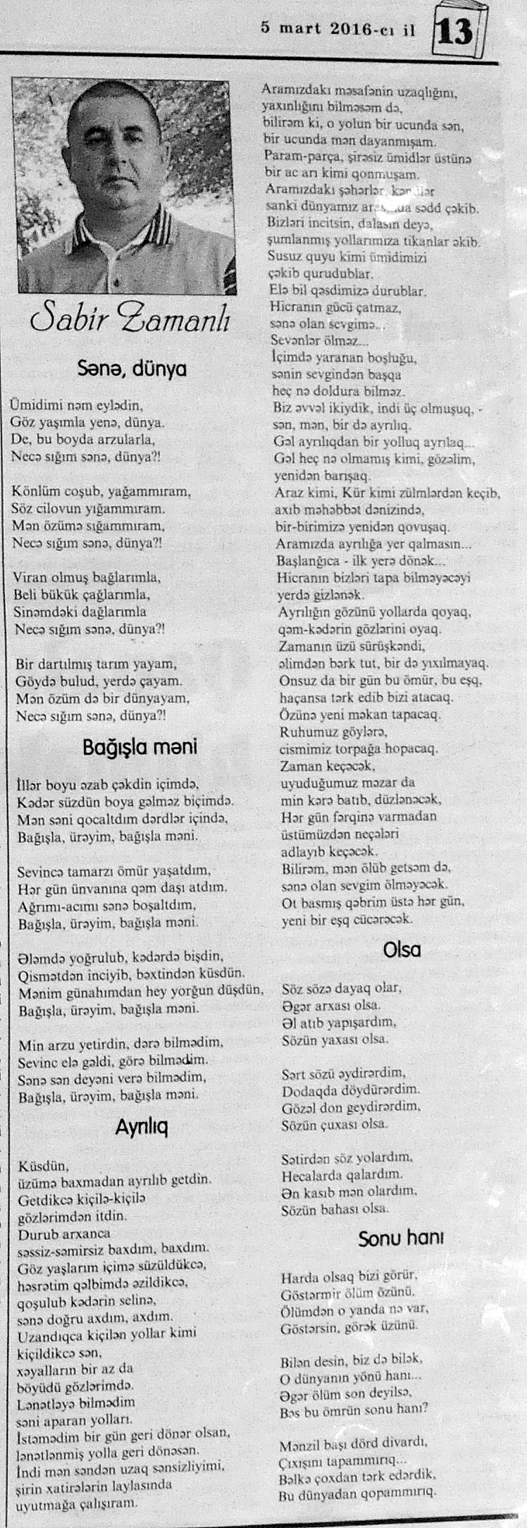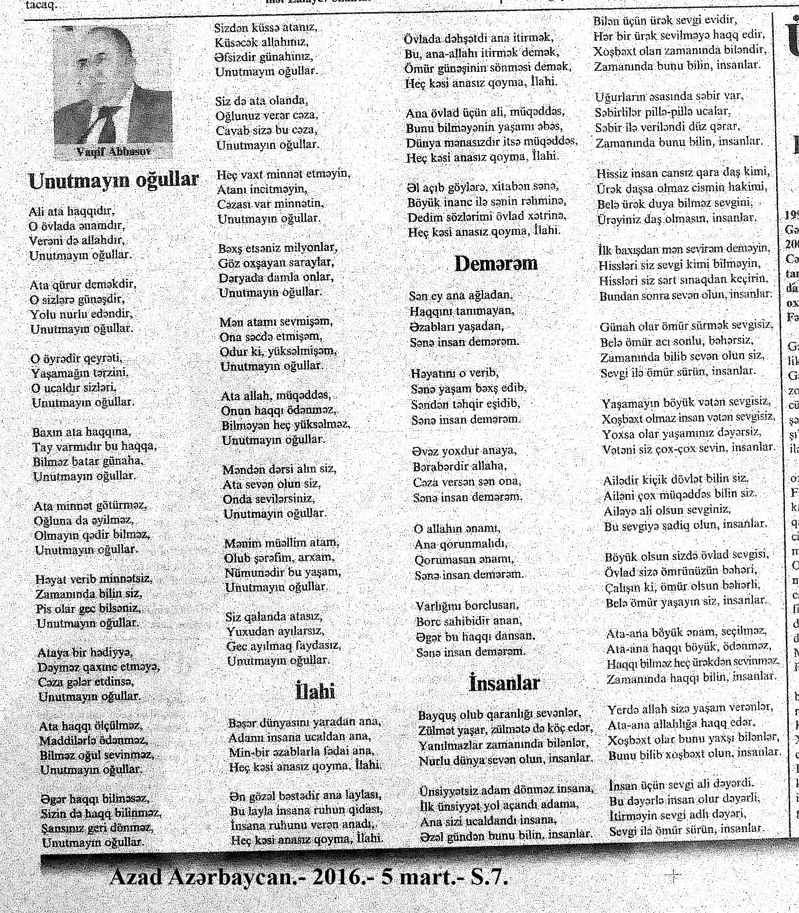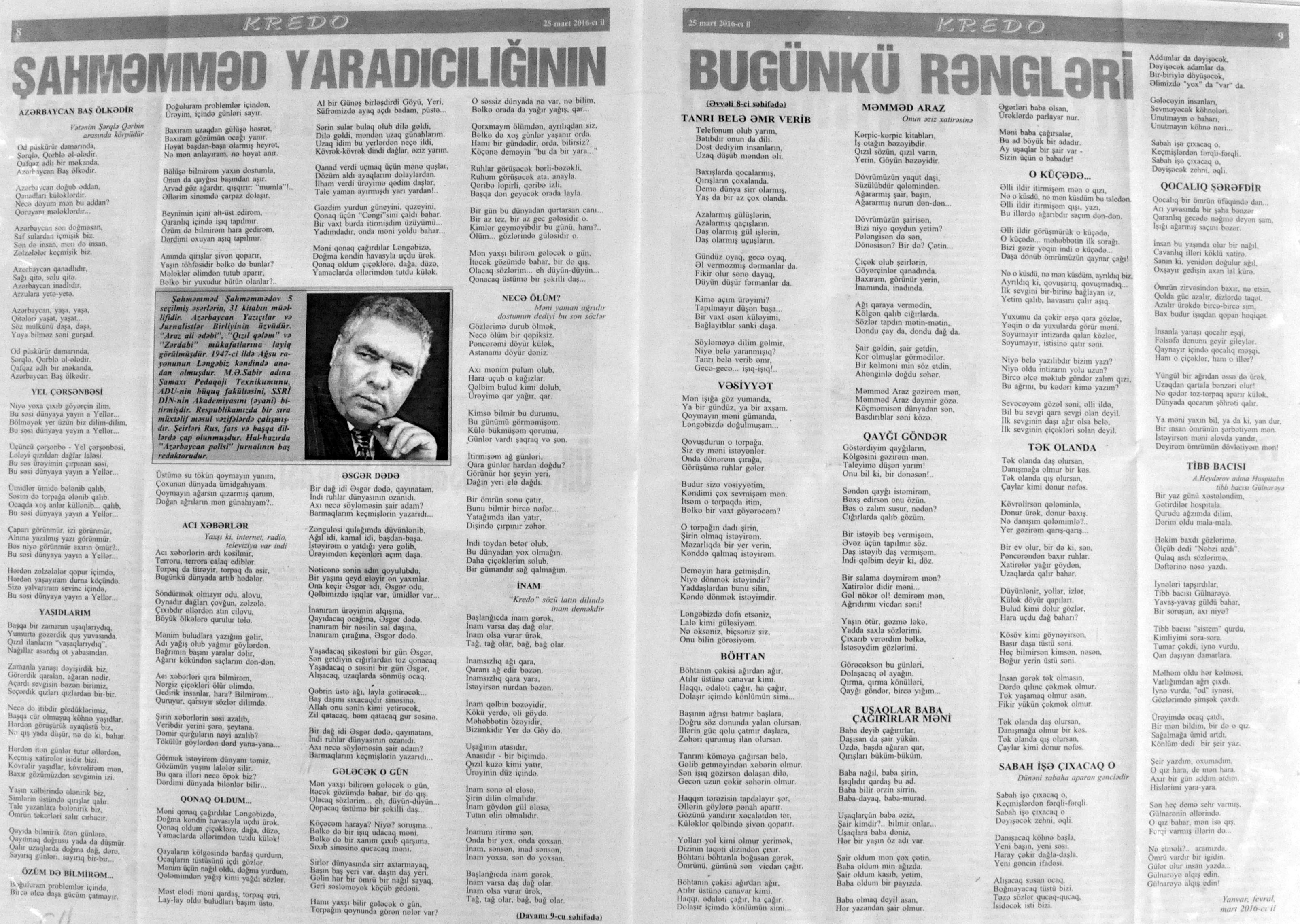 541. Abbasov, V. Unutmayın oğullar; İlahi; Demərəm; İnsanlar //Azad Azərbaycan.- 2016.- 5 mart.- S.7. 542. Alovlu, İ. Əbədi şəhidlər, canlı şəhidlər!; Zəlimxan; Böyük şairin ad gününə ithaf; Asimanımdı //Azad Azərbaycan.- 2016.- 18 mart. - S.7. 543. Aslanxanlı, M. Ömür - yuxu...; Unudularmı...; İnam olsa... və s. //525-ci qəzet.- 2016.- 10 mart.- S.7. 544. Dərviş, B. Qarabağ müşkülünə dair siyasi xəttimizə; “Şiroko” //Təzadlar.- 2016.- 8 mart.- S.15. 545. Eldar, G. İstərəm; Aşıq Pəri inciləri //Təzadlar.- 2016.- 1 mart.- S.15. 546. Elitis, O. Doğma ad axtarırdım...; Biz nədən yoğrulmuşuq: [yunan ədəbiyyatından tərcümə] /tərc. etdi Camal Yusifzadə //Ədəbiyyat qəzeti.- 2016.- 12 mart.- S.18. 547. Əfşan, M. Gömrükdədi //Təzadlar.- 2016.- 1 mart.- S.11. 548. Əhmədəliqızı, S. Təbrizim; Ədalət yatmır; Babəkim var və s. //Türküstan.- 2016.- 8-15 mart.- S.15. 549. Əliyar, A. Məni; Unudulmuş qadındır dəniz...; Bir ağ kağıza yazacam adını... və s. //Ədalət.- 2016.- 12 mart.- S.13. 550. Əsədullaqızı, M. Göy qurşağı: Səmanın al günəşi; Döyəcəm qapını; Bu həyat yolunda //525-ci qəzet.- 2016.- 1 mart.- S.7. 551. Göybulud, Z. İstərəm ki, bir görsün; Məhmət Akifə; Könüldür xülasəsi: [Türkiyə ədəbiyyatından tərcümə] /tərc.etdi İbrahim İlyaslı //Türküstan.- 2016.- 29 mart.-5 aprel.- S.15. 552. Gülayə. Oyuncaq deyilmiş o göz yaşları; Hardasa özümü unutmuşam mən; Yıx mənim boynuma günahlarını və s. //Ədəbiyyat qəzeti.- 2016.- 19 mart.- S.25. 553. Hacısoy, F. Novruz bayramınız mübarək olsun: (Aşıqsayağı) //Azad Azərbaycan.- 2016.- 18 mart. - S.7. 554. Hacısoy, H. Hər şeyin öz mahiyyəti; Necədi; Ruh, nəfs...və s. //525-ci qəzet.- 2016. -19 mart. - S. 23. 555. Hacıyeva, F. Nə yaxşı ki, varam; Qismətimi yazandı; Varlığıma qalanır və s. //Ədəbiyyat qəzeti.- 2016.- 12 mart.- S.13. 556. Həsrət, Ə. Qərib ayaq izləri; Yolum düşdü doğma yurda; Səni sevib bağışladım və s. //Kaspi.- 2016.- 5-7 mart.- S.22. 557. Xələfli, Ə. İncimək olmasın... //Kredo.- 2016.- 25 mart.- S.16. 558. Xələfli, Ə. Söz qəlbimin səsidir, ruhumun nəfəsidir //Kredo.- 2016.- 18 mart.- S.8-9. 559. Xələfli, Ə. Şair Nəcməddinin esse yaradıcılığı: [Nəcməddin Mürvətovun “Səsim ünüm, harayım” kitabı haqqında] //Kredo.- 2016.- 18 mart.- S.11. 560. Xəlilov, M. Səni; Mənlə //Təzadlar.- 2016.- 1 mart.- S.15. 561. İmanzadə, İ. Gəldim görüşünə (Anam Ruqiyyə Bəşir qızının əziz xatirəsinə); Acı söz; İlk sevgi və s. //Ədalət.- 2016.- 12 mart.- S.22. 562. İnsan, cəmiyyət və zaman münasibətlərindən bəhs edən yeni kitab: [şair-publisist Hikmət Məlikzadənin “Mənzərə Sadıqovanın yaradıcılığında insan-cəmiyyət-zaman münasibətləri” kitabı haqqında] //Azərbaycan.- 2016.- 29 mart.- S.7. 563. İsmayılov, A. Belə yaşar analar; Qızlar; Qadın ucalıqdır və s. //Azad Azərbaycan.- 2016.- 8 mart.- S.7. 564. İsmayılov, A. Yaz gəlib, ay ellər! //Azad Azərbaycan.- 2016.- 15 mart.- S.7. 565. İşıq, S. Həsrət; Səhəri açıram gülüşlərinlə...; Bu gün də xətrimə dəydi, ay ana //Kaspi.- 2016.- 19-28 mart.- S.23. 566. Kərim, Ə. Sevmirsən; Qadın; Bu saat və s. //Kaspi.- 2016.- 19-28 mart.- S.23. 567. Qarabulaq, H. Ana torpaq, sənin gücün sirillah: Hardan, nə cür; Əsas borc; Arxayınam və s. //Kredo.- 2016.- 11 mart.- S.8. 568. Qaratorpaq, S. Yadımdan çıxır daha...; Necə girdin ürəyimə...; Bilmirəm nə deyim sənə bu yaşda və s.//Kaspi.- 2016.- 5-7 mart.- S.23. 569. Qəşəmoğlu, Ə. Sənsən o sirdən gələnim; Əhdə vəfa; Bir haldayam və s. //Ədəbiyyat qəzeti.- 2016.- 5 mart.- S.4. 570. Qoca, F. Analar, xanımlar, mələklər, bayramınız mübarək! //525-ci qəzet.- 2016.- 8 mart.- S.7. 571. Məftun, M. Sən oldun...: Unudulmaz Nurəngiz Günün əziz xatirəsinə //525-ci qəzet.- 2016.- 4 mart.- S.4. 572. Nəzakət. Darıxıram, ay ana; Zabit anasıyam mən!; Amandı və s. //Ədalət.- 2016.- 8 mart. - S.4. 573. Salmanoğlu, D. Bir daha səninlə görüşmərəm mən; Özüm də özümü tanımadım heç; Müşkülə, düyünə düşmüşük, Allah; Gülü budaqsız dərmə //Azad Azərbaycan.- 2016.- 19 mart.- S. 7. 574. Salmanoğlu, D. Savablıq hər zaman diləyin olsun!; Sənsiz, gülüm, mən neyləyim?; Günahkar bizikmi, dünyamı, Gülüm? və s. //Azad Azərbaycan.- 2016.- 15 mart.- S. 7. 575. Sevil, X. Bütün güclü qadınlar bədbəxtdir; Əllərim bir tənha qucaqdı sənsiz; Qocalıq və s. //Kaspi.- 2016.- 5-7 mart.- S.18. 576. Şahin, Ş. Yenidən doğulacağam; Şeirimin şəklini çəkən oğlana //Ədəbiyyat qəzeti.- 2016.- 12 mart.- S.8. 577. Şahməmmədov, Ş. Şahməmməd yaradıcılığının bugünkü rəngləri: Azərbaycan baş ölkədir; Yel çərşənbəsi; Yaşıdlarım və s. //Kredo.- 2016.- 25 mart.- S.8-9. 578. Şamilqızı, G. Ac; Qartalıma; Şəmsə və s. //Ədəbiyyat qəzeti.- 2016.- 19 mart.- S.4. 579. Şeyda, S. Yaz küləkləri; Gəlməmişəm qürbətə; Ana və s.: Simax Şeyda – 80 //Kaspi.- 2016.- 19-28 mart.- S.22. 580. Tahir, S. Tutmuşam; Öləndə; Başıma nələr gələcək və s. //Ədəbiyyat qəzeti.- 2016.- 19 mart.- S.16-17. 581. Yadigar, A. Bu yol Təbriz yoludur; Bu günəş; Ulu Cavid və s. //Ədəbiyyat qəzeti.- 2016.- 19 mart.- S.15. 582. Yusifoğlu, İ. Körpə balalara qış sövqatı: Qış təbibdi; Bulaqda yazdı; Dağlar çiçəkləyibdir və s. //Kaspi.- 2016.- 5-7 mart.- S.21. 583. Zamanlı, S. Sənə, dünya; Bağışla məni; Ayrılıq və s. //Ədəbiyyat qəzeti.- 2016.- 5 mart.- S.13. 584. Zöhraboğlu, V. Ən gözəl qadınlar; Bilməzsən gözümün yuxusuzluğu; Öpsəm... və s. //Ədəbiyyat qəzeti.- 2016.- 19 mart.- S.32. Bax: 215