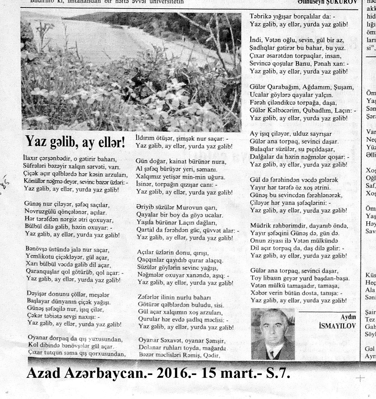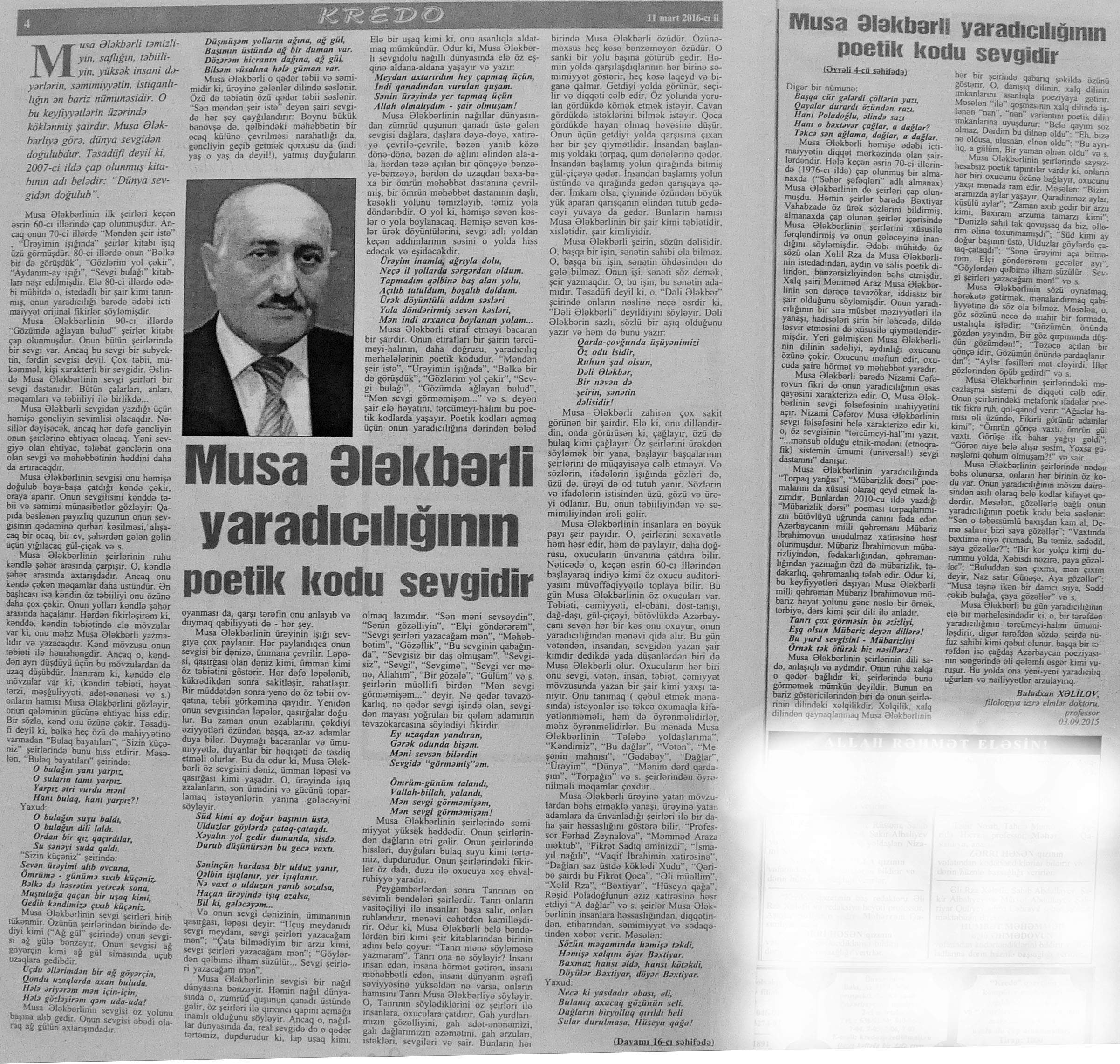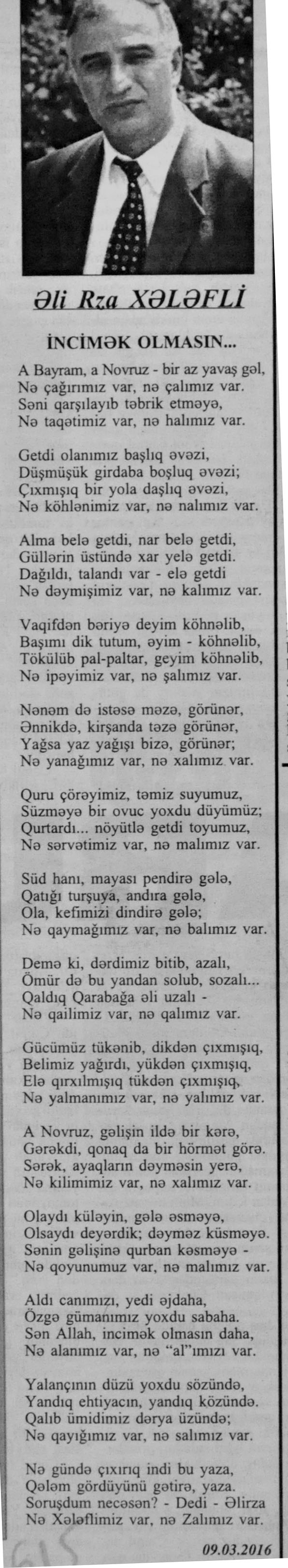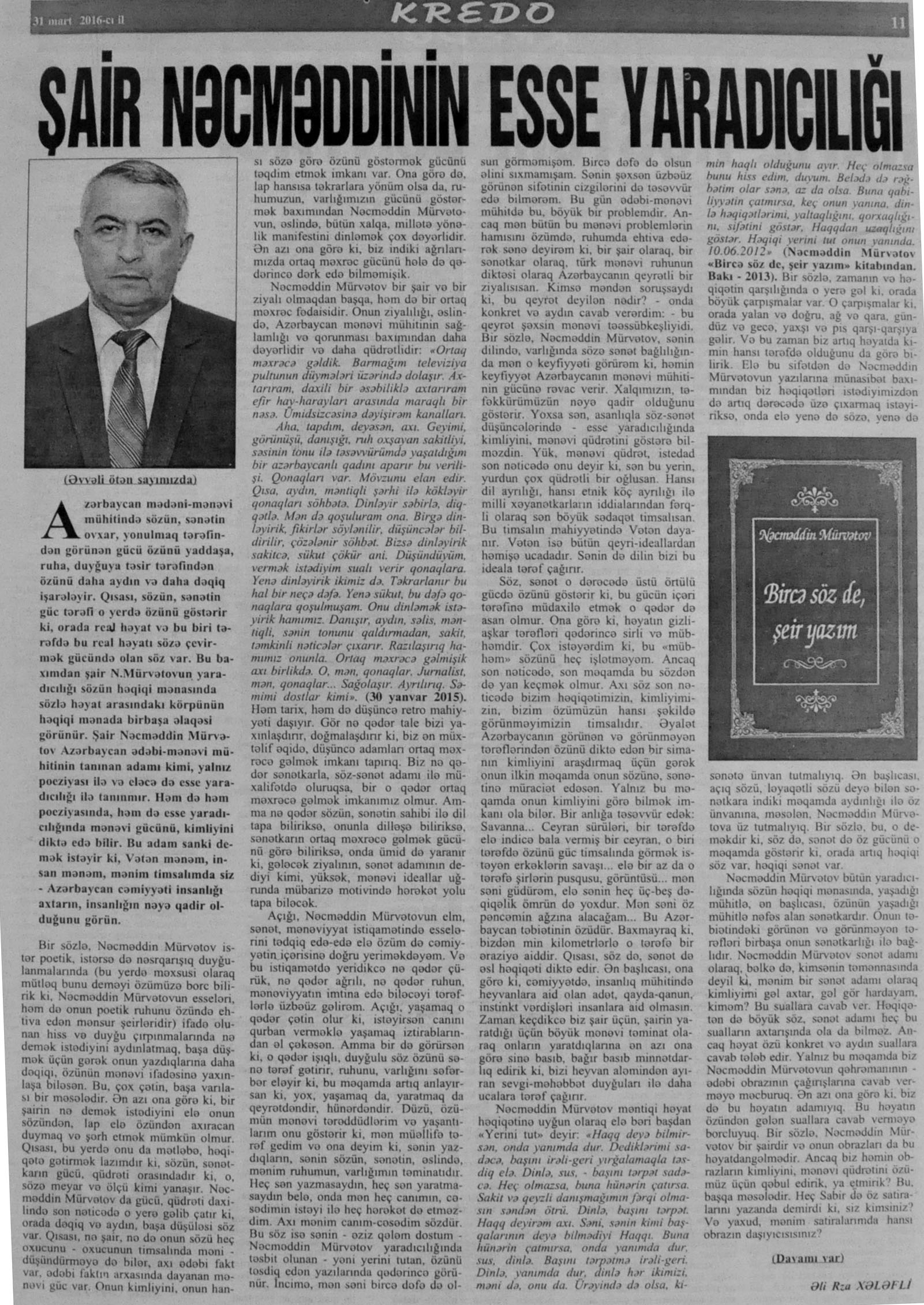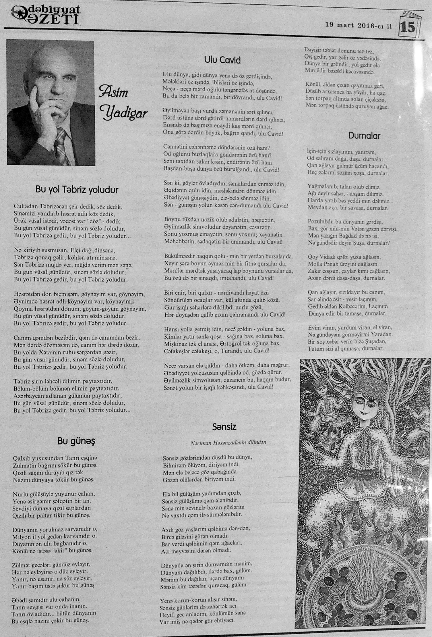541. Abbasov, V. Unutmayın oğullar; İlahi; Demərəm; İnsanlar //Azad Azərbaycan.- 2016.- 5 mart.- S.7. 542. Alovlu, İ. Əbədi şəhidlər, canlı şəhidlər!; Zəlimxan; Böyük şairin ad gününə ithaf; Asimanımdı //Azad Azərbaycan.- 2016.- 18 mart. - S.7. 543. Aslanxanlı, M. Ömür - yuxu...; Unudularmı...; İnam olsa... və s. //525-ci qəzet.- 2016.- 10 mart.- S.7. 544. Dərviş, B. Qarabağ müşkülünə dair siyasi xəttimizə; “Şiroko” //Təzadlar.- 2016.- 8 mart.- S.15. 545. Eldar, G. İstərəm; Aşıq Pəri inciləri //Təzadlar.- 2016.- 1 mart.- S.15. 546. Elitis, O. Doğma ad axtarırdım...; Biz nədən yoğrulmuşuq: [yunan ədəbiyyatından tərcümə] /tərc. etdi Camal Yusifzadə //Ədəbiyyat qəzeti.- 2016.- 12 mart.- S.18. 547. Əfşan, M. Gömrükdədi //Təzadlar.- 2016.- 1 mart.- S.11. 548. Əhmədəliqızı, S. Təbrizim; Ədalət yatmır; Babəkim var və s. //Türküstan.- 2016.- 8-15 mart.- S.15. 549. Əliyar, A. Məni; Unudulmuş qadındır dəniz...; Bir ağ kağıza yazacam adını... və s. //Ədalət.- 2016.- 12 mart.- S.13. 550. Əsədullaqızı, M. Göy qurşağı: Səmanın al günəşi; Döyəcəm qapını; Bu həyat yolunda //525-ci qəzet.- 2016.- 1 mart.- S.7. 551. Göybulud, Z. İstərəm ki, bir görsün; Məhmət Akifə; Könüldür xülasəsi: [Türkiyə ədəbiyyatından tərcümə] /tərc.etdi İbrahim İlyaslı //Türküstan.- 2016.- 29 mart.-5 aprel.- S.15. 552. Gülayə. Oyuncaq deyilmiş o göz yaşları; Hardasa özümü unutmuşam mən; Yıx mənim boynuma günahlarını və s. //Ədəbiyyat qəzeti.- 2016.- 19 mart.- S.25. 553. Hacısoy, F. Novruz bayramınız mübarək olsun: (Aşıqsayağı) //Azad Azərbaycan.- 2016.- 18 mart. - S.7. 554. Hacısoy, H. Hər şeyin öz mahiyyəti; Necədi; Ruh, nəfs...və s. //525-ci qəzet.- 2016. -19 mart. - S. 23. 555. Hacıyeva, F. Nə yaxşı ki, varam; Qismətimi yazandı; Varlığıma qalanır və s. //Ədəbiyyat qəzeti.- 2016.- 12 mart.- S.13. 556. Həsrət, Ə. Qərib ayaq izləri; Yolum düşdü doğma yurda; Səni sevib bağışladım və s. //Kaspi.- 2016.- 5-7 mart.- S.22. 557. Xələfli, Ə. İncimək olmasın... //Kredo.- 2016.- 25 mart.- S.16. 558. Xələfli, Ə. Söz qəlbimin səsidir, ruhumun nəfəsidir //Kredo.- 2016.- 18 mart.- S.8-9. 559. Xələfli, Ə. Şair Nəcməddinin esse yaradıcılığı: [Nəcməddin Mürvətovun “Səsim ünüm, harayım” kitabı haqqında] //Kredo.- 2016.- 18 mart.- S.11. 560. Xəlilov, M. Səni; Mənlə //Təzadlar.- 2016.- 1 mart.- S.15. 561. İmanzadə, İ. Gəldim görüşünə (Anam Ruqiyyə Bəşir qızının əziz xatirəsinə); Acı söz; İlk sevgi və s. //Ədalət.- 2016.- 12 mart.- S.22. 562. İnsan, cəmiyyət və zaman münasibətlərindən bəhs edən yeni kitab: [şair-publisist Hikmət Məlikzadənin “Mənzərə Sadıqovanın yaradıcılığında insan-cəmiyyət-zaman münasibətləri” kitabı haqqında] //Azərbaycan.- 2016.- 29 mart.- S.7. 563. İsmayılov, A. Belə yaşar analar; Qızlar; Qadın ucalıqdır və s. //Azad Azərbaycan.- 2016.- 8 mart.- S.7. 564. İsmayılov, A. Yaz gəlib, ay ellər! //Azad Azərbaycan.- 2016.- 15 mart.- S.7. 565. İşıq, S. Həsrət; Səhəri açıram gülüşlərinlə...; Bu gün də xətrimə dəydi, ay ana //Kaspi.- 2016.- 19-28 mart.- S.23. 566. Kərim, Ə. Sevmirsən; Qadın; Bu saat və s. //Kaspi.- 2016.- 19-28 mart.- S.23. 567. Qarabulaq, H. Ana torpaq, sənin gücün sirillah: Hardan, nə cür; Əsas borc; Arxayınam və s. //Kredo.- 2016.- 11 mart.- S.8. 568. Qaratorpaq, S. Yadımdan çıxır daha...; Necə girdin ürəyimə...; Bilmirəm nə deyim sənə bu yaşda və s.//Kaspi.- 2016.- 5-7 mart.- S.23. 569. Qəşəmoğlu, Ə. Sənsən o sirdən gələnim; Əhdə vəfa; Bir haldayam və s. //Ədəbiyyat qəzeti.- 2016.- 5 mart.- S.4. 570. Qoca, F. Analar, xanımlar, mələklər, bayramınız mübarək! //525-ci qəzet.- 2016.- 8 mart.- S.7. 571. Məftun, M. Sən oldun...: Unudulmaz Nurəngiz Günün əziz xatirəsinə //525-ci qəzet.- 2016.- 4 mart.- S.4. 572. Nəzakət. Darıxıram, ay ana; Zabit anasıyam mən!; Amandı və s. //Ədalət.- 2016.- 8 mart. - S.4. 573. Salmanoğlu, D. Bir daha səninlə görüşmərəm mən; Özüm də özümü tanımadım heç; Müşkülə, düyünə düşmüşük, Allah; Gülü budaqsız dərmə //Azad Azərbaycan.- 2016.- 19 mart.- S. 7. 574. Salmanoğlu, D. Savablıq hər zaman diləyin olsun!; Sənsiz, gülüm, mən neyləyim?; Günahkar bizikmi, dünyamı, Gülüm? və s. //Azad Azərbaycan.- 2016.- 15 mart.- S. 7. 575. Sevil, X. Bütün güclü qadınlar bədbəxtdir; Əllərim bir tənha qucaqdı sənsiz; Qocalıq və s. //Kaspi.- 2016.- 5-7 mart.- S.18. 576. Şahin, Ş. Yenidən doğulacağam; Şeirimin şəklini çəkən oğlana //Ədəbiyyat qəzeti.- 2016.- 12 mart.- S.8. 577. Şahməmmədov, Ş. Şahməmməd yaradıcılığının bugünkü rəngləri: Azərbaycan baş ölkədir; Yel çərşənbəsi; Yaşıdlarım və s. //Kredo.- 2016.- 25 mart.- S.8-9. 578. Şamilqızı, G. Ac; Qartalıma; Şəmsə və s. //Ədəbiyyat qəzeti.- 2016.- 19 mart.- S.4. 579. Şeyda, S. Yaz küləkləri; Gəlməmişəm qürbətə; Ana və s.: Simax Şeyda – 80 //Kaspi.- 2016.- 19-28 mart.- S.22. 580. Tahir, S. Tutmuşam; Öləndə; Başıma nələr gələcək və s. //Ədəbiyyat qəzeti.- 2016.- 19 mart.- S.16-17. 581. Yadigar, A. Bu yol Təbriz yoludur; Bu günəş; Ulu Cavid və s. //Ədəbiyyat qəzeti.- 2016.- 19 mart.- S.15. 582. Yusifoğlu, İ. Körpə balalara qış sövqatı: Qış təbibdi; Bulaqda yazdı; Dağlar çiçəkləyibdir və s. //Kaspi.- 2016.- 5-7 mart.- S.21. 583. Zamanlı, S. Sənə, dünya; Bağışla məni; Ayrılıq və s. //Ədəbiyyat qəzeti.- 2016.- 5 mart.- S.13. 584. Zöhraboğlu, V. Ən gözəl qadınlar; Bilməzsən gözümün yuxusuzluğu; Öpsəm... və s. //Ədəbiyyat qəzeti.- 2016.- 19 mart.- S.32. Bax: 215