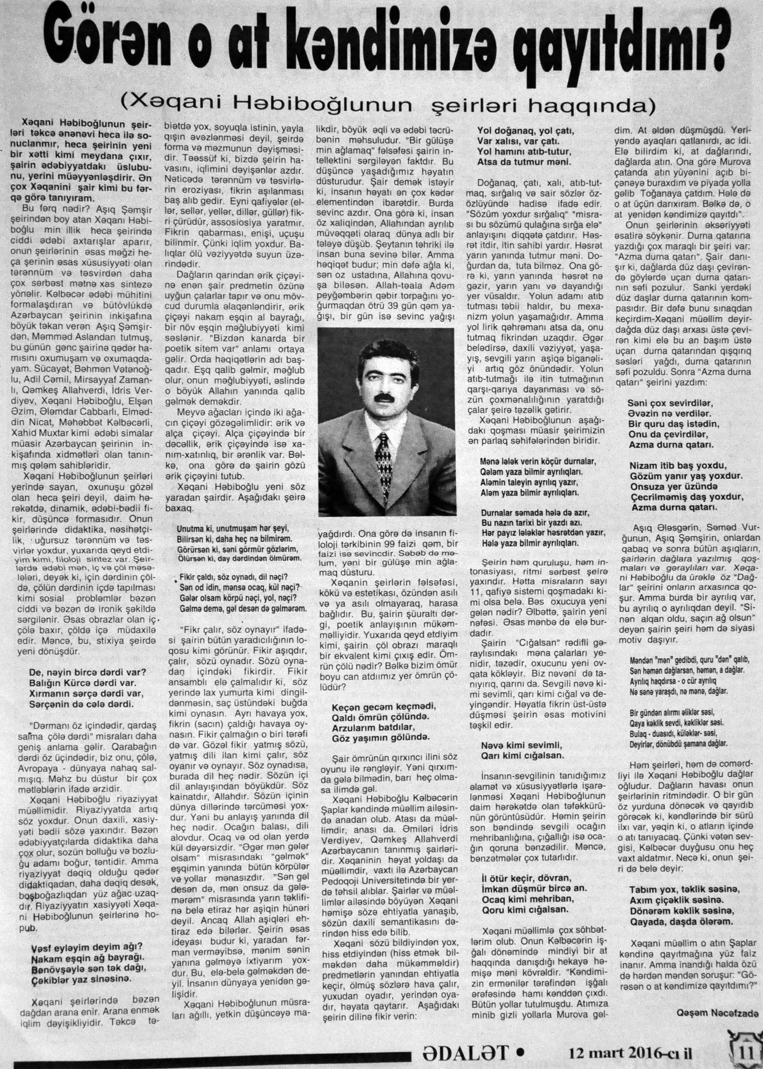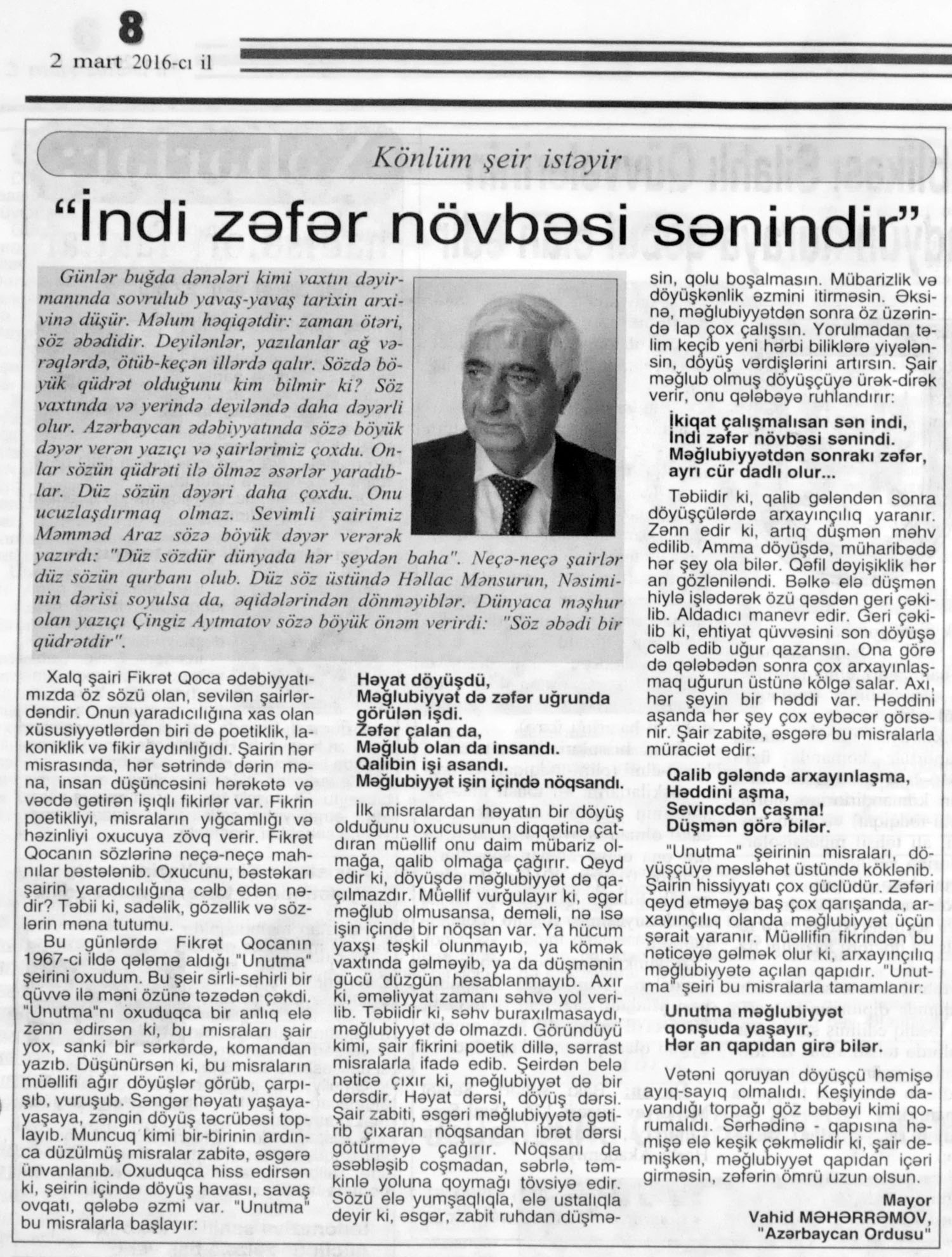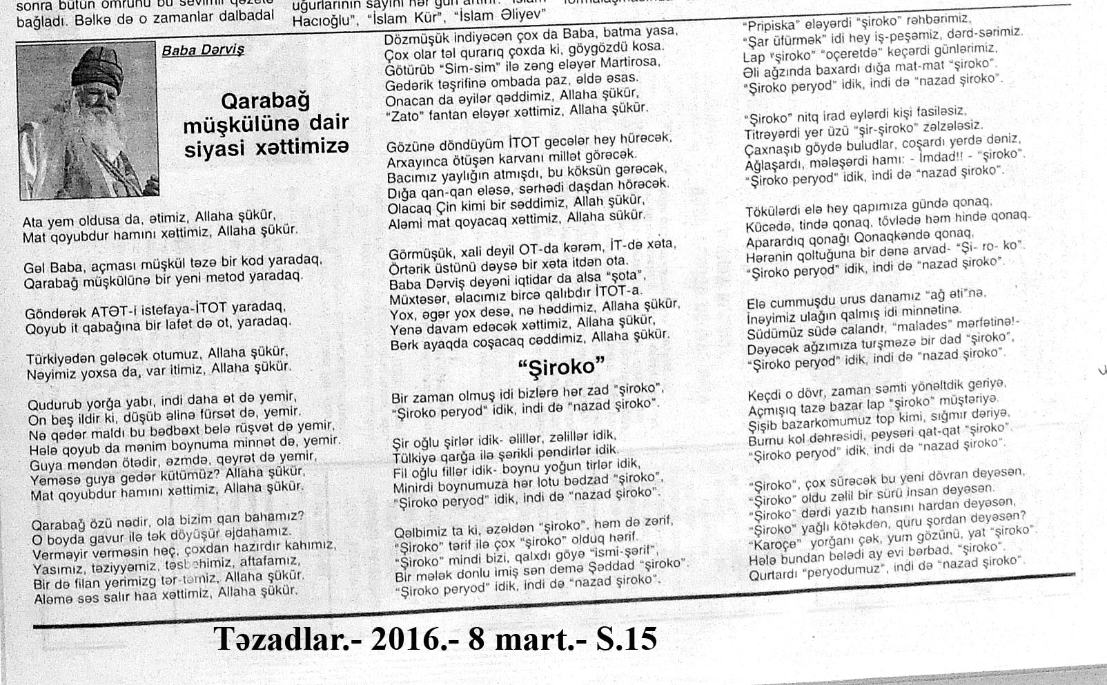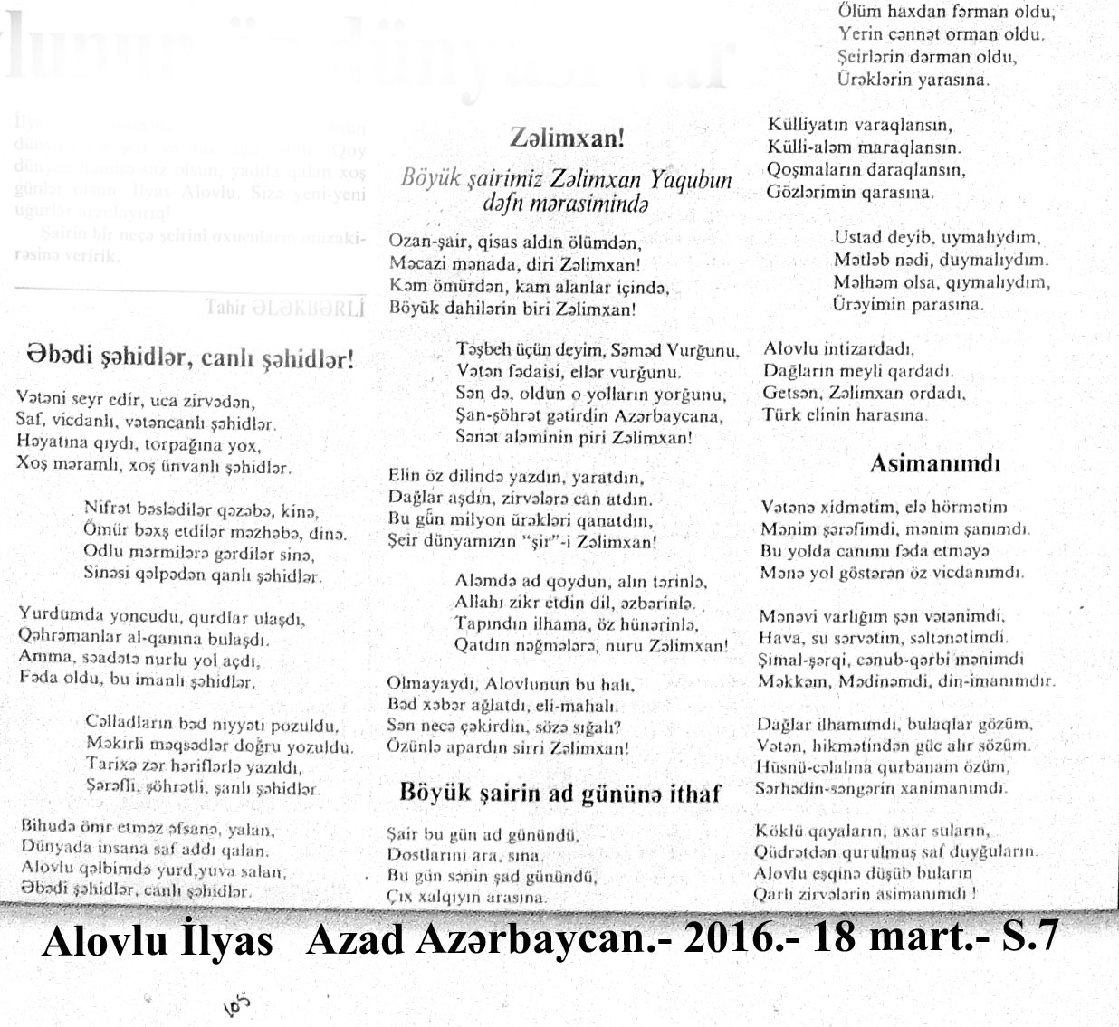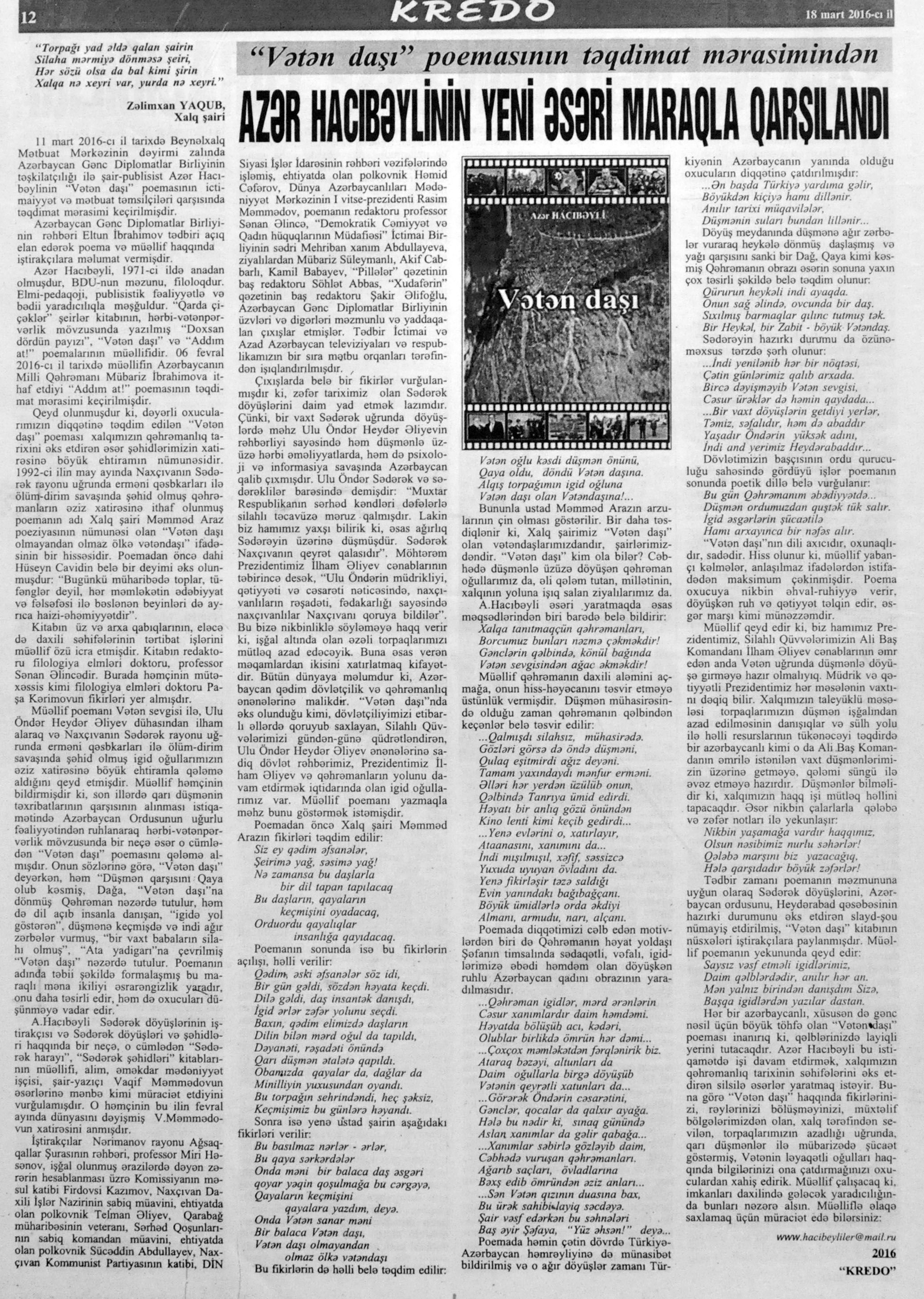 541. Abbasov, V. Unutmayın oğullar; İlahi; Demərəm; İnsanlar //Azad Azərbaycan.- 2016.- 5 mart.- S.7. 542. Alovlu, İ. Əbədi şəhidlər, canlı şəhidlər!; Zəlimxan; Böyük şairin ad gününə ithaf; Asimanımdı //Azad Azərbaycan.- 2016.- 18 mart. - S.7. 543. Aslanxanlı, M. Ömür - yuxu...; Unudularmı...; İnam olsa... və s. //525-ci qəzet.- 2016.- 10 mart.- S.7. 544. Dərviş, B. Qarabağ müşkülünə dair siyasi xəttimizə; “Şiroko” //Təzadlar.- 2016.- 8 mart.- S.15. 545. Eldar, G. İstərəm; Aşıq Pəri inciləri //Təzadlar.- 2016.- 1 mart.- S.15. 546. Elitis, O. Doğma ad axtarırdım...; Biz nədən yoğrulmuşuq: [yunan ədəbiyyatından tərcümə] /tərc. etdi Camal Yusifzadə //Ədəbiyyat qəzeti.- 2016.- 12 mart.- S.18. 547. Əfşan, M. Gömrükdədi //Təzadlar.- 2016.- 1 mart.- S.11. 548. Əhmədəliqızı, S. Təbrizim; Ədalət yatmır; Babəkim var və s. //Türküstan.- 2016.- 8-15 mart.- S.15. 549. Əliyar, A. Məni; Unudulmuş qadındır dəniz...; Bir ağ kağıza yazacam adını... və s. //Ədalət.- 2016.- 12 mart.- S.13. 550. Əsədullaqızı, M. Göy qurşağı: Səmanın al günəşi; Döyəcəm qapını; Bu həyat yolunda //525-ci qəzet.- 2016.- 1 mart.- S.7. 551. Göybulud, Z. İstərəm ki, bir görsün; Məhmət Akifə; Könüldür xülasəsi: [Türkiyə ədəbiyyatından tərcümə] /tərc.etdi İbrahim İlyaslı //Türküstan.- 2016.- 29 mart.-5 aprel.- S.15. 552. Gülayə. Oyuncaq deyilmiş o göz yaşları; Hardasa özümü unutmuşam mən; Yıx mənim boynuma günahlarını və s. //Ədəbiyyat qəzeti.- 2016.- 19 mart.- S.25. 553. Hacısoy, F. Novruz bayramınız mübarək olsun: (Aşıqsayağı) //Azad Azərbaycan.- 2016.- 18 mart. - S.7. 554. Hacısoy, H. Hər şeyin öz mahiyyəti; Necədi; Ruh, nəfs...və s. //525-ci qəzet.- 2016. -19 mart. - S. 23. 555. Hacıyeva, F. Nə yaxşı ki, varam; Qismətimi yazandı; Varlığıma qalanır və s. //Ədəbiyyat qəzeti.- 2016.- 12 mart.- S.13. 556. Həsrət, Ə. Qərib ayaq izləri; Yolum düşdü doğma yurda; Səni sevib bağışladım və s. //Kaspi.- 2016.- 5-7 mart.- S.22. 557. Xələfli, Ə. İncimək olmasın... //Kredo.- 2016.- 25 mart.- S.16. 558. Xələfli, Ə. Söz qəlbimin səsidir, ruhumun nəfəsidir //Kredo.- 2016.- 18 mart.- S.8-9. 559. Xələfli, Ə. Şair Nəcməddinin esse yaradıcılığı: [Nəcməddin Mürvətovun “Səsim ünüm, harayım” kitabı haqqında] //Kredo.- 2016.- 18 mart.- S.11. 560. Xəlilov, M. Səni; Mənlə //Təzadlar.- 2016.- 1 mart.- S.15. 561. İmanzadə, İ. Gəldim görüşünə (Anam Ruqiyyə Bəşir qızının əziz xatirəsinə); Acı söz; İlk sevgi və s. //Ədalət.- 2016.- 12 mart.- S.22. 562. İnsan, cəmiyyət və zaman münasibətlərindən bəhs edən yeni kitab: [şair-publisist Hikmət Məlikzadənin “Mənzərə Sadıqovanın yaradıcılığında insan-cəmiyyət-zaman münasibətləri” kitabı haqqında] //Azərbaycan.- 2016.- 29 mart.- S.7. 563. İsmayılov, A. Belə yaşar analar; Qızlar; Qadın ucalıqdır və s. //Azad Azərbaycan.- 2016.- 8 mart.- S.7. 564. İsmayılov, A. Yaz gəlib, ay ellər! //Azad Azərbaycan.- 2016.- 15 mart.- S.7. 565. İşıq, S. Həsrət; Səhəri açıram gülüşlərinlə...; Bu gün də xətrimə dəydi, ay ana //Kaspi.- 2016.- 19-28 mart.- S.23. 566. Kərim, Ə. Sevmirsən; Qadın; Bu saat və s. //Kaspi.- 2016.- 19-28 mart.- S.23. 567. Qarabulaq, H. Ana torpaq, sənin gücün sirillah: Hardan, nə cür; Əsas borc; Arxayınam və s. //Kredo.- 2016.- 11 mart.- S.8. 568. Qaratorpaq, S. Yadımdan çıxır daha...; Necə girdin ürəyimə...; Bilmirəm nə deyim sənə bu yaşda və s.//Kaspi.- 2016.- 5-7 mart.- S.23. 569. Qəşəmoğlu, Ə. Sənsən o sirdən gələnim; Əhdə vəfa; Bir haldayam və s. //Ədəbiyyat qəzeti.- 2016.- 5 mart.- S.4. 570. Qoca, F. Analar, xanımlar, mələklər, bayramınız mübarək! //525-ci qəzet.- 2016.- 8 mart.- S.7. 571. Məftun, M. Sən oldun...: Unudulmaz Nurəngiz Günün əziz xatirəsinə //525-ci qəzet.- 2016.- 4 mart.- S.4. 572. Nəzakət. Darıxıram, ay ana; Zabit anasıyam mən!; Amandı və s. //Ədalət.- 2016.- 8 mart. - S.4. 573. Salmanoğlu, D. Bir daha səninlə görüşmərəm mən; Özüm də özümü tanımadım heç; Müşkülə, düyünə düşmüşük, Allah; Gülü budaqsız dərmə //Azad Azərbaycan.- 2016.- 19 mart.- S. 7. 574. Salmanoğlu, D. Savablıq hər zaman diləyin olsun!; Sənsiz, gülüm, mən neyləyim?; Günahkar bizikmi, dünyamı, Gülüm? və s. //Azad Azərbaycan.- 2016.- 15 mart.- S. 7. 575. Sevil, X. Bütün güclü qadınlar bədbəxtdir; Əllərim bir tənha qucaqdı sənsiz; Qocalıq və s. //Kaspi.- 2016.- 5-7 mart.- S.18. 576. Şahin, Ş. Yenidən doğulacağam; Şeirimin şəklini çəkən oğlana //Ədəbiyyat qəzeti.- 2016.- 12 mart.- S.8. 577. Şahməmmədov, Ş. Şahməmməd yaradıcılığının bugünkü rəngləri: Azərbaycan baş ölkədir; Yel çərşənbəsi; Yaşıdlarım və s. //Kredo.- 2016.- 25 mart.- S.8-9. 578. Şamilqızı, G. Ac; Qartalıma; Şəmsə və s. //Ədəbiyyat qəzeti.- 2016.- 19 mart.- S.4. 579. Şeyda, S. Yaz küləkləri; Gəlməmişəm qürbətə; Ana və s.: Simax Şeyda – 80 //Kaspi.- 2016.- 19-28 mart.- S.22. 580. Tahir, S. Tutmuşam; Öləndə; Başıma nələr gələcək və s. //Ədəbiyyat qəzeti.- 2016.- 19 mart.- S.16-17. 581. Yadigar, A. Bu yol Təbriz yoludur; Bu günəş; Ulu Cavid və s. //Ədəbiyyat qəzeti.- 2016.- 19 mart.- S.15. 582. Yusifoğlu, İ. Körpə balalara qış sövqatı: Qış təbibdi; Bulaqda yazdı; Dağlar çiçəkləyibdir və s. //Kaspi.- 2016.- 5-7 mart.- S.21. 583. Zamanlı, S. Sənə, dünya; Bağışla məni; Ayrılıq və s. //Ədəbiyyat qəzeti.- 2016.- 5 mart.- S.13. 584. Zöhraboğlu, V. Ən gözəl qadınlar; Bilməzsən gözümün yuxusuzluğu; Öpsəm... və s. //Ədəbiyyat qəzeti.- 2016.- 19 mart.- S.32. Bax: 215